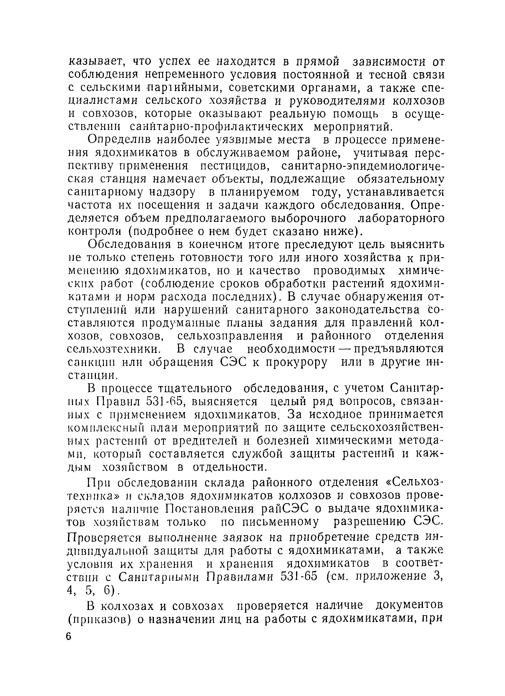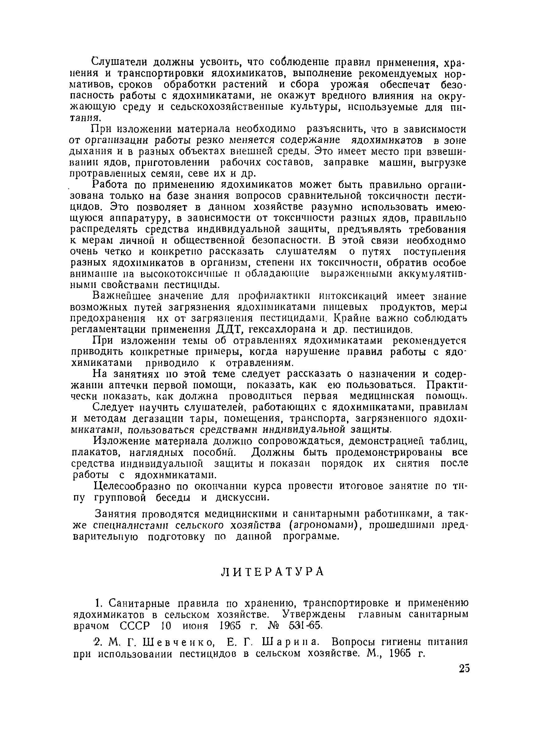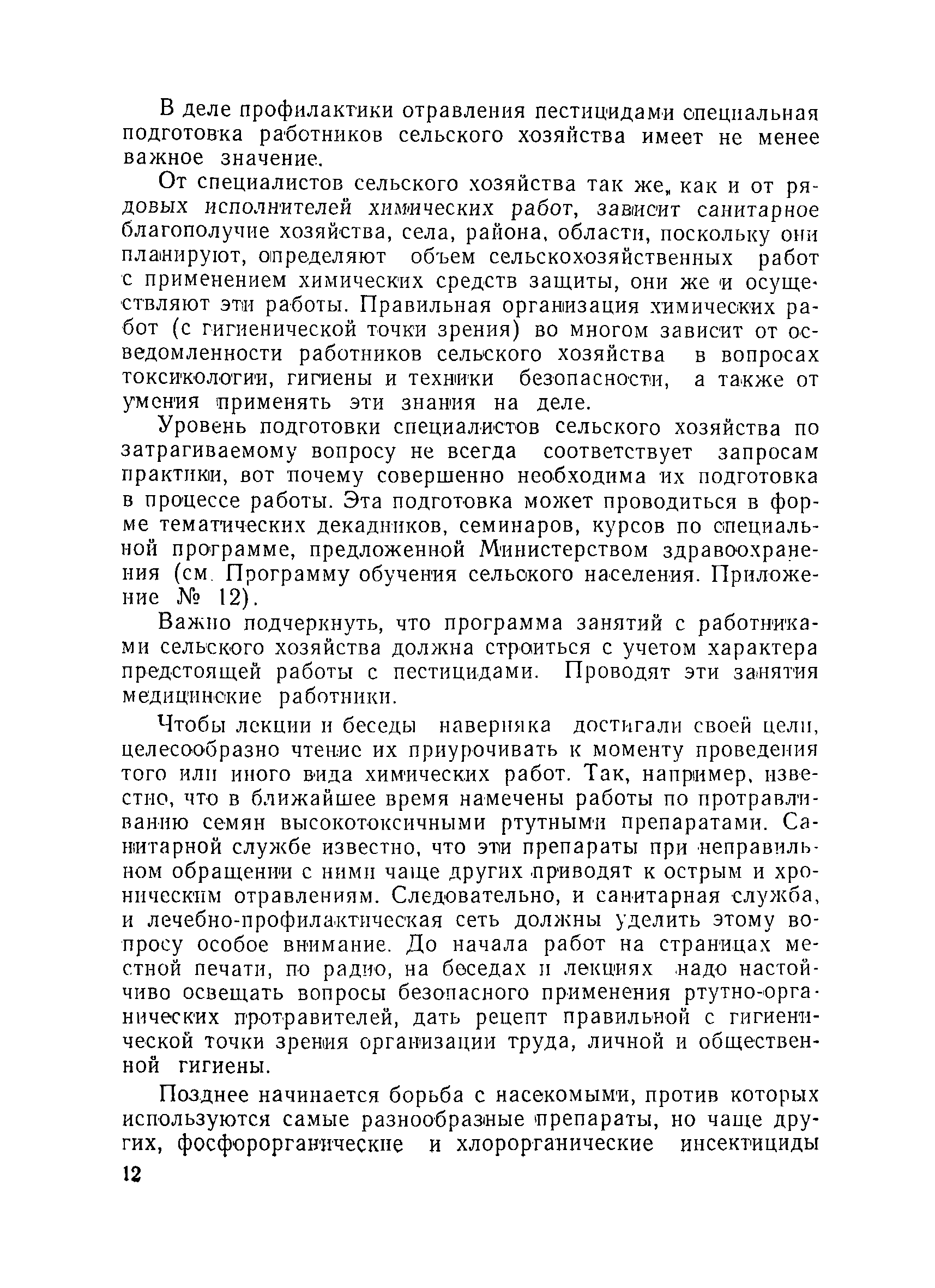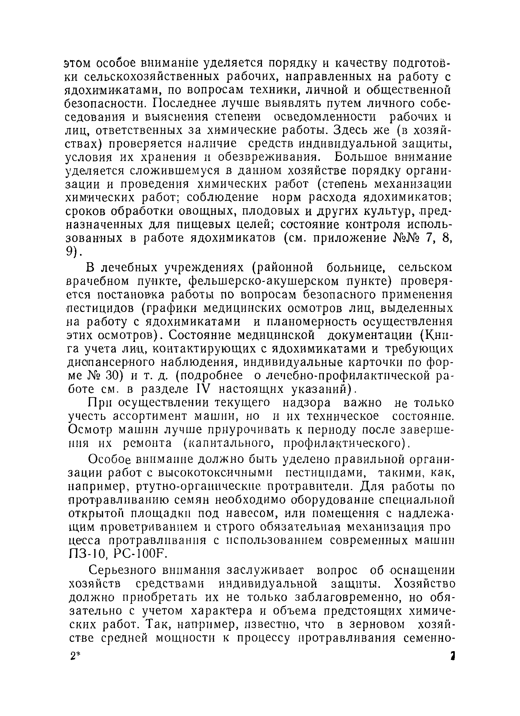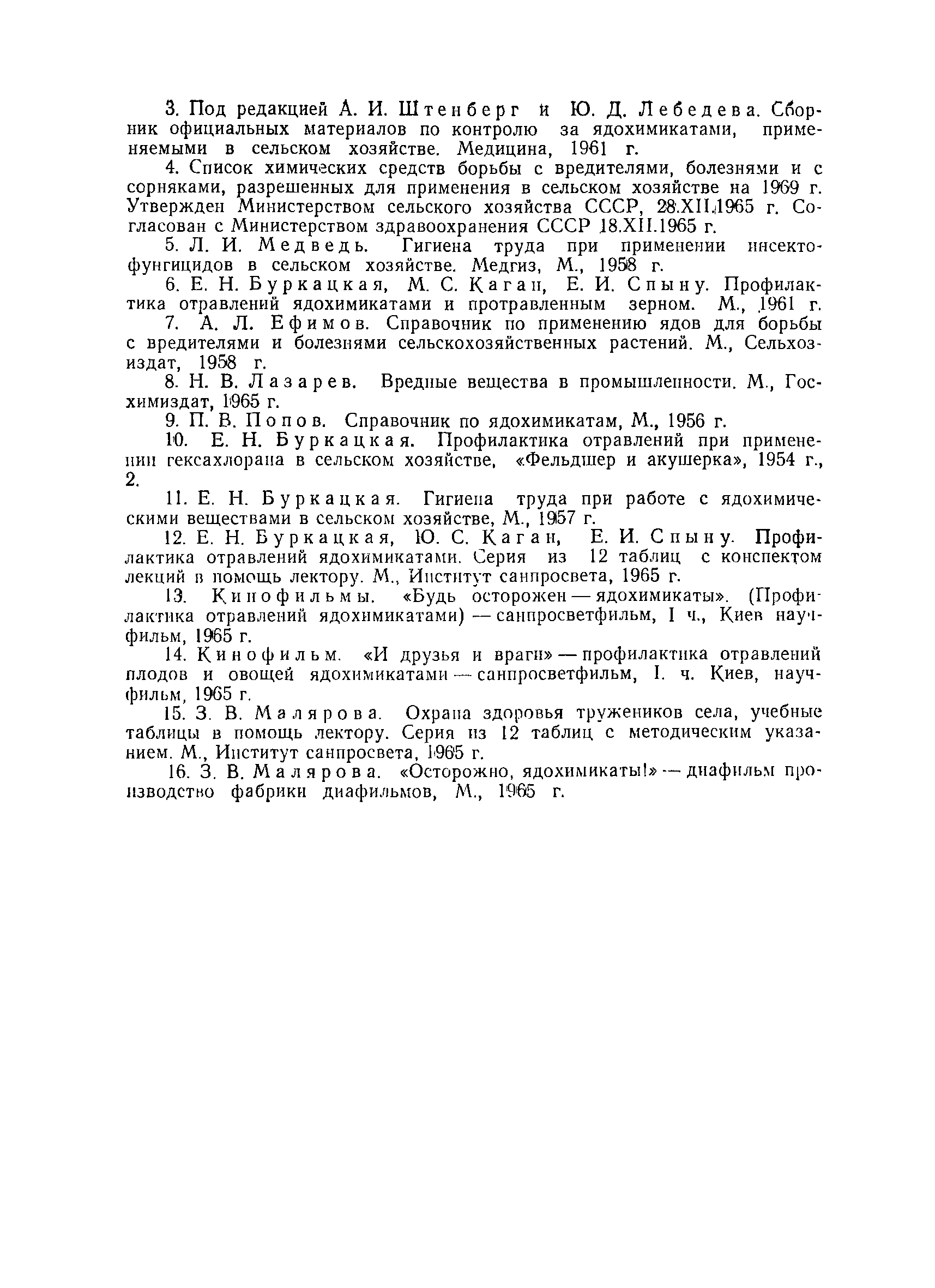 | Оглавление: | I. Организационные мероприятия II. Текущий санитарный надзор III. Санкции IV. Лечебно-профилактическая работа V. Санитарно-технический минимум. Санитарно-просветительная работа Литература I. Санитарные нормы и правила II. Ведомственные нормы и правила III. Строительные нормы и правила ч. II IV. Справочные издания Приложение 1. Примерный комплексный план центральной районной больницы по вопросам профилактики отравления пестицидами Приложение 2. Программа и методические указания обучения работающих с ядохимикатами, применяемыми в сельском хозяйстве Литература Приложение 3. Требование на получение ядохимикатов со складов колхоза или совхоза Приложение 4. Книга учета прихода-расхода ядохимикатов по складу колхоза Приложение 5. Паспорт на право получения и хранения ядохимикатов Приложение 6. Способы обезвреживания спецодежды и тары Приложение 7. Книга учета обработок ядохимикатов сельскохозяйственных растений Приложение 8. Книга учета обработок ядохимикатами сельскохозяйственных животных и птицы Приложение 9. Книга учета протравливания семян Приложение 10. Акт отбора проб на определение остаточных количеств ядохимикатов в пищевых продуктах Приложение 11. Аптечка первой доврачебной помощи Приложение 12. Программа обучения сельского населения правилам гигиены труда при использовании ядохимикатов в сельском хозяйстве |