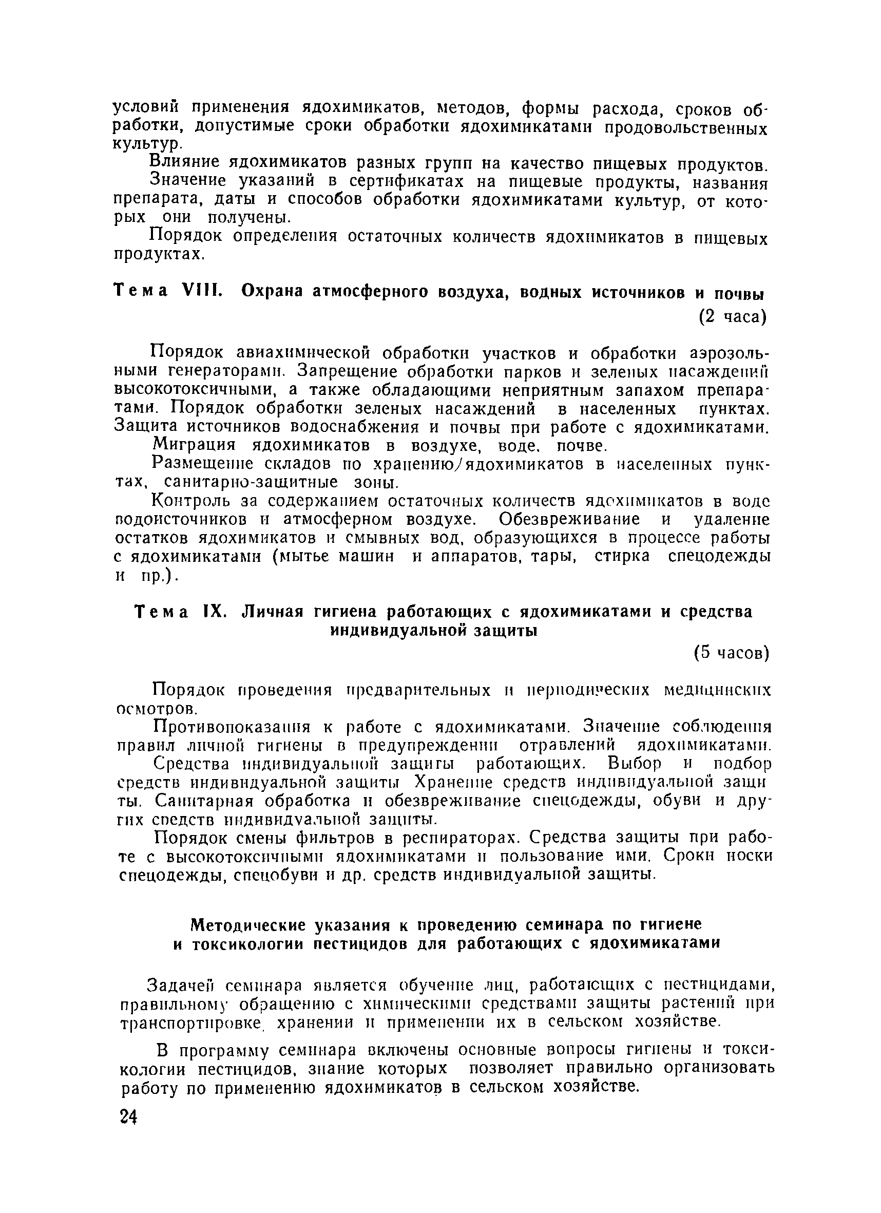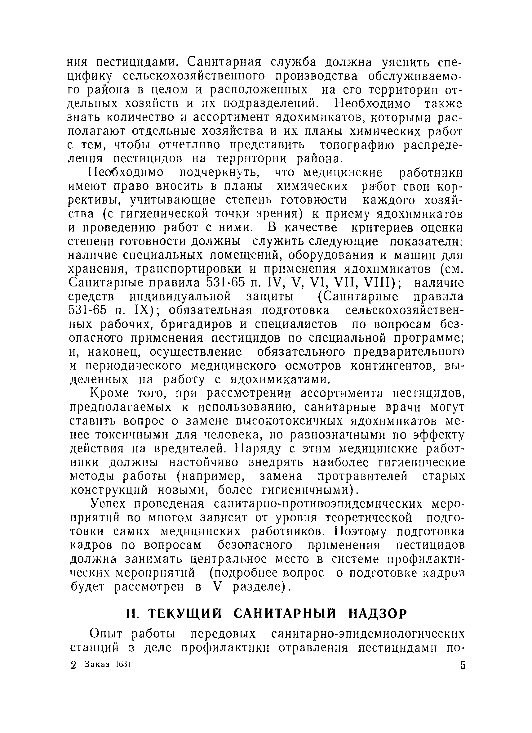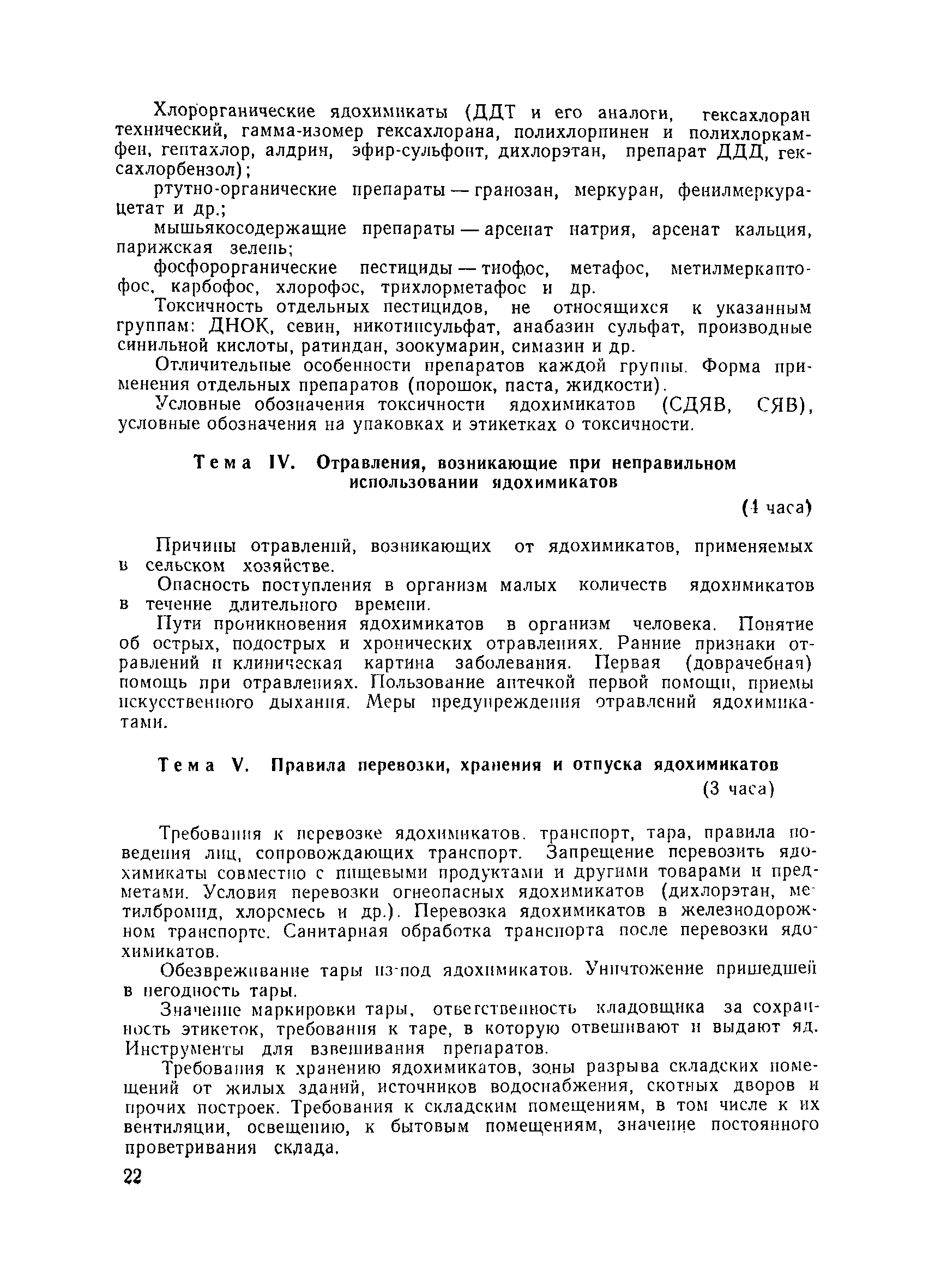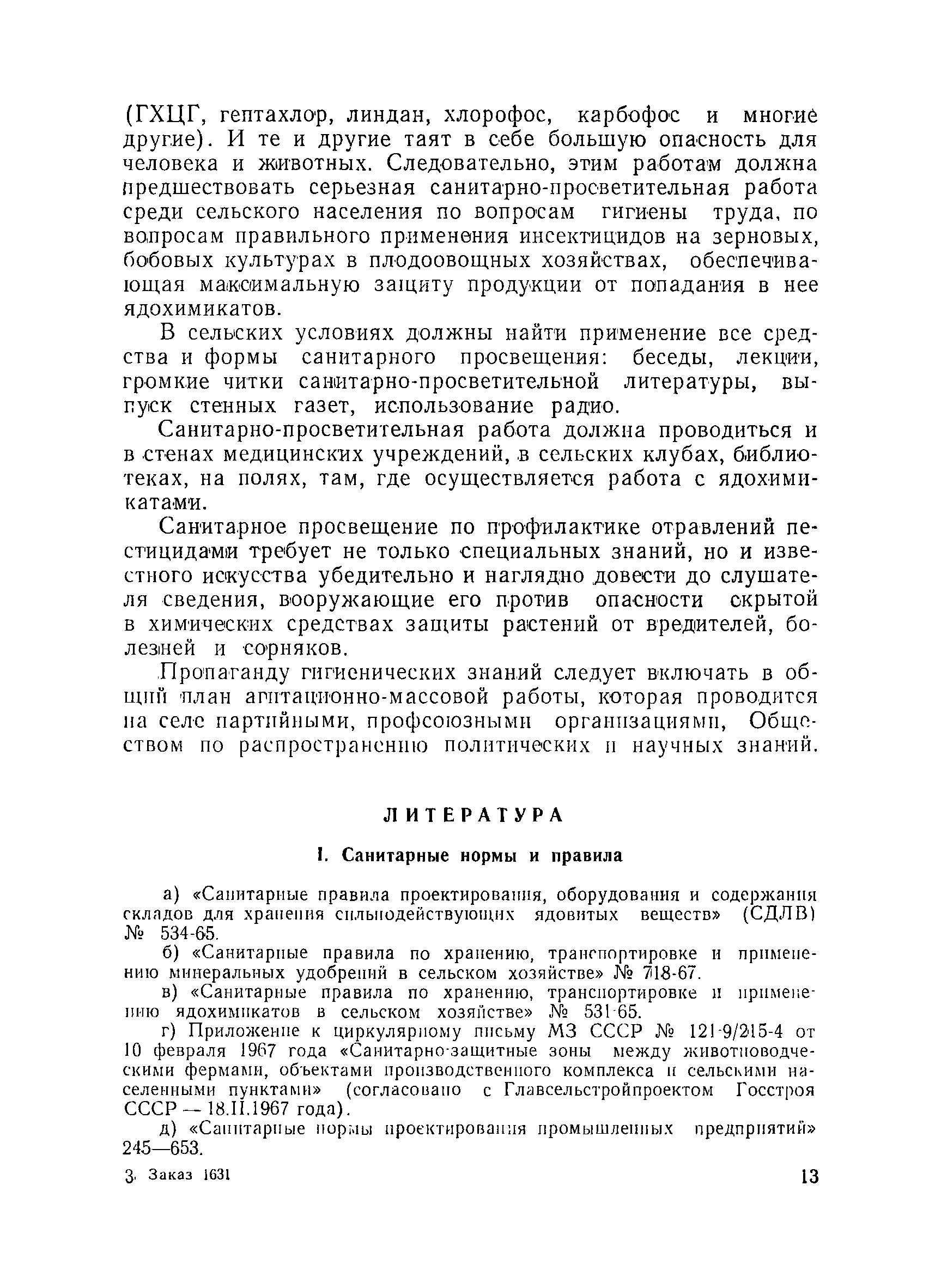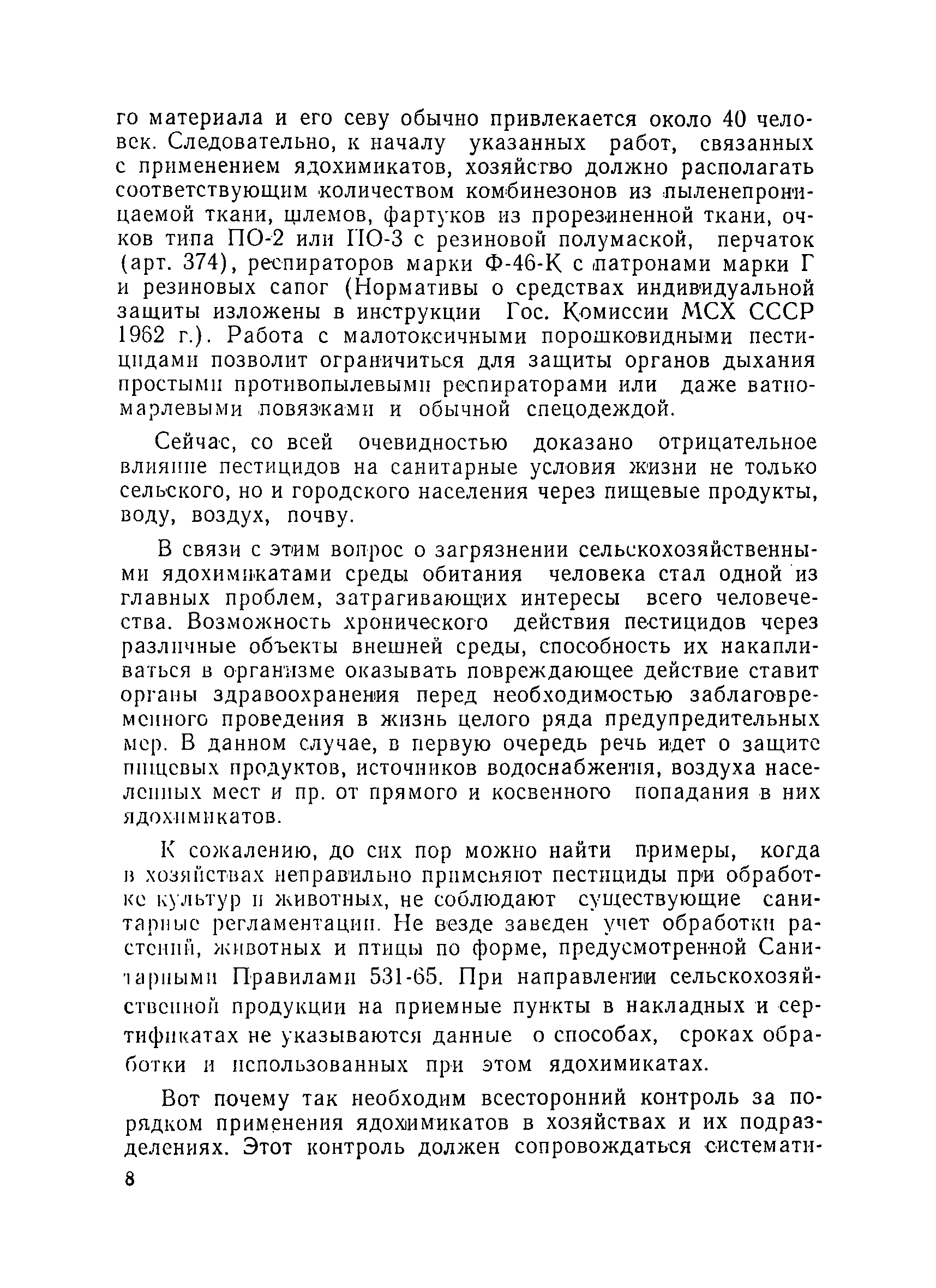 | Оглавление: | I. Организационные мероприятия II. Текущий санитарный надзор III. Санкции IV. Лечебно-профилактическая работа V. Санитарно-технический минимум. Санитарно-просветительная работа Литература I. Санитарные нормы и правила II. Ведомственные нормы и правила III. Строительные нормы и правила ч. II IV. Справочные издания Приложение 1. Примерный комплексный план центральной районной больницы по вопросам профилактики отравления пестицидами Приложение 2. Программа и методические указания обучения работающих с ядохимикатами, применяемыми в сельском хозяйстве Литература Приложение 3. Требование на получение ядохимикатов со складов колхоза или совхоза Приложение 4. Книга учета прихода-расхода ядохимикатов по складу колхоза Приложение 5. Паспорт на право получения и хранения ядохимикатов Приложение 6. Способы обезвреживания спецодежды и тары Приложение 7. Книга учета обработок ядохимикатов сельскохозяйственных растений Приложение 8. Книга учета обработок ядохимикатами сельскохозяйственных животных и птицы Приложение 9. Книга учета протравливания семян Приложение 10. Акт отбора проб на определение остаточных количеств ядохимикатов в пищевых продуктах Приложение 11. Аптечка первой доврачебной помощи Приложение 12. Программа обучения сельского населения правилам гигиены труда при использовании ядохимикатов в сельском хозяйстве |