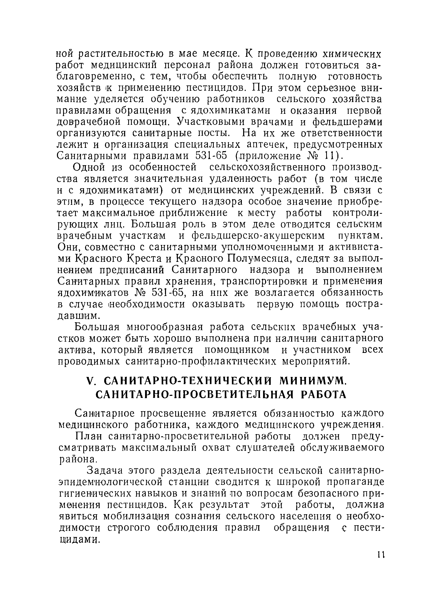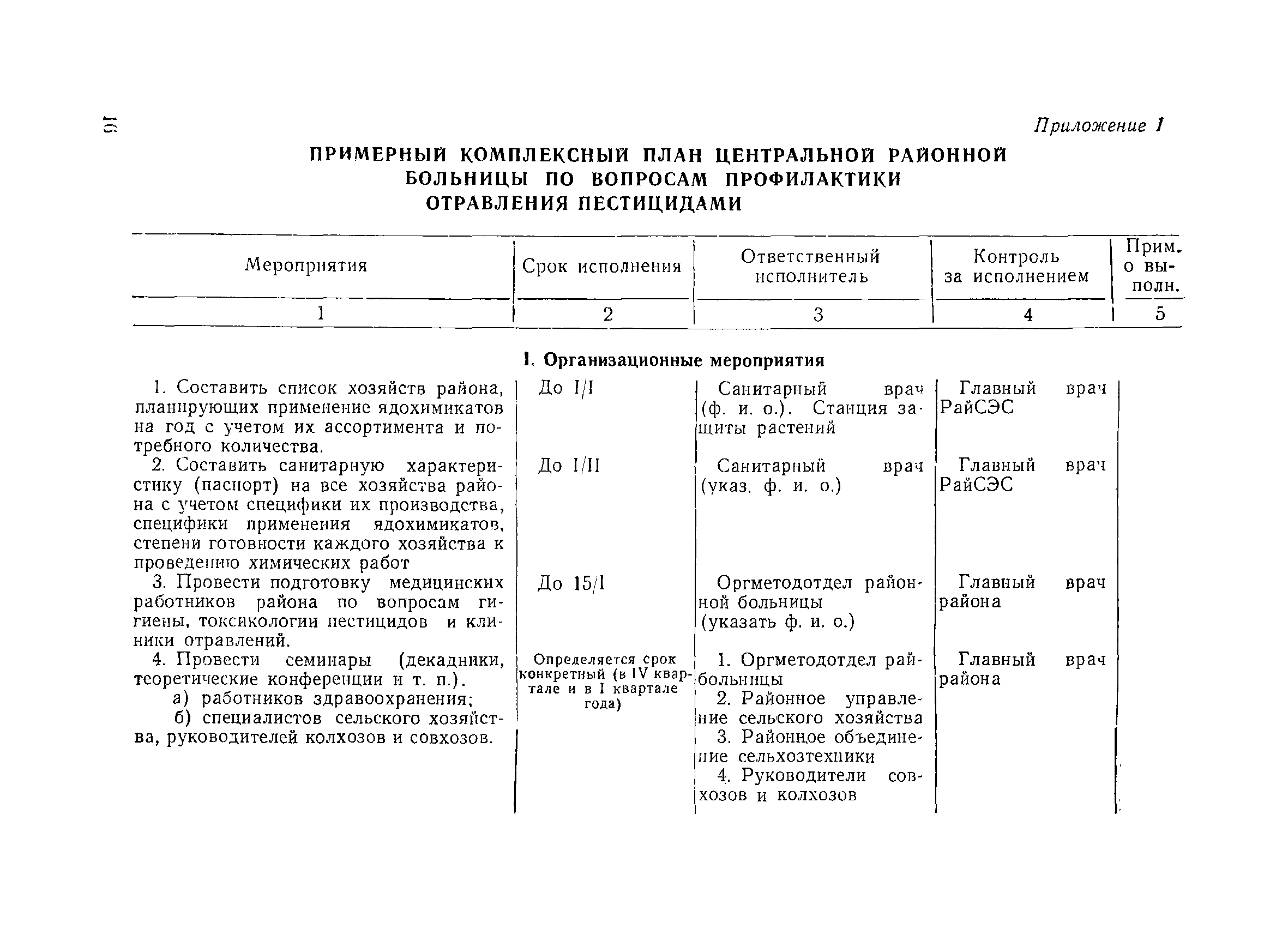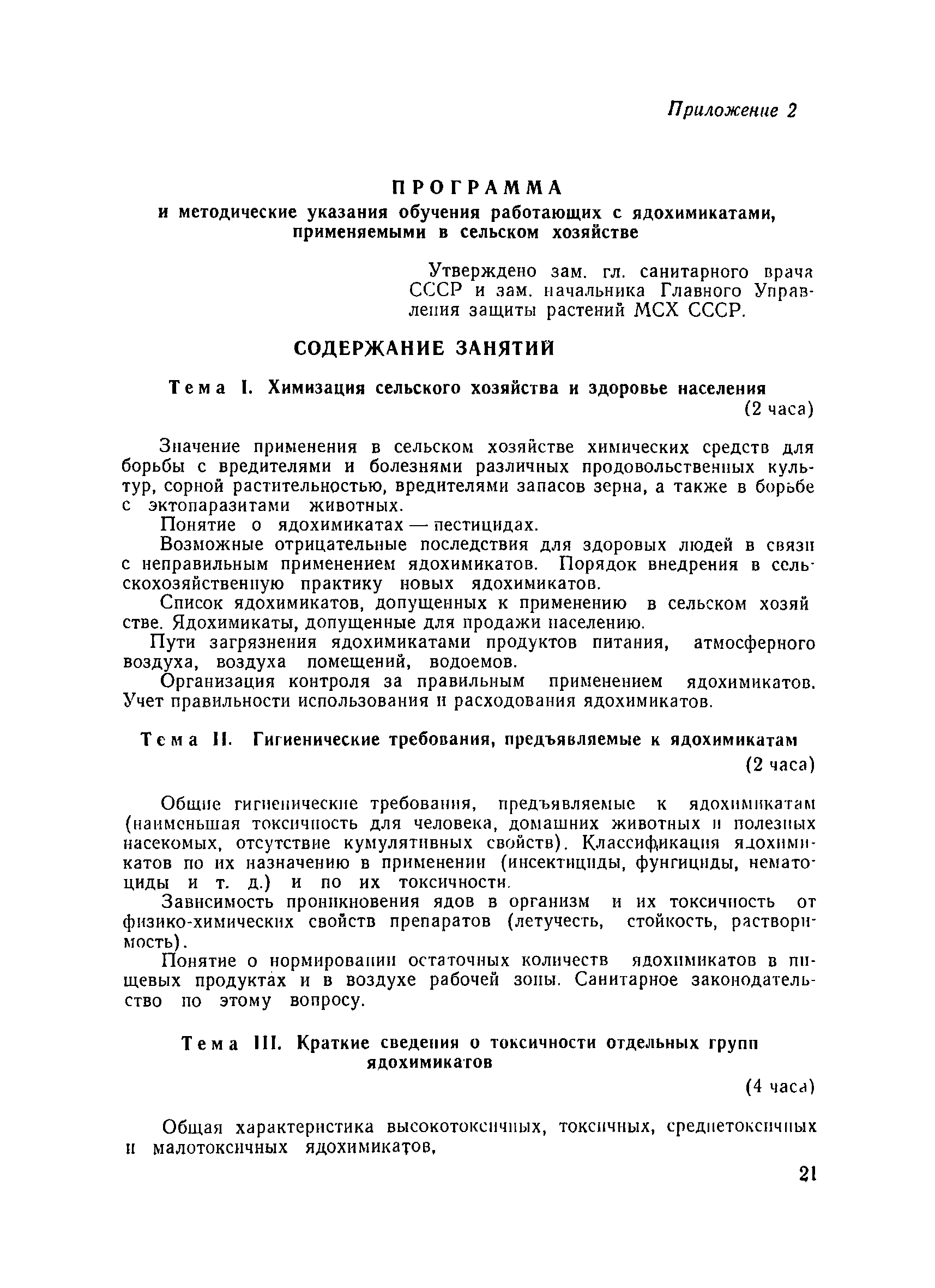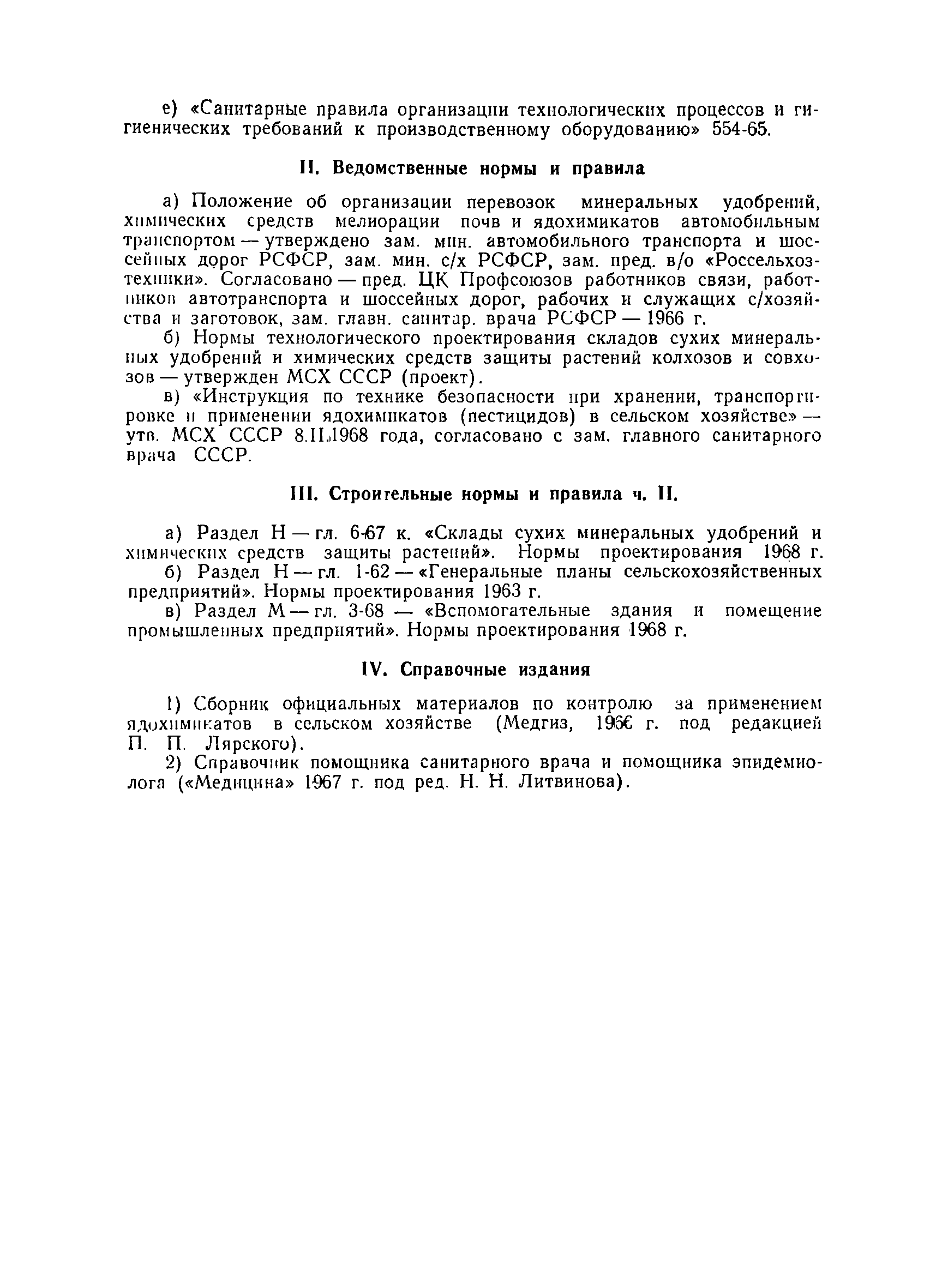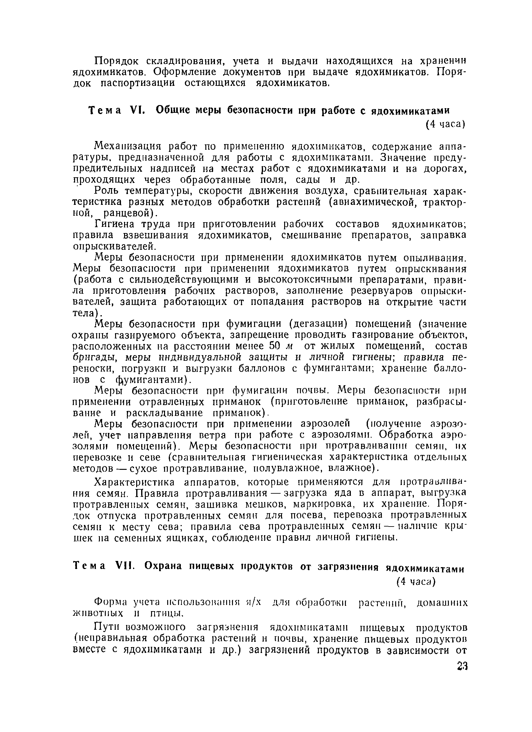 | Оглавление: | I. Организационные мероприятия II. Текущий санитарный надзор III. Санкции IV. Лечебно-профилактическая работа V. Санитарно-технический минимум. Санитарно-просветительная работа Литература I. Санитарные нормы и правила II. Ведомственные нормы и правила III. Строительные нормы и правила ч. II IV. Справочные издания Приложение 1. Примерный комплексный план центральной районной больницы по вопросам профилактики отравления пестицидами Приложение 2. Программа и методические указания обучения работающих с ядохимикатами, применяемыми в сельском хозяйстве Литература Приложение 3. Требование на получение ядохимикатов со складов колхоза или совхоза Приложение 4. Книга учета прихода-расхода ядохимикатов по складу колхоза Приложение 5. Паспорт на право получения и хранения ядохимикатов Приложение 6. Способы обезвреживания спецодежды и тары Приложение 7. Книга учета обработок ядохимикатов сельскохозяйственных растений Приложение 8. Книга учета обработок ядохимикатами сельскохозяйственных животных и птицы Приложение 9. Книга учета протравливания семян Приложение 10. Акт отбора проб на определение остаточных количеств ядохимикатов в пищевых продуктах Приложение 11. Аптечка первой доврачебной помощи Приложение 12. Программа обучения сельского населения правилам гигиены труда при использовании ядохимикатов в сельском хозяйстве |