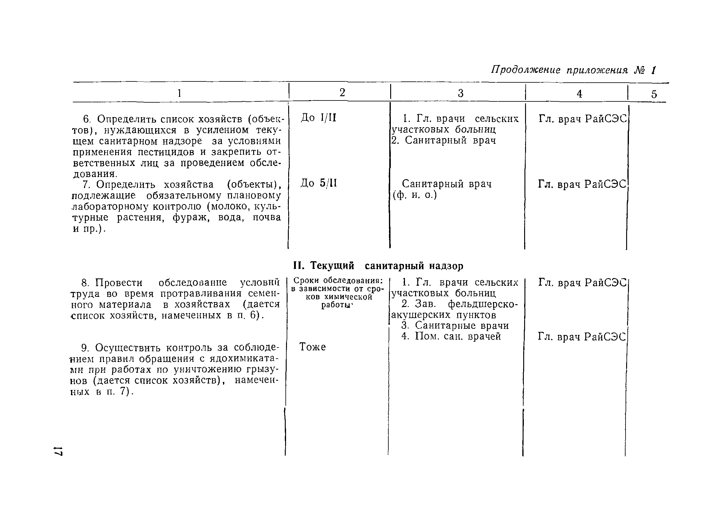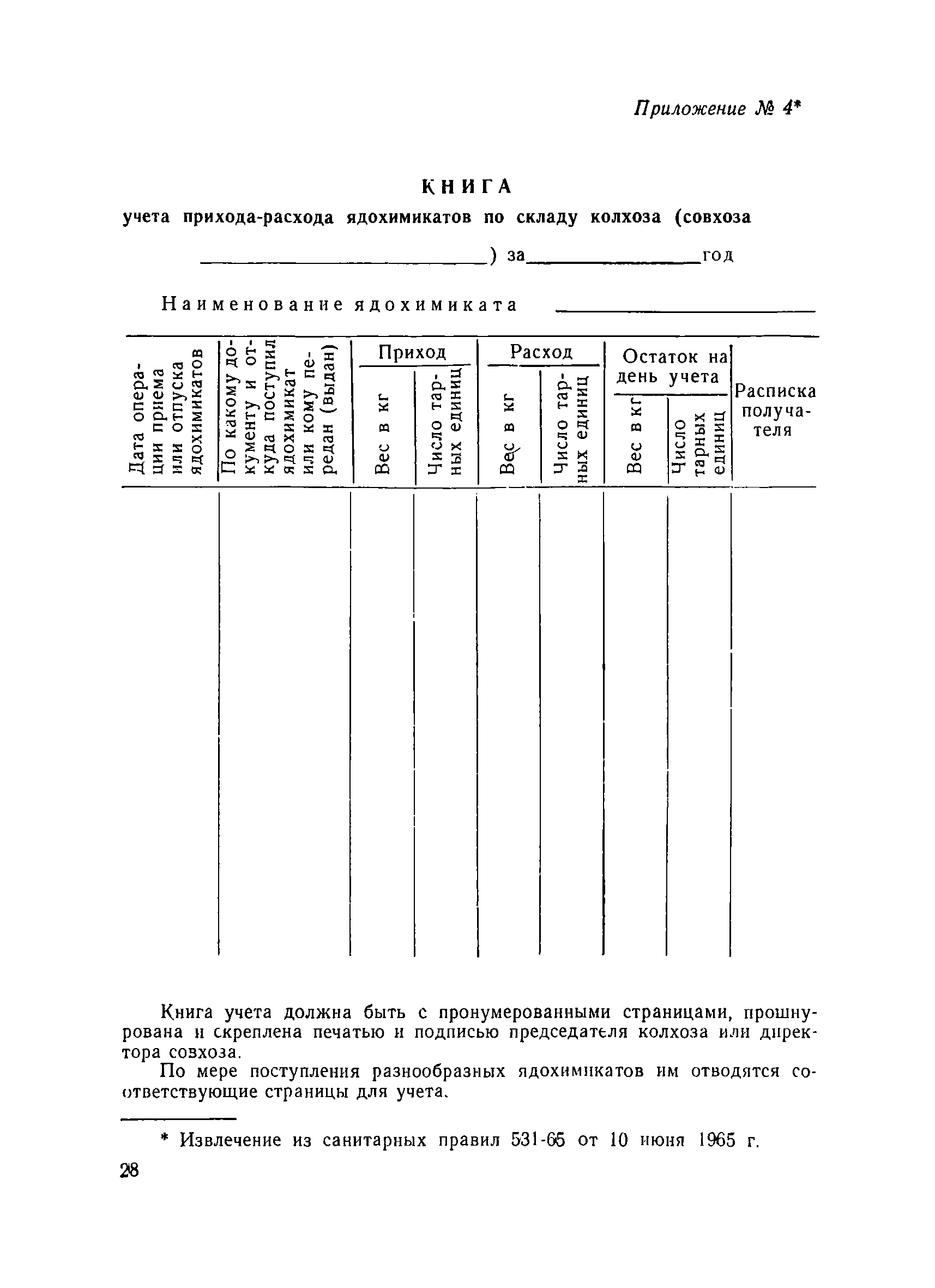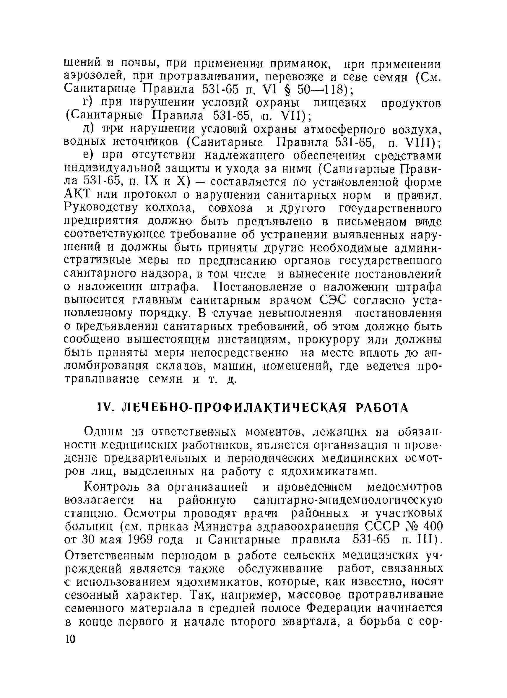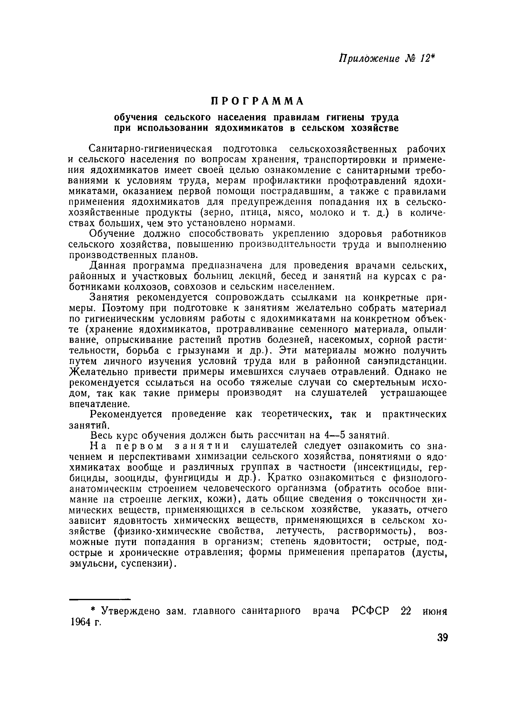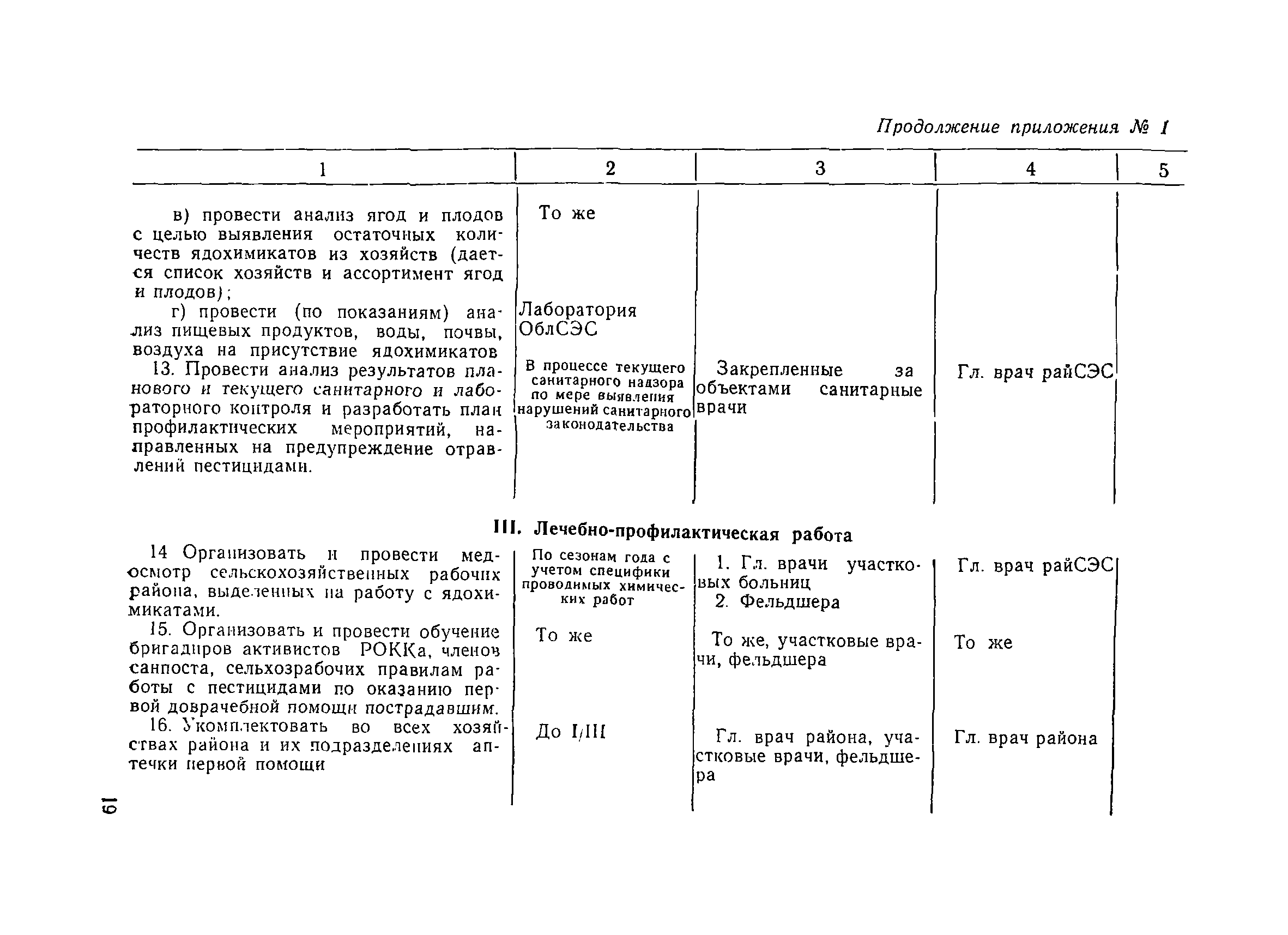 | Оглавление: | I. Организационные мероприятия II. Текущий санитарный надзор III. Санкции IV. Лечебно-профилактическая работа V. Санитарно-технический минимум. Санитарно-просветительная работа Литература I. Санитарные нормы и правила II. Ведомственные нормы и правила III. Строительные нормы и правила ч. II IV. Справочные издания Приложение 1. Примерный комплексный план центральной районной больницы по вопросам профилактики отравления пестицидами Приложение 2. Программа и методические указания обучения работающих с ядохимикатами, применяемыми в сельском хозяйстве Литература Приложение 3. Требование на получение ядохимикатов со складов колхоза или совхоза Приложение 4. Книга учета прихода-расхода ядохимикатов по складу колхоза Приложение 5. Паспорт на право получения и хранения ядохимикатов Приложение 6. Способы обезвреживания спецодежды и тары Приложение 7. Книга учета обработок ядохимикатов сельскохозяйственных растений Приложение 8. Книга учета обработок ядохимикатами сельскохозяйственных животных и птицы Приложение 9. Книга учета протравливания семян Приложение 10. Акт отбора проб на определение остаточных количеств ядохимикатов в пищевых продуктах Приложение 11. Аптечка первой доврачебной помощи Приложение 12. Программа обучения сельского населения правилам гигиены труда при использовании ядохимикатов в сельском хозяйстве |