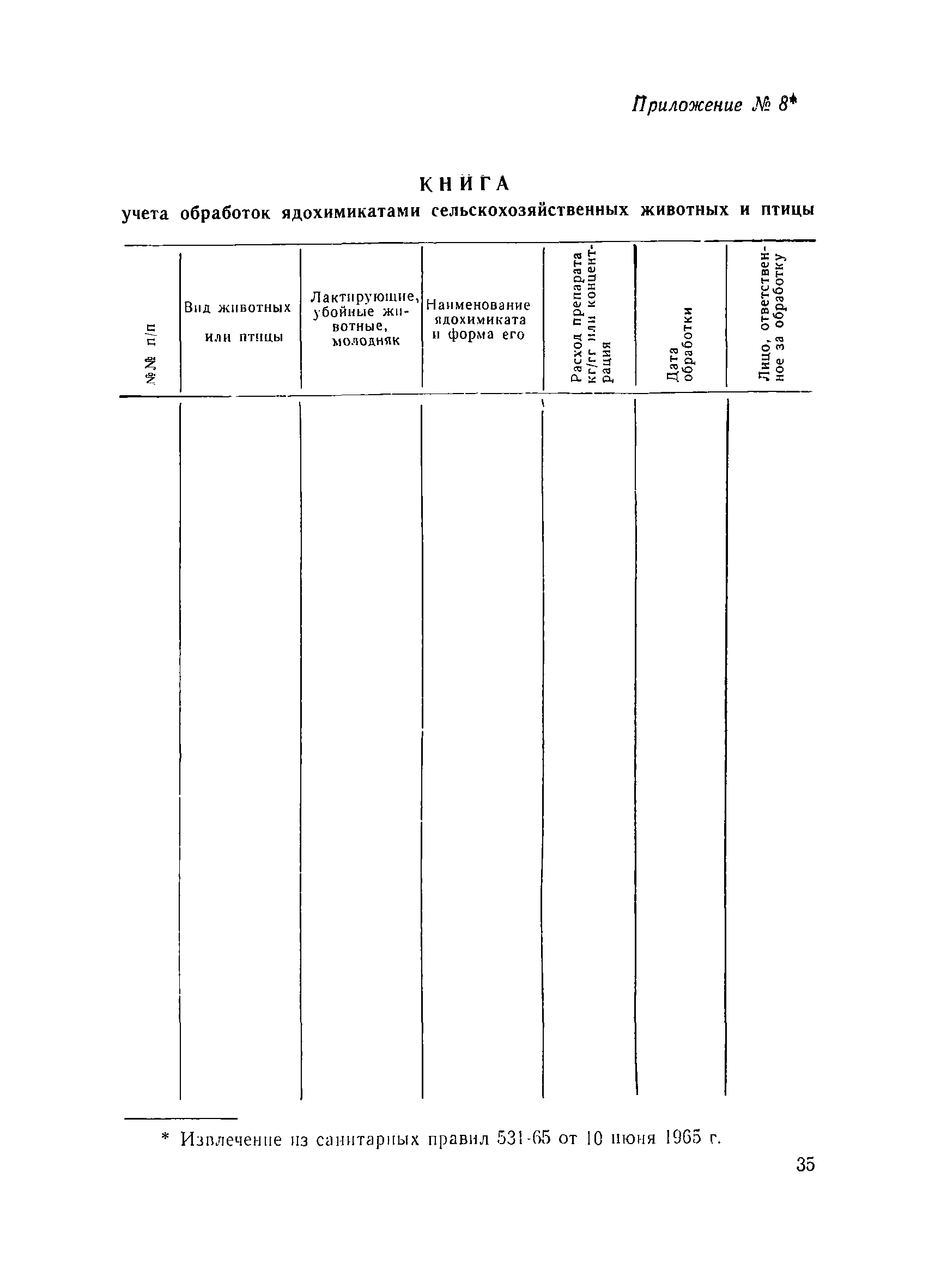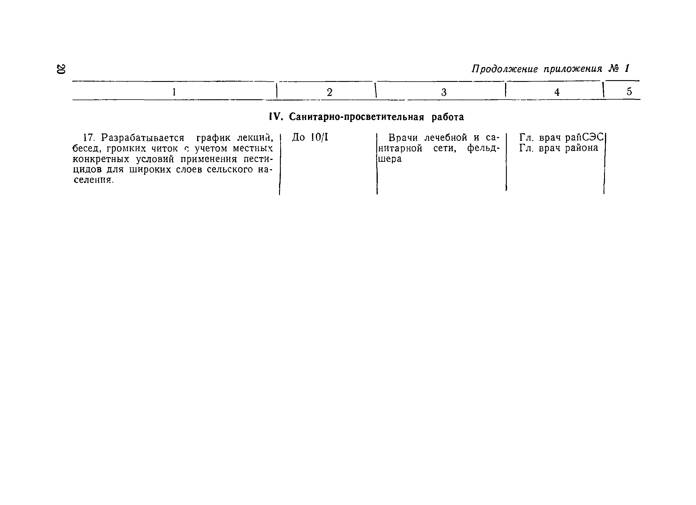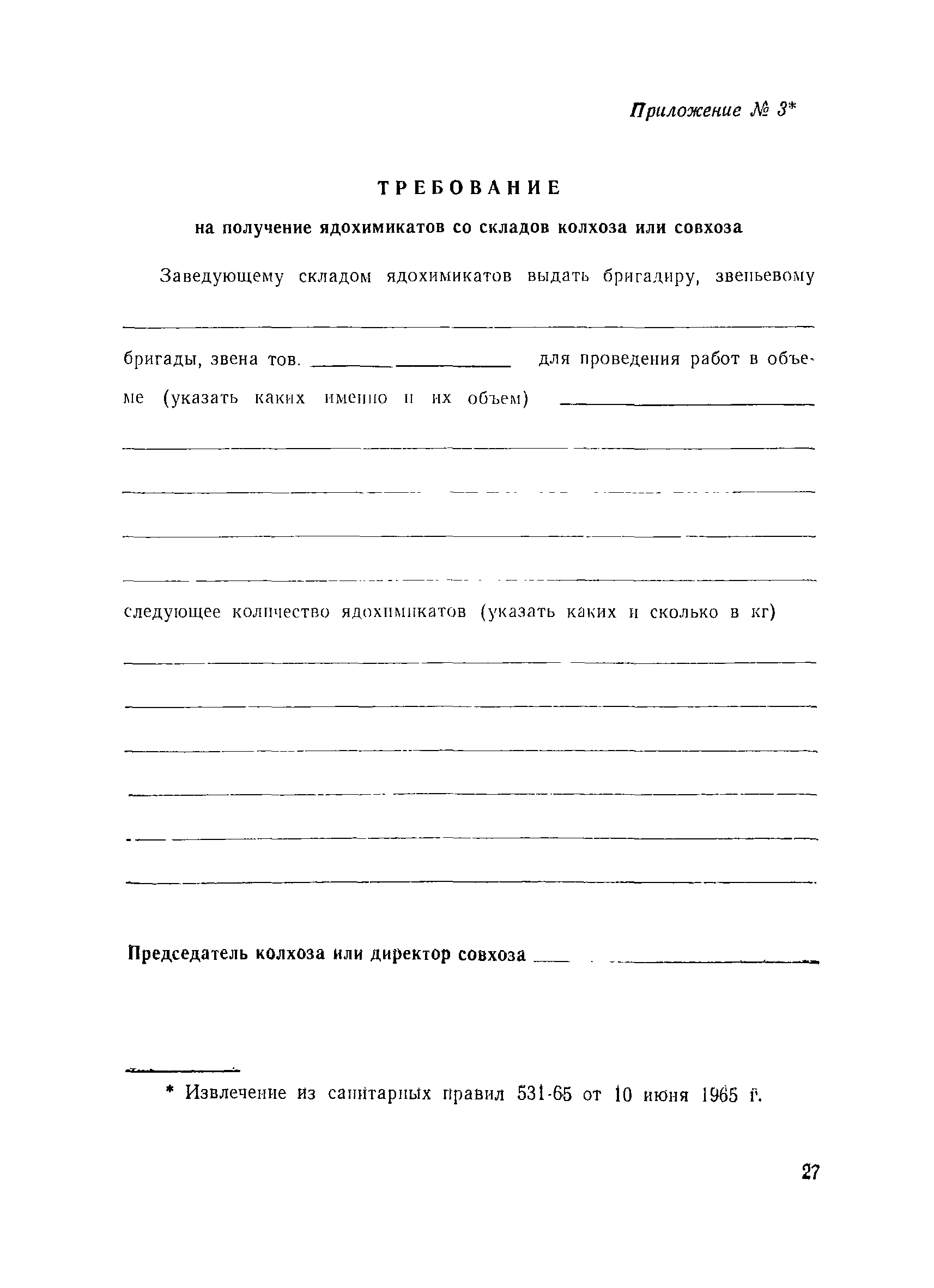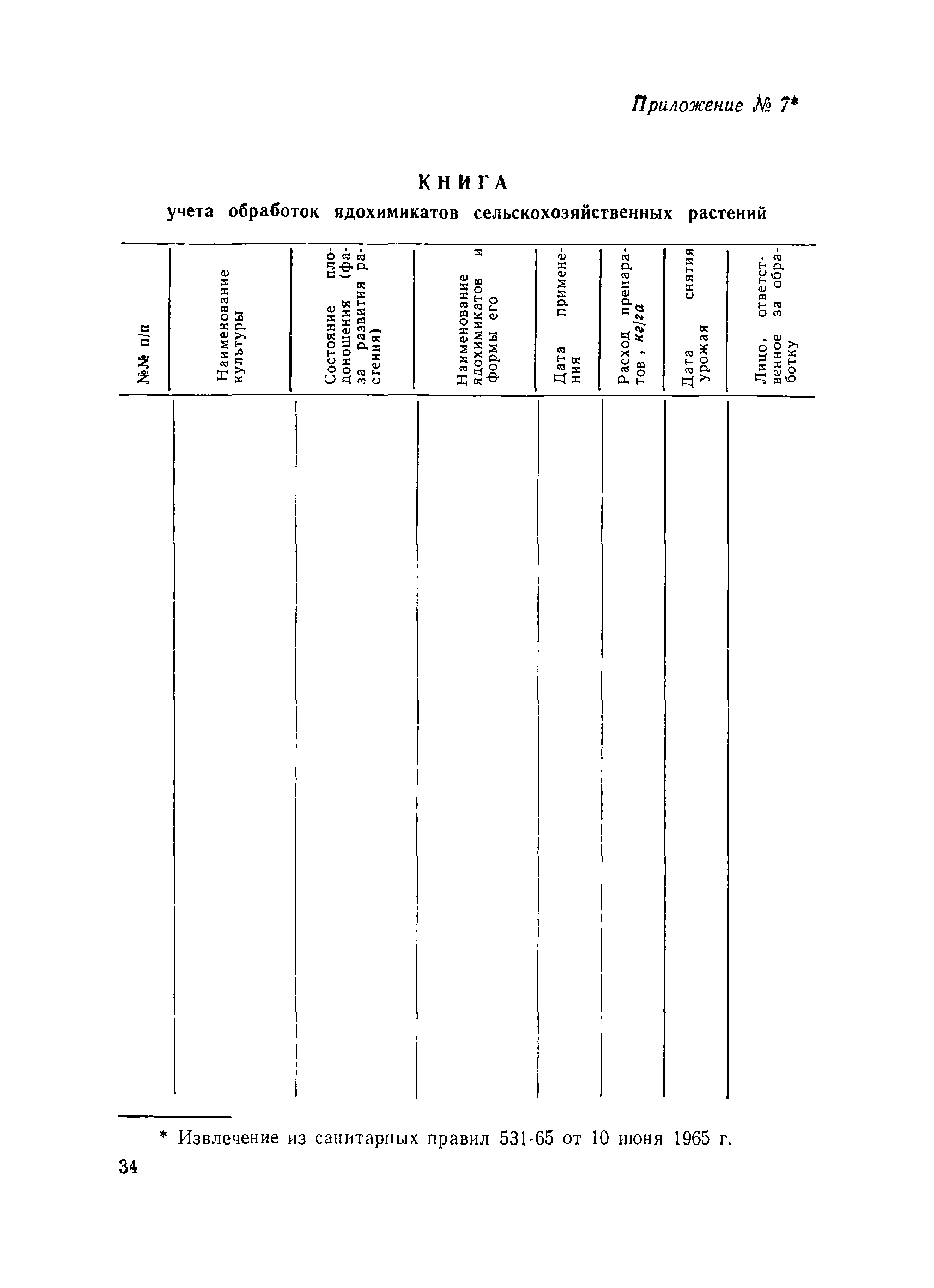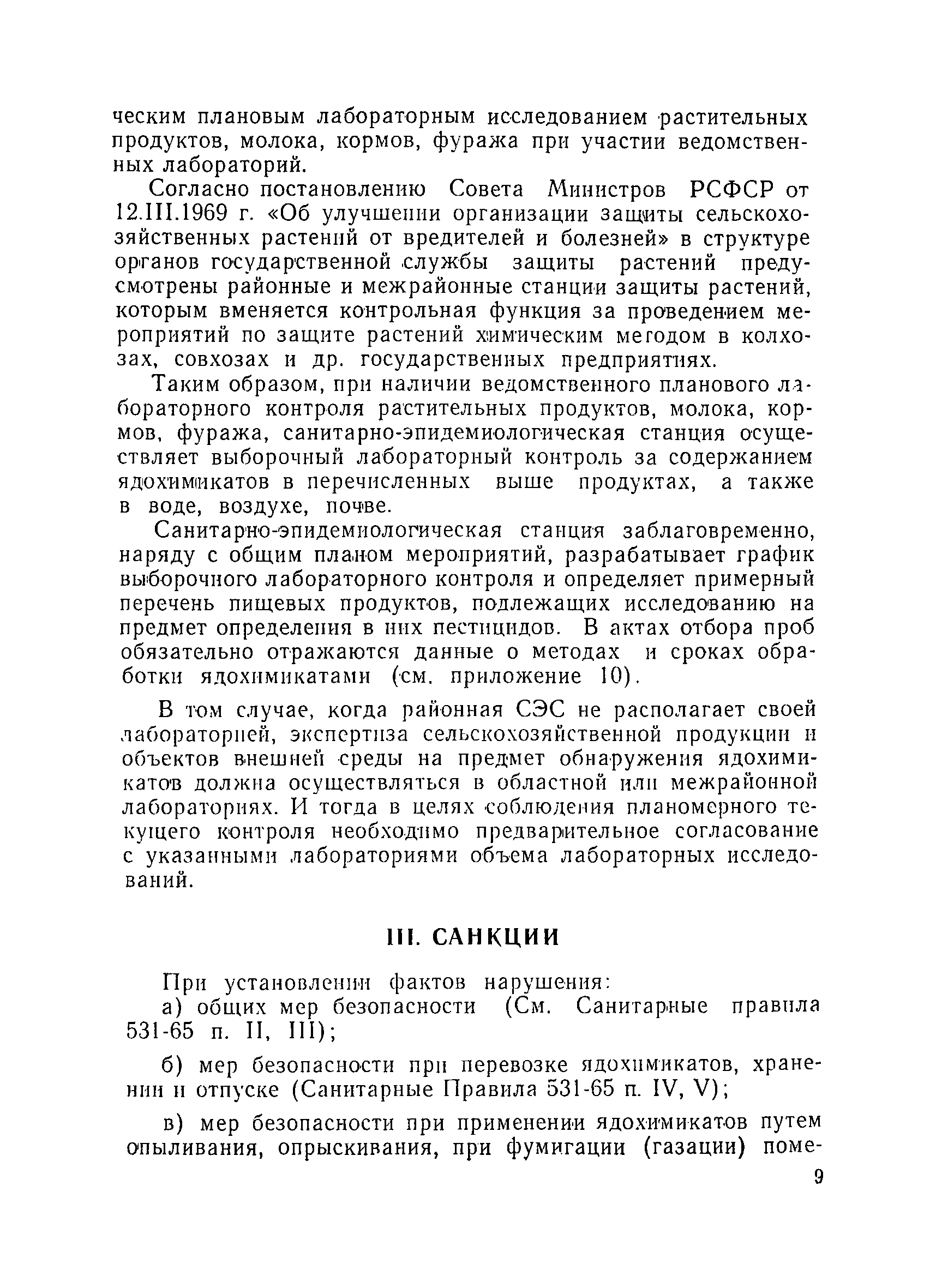 | Оглавление: | I. Организационные мероприятия II. Текущий санитарный надзор III. Санкции IV. Лечебно-профилактическая работа V. Санитарно-технический минимум. Санитарно-просветительная работа Литература I. Санитарные нормы и правила II. Ведомственные нормы и правила III. Строительные нормы и правила ч. II IV. Справочные издания Приложение 1. Примерный комплексный план центральной районной больницы по вопросам профилактики отравления пестицидами Приложение 2. Программа и методические указания обучения работающих с ядохимикатами, применяемыми в сельском хозяйстве Литература Приложение 3. Требование на получение ядохимикатов со складов колхоза или совхоза Приложение 4. Книга учета прихода-расхода ядохимикатов по складу колхоза Приложение 5. Паспорт на право получения и хранения ядохимикатов Приложение 6. Способы обезвреживания спецодежды и тары Приложение 7. Книга учета обработок ядохимикатов сельскохозяйственных растений Приложение 8. Книга учета обработок ядохимикатами сельскохозяйственных животных и птицы Приложение 9. Книга учета протравливания семян Приложение 10. Акт отбора проб на определение остаточных количеств ядохимикатов в пищевых продуктах Приложение 11. Аптечка первой доврачебной помощи Приложение 12. Программа обучения сельского населения правилам гигиены труда при использовании ядохимикатов в сельском хозяйстве |