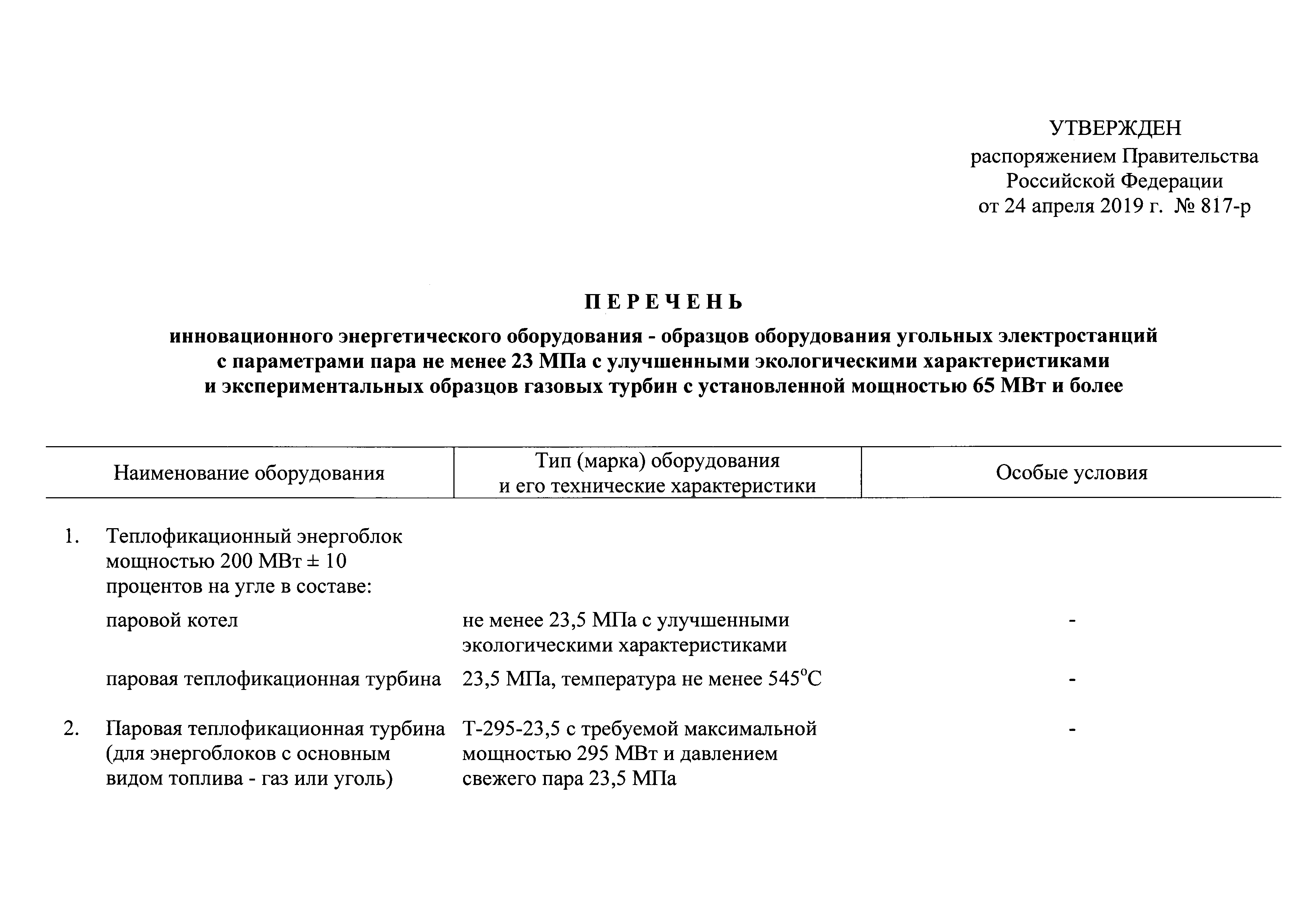 | Название рус.: | Перечень инновационного энергетического оборудования - образцов оборудования угольных электростанций с параметрами пара не менее 23 МПа с улучшенными экологическими характеристиками и экспериментальных образцов газовых турбин с установленной мощностью 65 МВт и более |