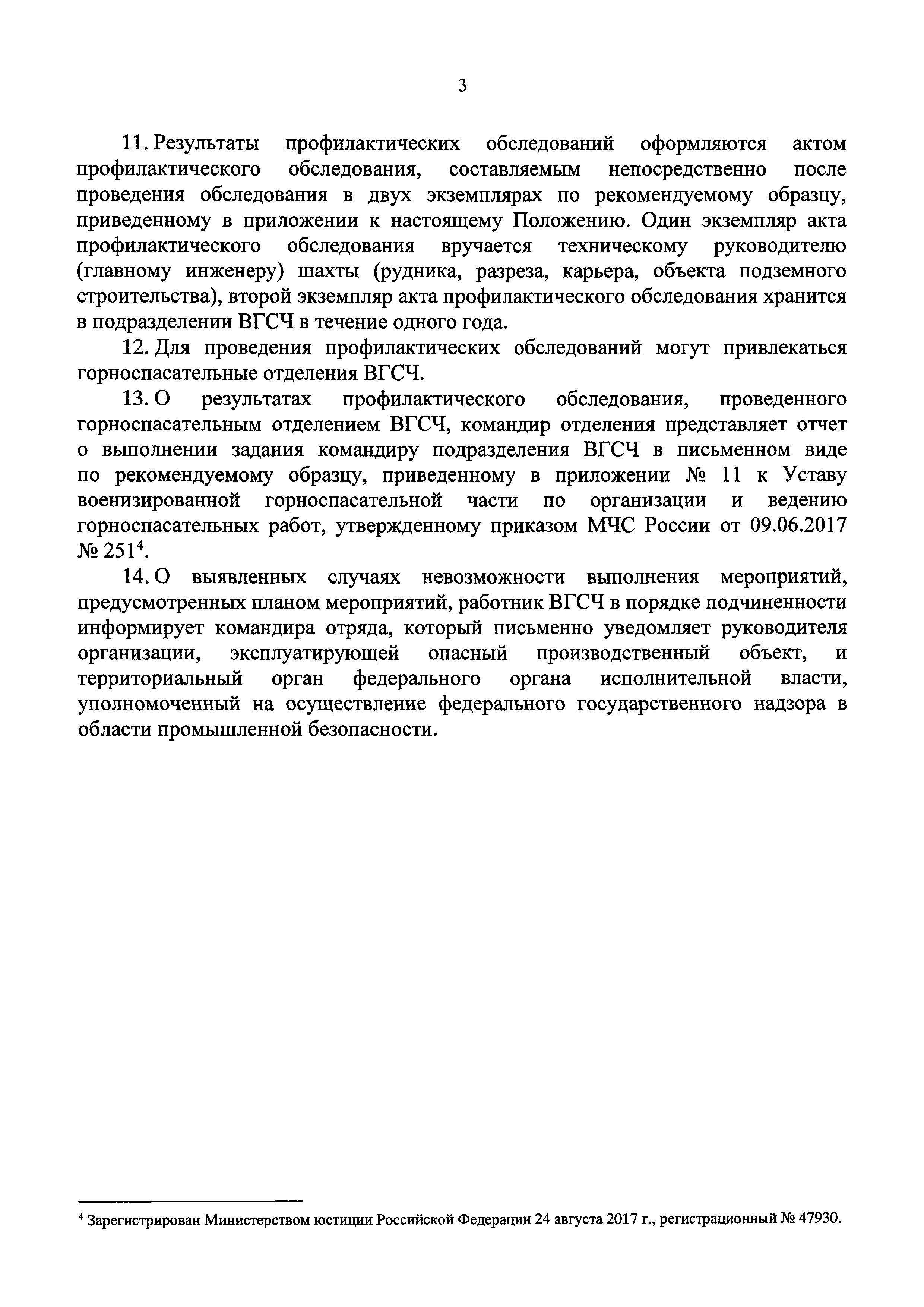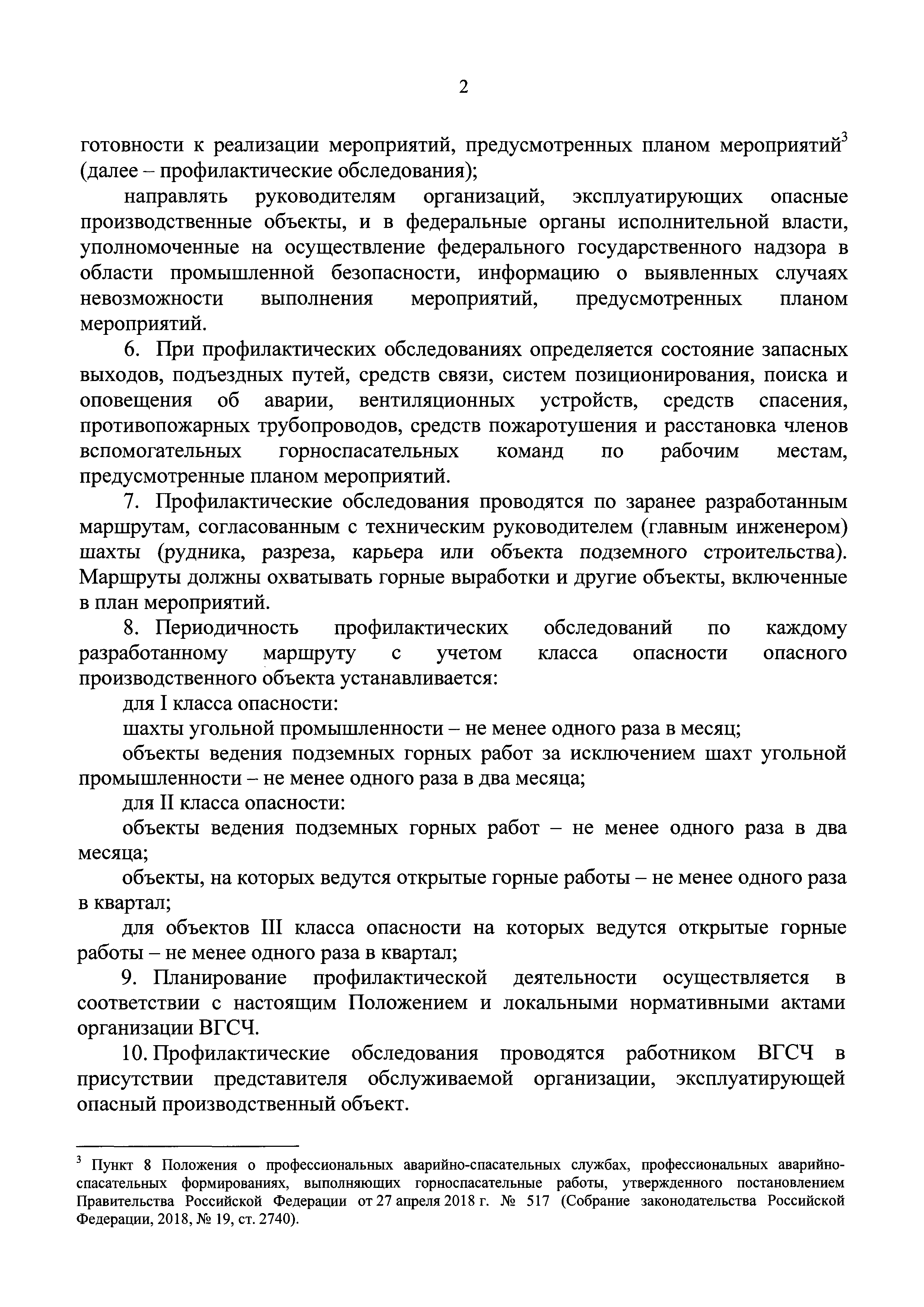 Положение об организации деятельности военизированных горноспасательных частей, направленной на профилактику возникновения аварий на опасных производственных объектах| Статус: | действует | | Название рус.: | Положение об организации деятельности военизированных горноспасательных частей, направленной на профилактику возникновения аварий на опасных производственных объектах | | Дата добавления в базу: | 01.02.2020 | | Дата актуализации: | 01.01.2021 | | Дата введения: | 10.05.2019 | | Область применения: | Положение определяет порядок деятельности военизированных горноспасательных частей, направленной на профилактику возникновения аварий на опасных производственных объектах ведения горных работ, обслуживаемых организаций, в период их строительства, эксплуатации, реконструкции, капитального ремонта, технического перевооружения, консервации или ликвидации | | Оглавление: | Приложение. Рекомендуемый образец акта профилактического обследования | | Утверждён: | 29.03.2019 Министерство Российской Федерации по делам гражданской обороны, чрезвычайным ситуациям и ликвидации последствий стихийных бедствий (181)