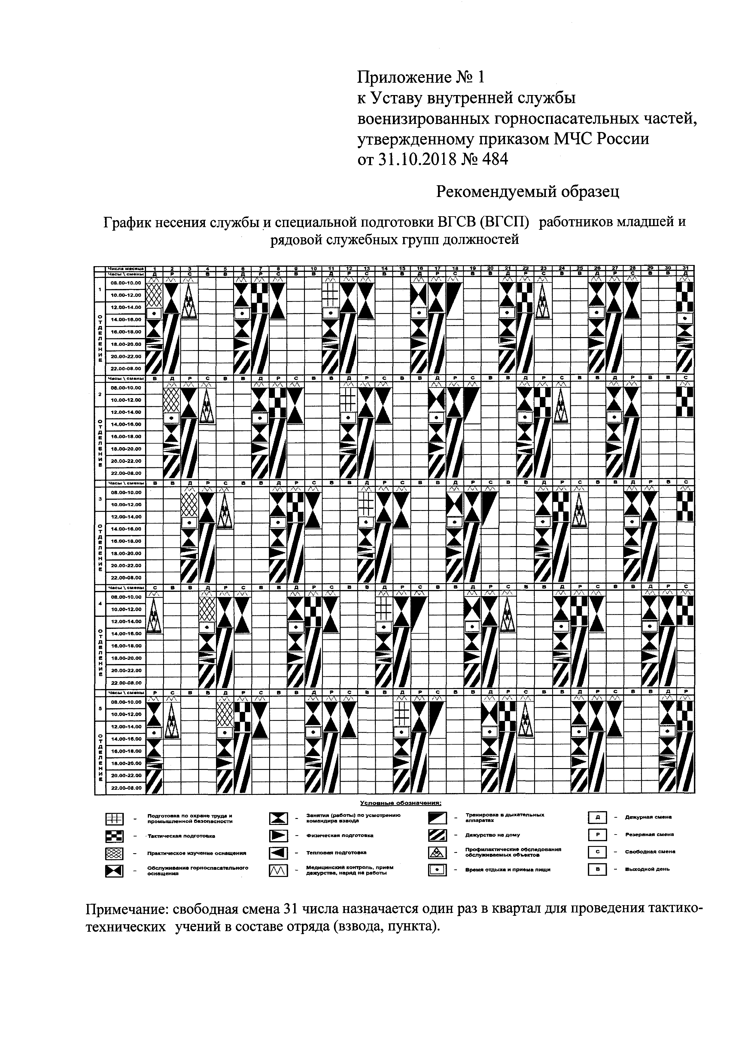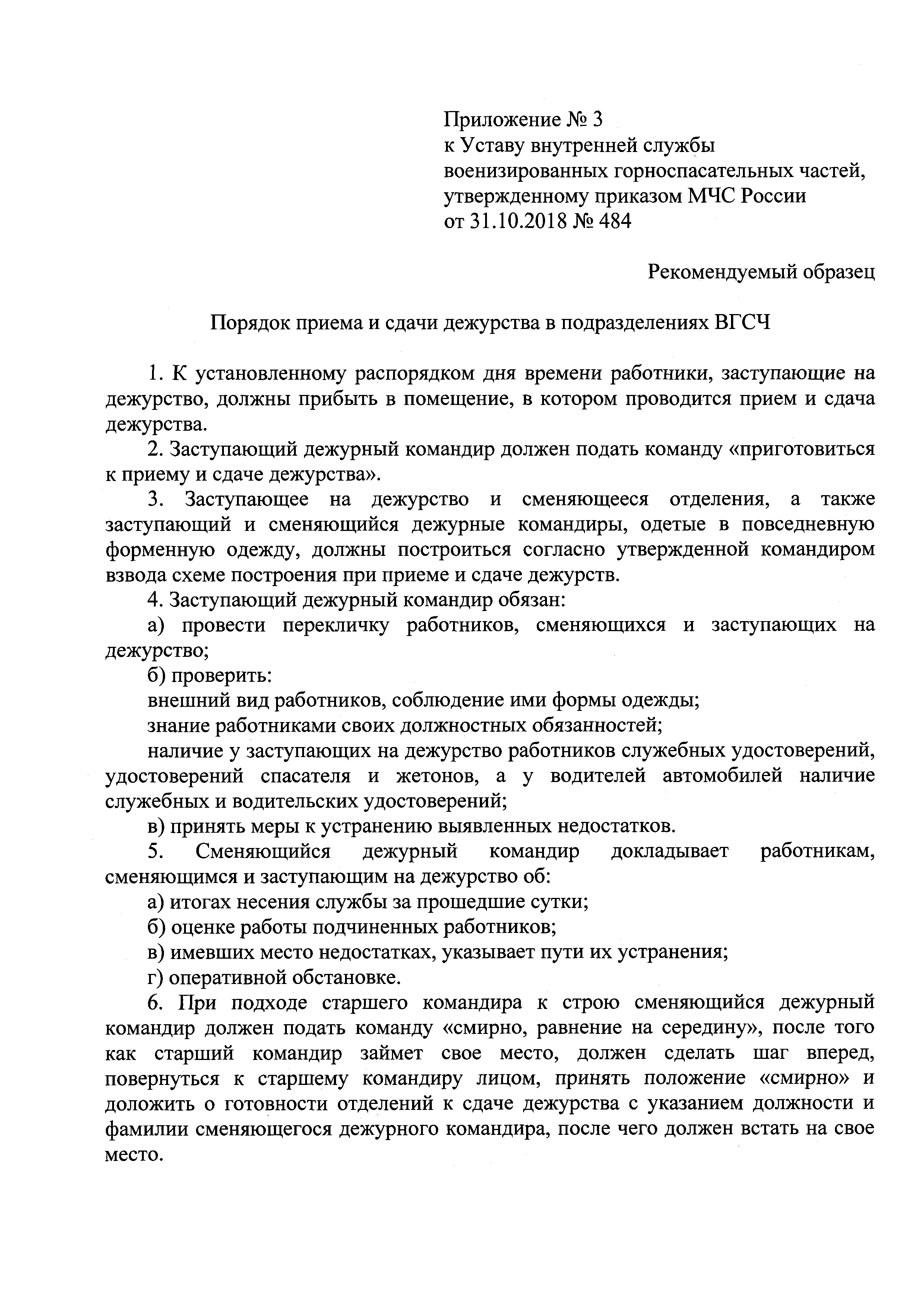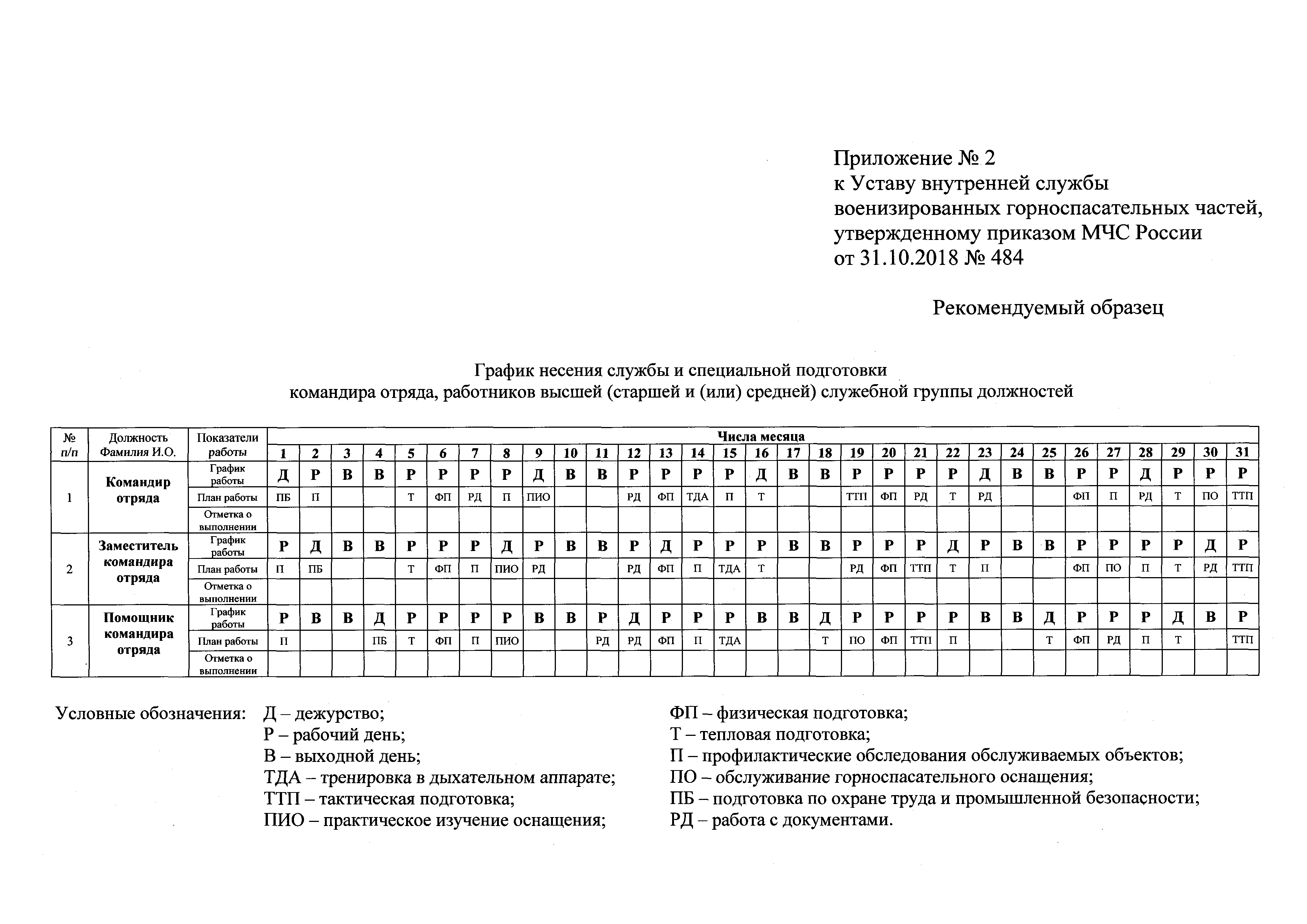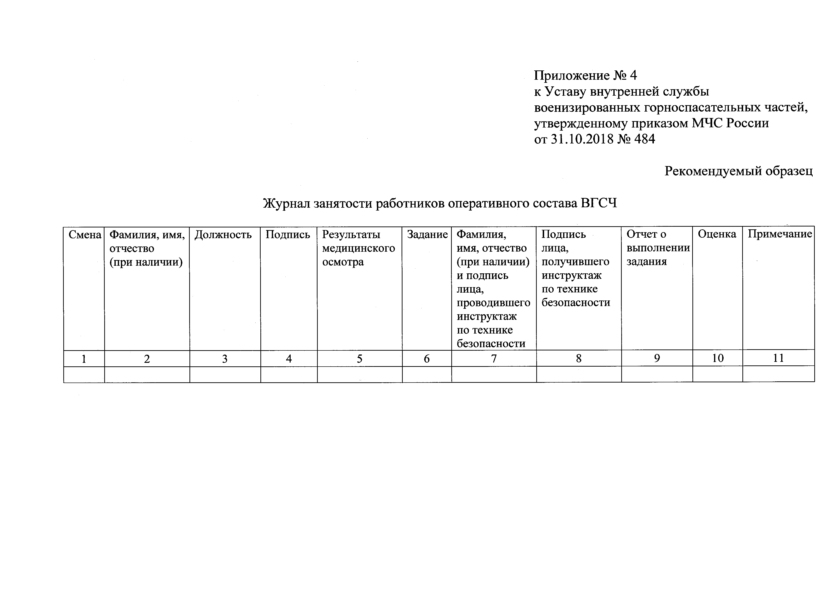 | Оглавление: | I. Общие положения II. Условия и порядок несения службы работниками оперативного состава ВГСЧ III. Обязанности находящихся на дежурстве работников IV. Порядок служебных взаимоотношений работников V. Размещение подразделений Приложение № 1. Рекомендуемый образец графика несения службы и специальной подготовки ВГСВ (ВГСП) работников младшей и рядовой служебных групп должностей Приложение № 2. Рекомендуемый образец графика несения службы и специальной подготовки командира отряда, работников высшей (старшей и (или) средней) служебной группы должностей Приложение № 3. Рекомендуемый образец порядка приема и сдачи дежурства в подразделениях ВГСЧ Приложение № 4. Рекомендуемый образец журнала занятости работников оперативного состава ВГСЧ |