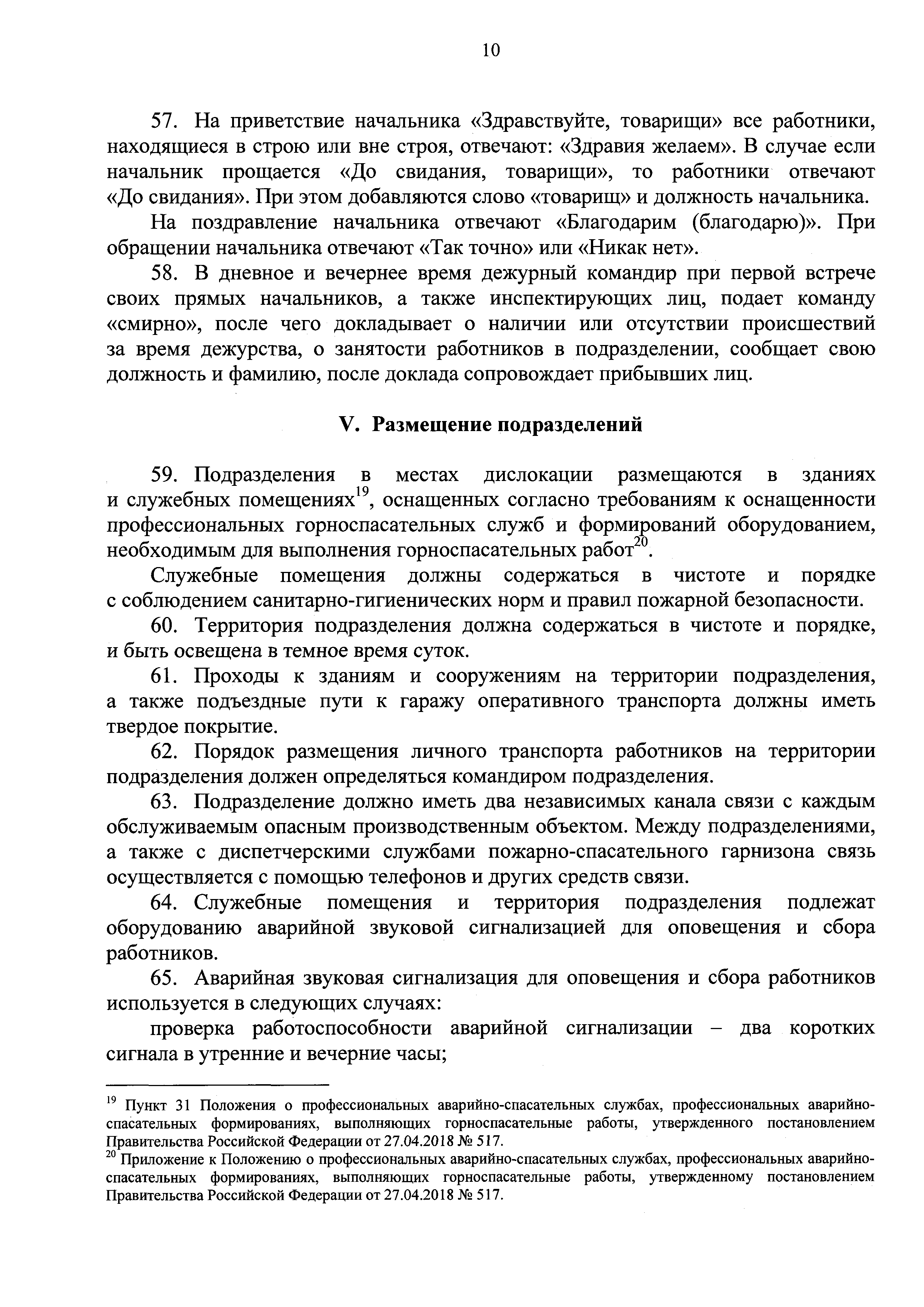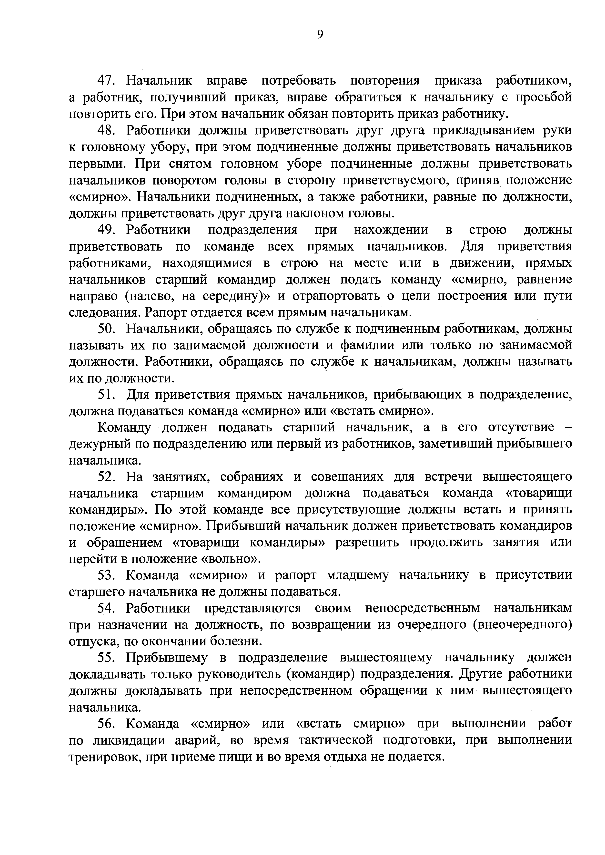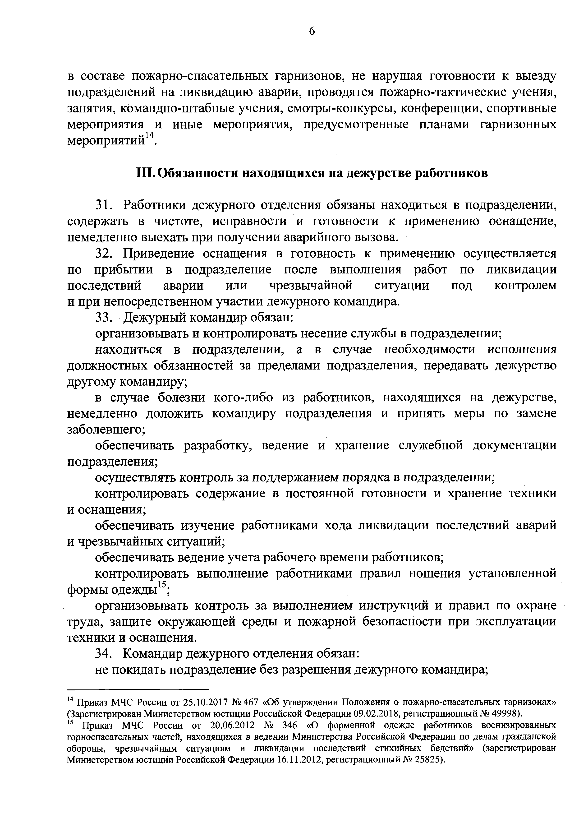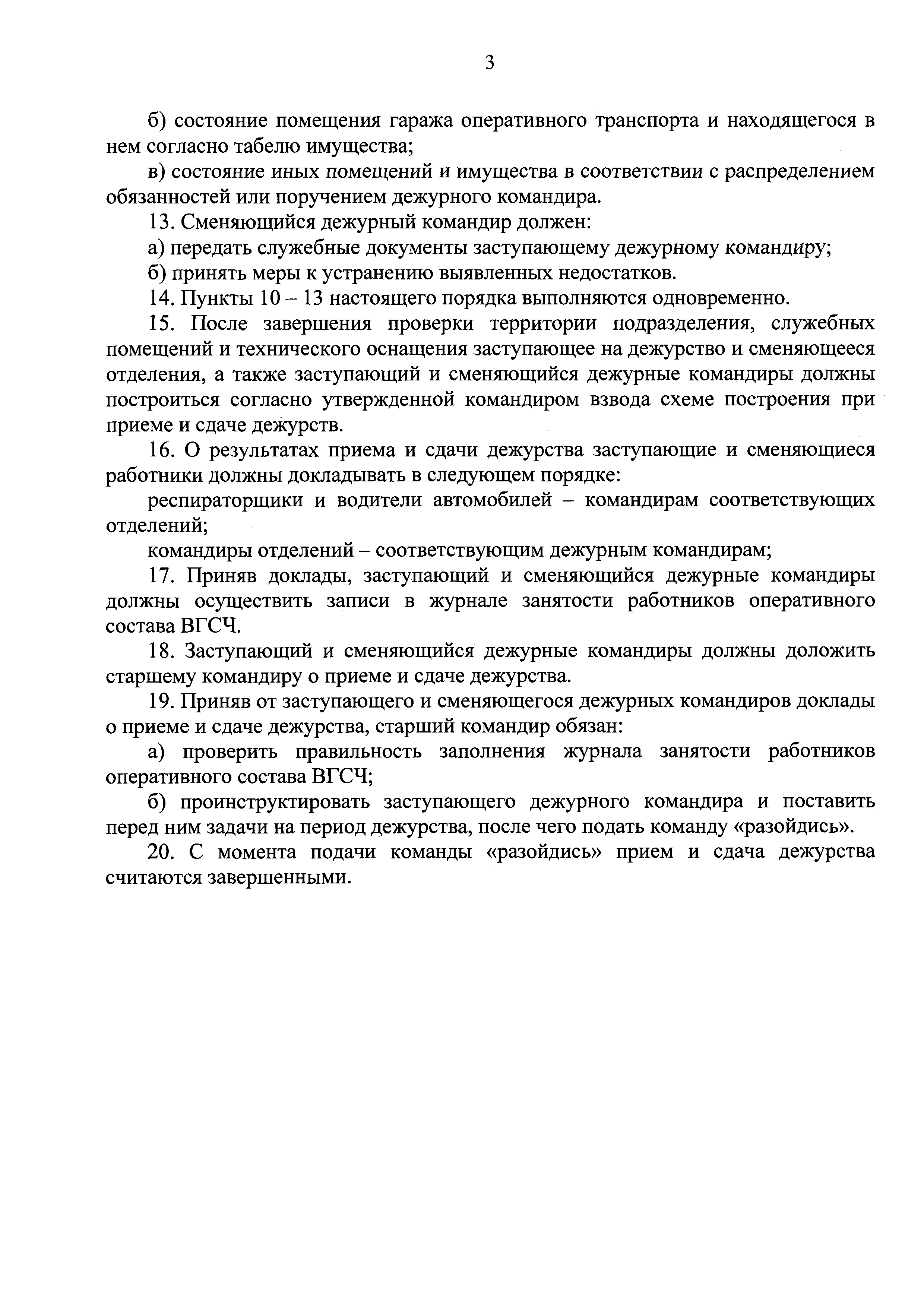 | Оглавление: | I. Общие положения II. Условия и порядок несения службы работниками оперативного состава ВГСЧ III. Обязанности находящихся на дежурстве работников IV. Порядок служебных взаимоотношений работников V. Размещение подразделений Приложение № 1. Рекомендуемый образец графика несения службы и специальной подготовки ВГСВ (ВГСП) работников младшей и рядовой служебных групп должностей Приложение № 2. Рекомендуемый образец графика несения службы и специальной подготовки командира отряда, работников высшей (старшей и (или) средней) служебной группы должностей Приложение № 3. Рекомендуемый образец порядка приема и сдачи дежурства в подразделениях ВГСЧ Приложение № 4. Рекомендуемый образец журнала занятости работников оперативного состава ВГСЧ |