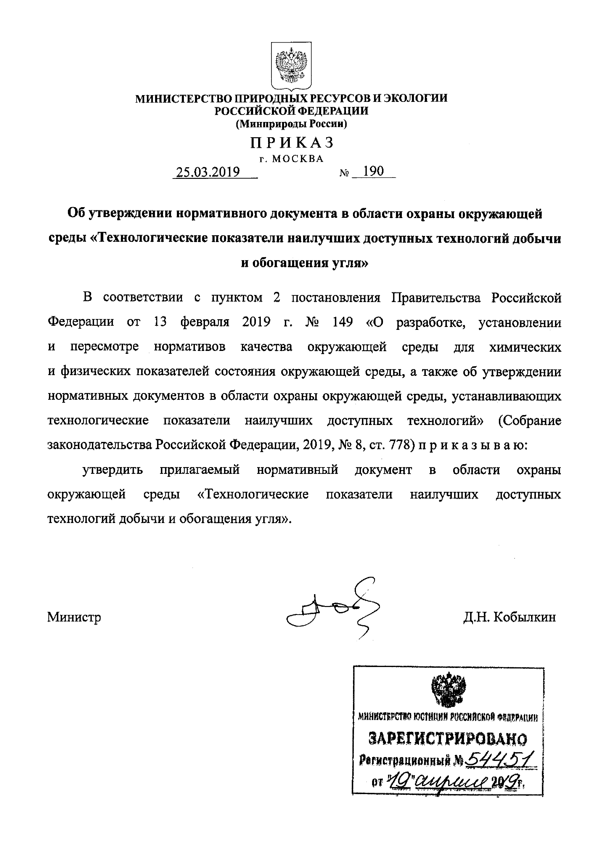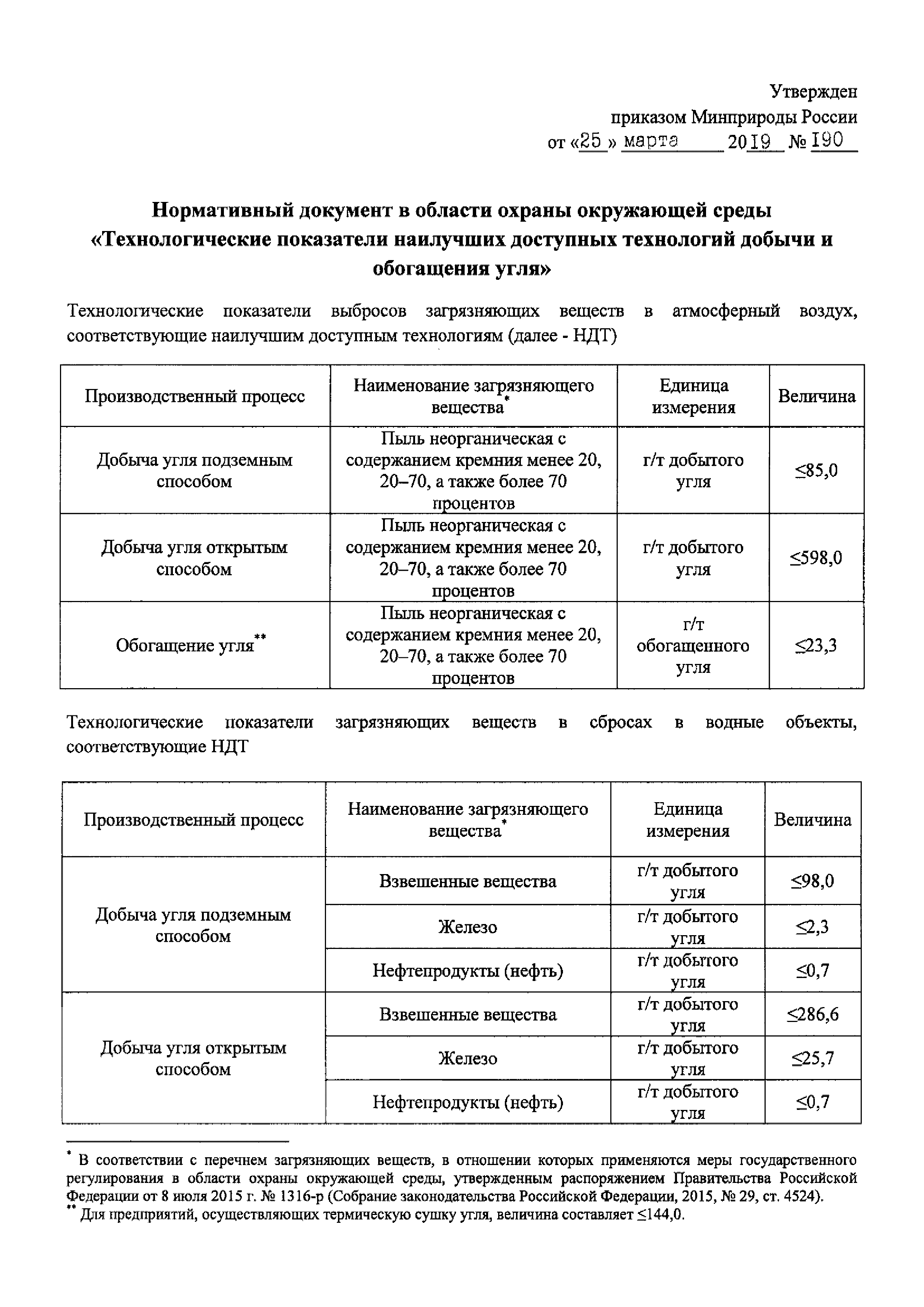 Нормативный документ в области охраны окружающей среды "Технологические показатели наилучших доступных технологий добычи и обогащения угля"| Статус: | действует | | Название рус.: | Нормативный документ в области охраны окружающей среды "Технологические показатели наилучших доступных технологий добычи и обогащения угля" | | Дата добавления в базу: | 01.02.2020 | | Дата актуализации: | 01.01.2021 | | Дата введения: | 30.04.2019 | | Утверждён: | 25.03.2019 Министерство природных ресурсов и экологии Российской Федерации (190)