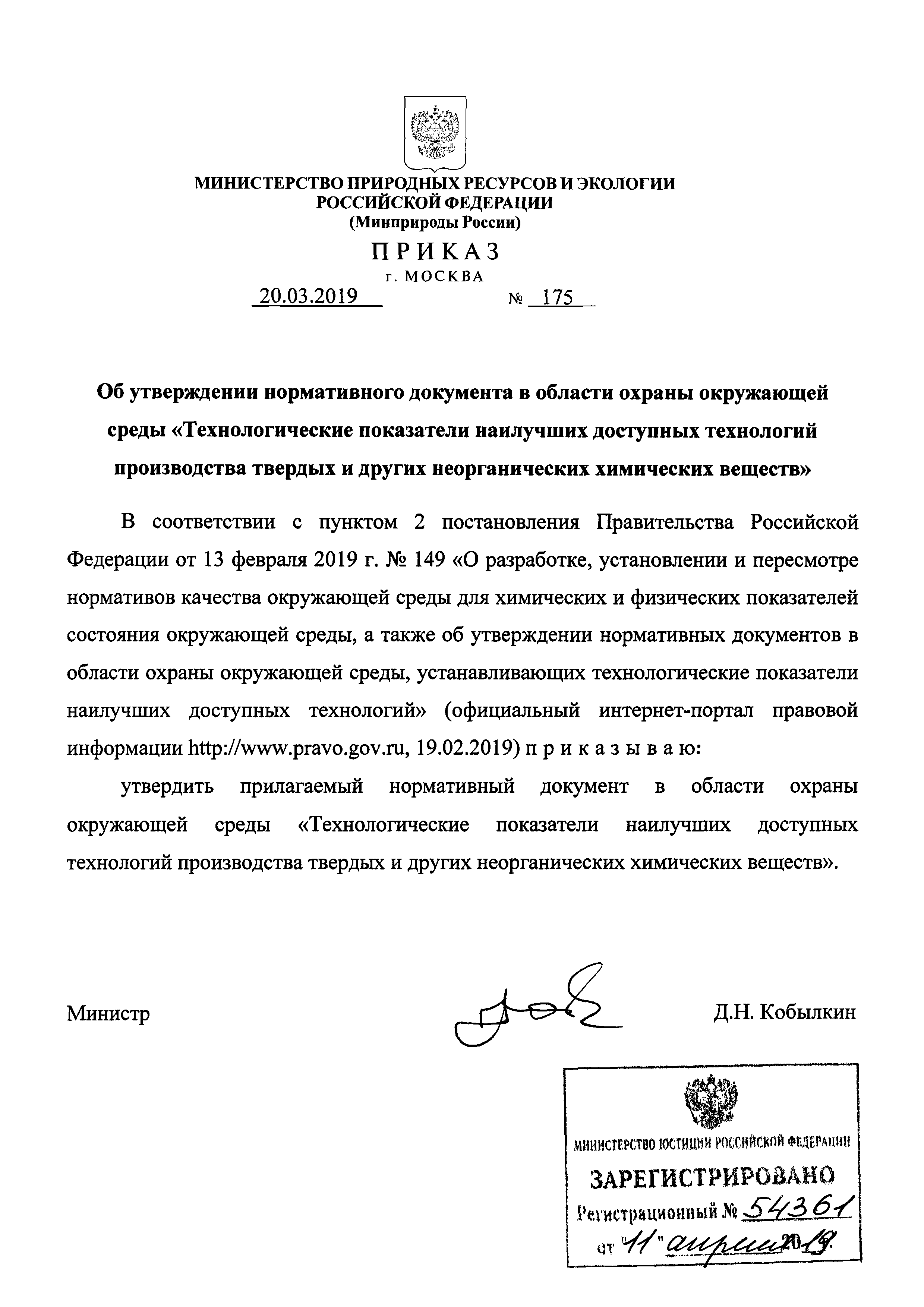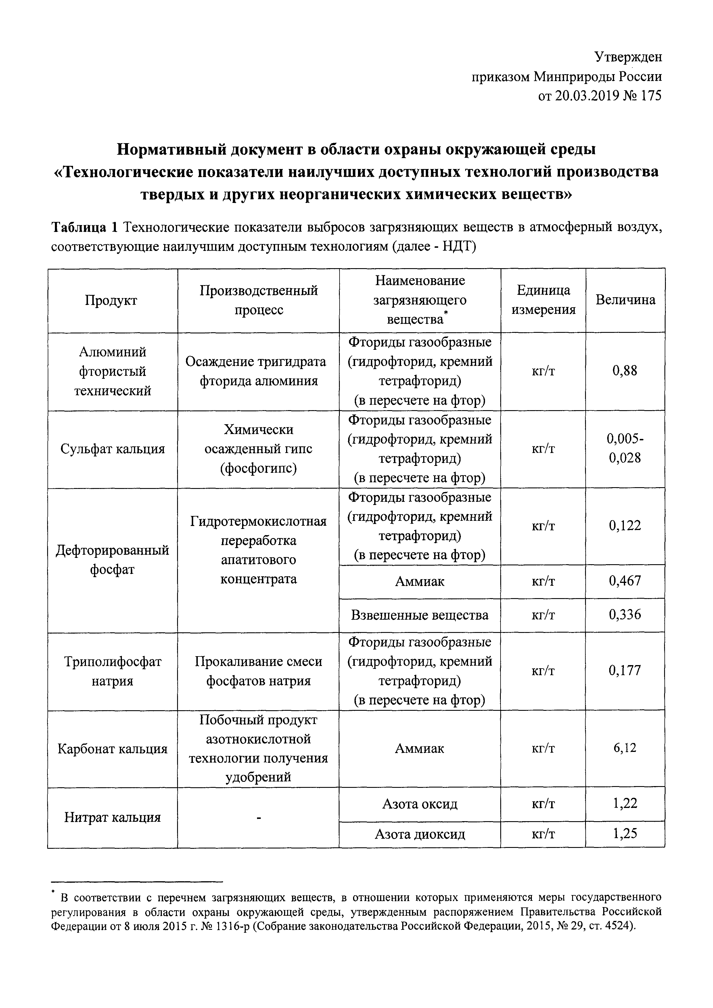 Нормативный документ в области охраны окружающей среды "Технологические показатели наилучших доступных технологий производства твердых и других неорганических химических веществ"| Статус: | действует | | Название рус.: | Нормативный документ в области охраны окружающей среды "Технологические показатели наилучших доступных технологий производства твердых и других неорганических химических веществ" | | Дата добавления в базу: | 01.02.2020 | | Дата актуализации: | 01.01.2021 | | Дата введения: | 26.04.2019 | | Утверждён: | 20.03.2019 Министерство природных ресурсов и экологии Российской Федерации (175)