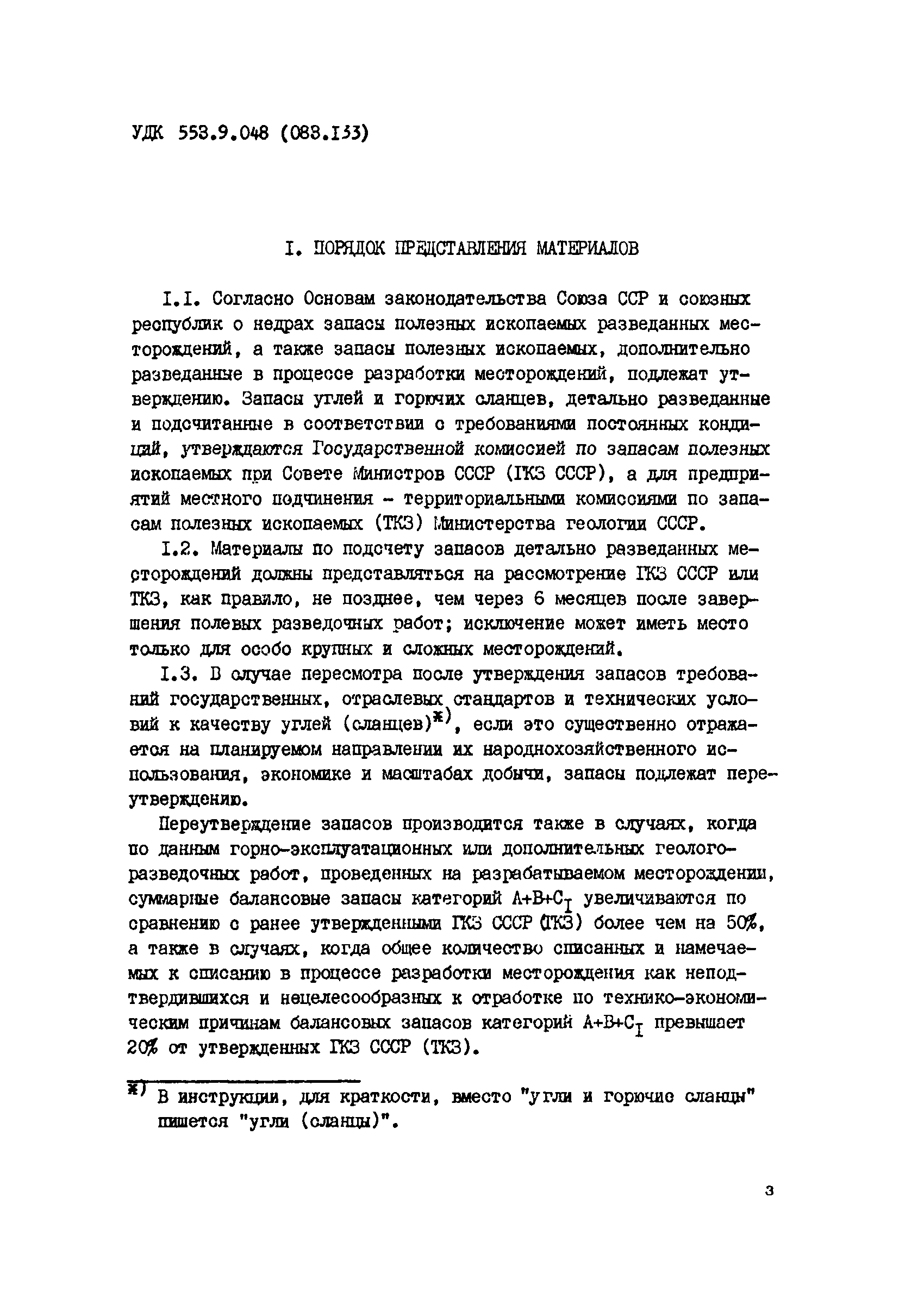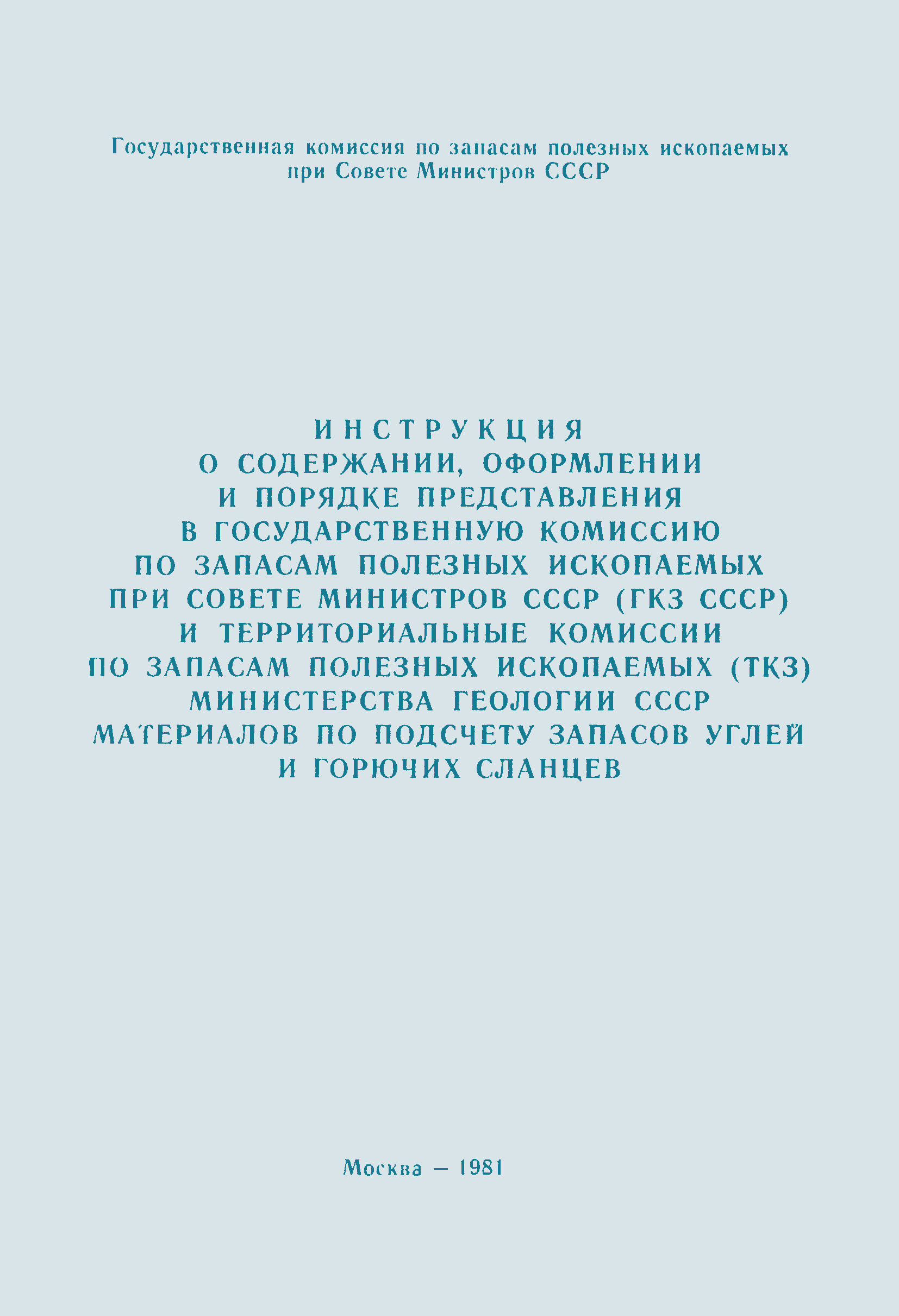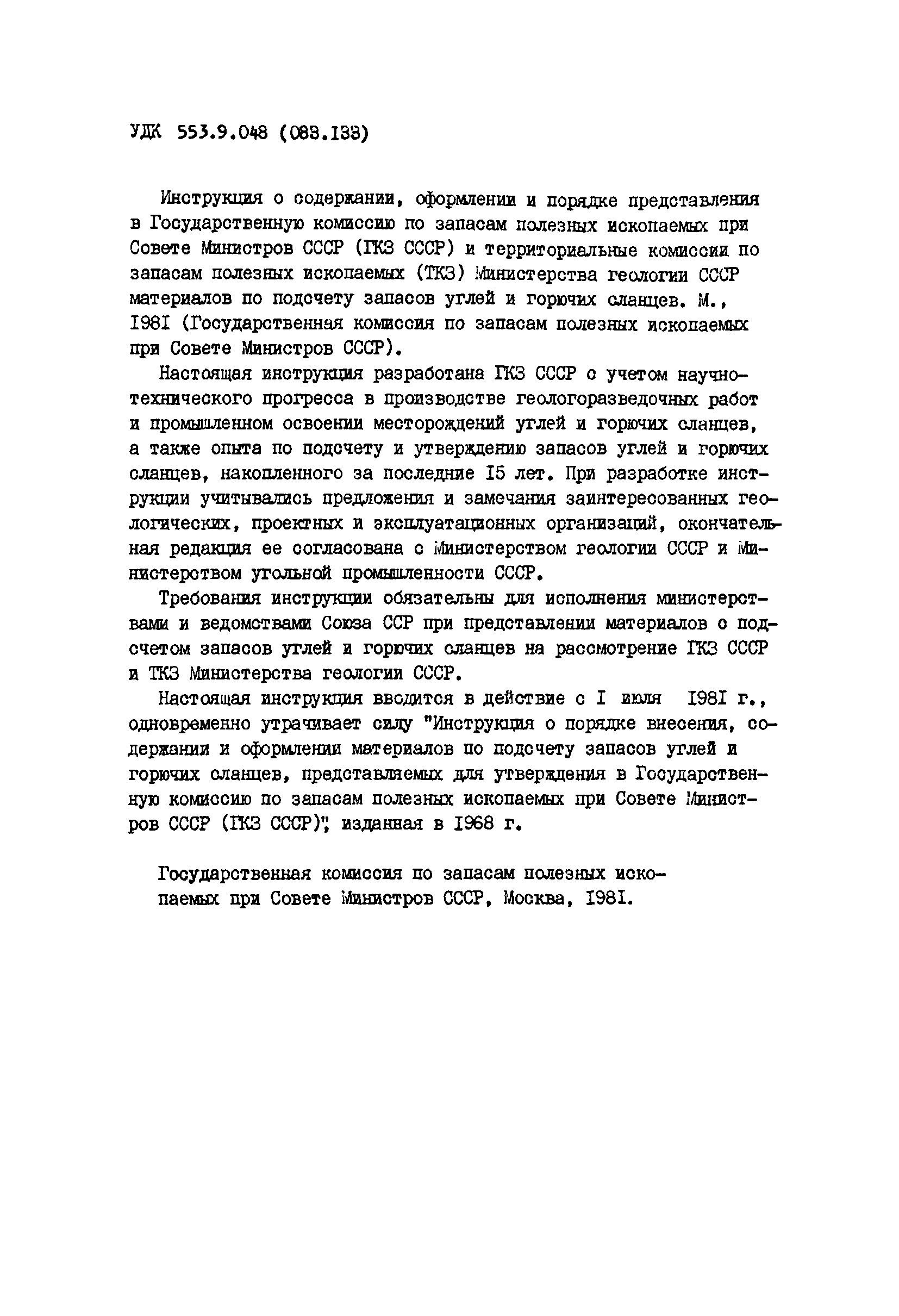 | Название рус.: | Инструкция о содержании, оформлении и порядке предоставления в Государственную комиссию по запасам полезных ископаемых при Совете Министров СССР (ГКЗ СССР) и территориальные комиссии по запасам полезных ископаемых (ТКЗ) Министерства геологии СССР материалов по подсчету запасов углей и горючих сланцев |