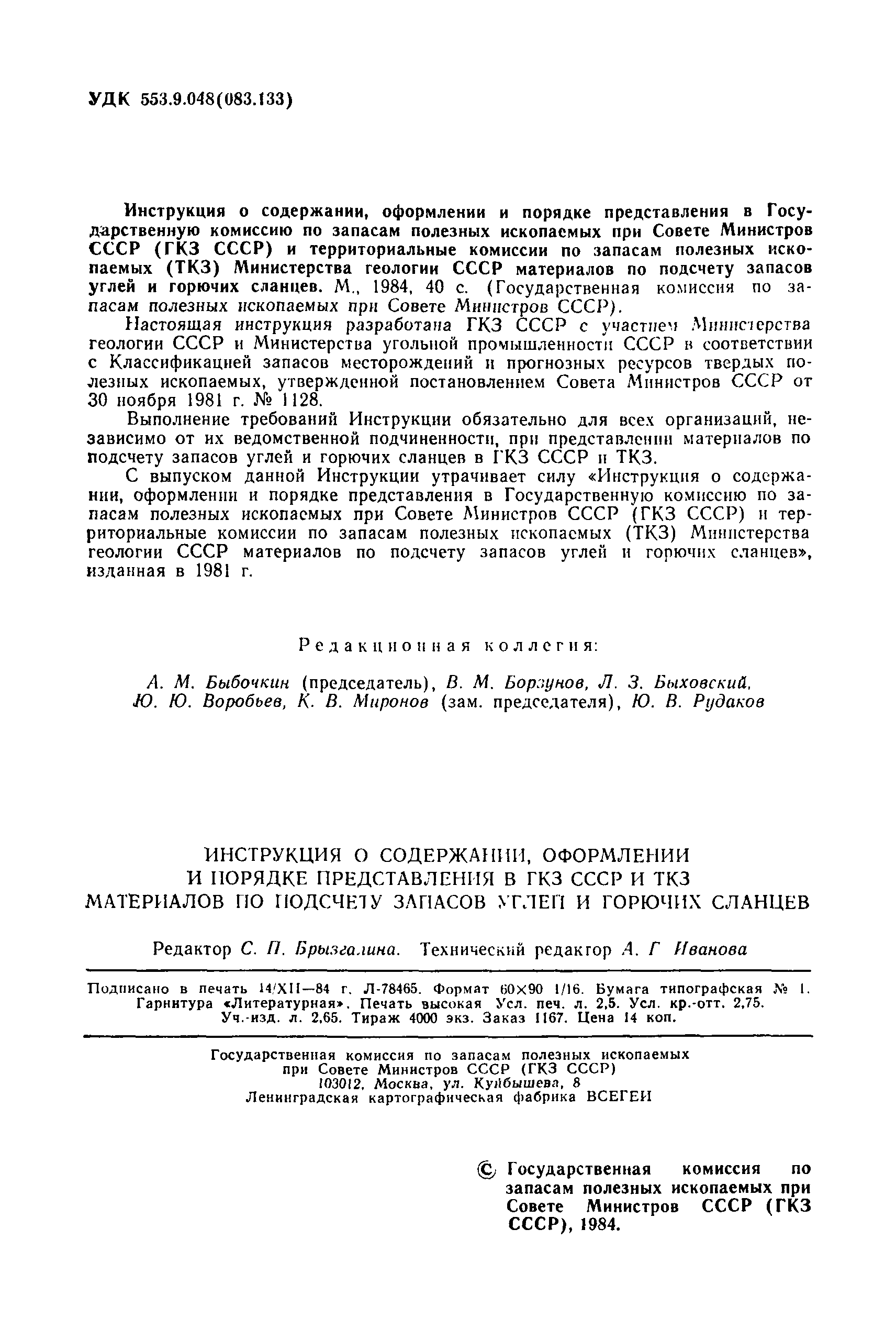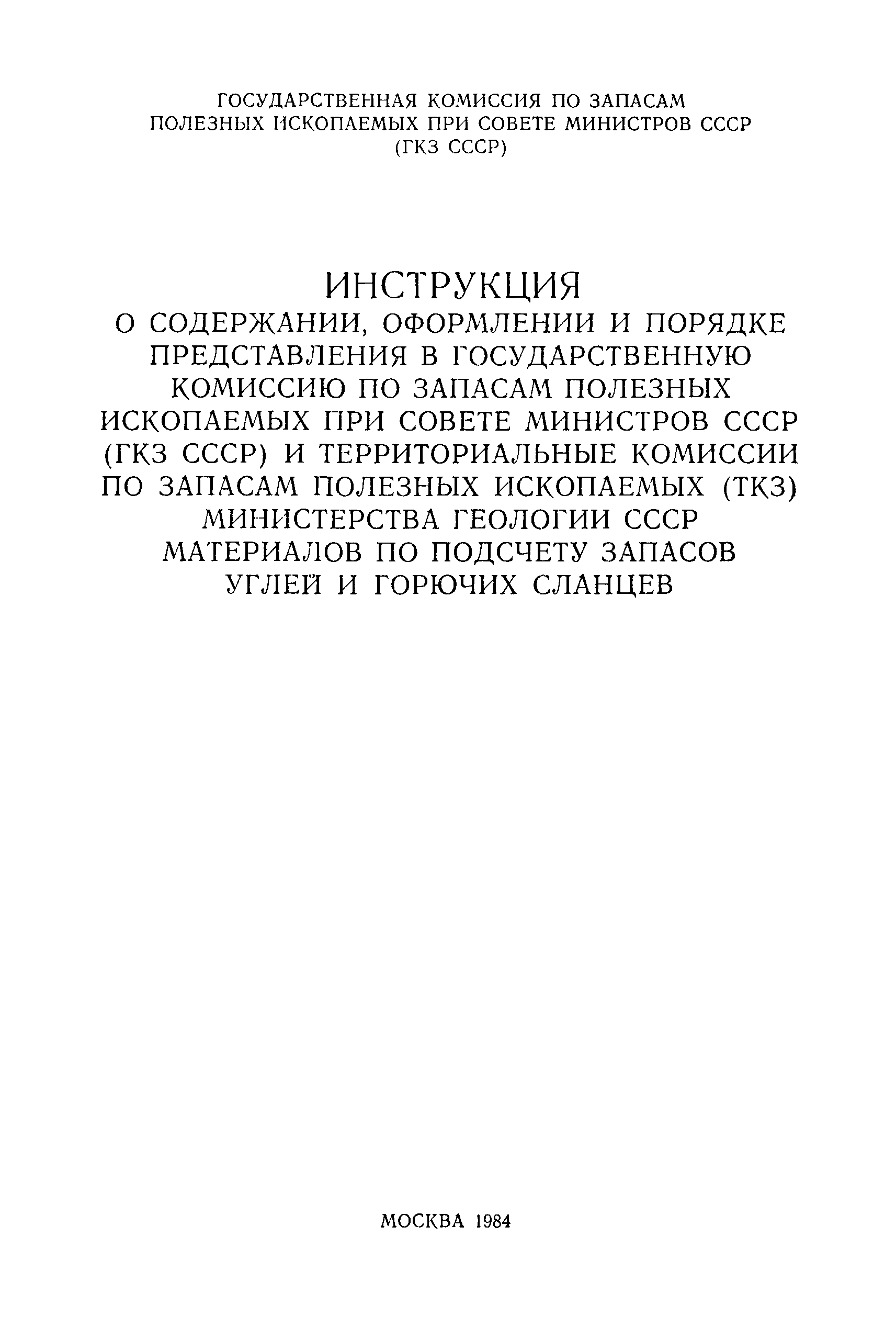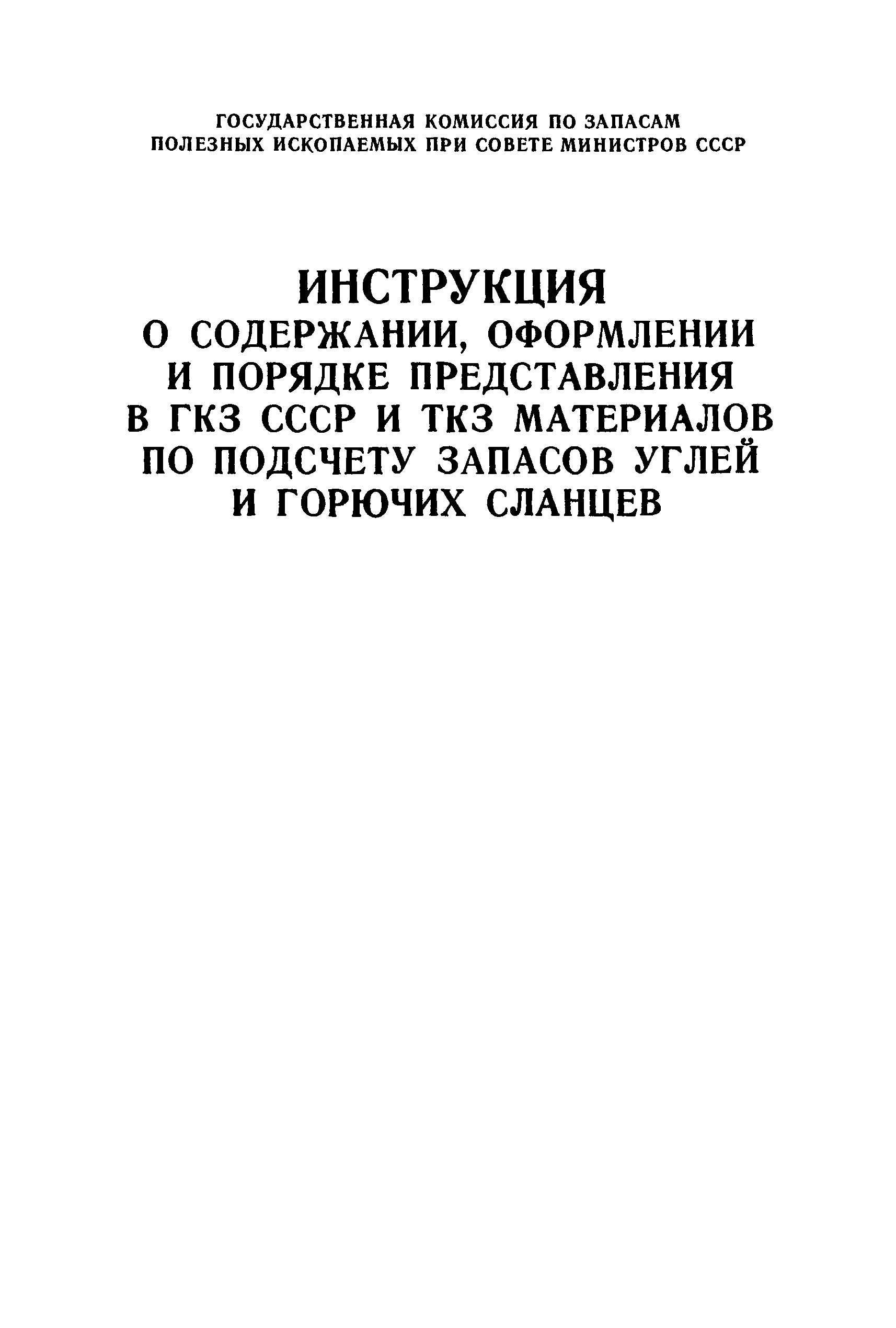 | Название рус.: | Инструкция о содержании, оформлении и порядке предоставления в ГКЗ СССР и ТКЗ материалов по подсчету запасов углей и горючих сланцев |