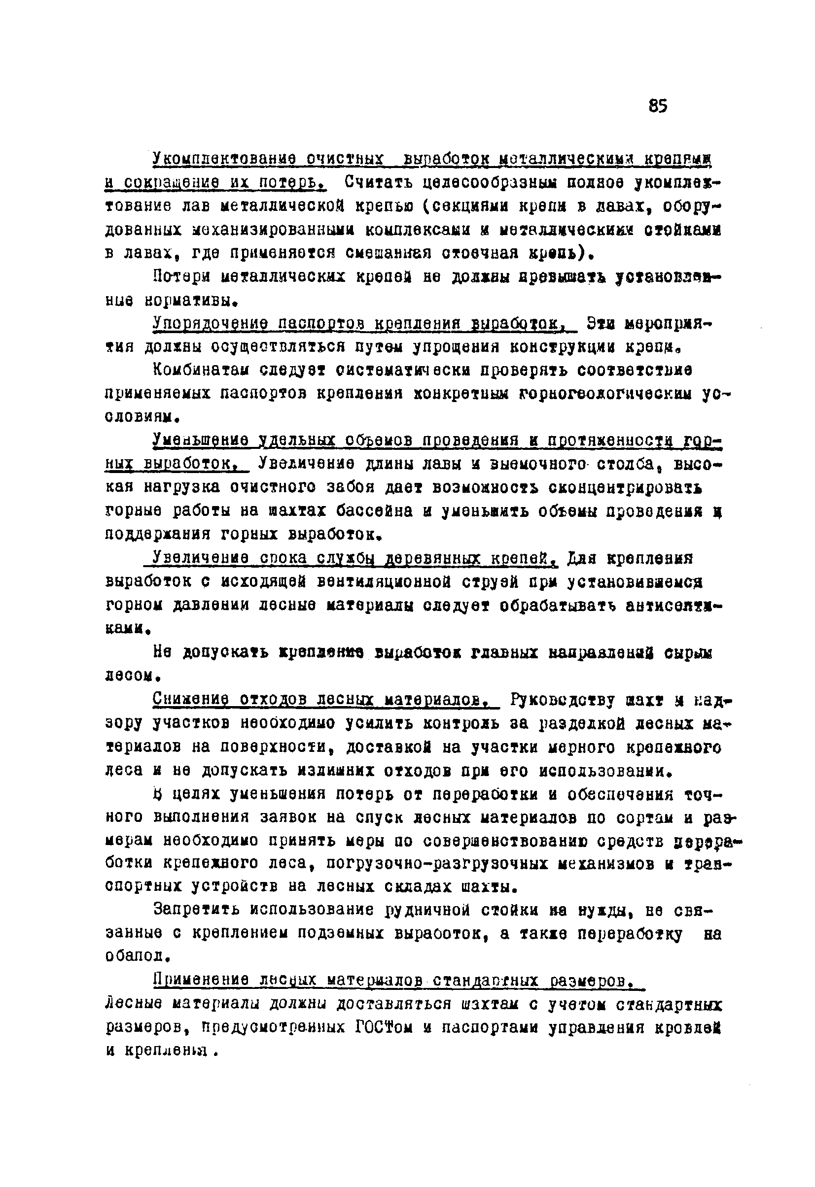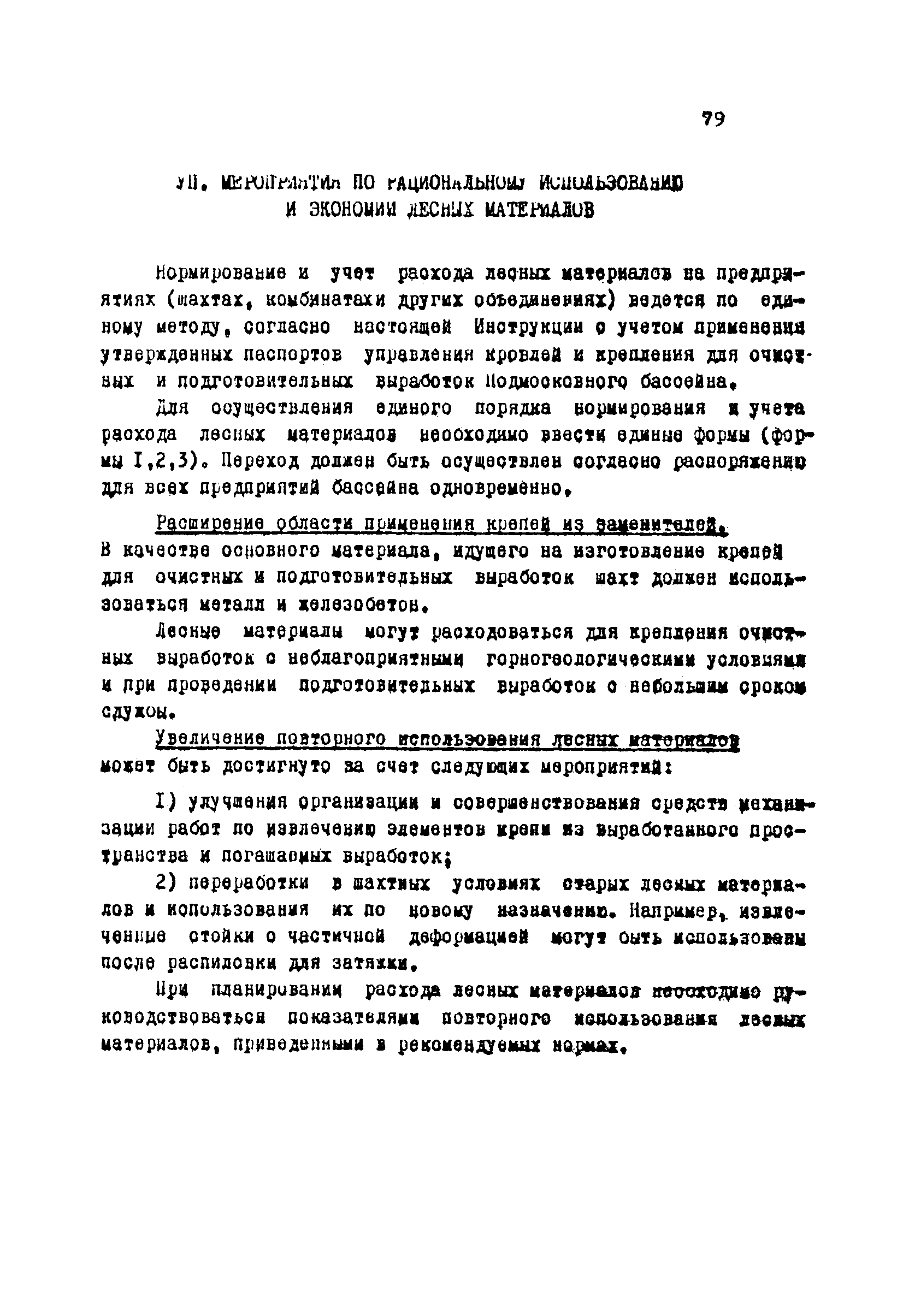 | Оглавление: | 1. Общие положения 2. Нормирование расхода лесных материалов для крепления очистных выработок 3. Нормирование расхода лесных материалов на проведение подготовительных выработок 4. Нормирование расхода лесных материалов на ремонт горных выработок 5. Нормирование расхода лесных материалов на "прочие подземные работы" 6. Метод составления сводно-плановых норм расхода лесных материалов 7. Мероприятия по рациональному использованию и экономии лесных материалов |