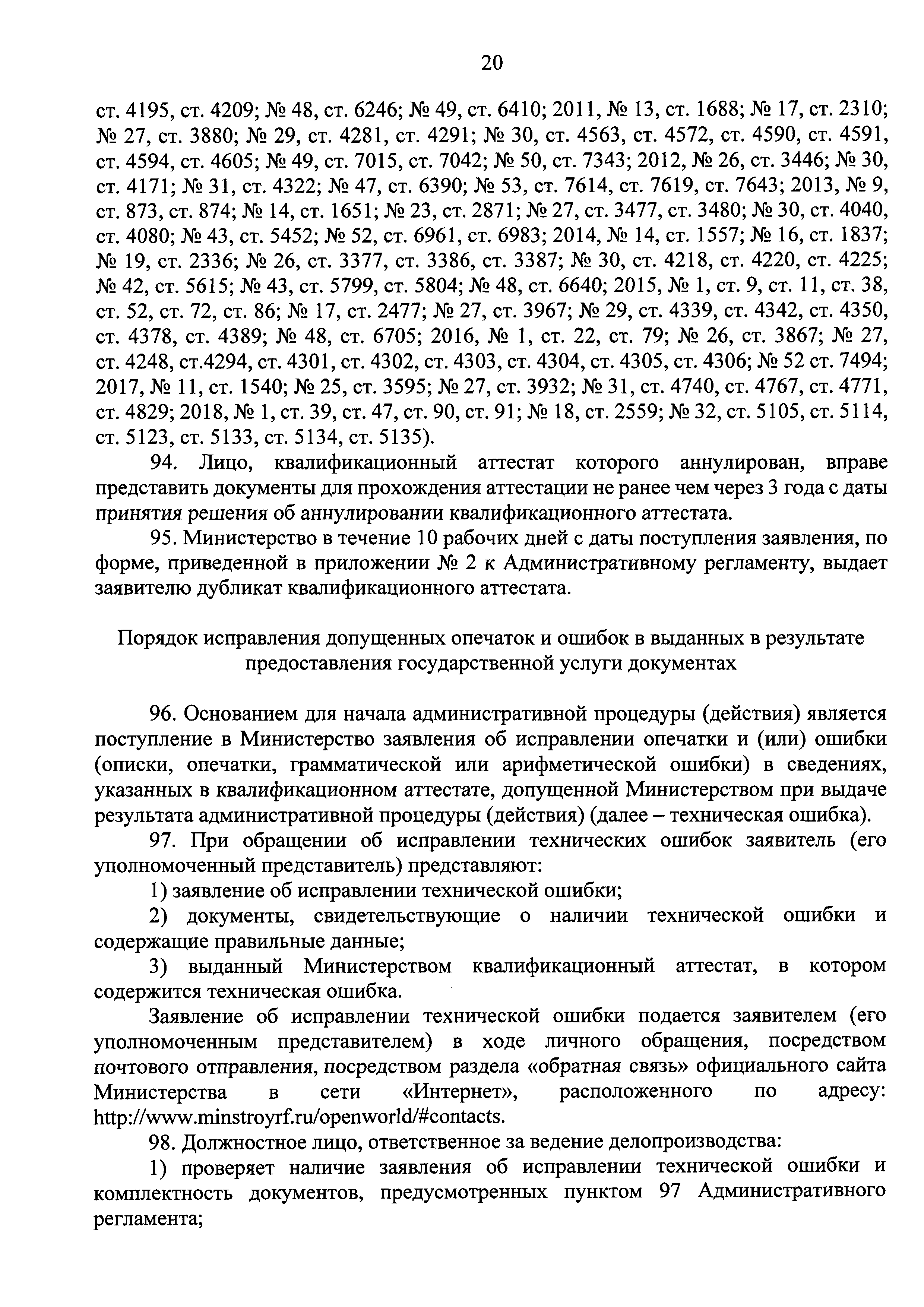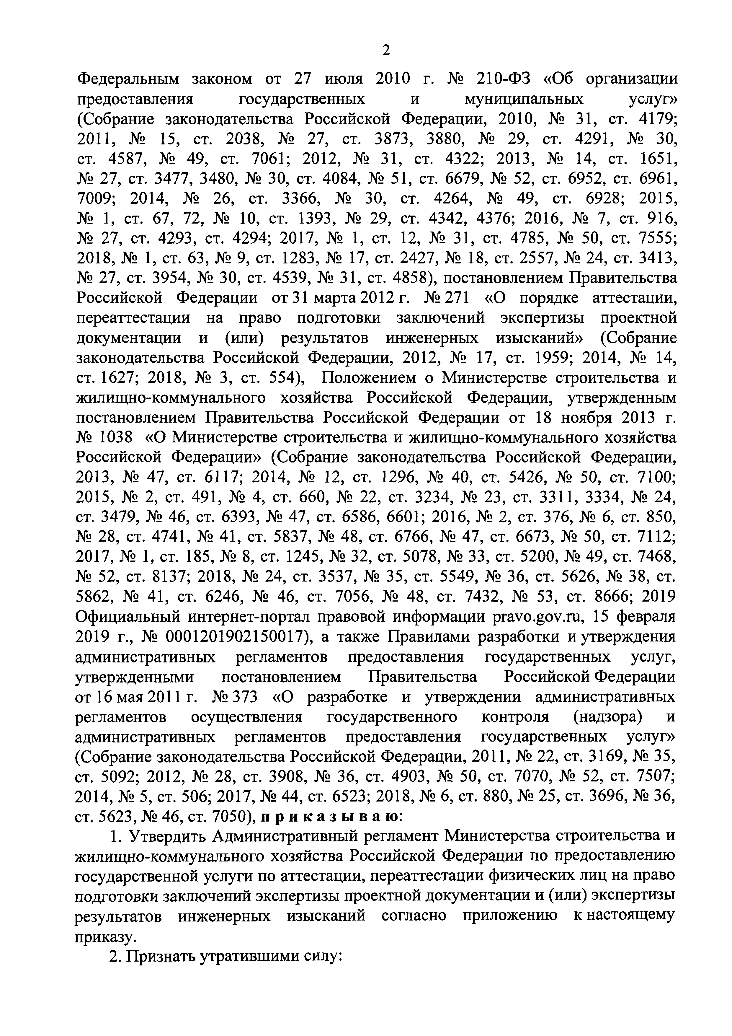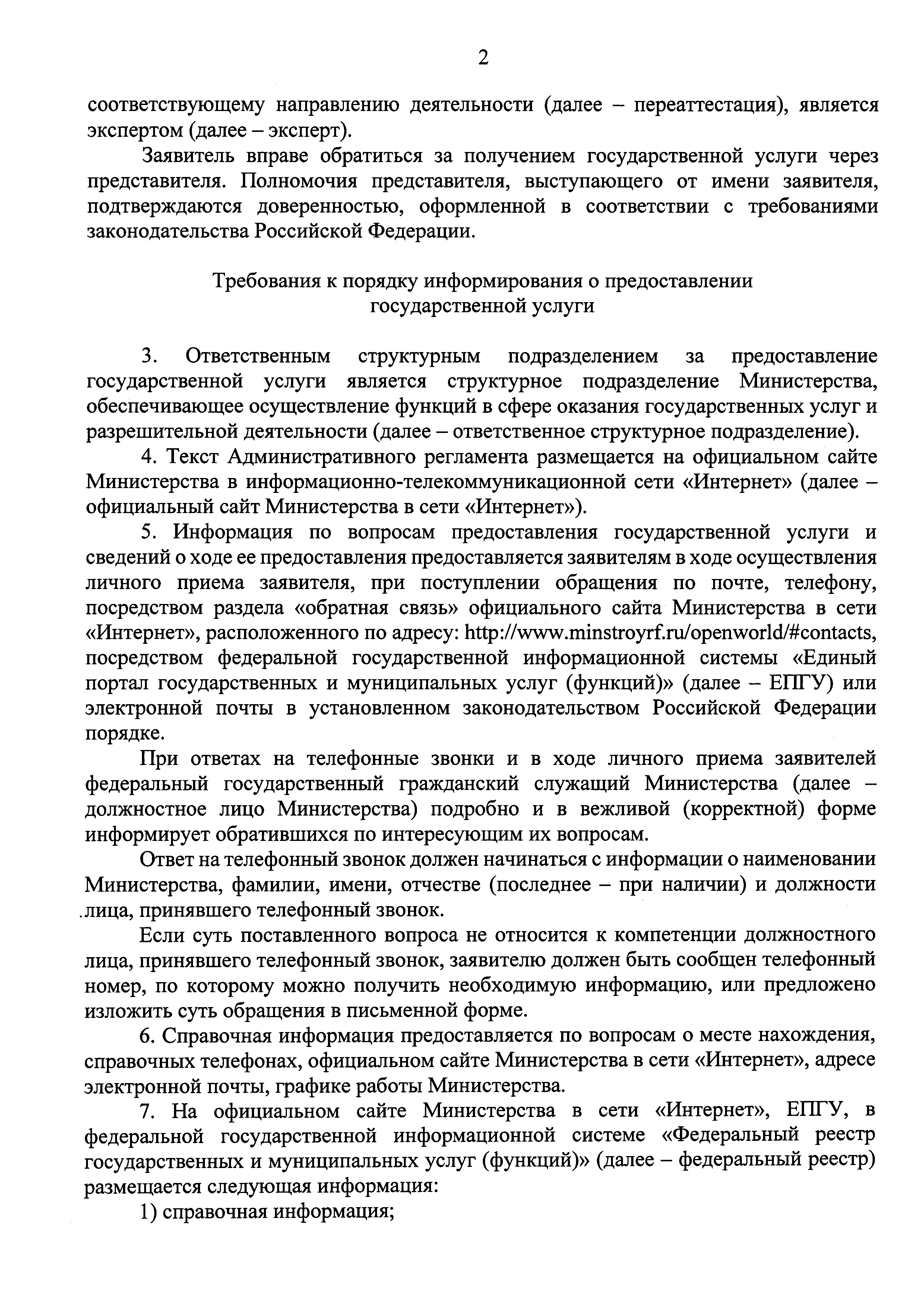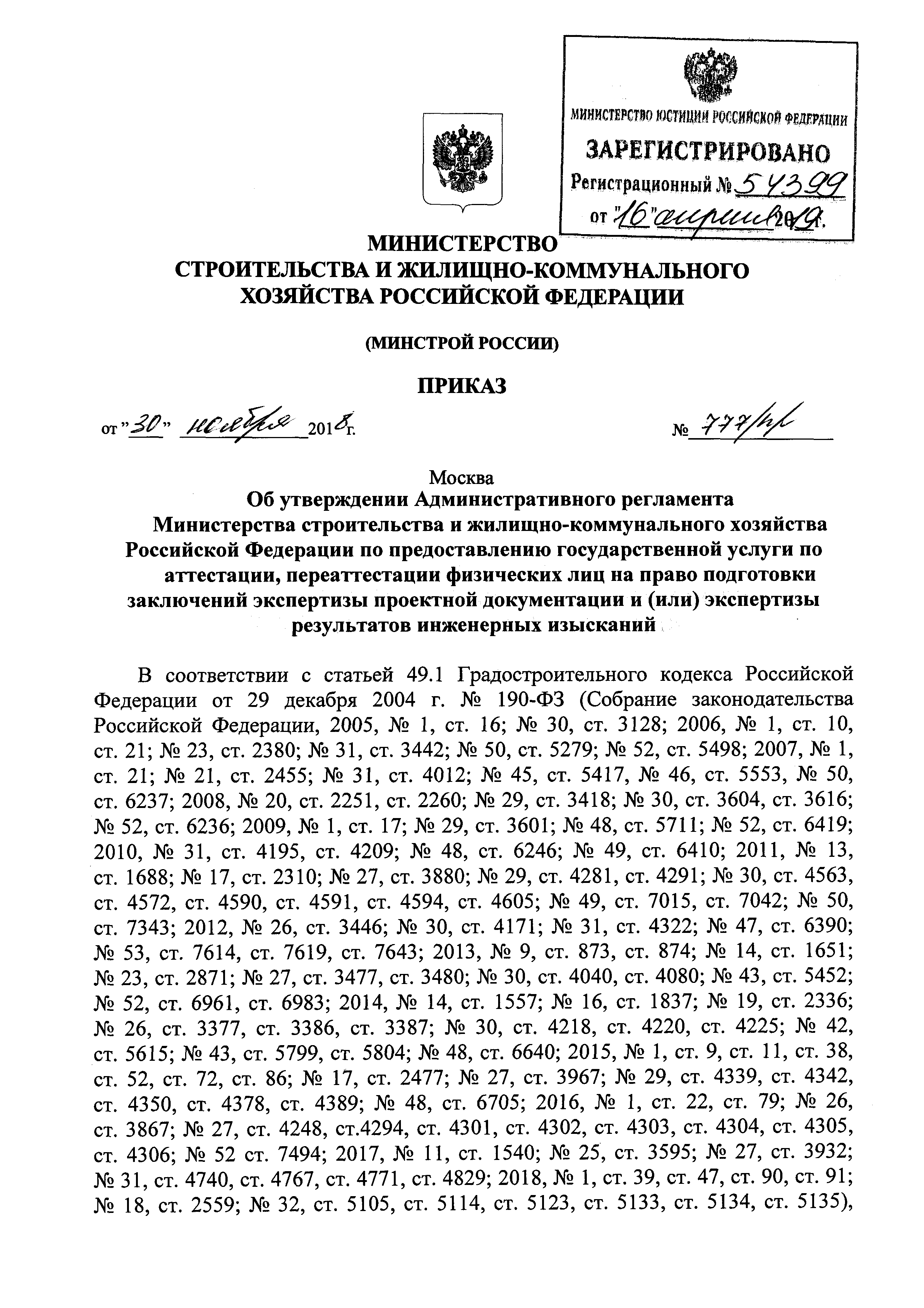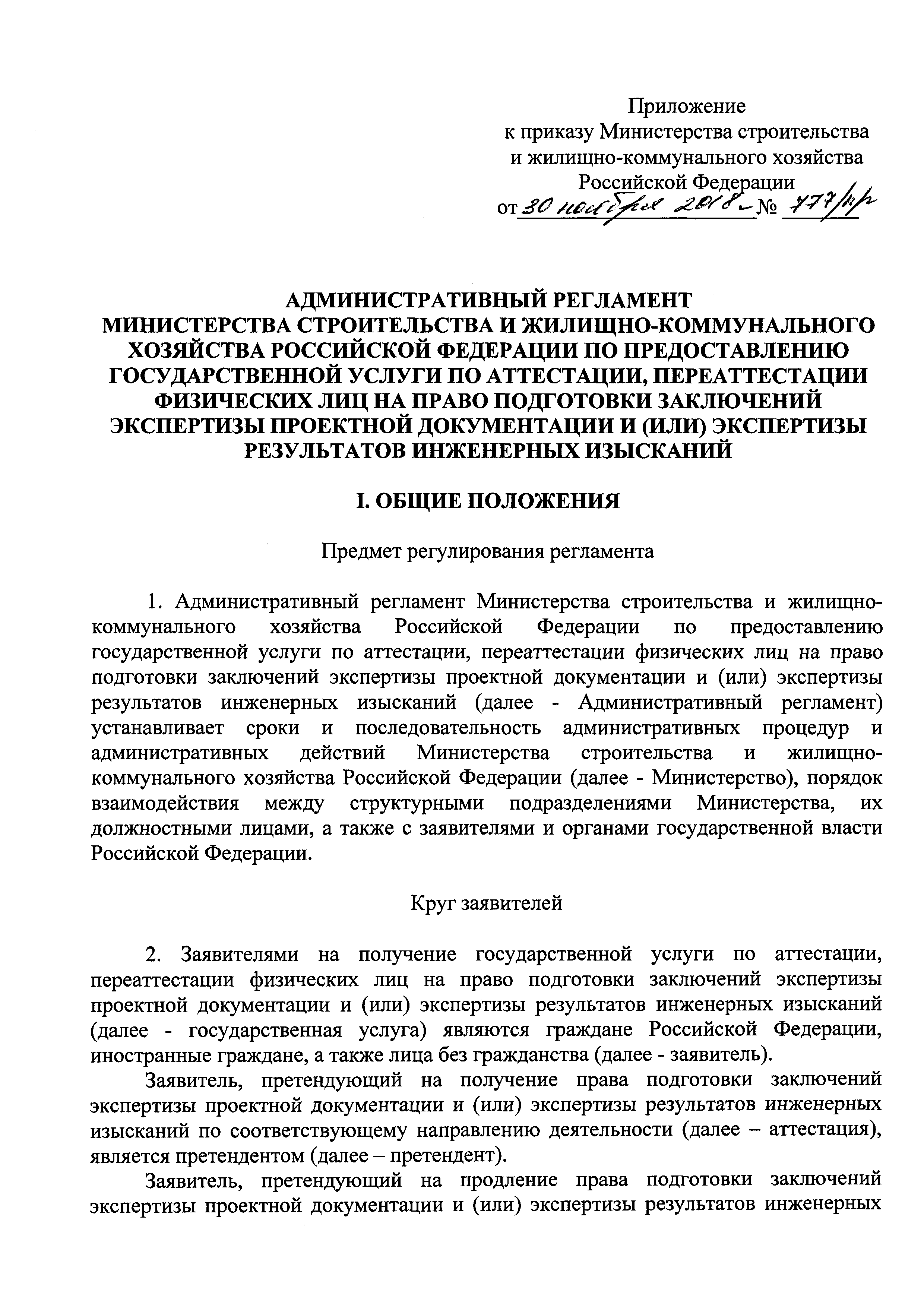 | Название рус.: | Административный регламент Министерства строительства и жилищно-коммунального хозяйства Российской Федерации по предоставлению государственной услуги по аттестации, переаттестации физических лиц на право подготовки заключений экспертизы проектной документации и (или) экспертизы результатов инженерных изысканий |