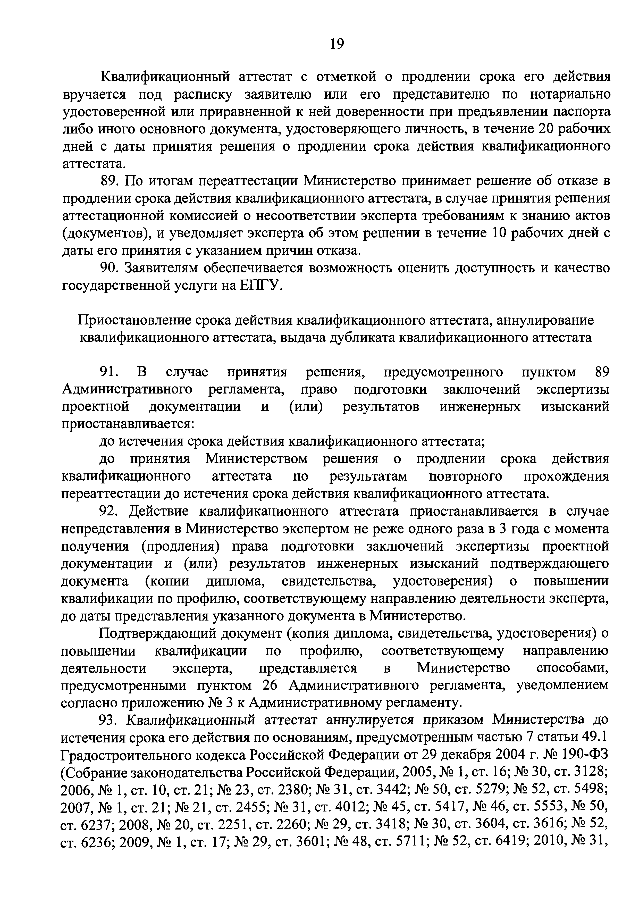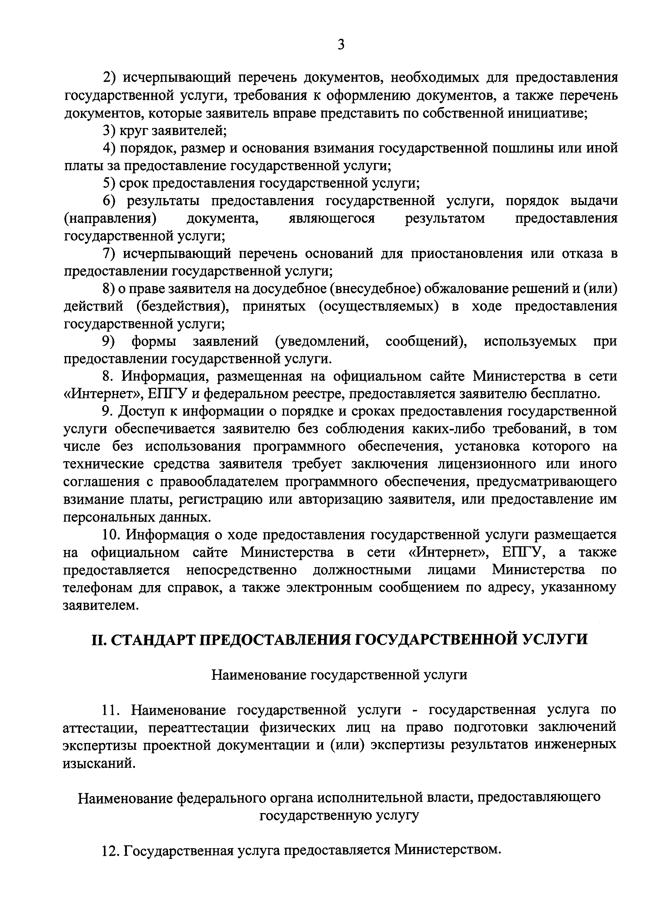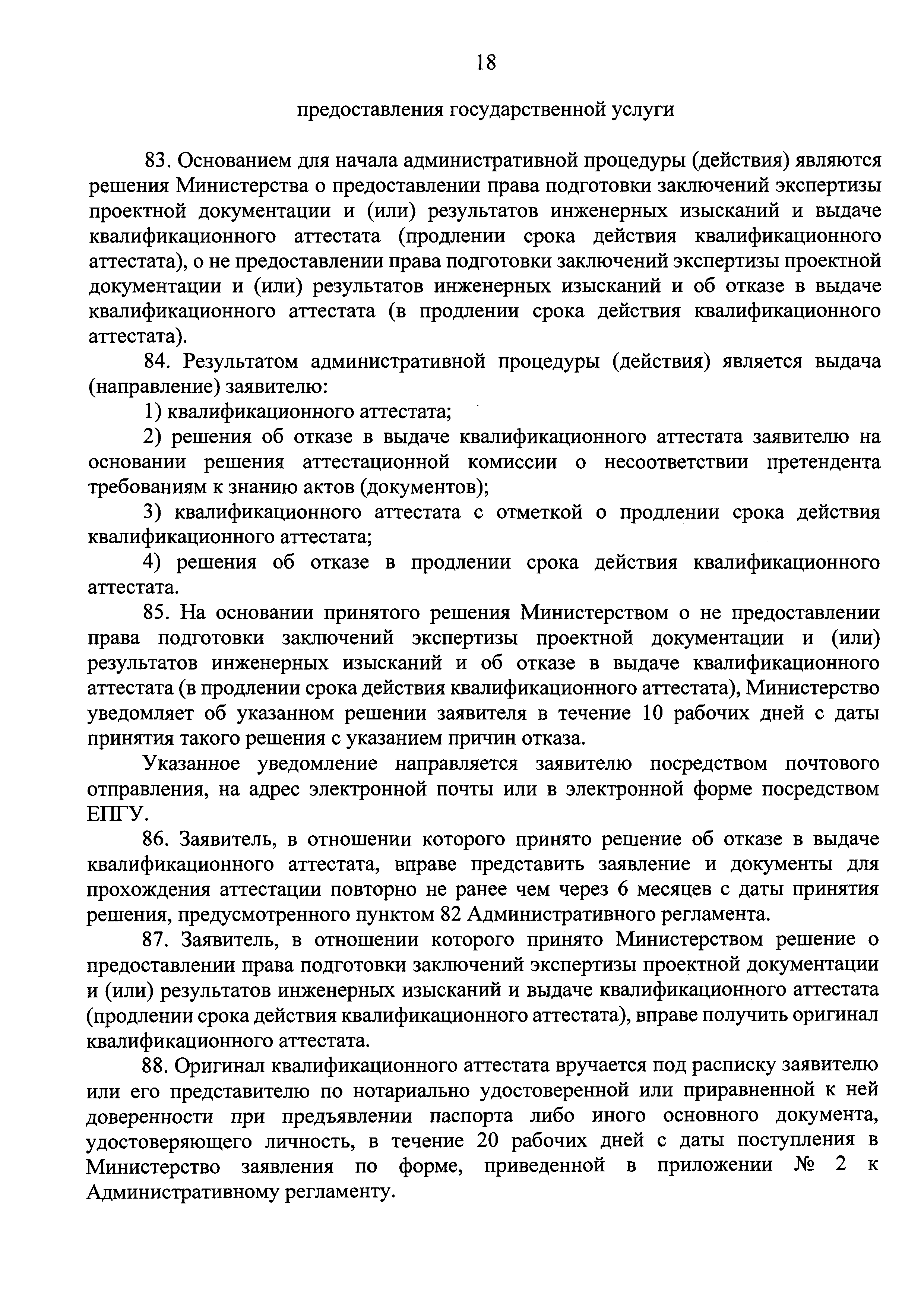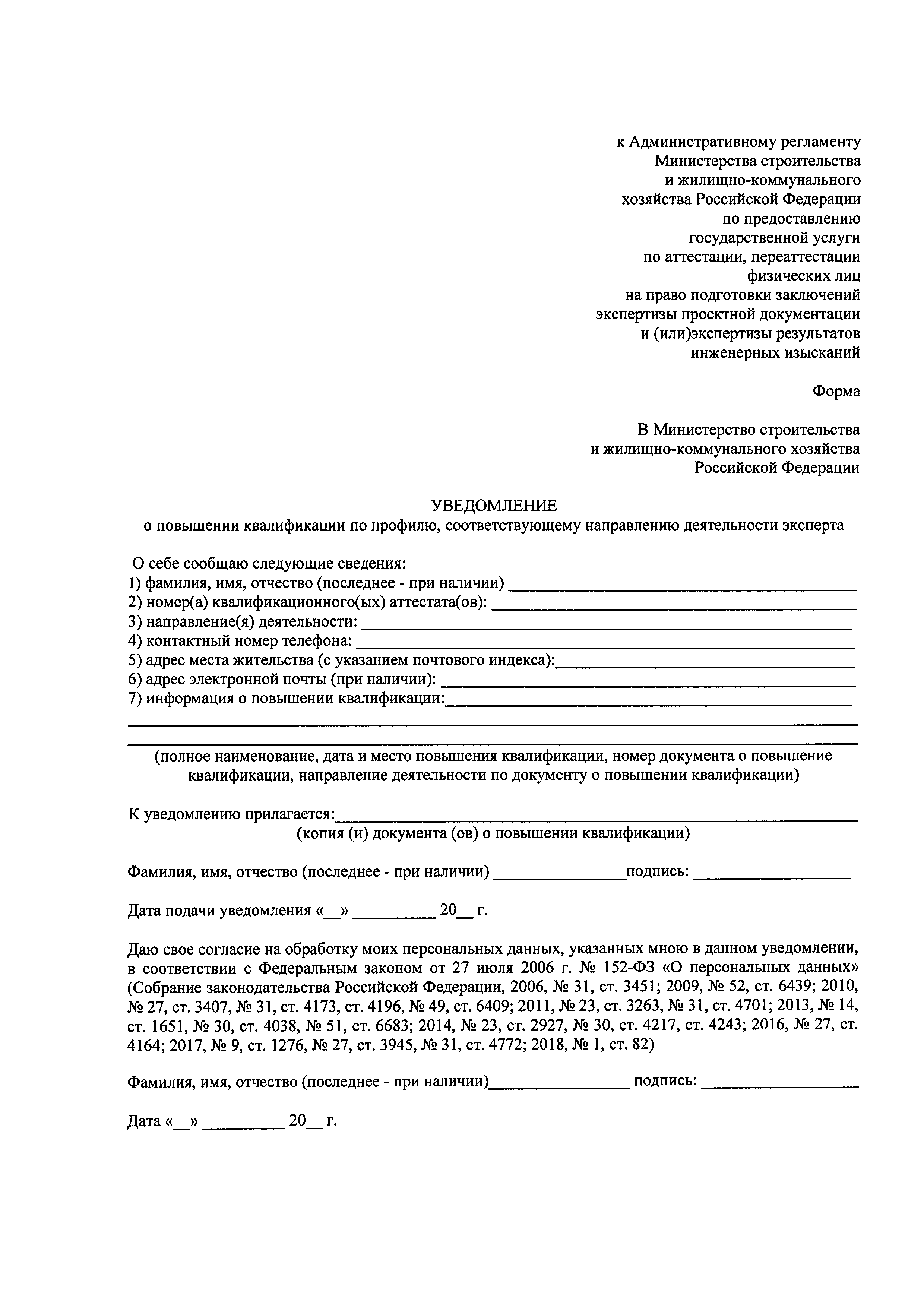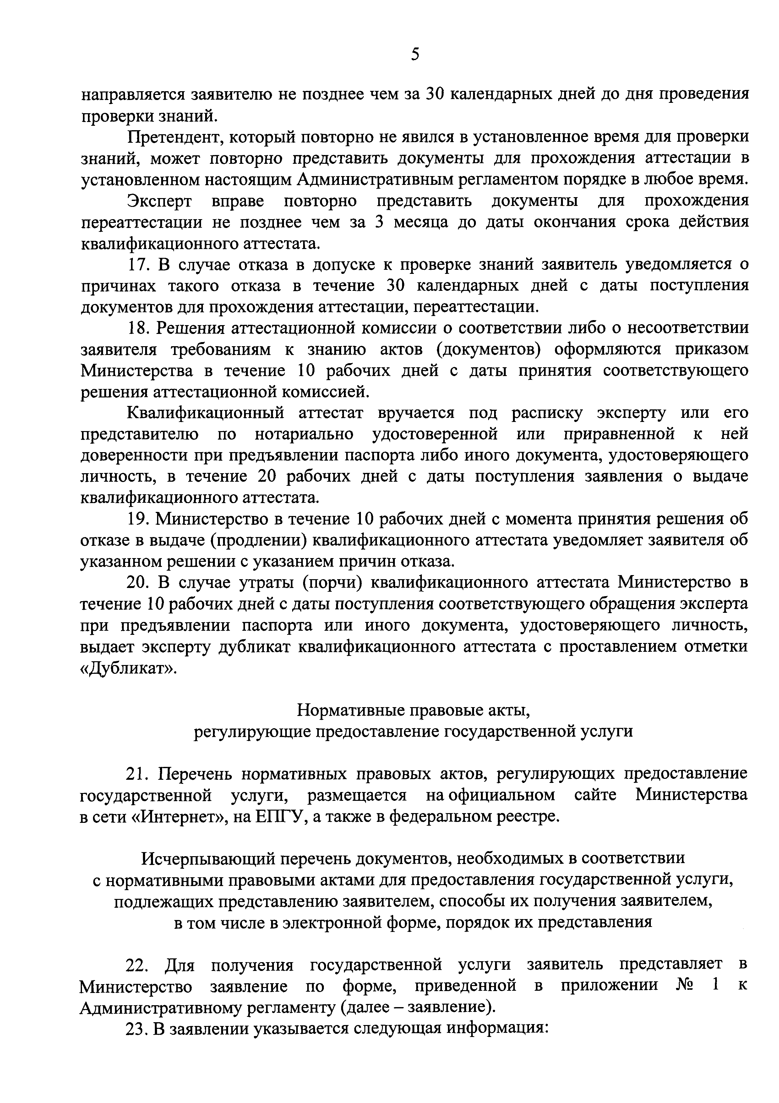 | Оглавление: | I. Общие положения II. Стандарт предоставления государственной услуги III. Состав, последовательность и сроки выполнения административных процедур (действий), требования к порядку их выполнения, в том числе особенности выполнения административных процедур (действий) в электронной форме IV. Формы контроля за исполнением административного регламента предоставления государственной услуги V. Досудебный (внесудебный) порядок обжалования решений и действий (бездействия) органа, предоставляющего государственную услугу, а также его должностных лиц Приложение № 1. Форма заявления для прохождения аттестации/переаттестации на право подготовки заключений экспертизы проектной документации и (или) экспертизы результатов инженерных изысканий Приложение № 2. Форма заявления о выдаче оригинала/дубликата квалификационного аттестата на право подготовки заключения экспертизы проектной документации и (или) экспертизы результатов инженерных изысканий Приложение № 3. Форма уведомления о повышении квалификации по профилю, соответствующему направлению деятельности эксперта |
