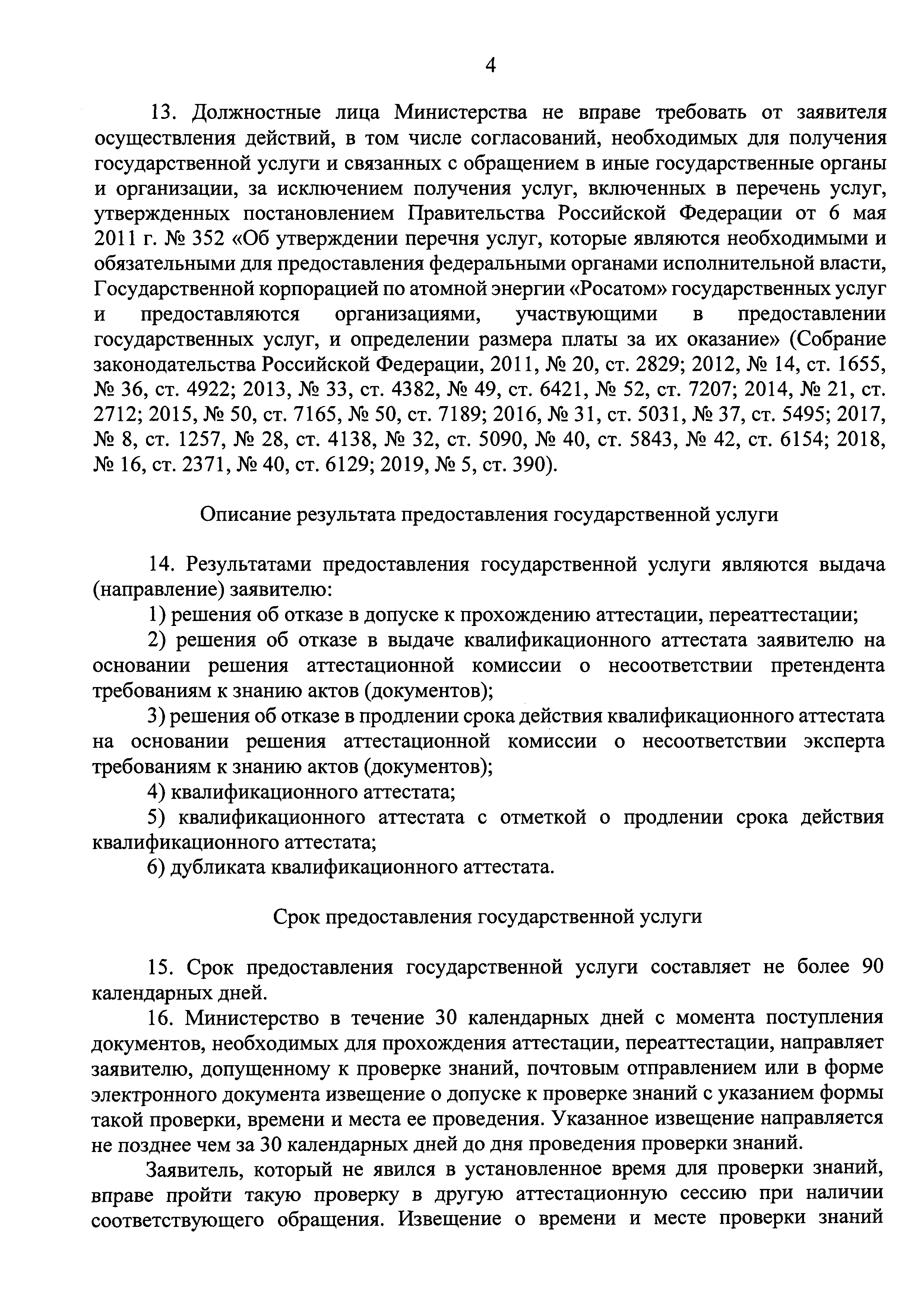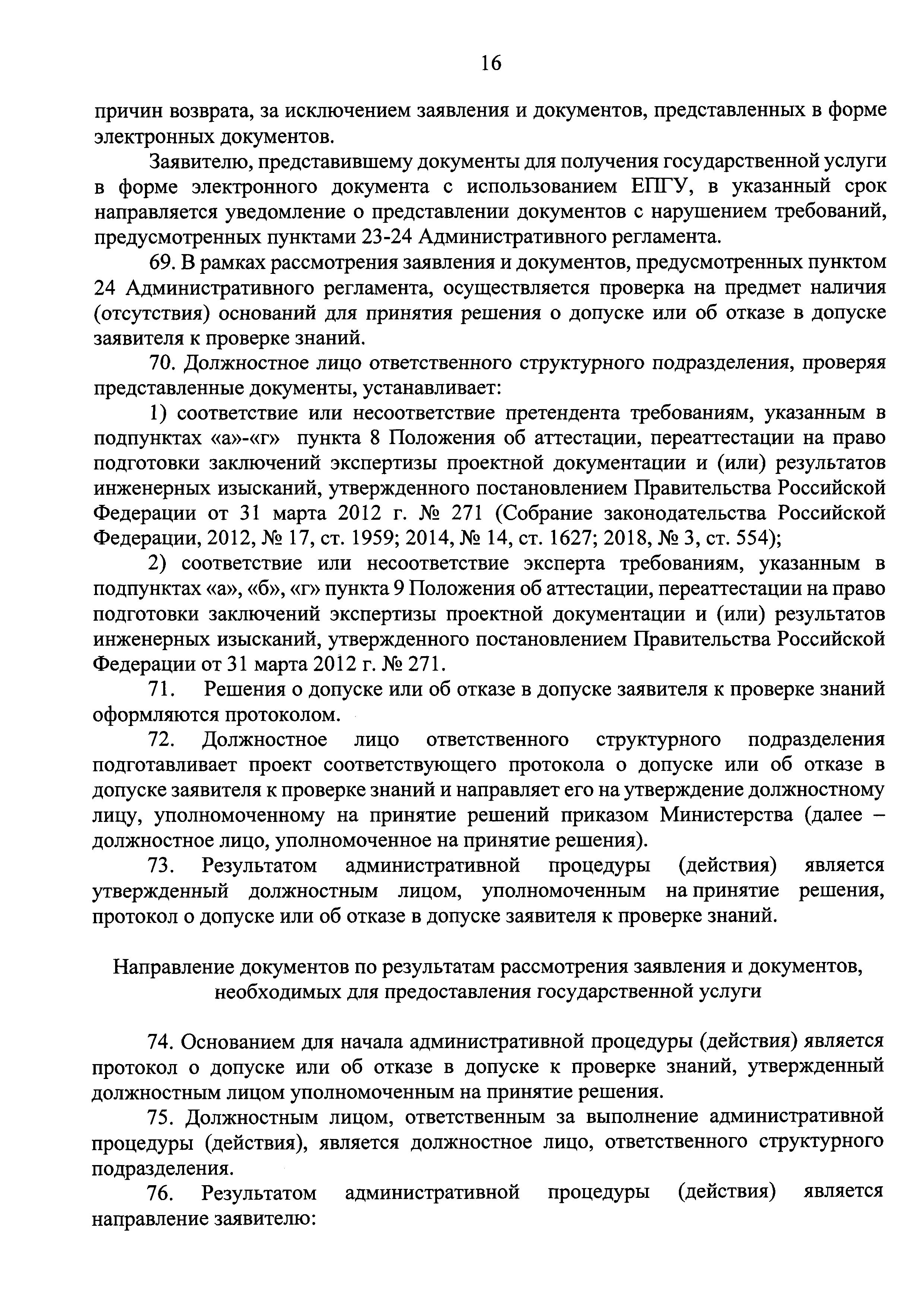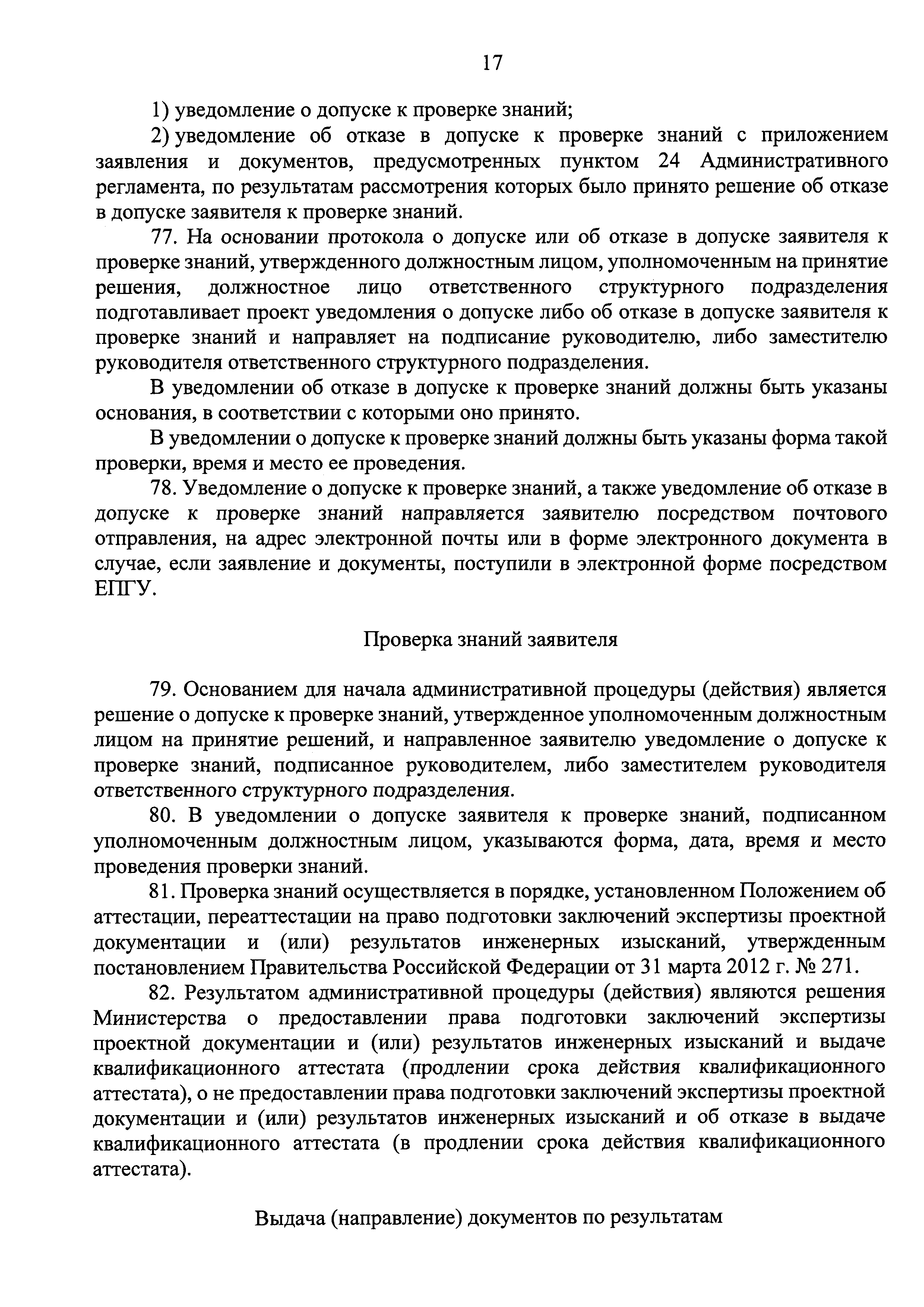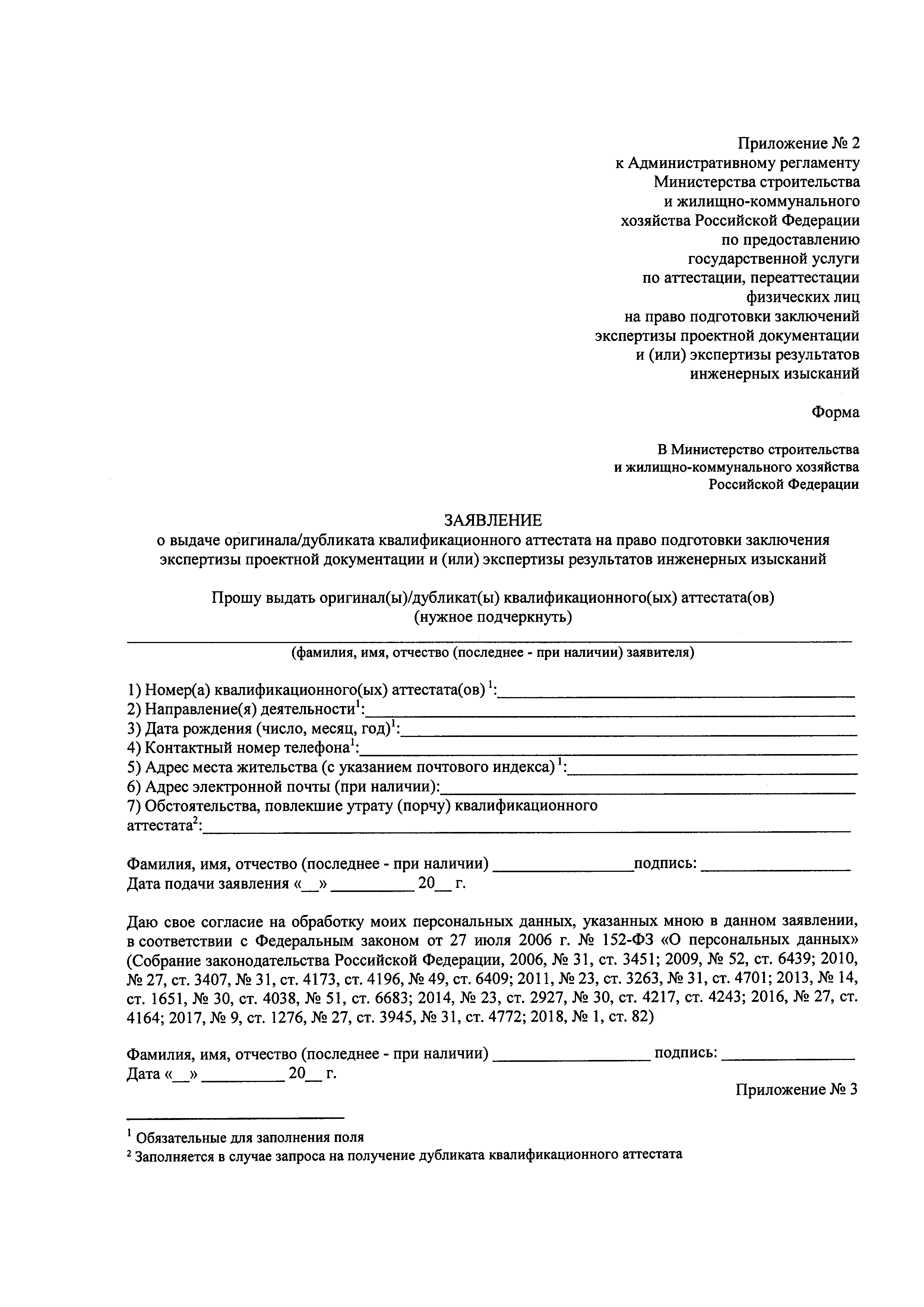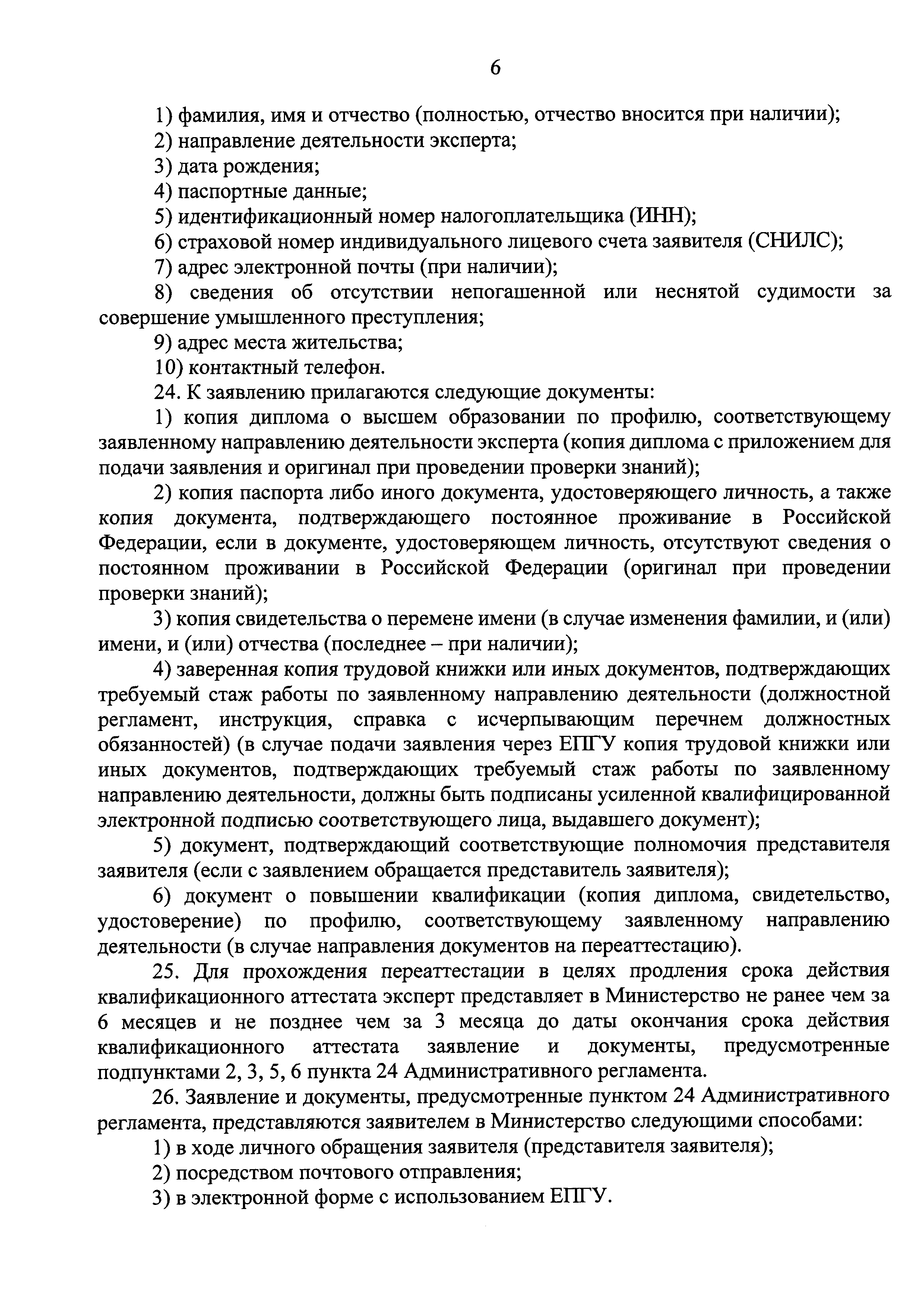 | Оглавление: | I. Общие положения II. Стандарт предоставления государственной услуги III. Состав, последовательность и сроки выполнения административных процедур (действий), требования к порядку их выполнения, в том числе особенности выполнения административных процедур (действий) в электронной форме IV. Формы контроля за исполнением административного регламента предоставления государственной услуги V. Досудебный (внесудебный) порядок обжалования решений и действий (бездействия) органа, предоставляющего государственную услугу, а также его должностных лиц Приложение № 1. Форма заявления для прохождения аттестации/переаттестации на право подготовки заключений экспертизы проектной документации и (или) экспертизы результатов инженерных изысканий Приложение № 2. Форма заявления о выдаче оригинала/дубликата квалификационного аттестата на право подготовки заключения экспертизы проектной документации и (или) экспертизы результатов инженерных изысканий Приложение № 3. Форма уведомления о повышении квалификации по профилю, соответствующему направлению деятельности эксперта |