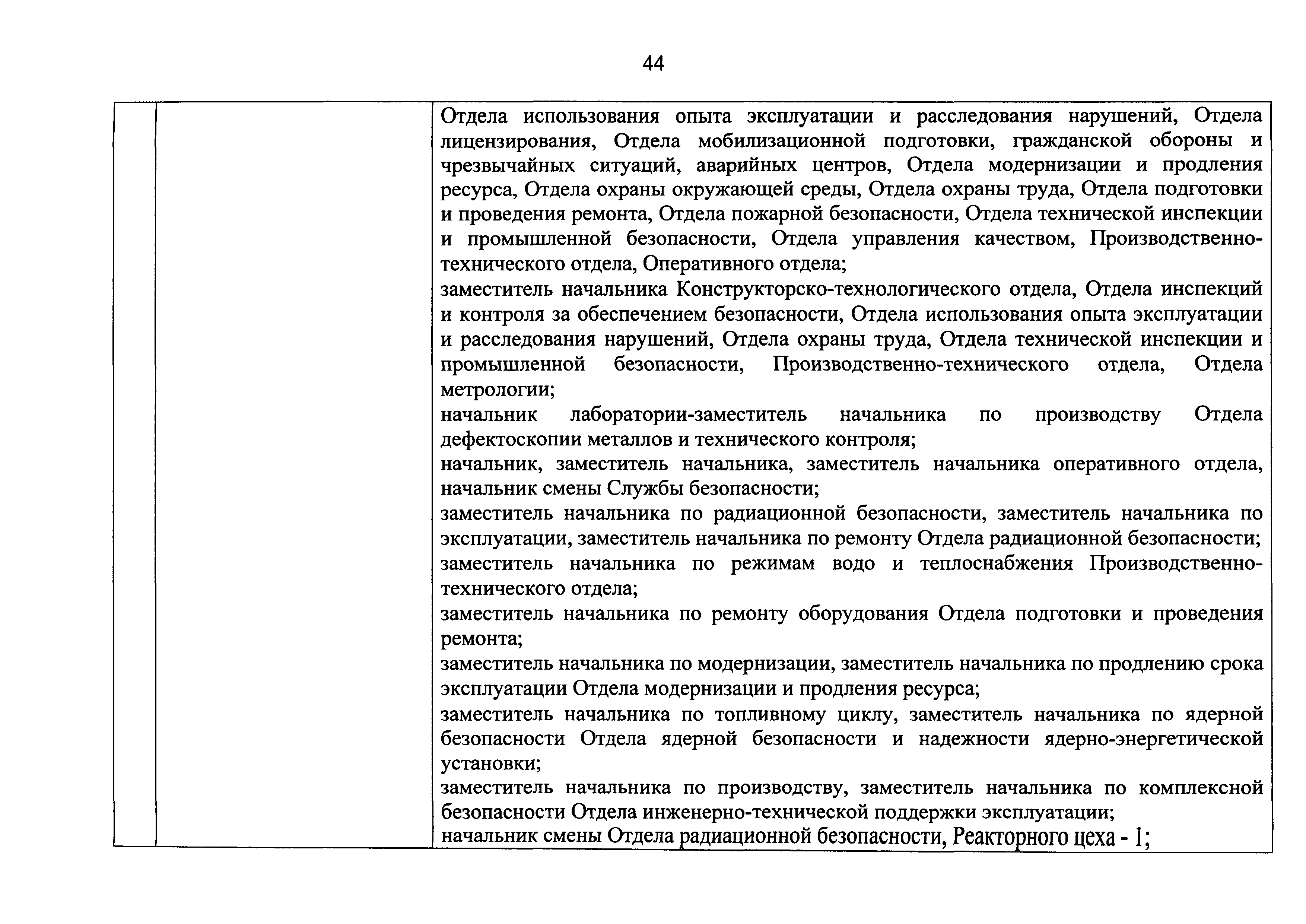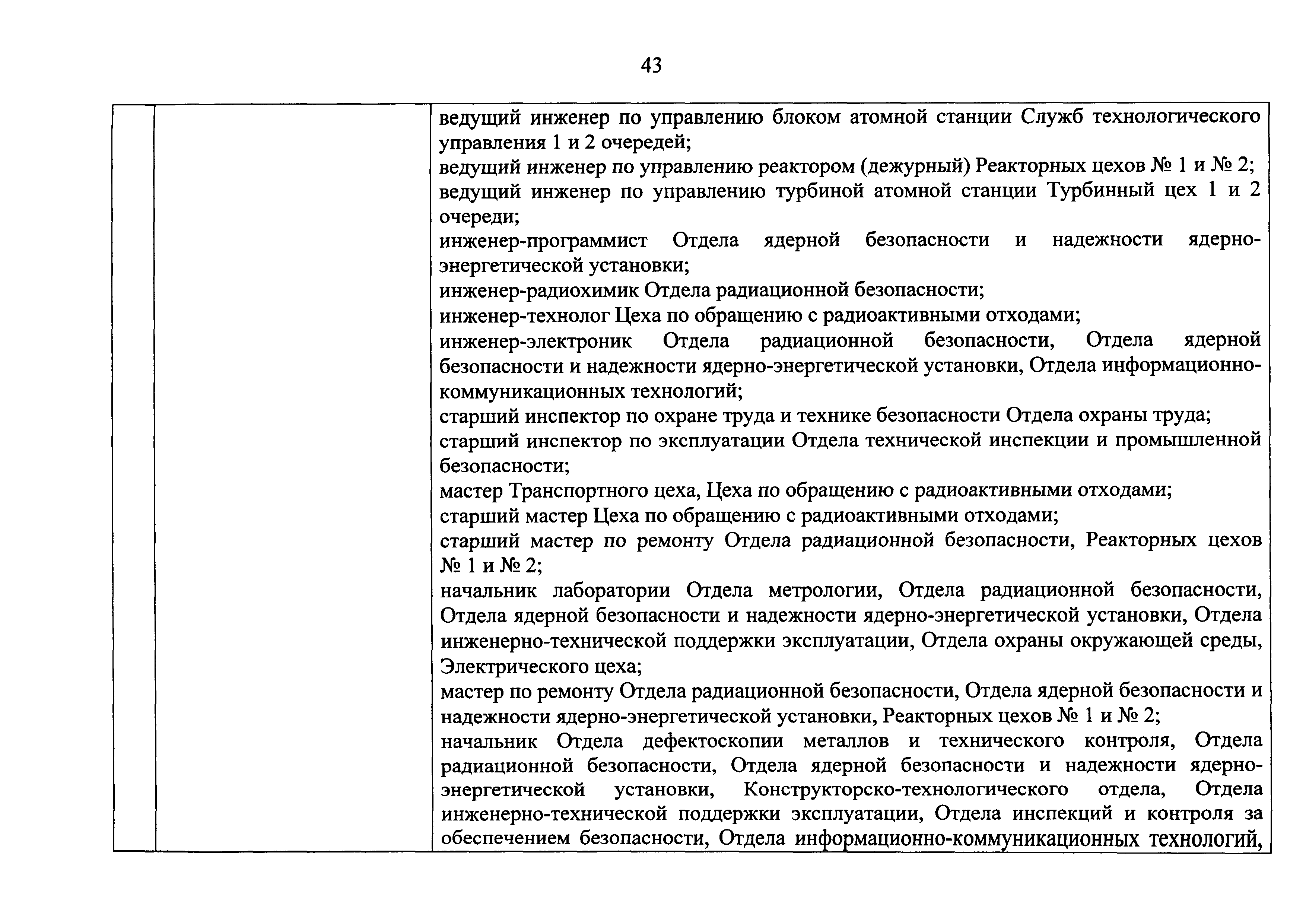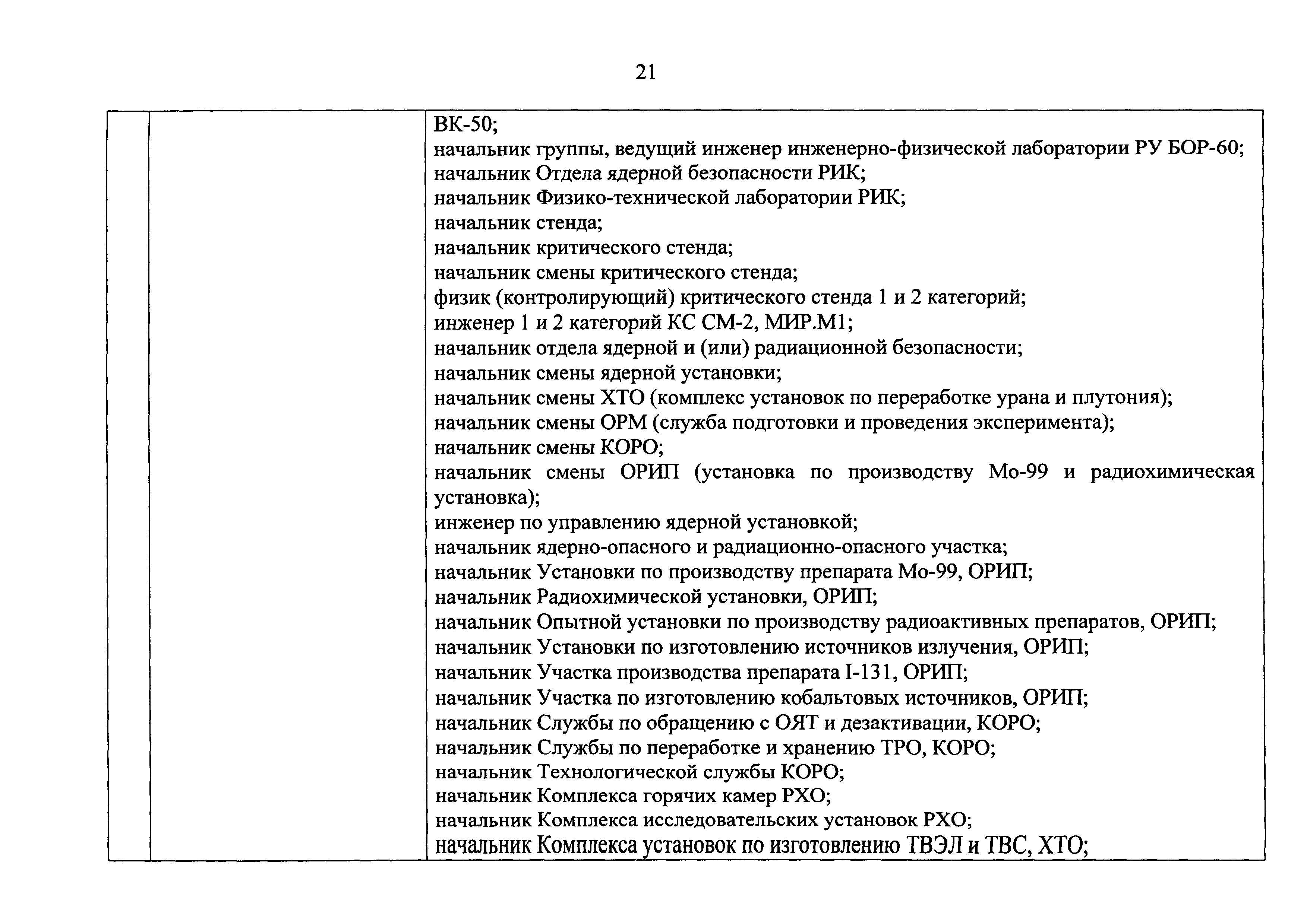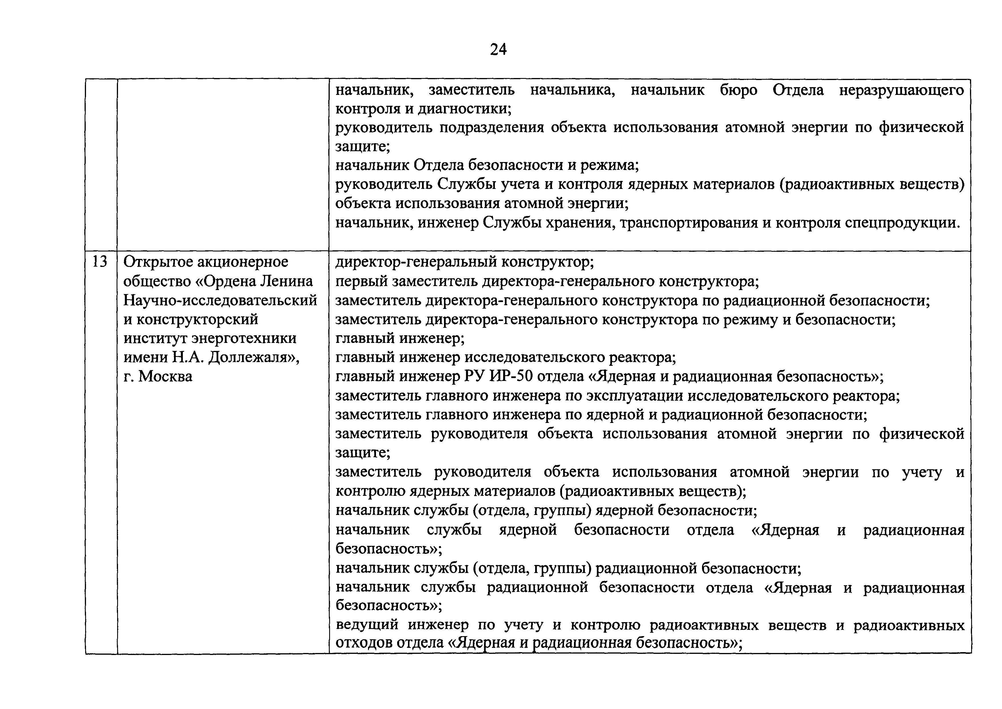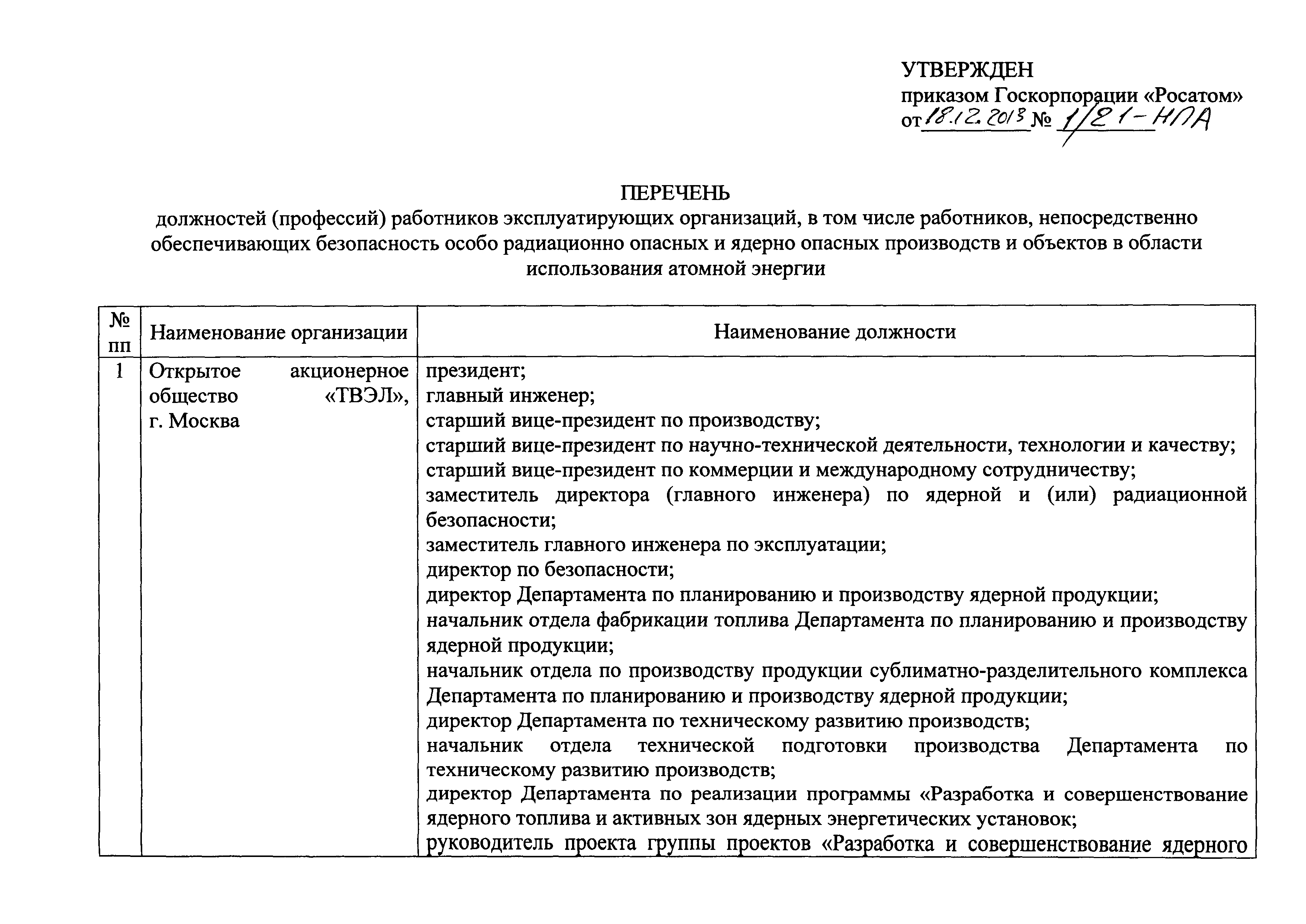 Перечень должностей (профессий) работников эксплуатирующих организаций, в том числе работников, непосредственно обеспечивающих безопасность особо радиационно опасных и ядерно опасных производств и объектов в области использования атомной энергии| Статус: | действует | | Название рус.: | Перечень должностей (профессий) работников эксплуатирующих организаций, в том числе работников, непосредственно обеспечивающих безопасность особо радиационно опасных и ядерно опасных производств и объектов в области использования атомной энергии | | Дата добавления в базу: | 01.02.2020 | | Дата актуализации: | 01.01.2021 | | Дата введения: | 04.04.2014 | | Утверждён: | 18.12.2013 Государственная корпорация по атомной энергии РОСАТОМ (1/21-НПА)