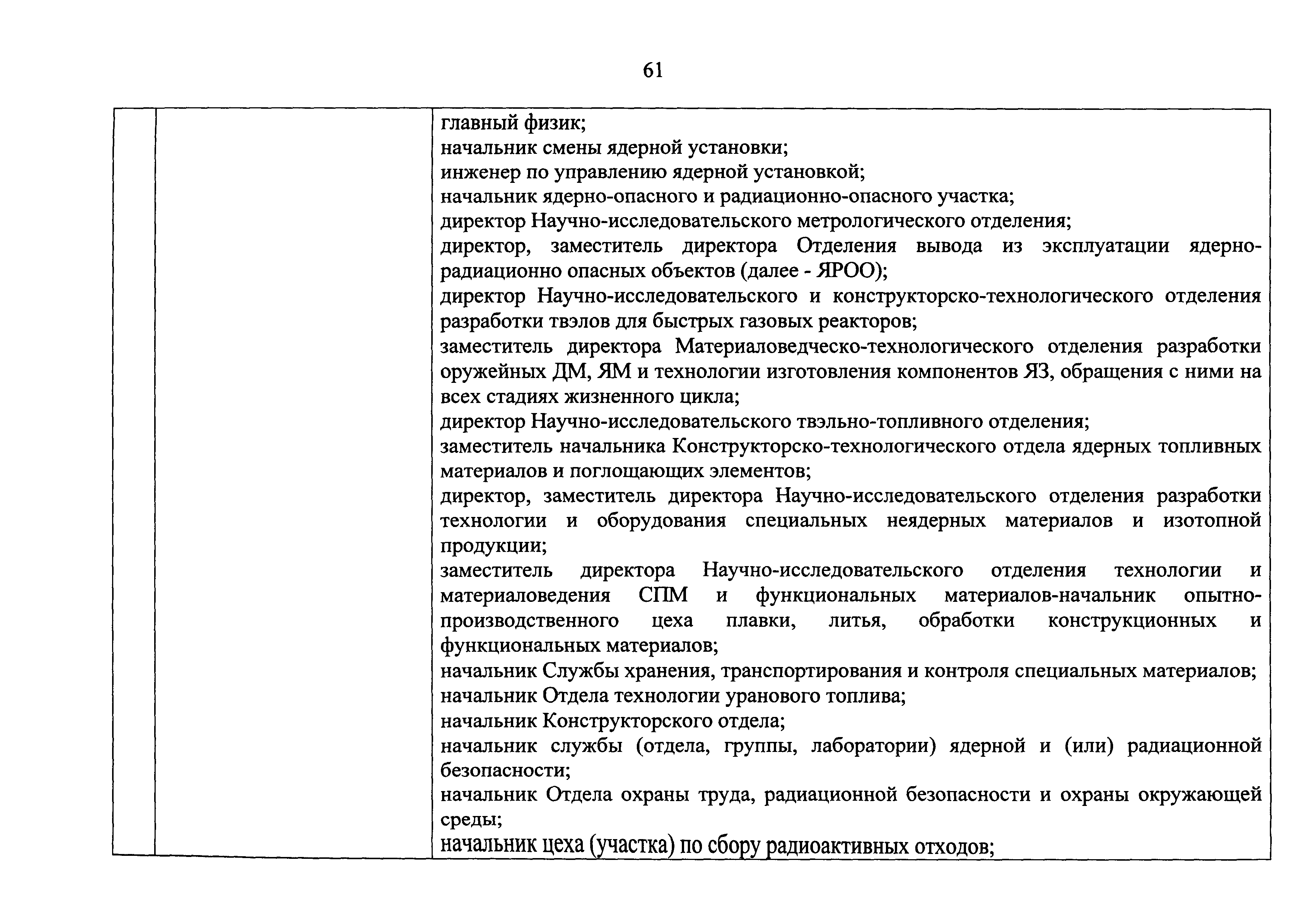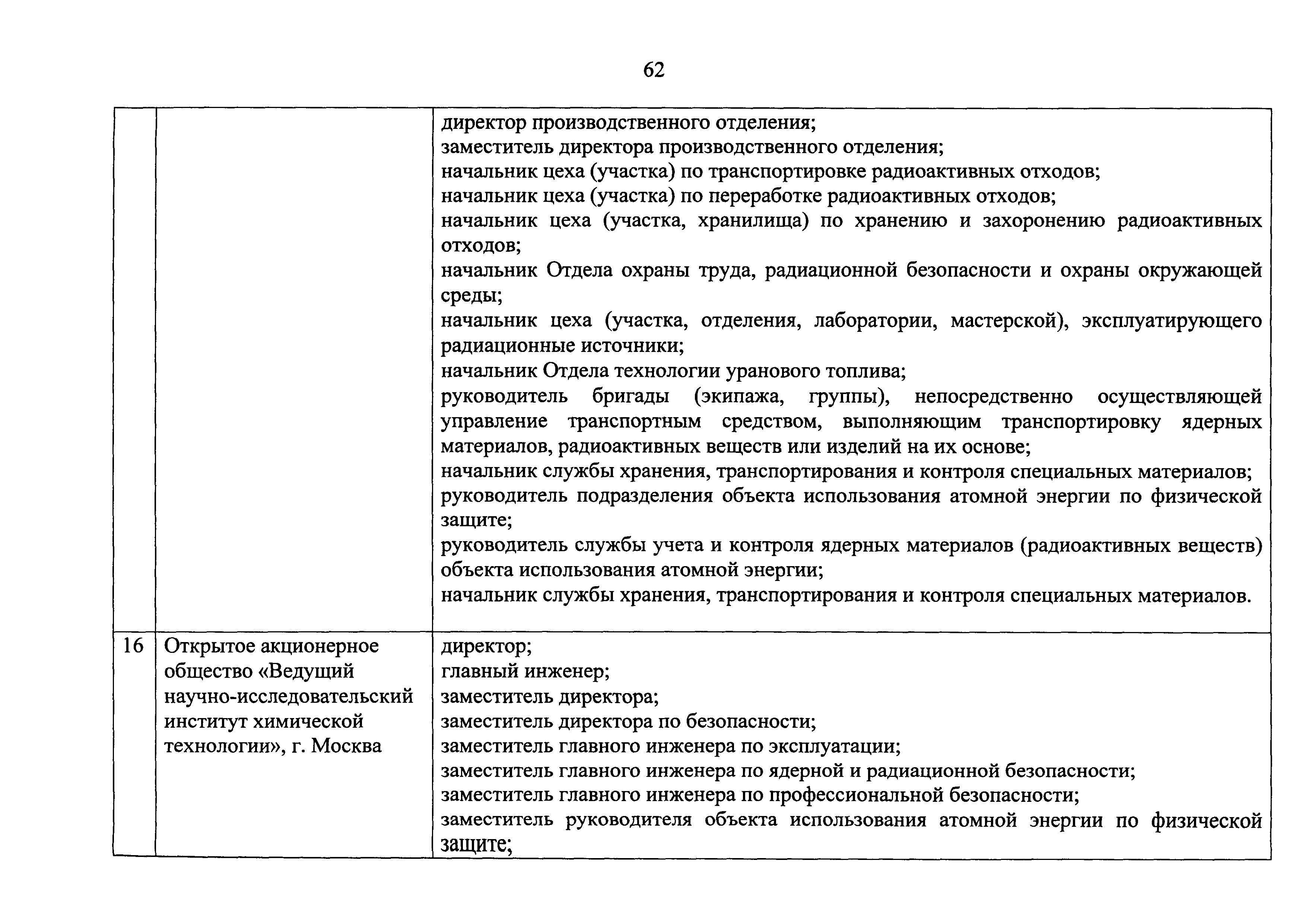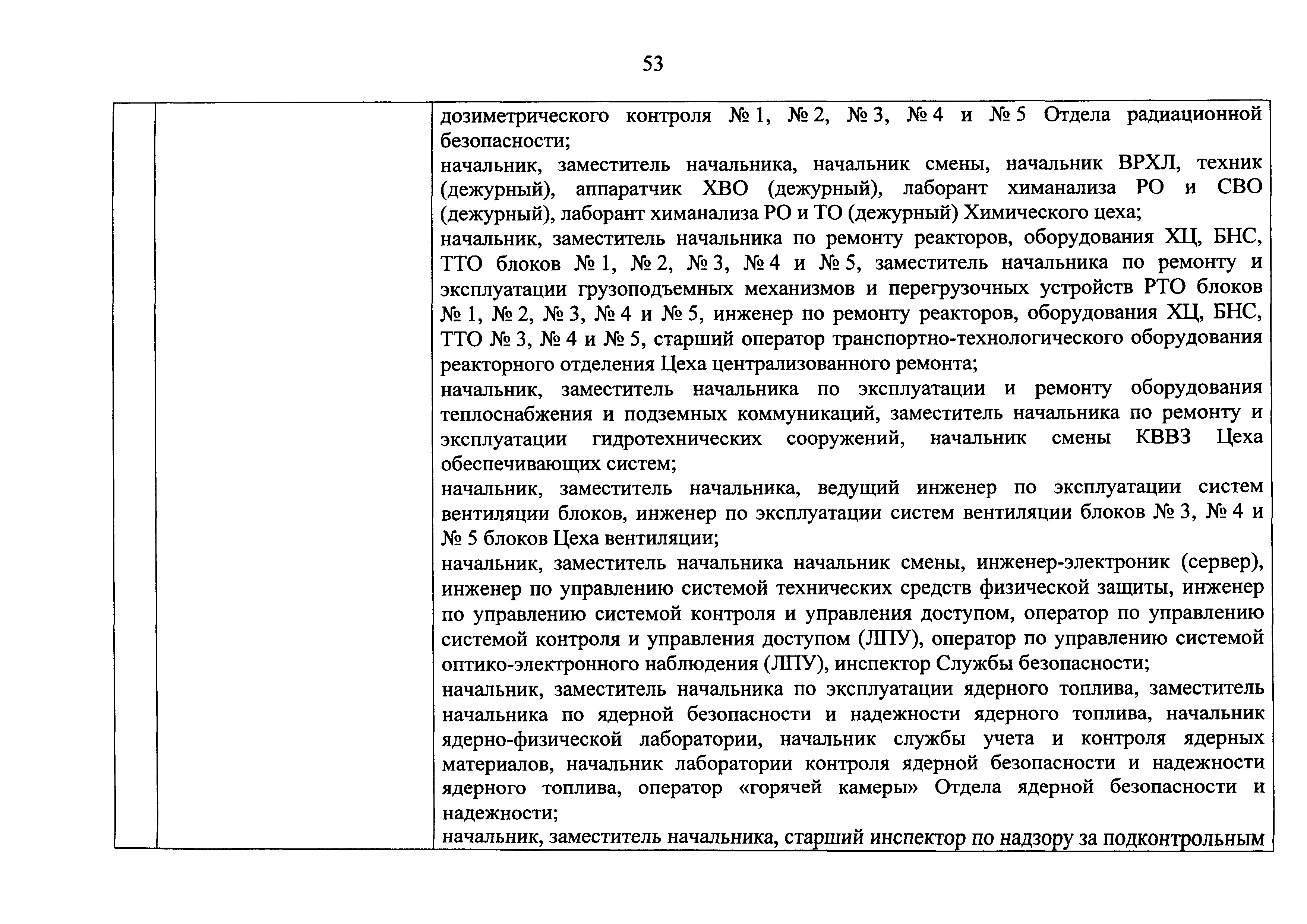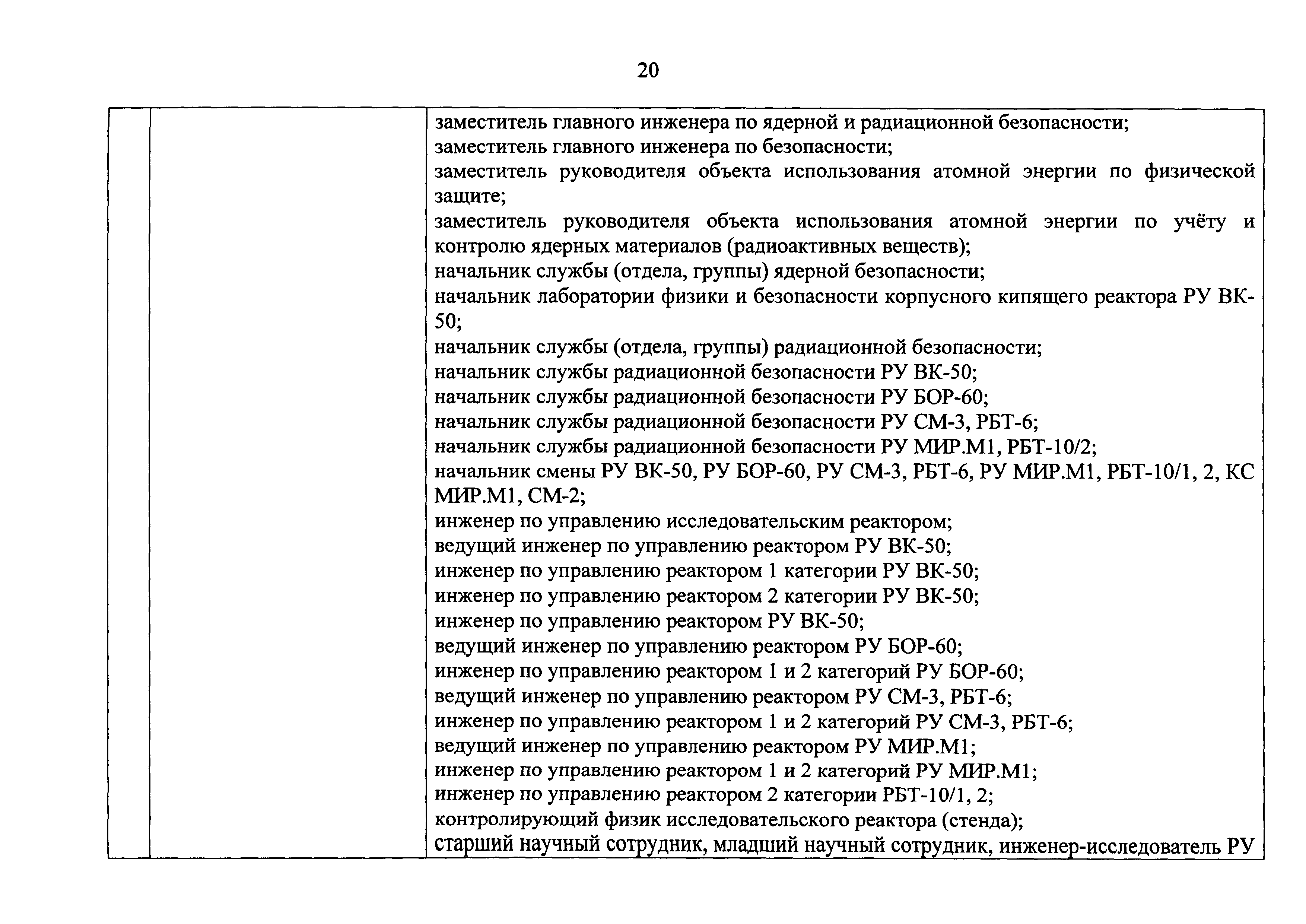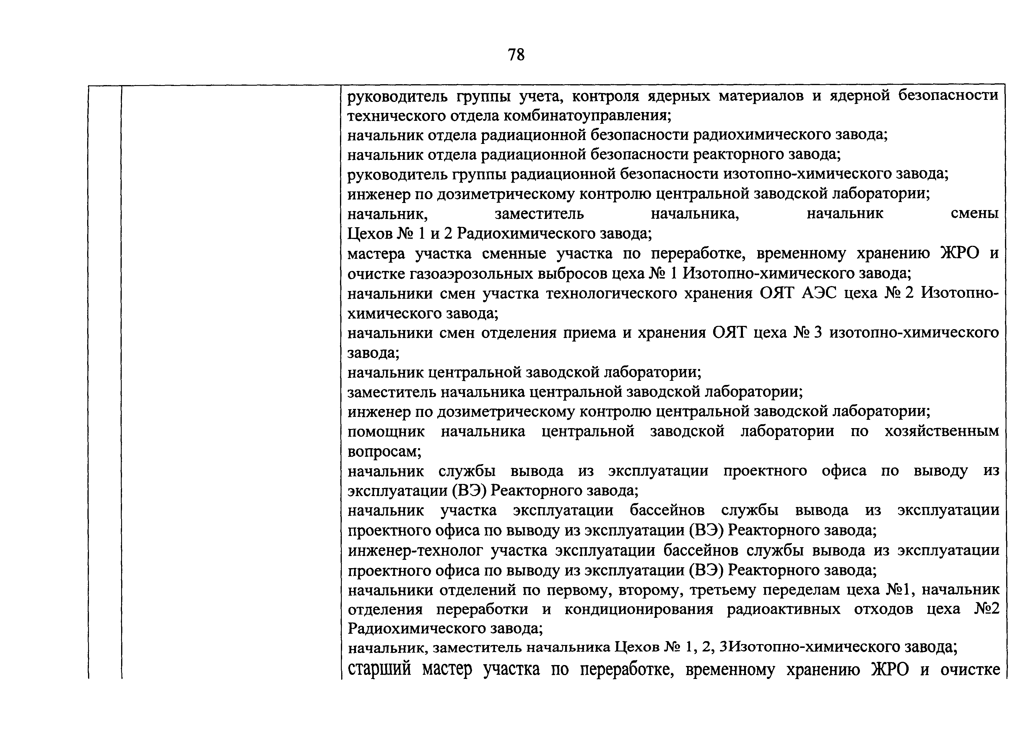 Перечень должностей (профессий) работников эксплуатирующих организаций, в том числе работников, непосредственно обеспечивающих безопасность особо радиационно опасных и ядерно опасных производств и объектов в области использования атомной энергии| Статус: | действует | | Название рус.: | Перечень должностей (профессий) работников эксплуатирующих организаций, в том числе работников, непосредственно обеспечивающих безопасность особо радиационно опасных и ядерно опасных производств и объектов в области использования атомной энергии | | Дата добавления в базу: | 01.02.2020 | | Дата актуализации: | 01.01.2021 | | Дата введения: | 04.04.2014 | | Утверждён: | 18.12.2013 Государственная корпорация по атомной энергии РОСАТОМ (1/21-НПА)