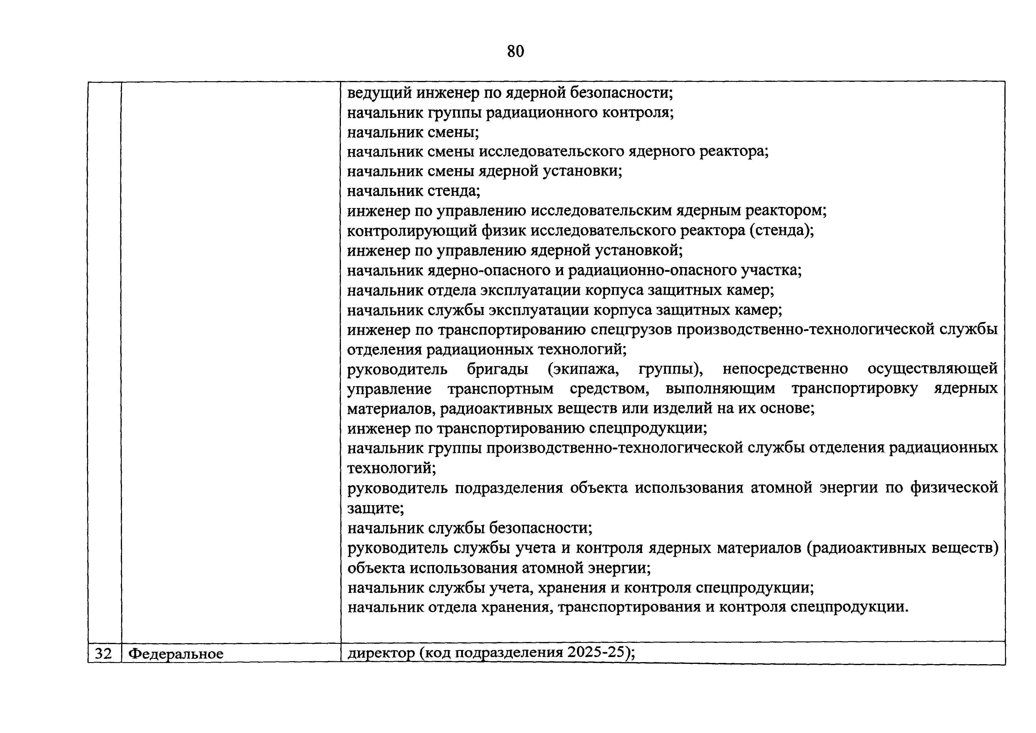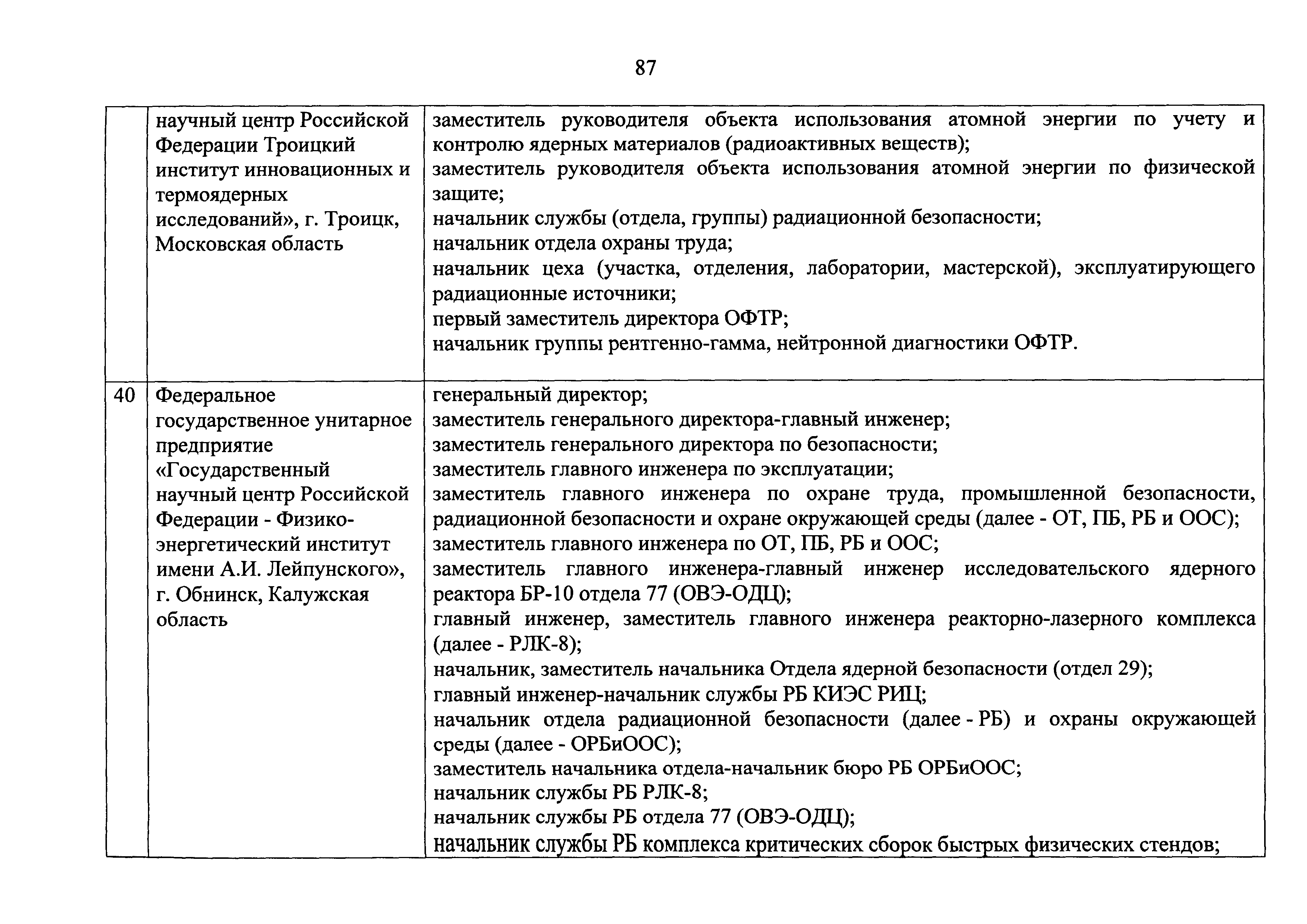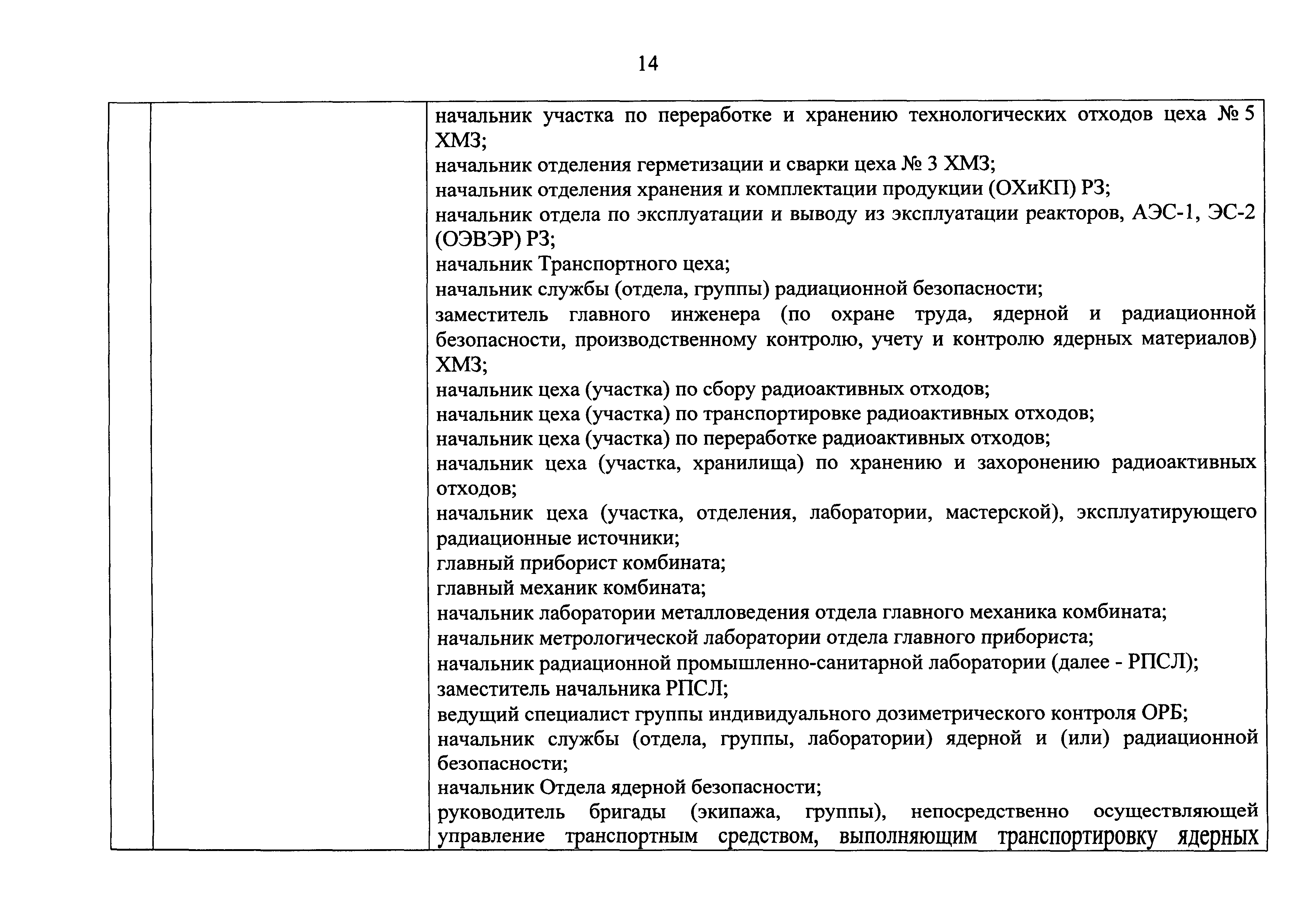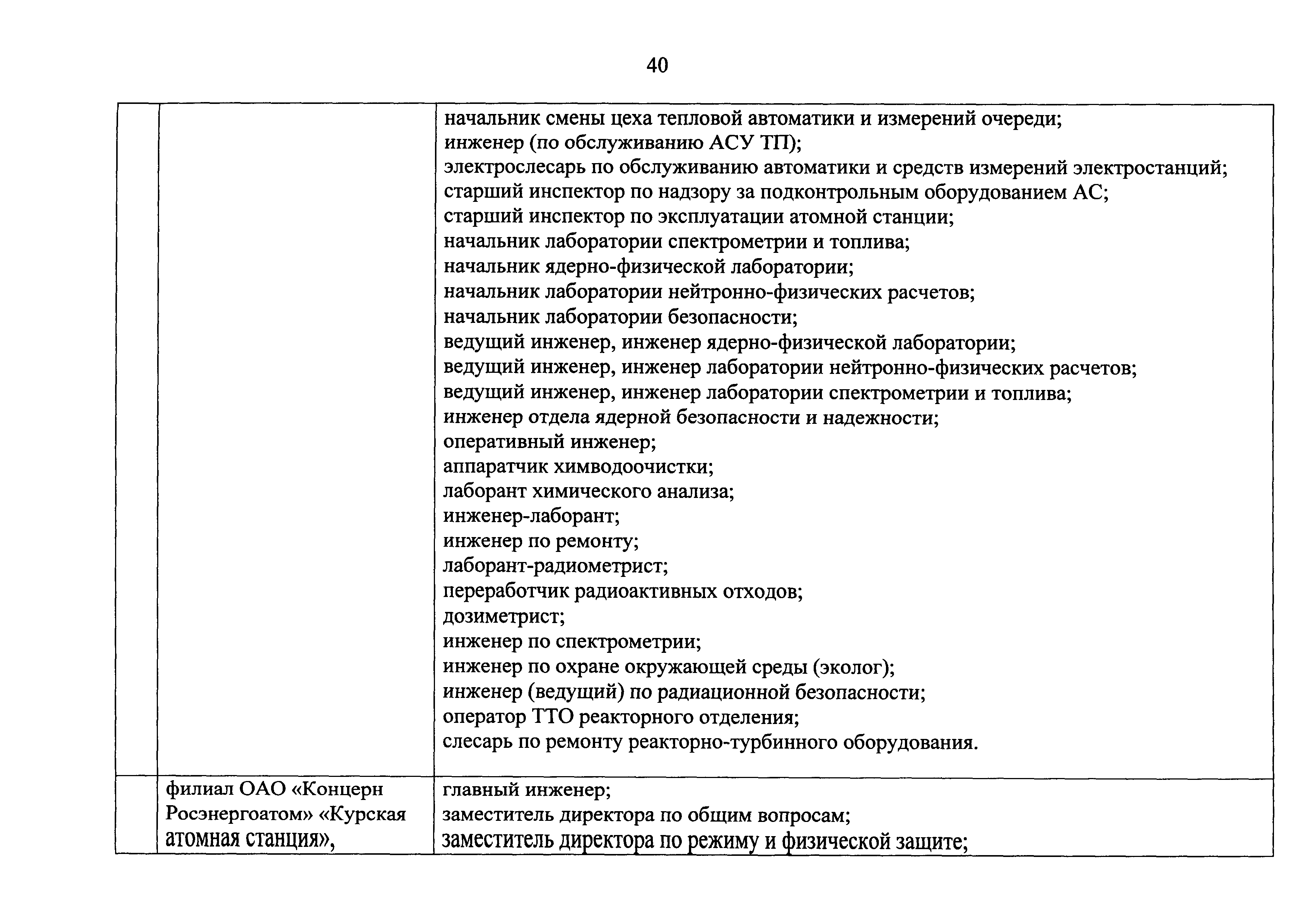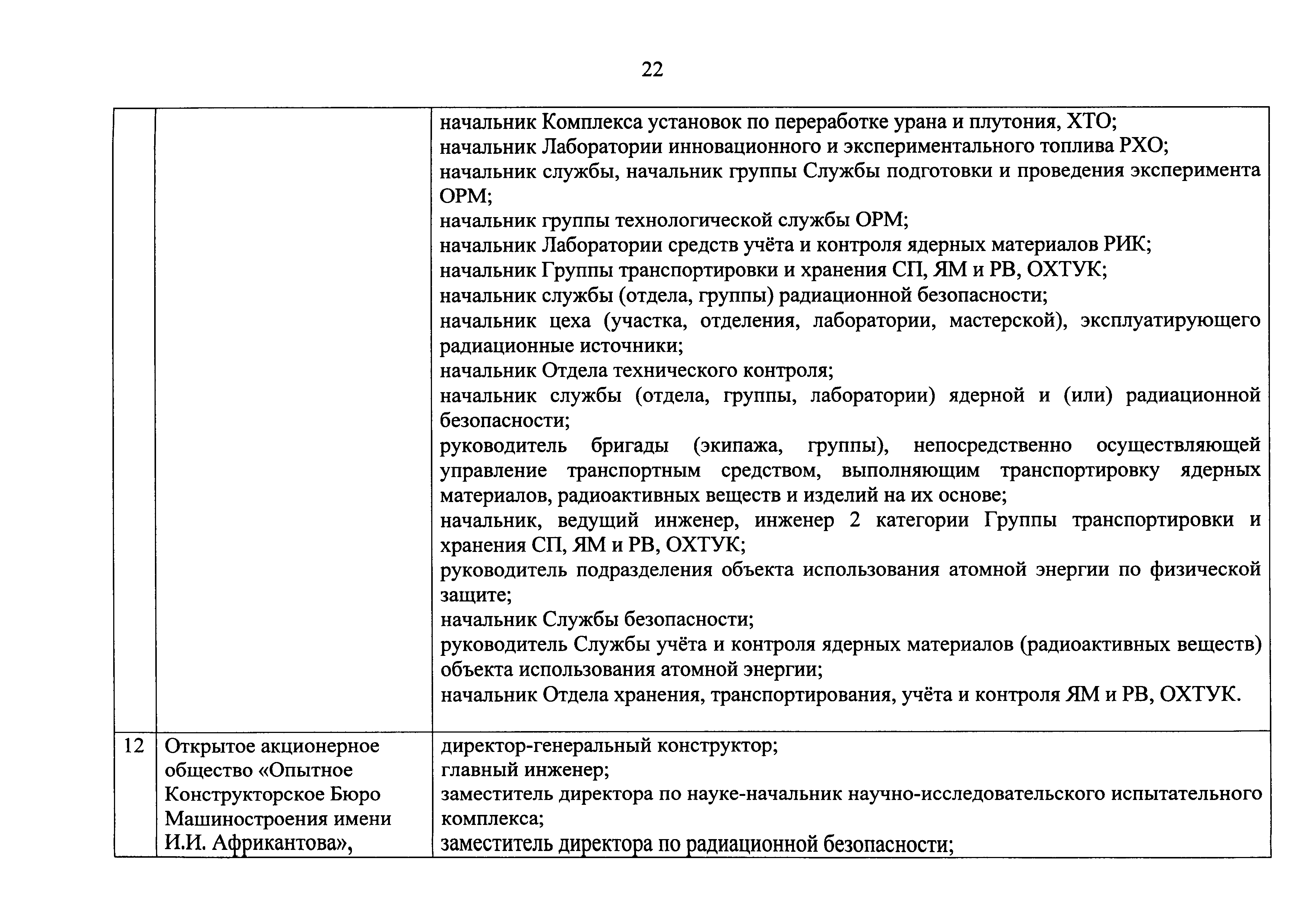 Перечень должностей (профессий) работников эксплуатирующих организаций, в том числе работников, непосредственно обеспечивающих безопасность особо радиационно опасных и ядерно опасных производств и объектов в области использования атомной энергии| Статус: | действует | | Название рус.: | Перечень должностей (профессий) работников эксплуатирующих организаций, в том числе работников, непосредственно обеспечивающих безопасность особо радиационно опасных и ядерно опасных производств и объектов в области использования атомной энергии | | Дата добавления в базу: | 01.02.2020 | | Дата актуализации: | 01.01.2021 | | Дата введения: | 04.04.2014 | | Утверждён: | 18.12.2013 Государственная корпорация по атомной энергии РОСАТОМ (1/21-НПА)