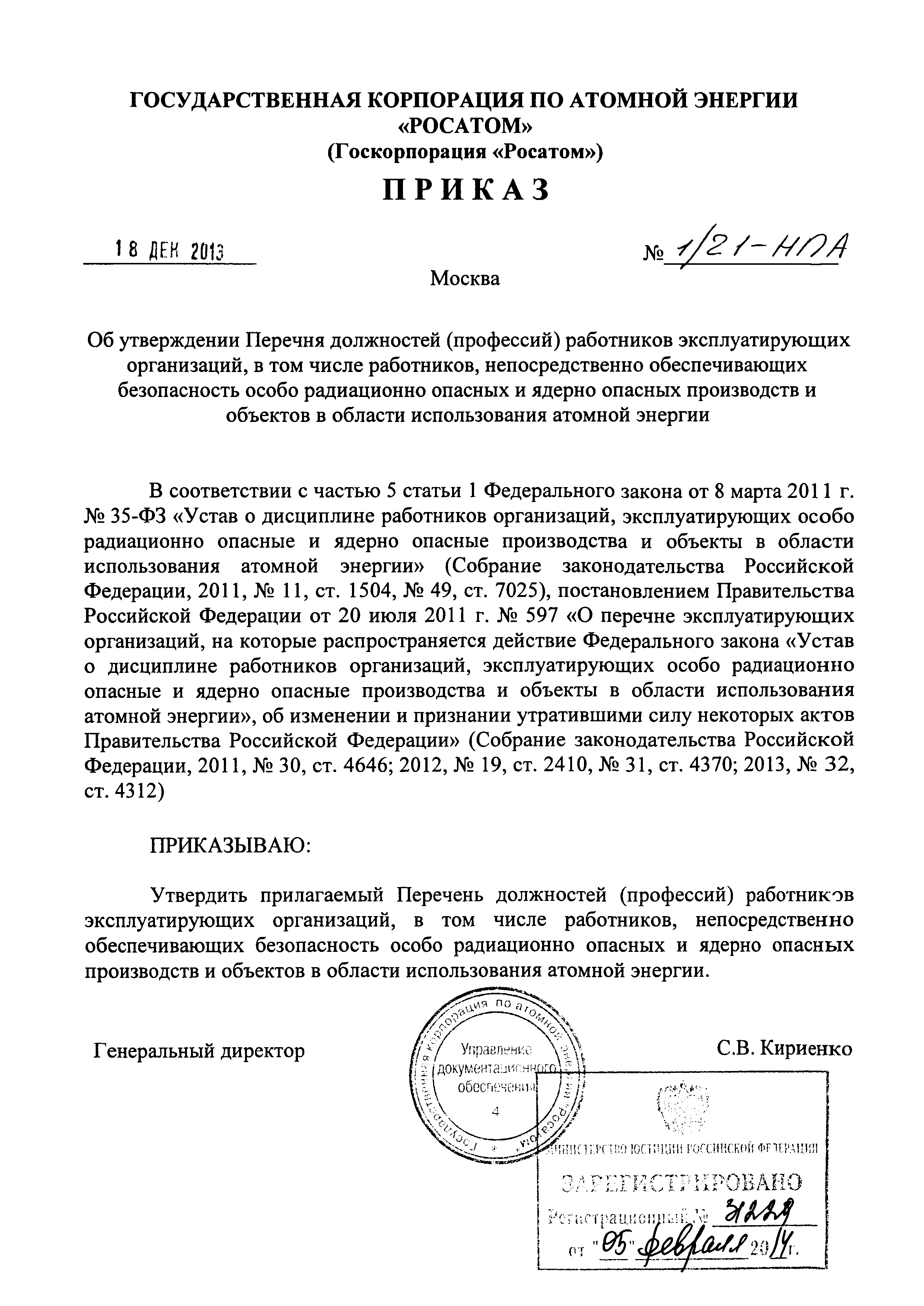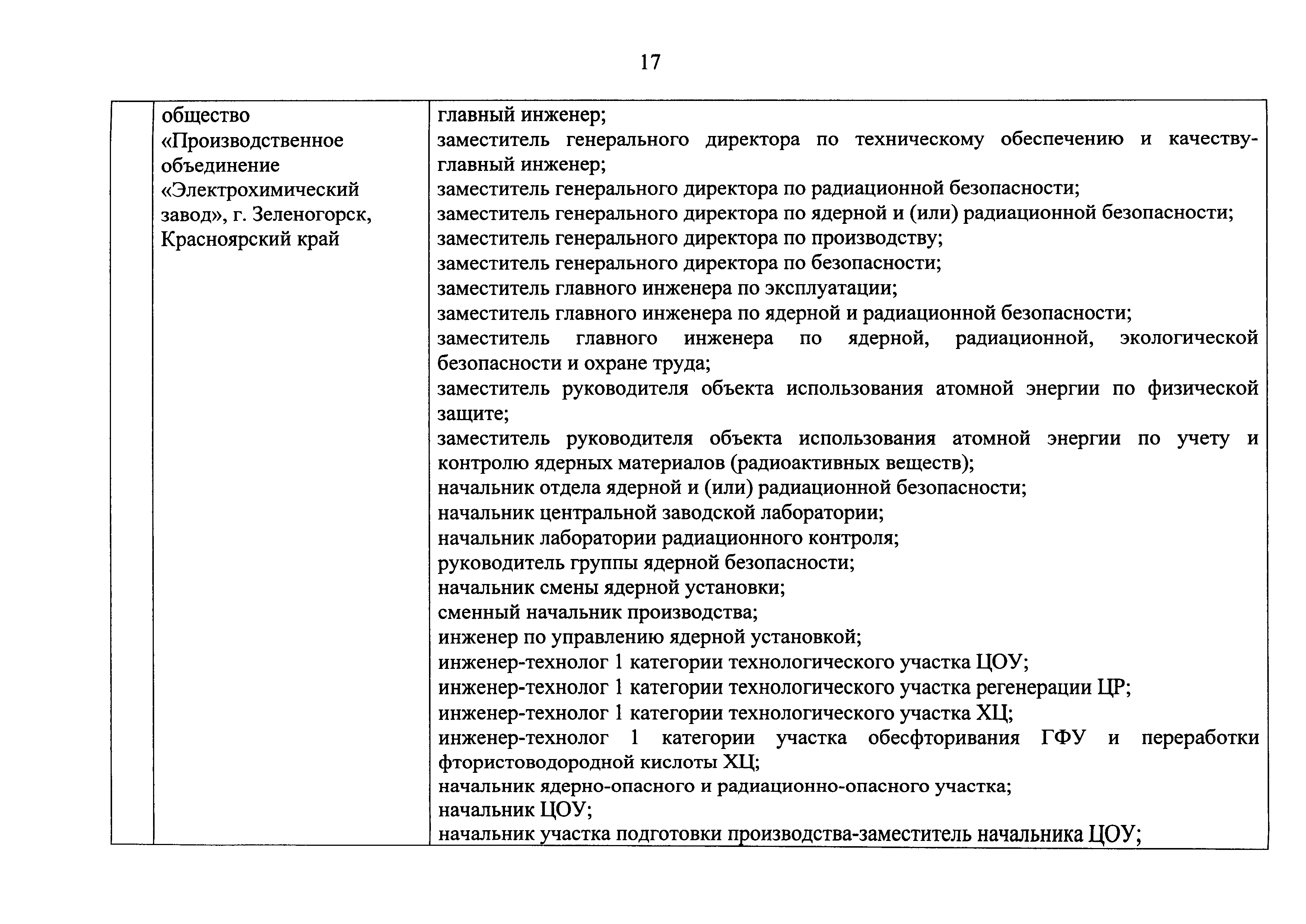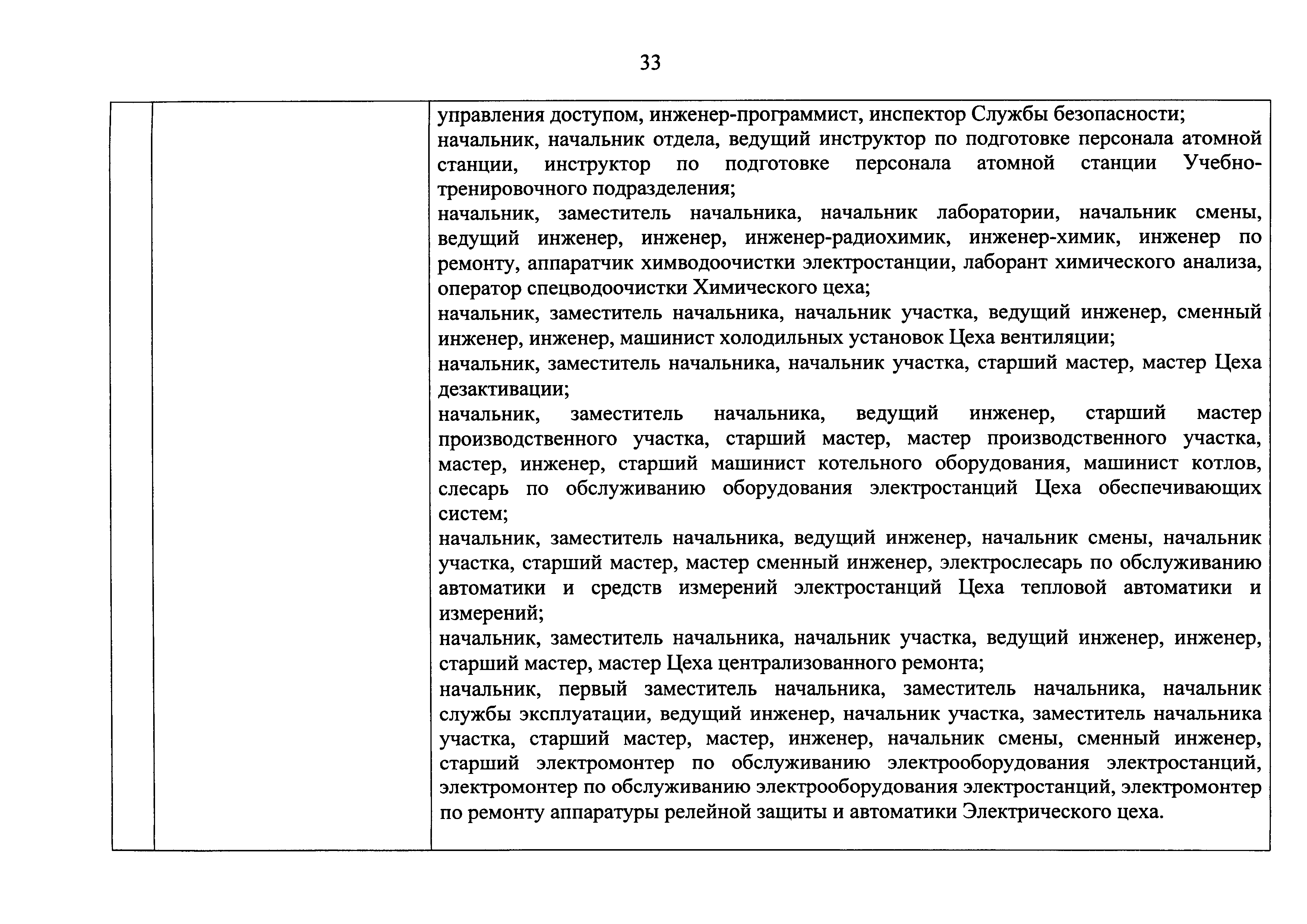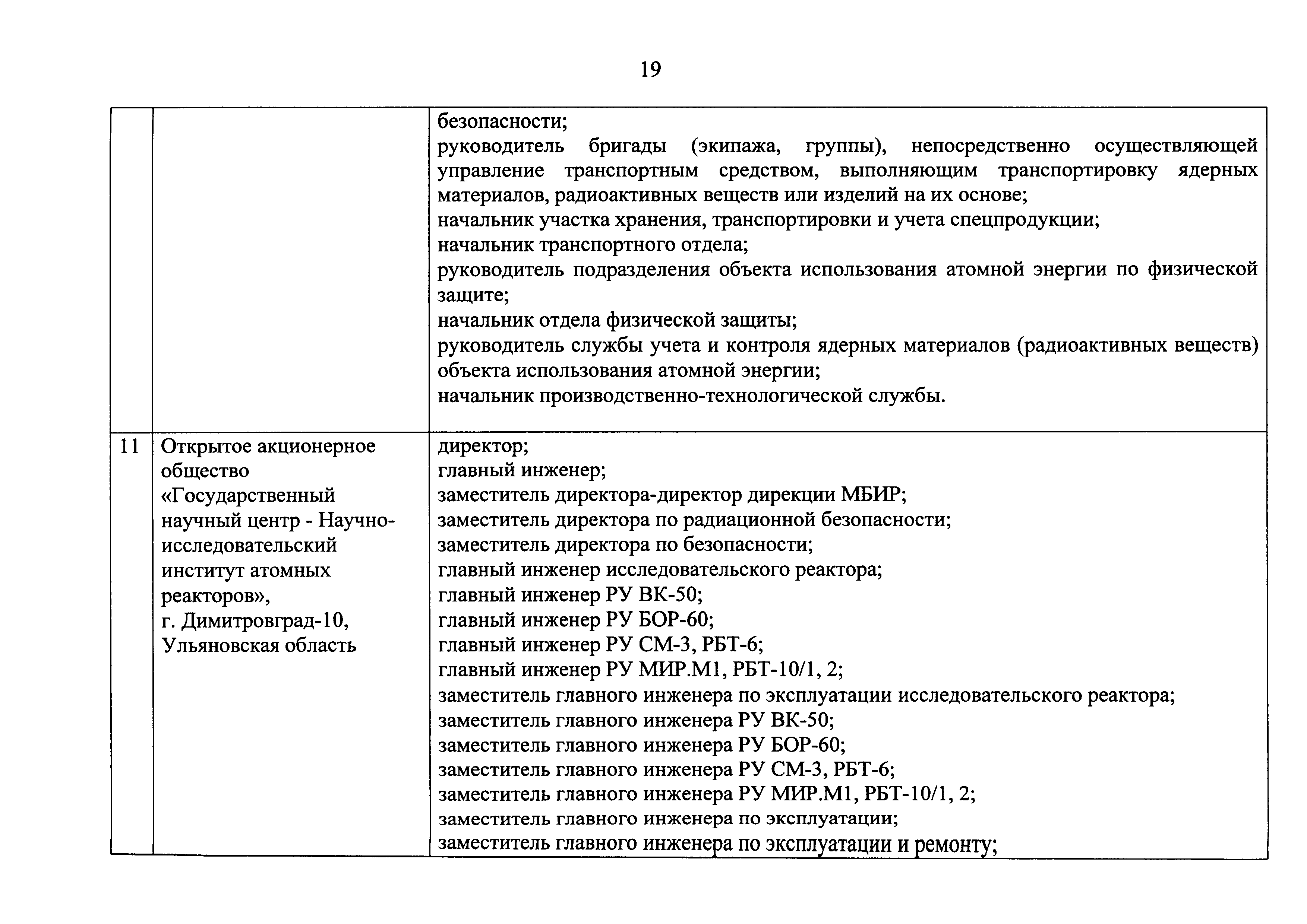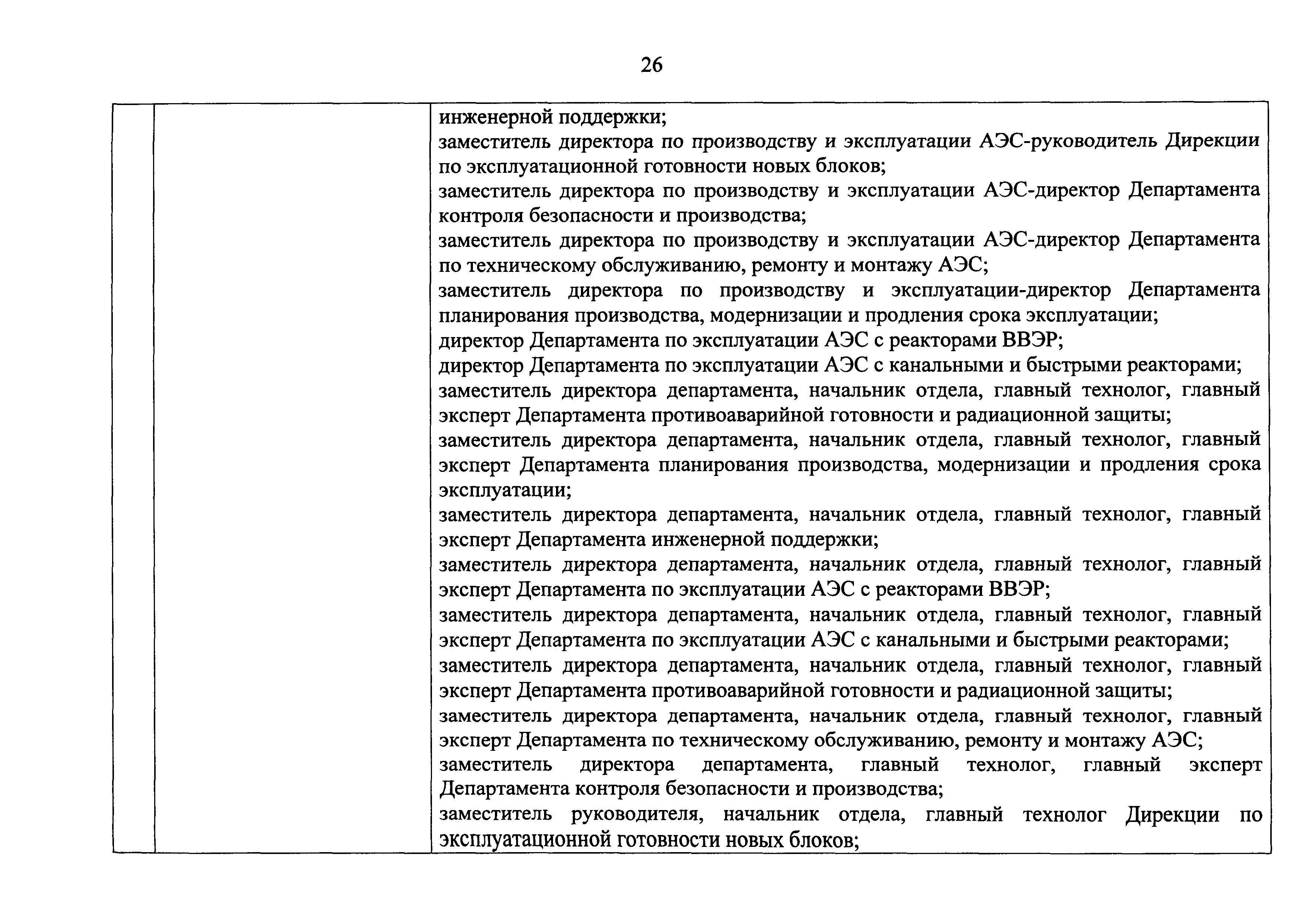 Перечень должностей (профессий) работников эксплуатирующих организаций, в том числе работников, непосредственно обеспечивающих безопасность особо радиационно опасных и ядерно опасных производств и объектов в области использования атомной энергии| Статус: | действует | | Название рус.: | Перечень должностей (профессий) работников эксплуатирующих организаций, в том числе работников, непосредственно обеспечивающих безопасность особо радиационно опасных и ядерно опасных производств и объектов в области использования атомной энергии | | Дата добавления в базу: | 01.02.2020 | | Дата актуализации: | 01.01.2021 | | Дата введения: | 04.04.2014 | | Утверждён: | 18.12.2013 Государственная корпорация по атомной энергии РОСАТОМ (1/21-НПА)