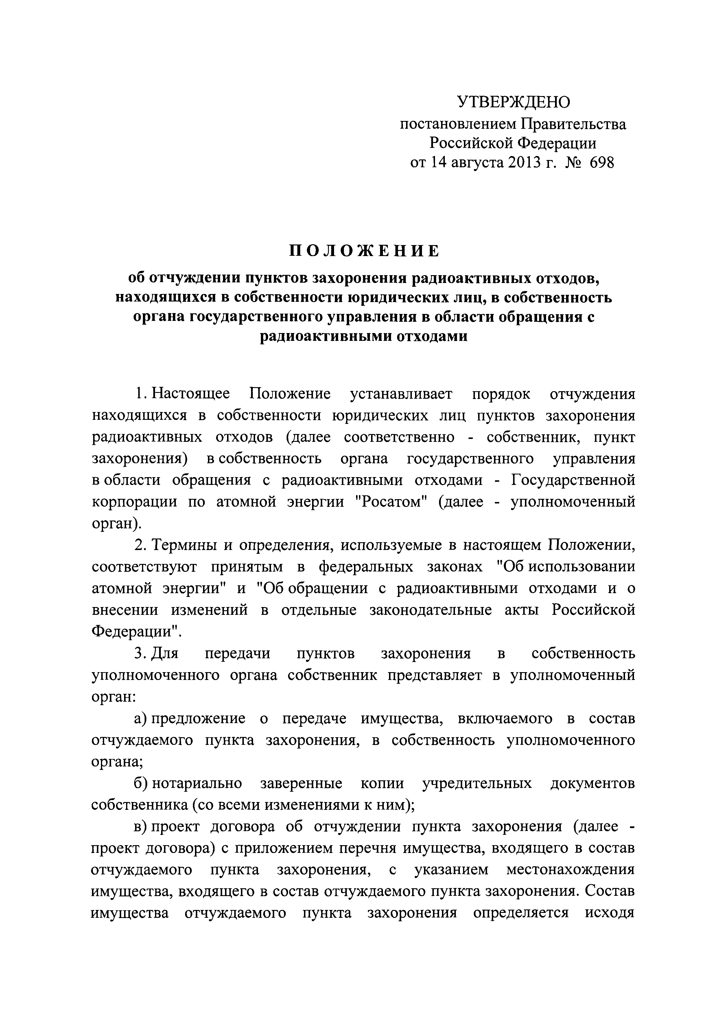 Положение об отчуждении пунктов захоронения радиоактивных отходов, находящихся в собственности юридических лиц, в собственность органа государственного управления в области обращения с радиоактивными отходами| Статус: | действует | | Название рус.: | Положение об отчуждении пунктов захоронения радиоактивных отходов, находящихся в собственности юридических лиц, в собственность органа государственного управления в области обращения с радиоактивными отходами | | Дата добавления в базу: | 01.02.2020 | | Дата актуализации: | 01.01.2021 | | Дата введения: | 24.08.2013 | | Область применения: | Положение устанавливает порядок отчуждения находящихся в собственности юридических лиц пунктов захоронения радиоактивных отходов в собственность органа государственного управления в области обращения с радиоактивными отходами - Государственной корпорации по атомной энергии "Росатом" | | Оглавление: | Приложение. Перечень имущества, входящего в состав отчуждаемого пункта захоронения радиоактивных отходов как имущественного комплекса | | Утверждён: | 14.08.2013 Правительство Российской Федерации (698)