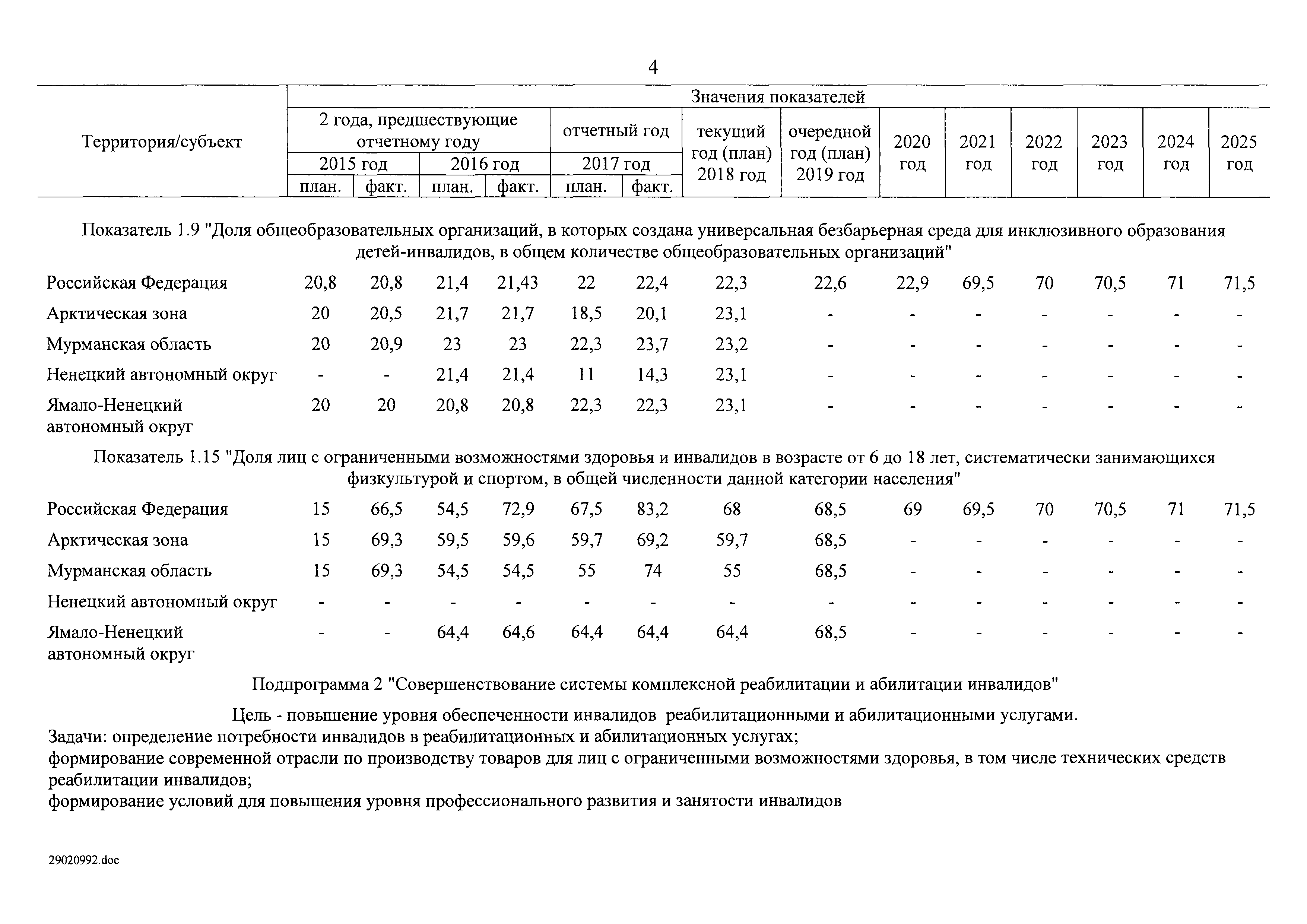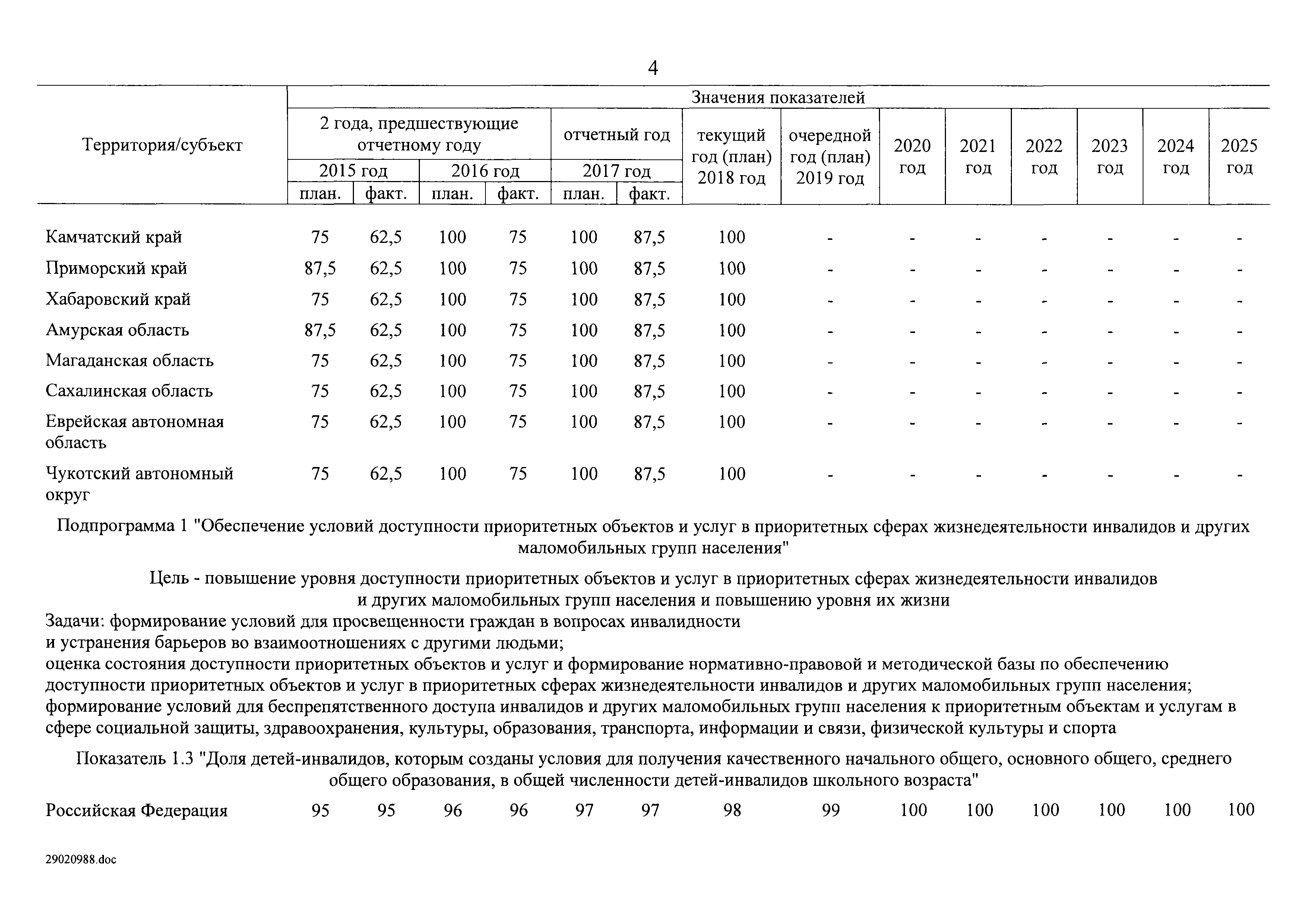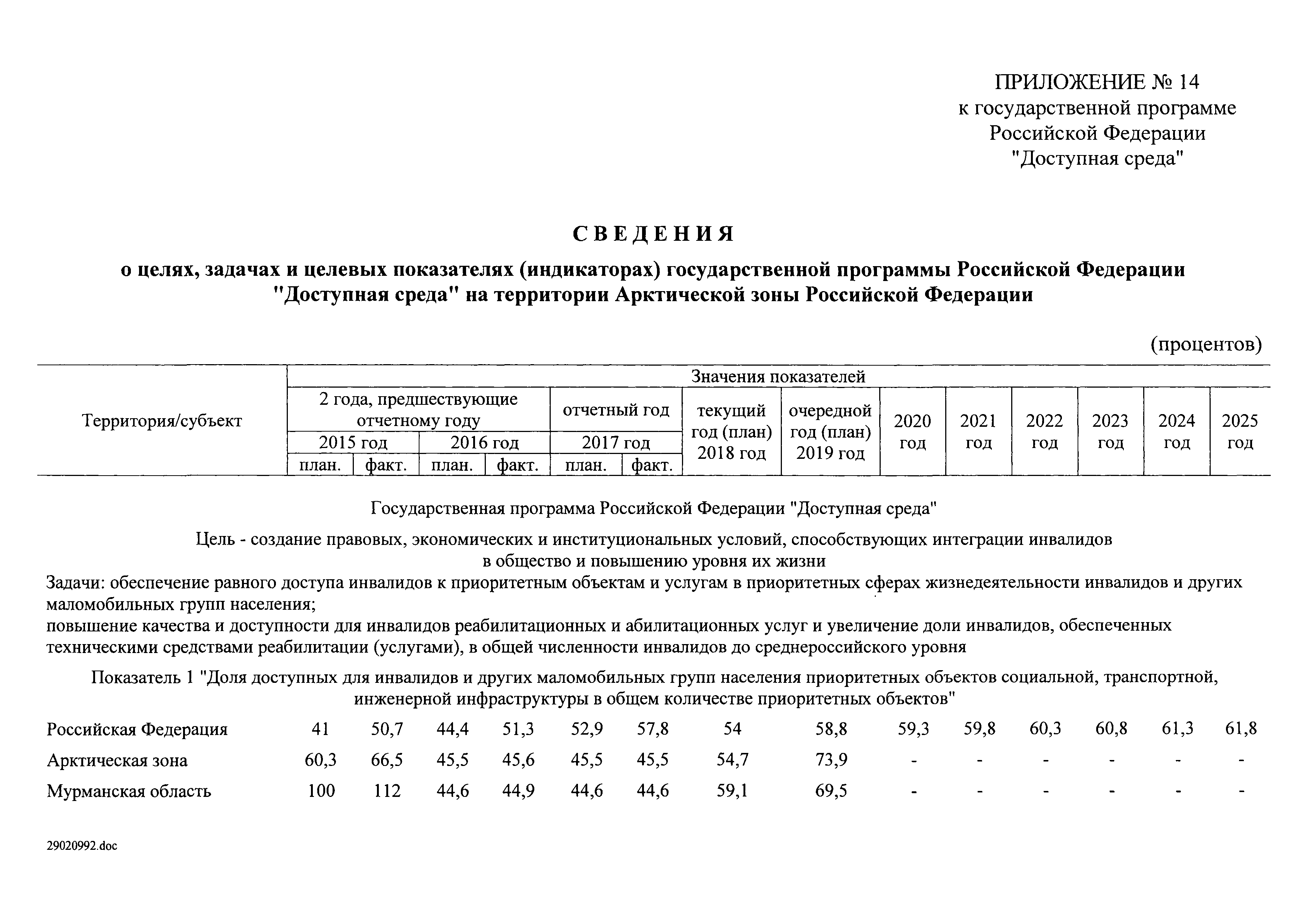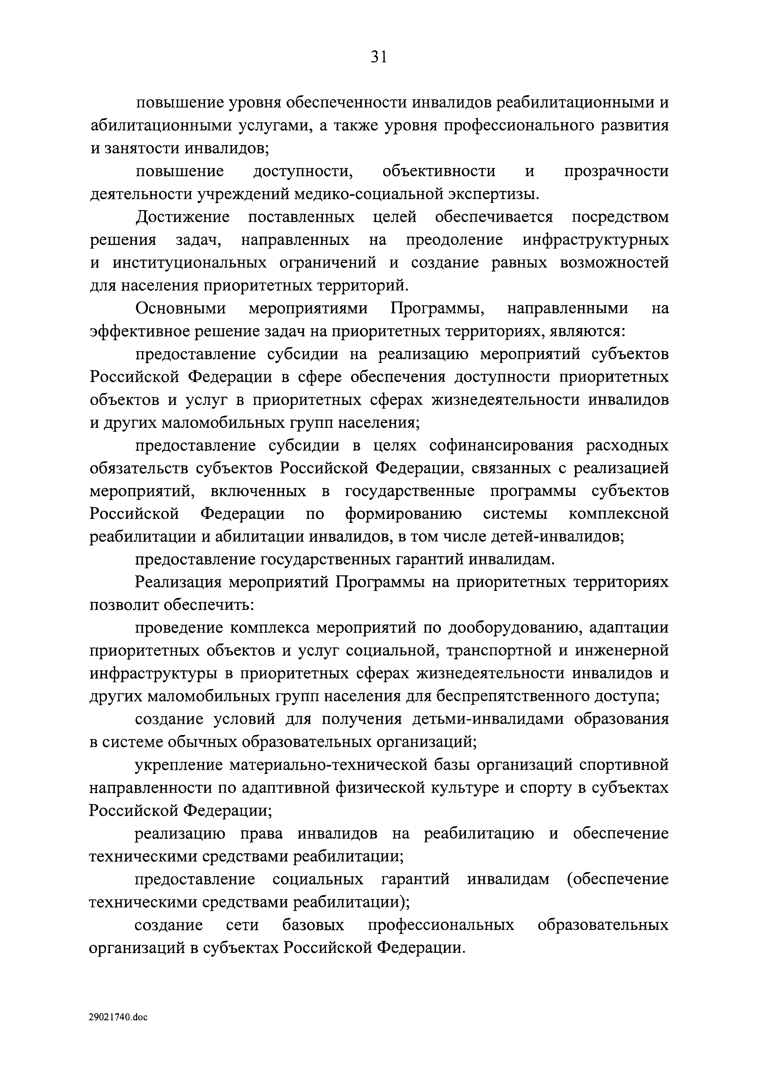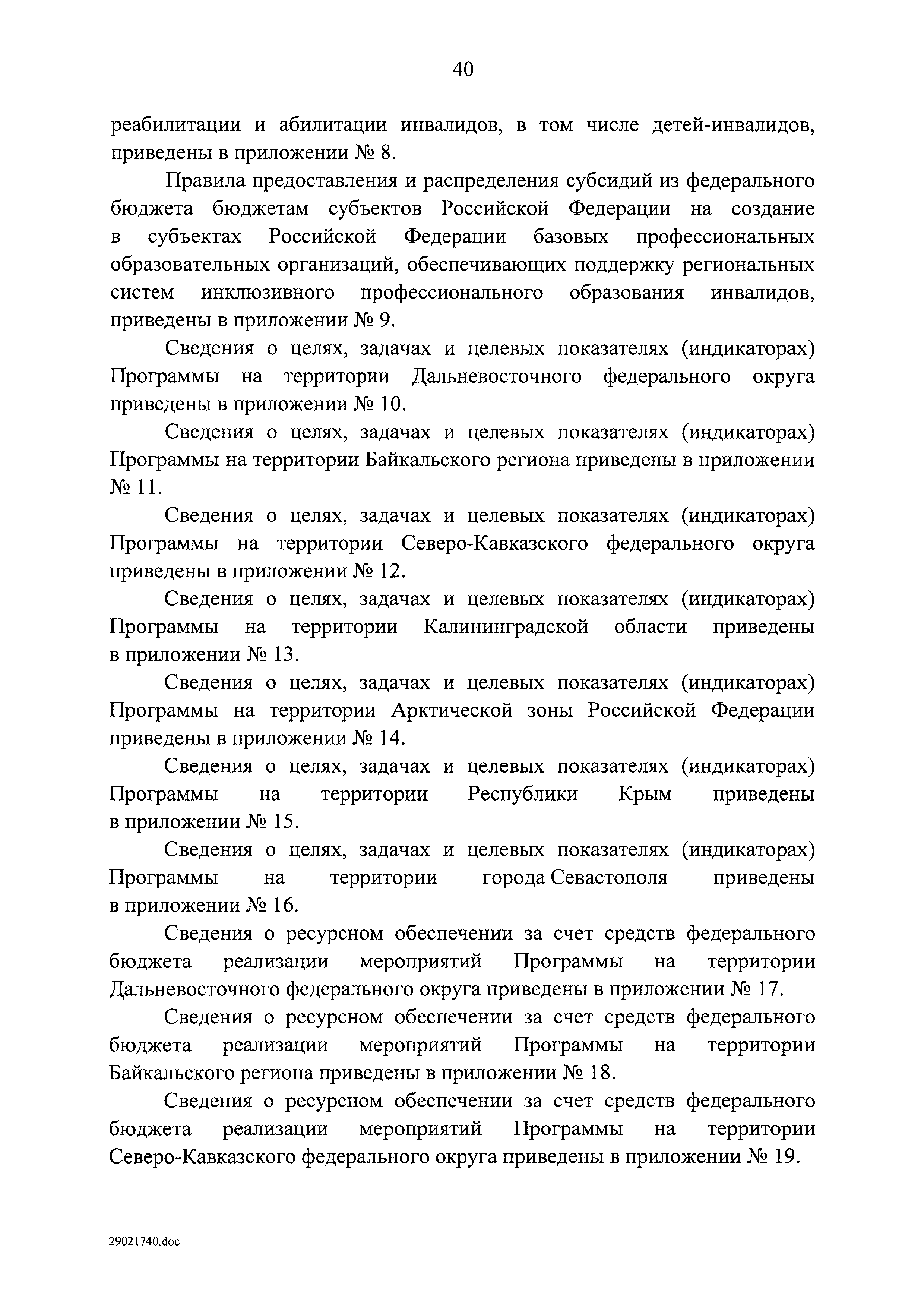 | Оглавление: | I. Приоритеты и цели государственной политики в области социальной защиты инвалидов в Российской Федерации, в том числе общие требования к государственной политике субъектов Российской Федерации II. Общая характеристика участия субъектов Российской Федерации в реализации Программы Приложение № 1. Сведения о целевых показателях и индикаторах государственной программы Российской Федерации "Доступная среда" Приложение № 2. Сведения о целевых показателях и индикаторах государственной программы Российской Федерации "Доступная среда" по субъектам Российской Федерации Приложение № 3. Перечень основных мероприятий государственной программы Российской Федерации "Доступная среда" Приложение № 4. Сведения об основных мерах правового регулирования в сфере реализации государственной программы Российской Федерации "Доступная среда" Приложение № 5. Ресурсное обеспечение реализации государственной программы Российской Федерации "Доступная среда" за счет средств федерального бюджета и бюджетов государственных внебюджетных фондов Российской Федерации Приложение № 6. План реализации на 2019 год и на плановый период 2020 и 2021 годов государственной программы Российской Федерации "Доступная среда" Приложение № 7. Правила предоставления субсидий из федерального бюджета бюджетам субъектов Российской Федерации на реализацию мероприятий в сфере обеспечения доступности приоритетных объектов и услуг в приоритетных сферах жизнедеятельности инвалидов и других маломобильных групп населения и их распределения Приложение № 8. Правила предоставления и распределения субсидий из федерального бюджета бюджетам субъектов Российской Федерации на реализацию мероприятий, включенных в государственные программы субъектов Российской Федерации, разработанные на основе типовой программы субъекта Российской Федерации по формированию системы комплексной реабилитации и абилитации инвалидов, в том числе детей-инвалидов Приложение № 9. Правила предоставления и распределения субсидий из федерального бюджета бюджетам субъектов Российской Федерации на создание в субъектах Российской Федерации базовых профессиональных образовательных организаций, обеспечивающих поддержку региональных систем инклюзивного профессионального образования инвалидов Приложение № 10. Сведения о целях, задачах и целевых показателях (индикаторах) государственной программы Российской Федерации "Доступная среда" на территории Дальневосточного федерального округа Приложение № 11. Сведения о целях, задачах и целевых показателях (индикаторах) государственной программы Российской Федерации "Доступная среда" на территории Байкальского региона Приложение № 12. Сведения о целях, задачах и целевых показателях (индикаторах) государственной программы Российской Федерации "Доступная среда" на территории Северо-Кавказского федерального округа Приложение № 13. Сведения о целях, задачах и целевых показателях (индикаторах) государственной программы Российской Федерации "Доступная среда" на территории Калининградской области Приложение № 14. Сведения о целях, задачах и целевых показателях (индикаторах) государственной программы Российской Федерации "Доступная среда" на территории Арктической зоны Российской Федерации Приложение № 15. Сведения о целях, зад