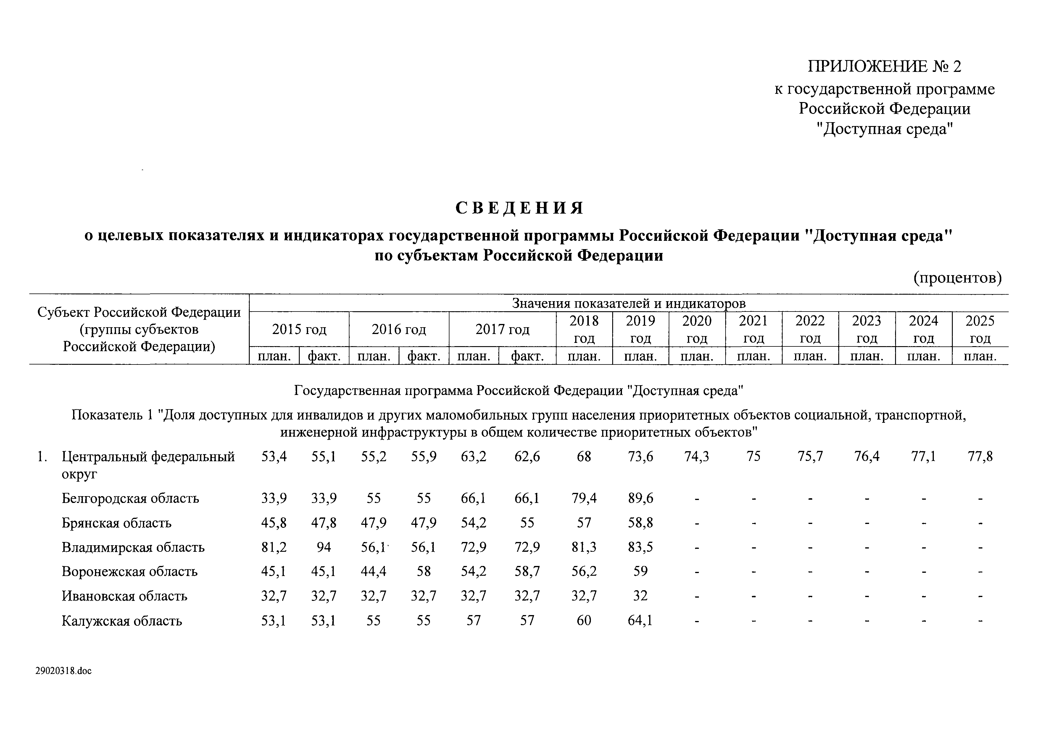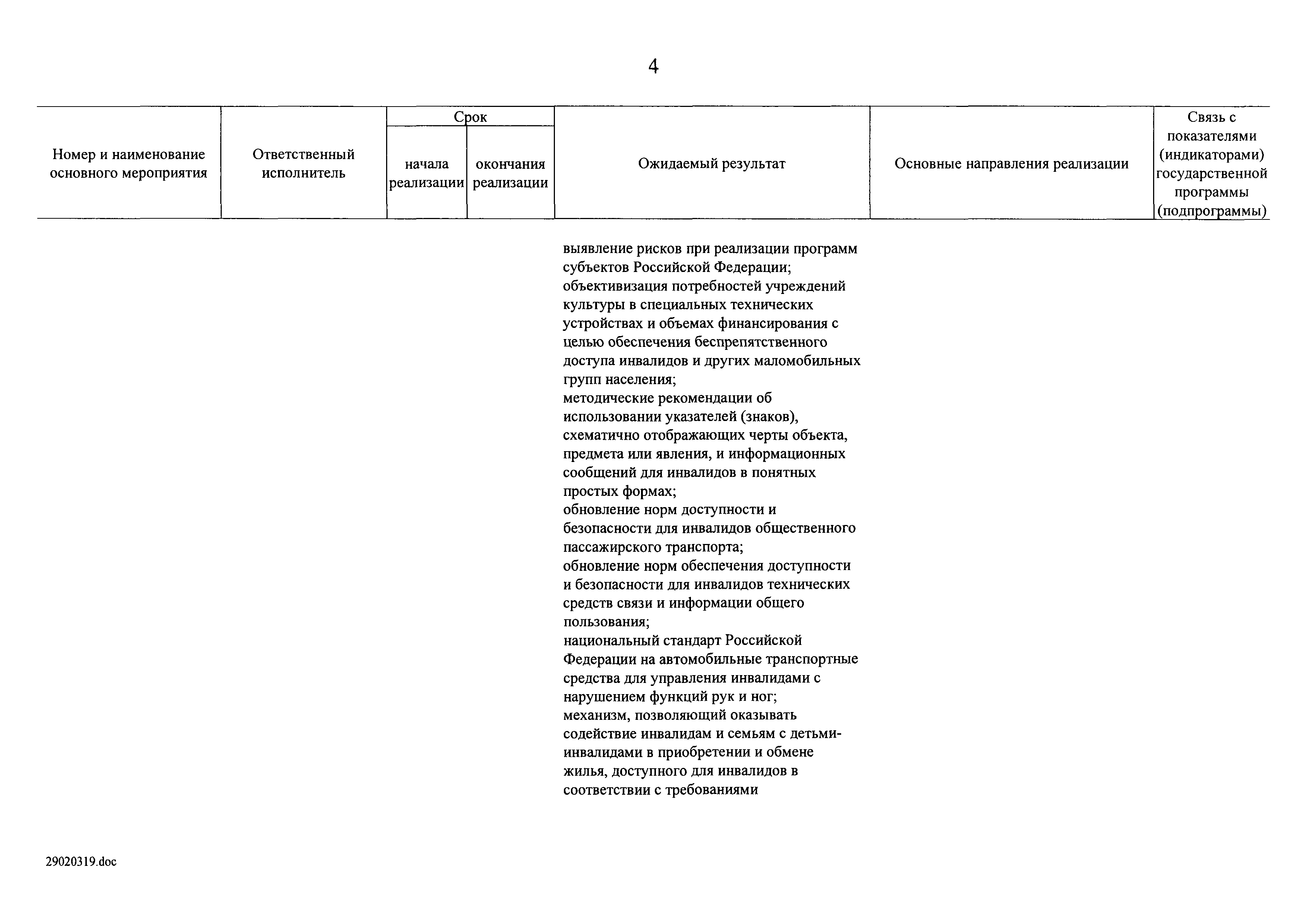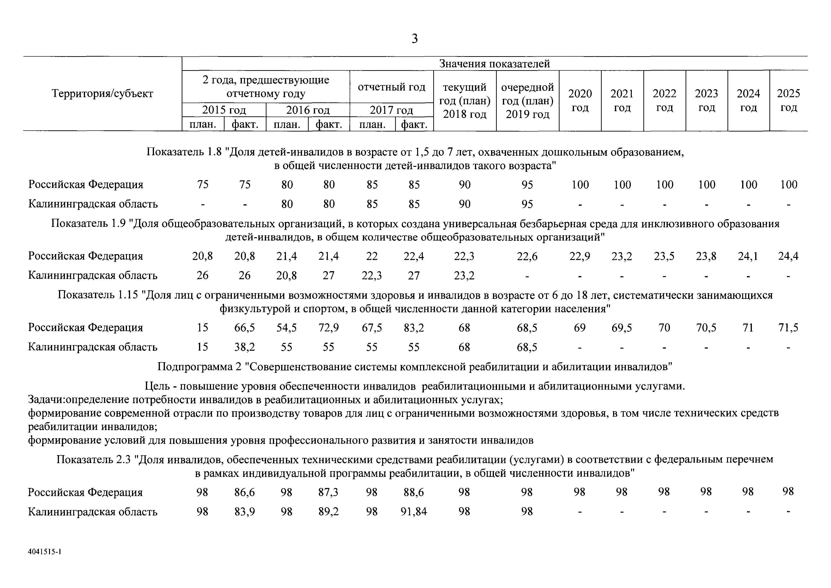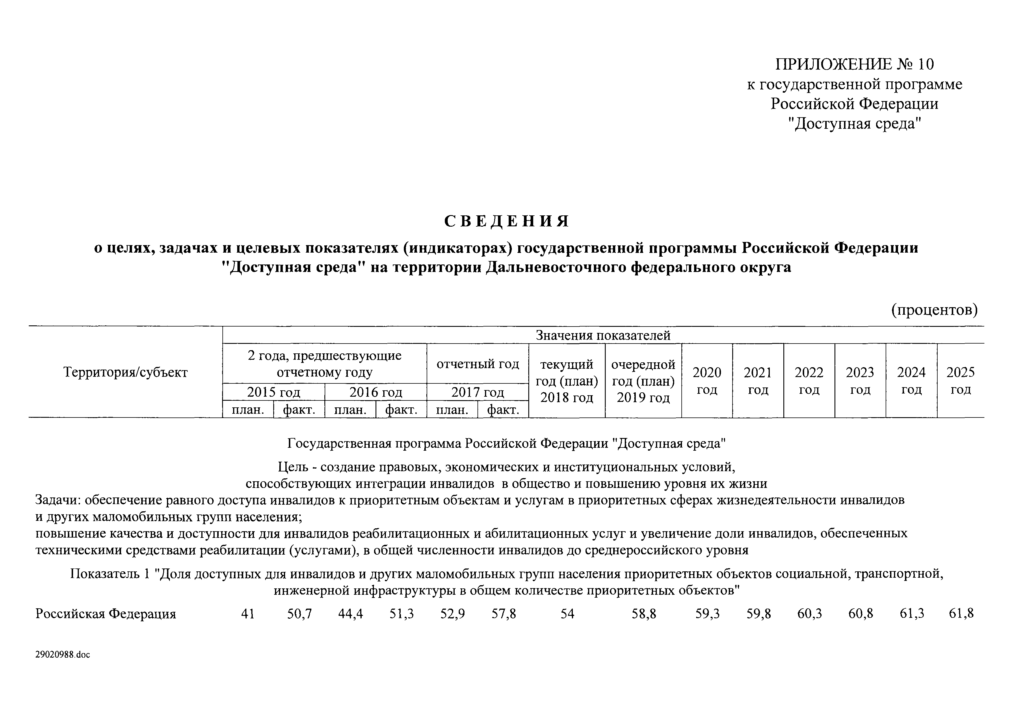 | Оглавление: | I. Приоритеты и цели государственной политики в области социальной защиты инвалидов в Российской Федерации, в том числе общие требования к государственной политике субъектов Российской Федерации II. Общая характеристика участия субъектов Российской Федерации в реализации Программы Приложение № 1. Сведения о целевых показателях и индикаторах государственной программы Российской Федерации "Доступная среда" Приложение № 2. Сведения о целевых показателях и индикаторах государственной программы Российской Федерации "Доступная среда" по субъектам Российской Федерации Приложение № 3. Перечень основных мероприятий государственной программы Российской Федерации "Доступная среда" Приложение № 4. Сведения об основных мерах правового регулирования в сфере реализации государственной программы Российской Федерации "Доступная среда" Приложение № 5. Ресурсное обеспечение реализации государственной программы Российской Федерации "Доступная среда" за счет средств федерального бюджета и бюджетов государственных внебюджетных фондов Российской Федерации Приложение № 6. План реализации на 2019 год и на плановый период 2020 и 2021 годов государственной программы Российской Федерации "Доступная среда" Приложение № 7. Правила предоставления субсидий из федерального бюджета бюджетам субъектов Российской Федерации на реализацию мероприятий в сфере обеспечения доступности приоритетных объектов и услуг в приоритетных сферах жизнедеятельности инвалидов и других маломобильных групп населения и их распределения Приложение № 8. Правила предоставления и распределения субсидий из федерального бюджета бюджетам субъектов Российской Федерации на реализацию мероприятий, включенных в государственные программы субъектов Российской Федерации, разработанные на основе типовой программы субъекта Российской Федерации по формированию системы комплексной реабилитации и абилитации инвалидов, в том числе детей-инвалидов Приложение № 9. Правила предоставления и распределения субсидий из федерального бюджета бюджетам субъектов Российской Федерации на создание в субъектах Российской Федерации базовых профессиональных образовательных организаций, обеспечивающих поддержку региональных систем инклюзивного профессионального образования инвалидов Приложение № 10. Сведения о целях, задачах и целевых показателях (индикаторах) государственной программы Российской Федерации "Доступная среда" на территории Дальневосточного федерального округа Приложение № 11. Сведения о целях, задачах и целевых показателях (индикаторах) государственной программы Российской Федерации "Доступная среда" на территории Байкальского региона Приложение № 12. Сведения о целях, задачах и целевых показателях (индикаторах) государственной программы Российской Федерации "Доступная среда" на территории Северо-Кавказского федерального округа Приложение № 13. Сведения о целях, задачах и целевых показателях (индикаторах) государственной программы Российской Федерации "Доступная среда" на территории Калининградской области Приложение № 14. Сведения о целях, задачах и целевых показателях (индикаторах) государственной программы Российской Федерации "Доступная среда" на территории Арктической зоны Российской Федерации Приложение № 15. Сведения о целях, зад