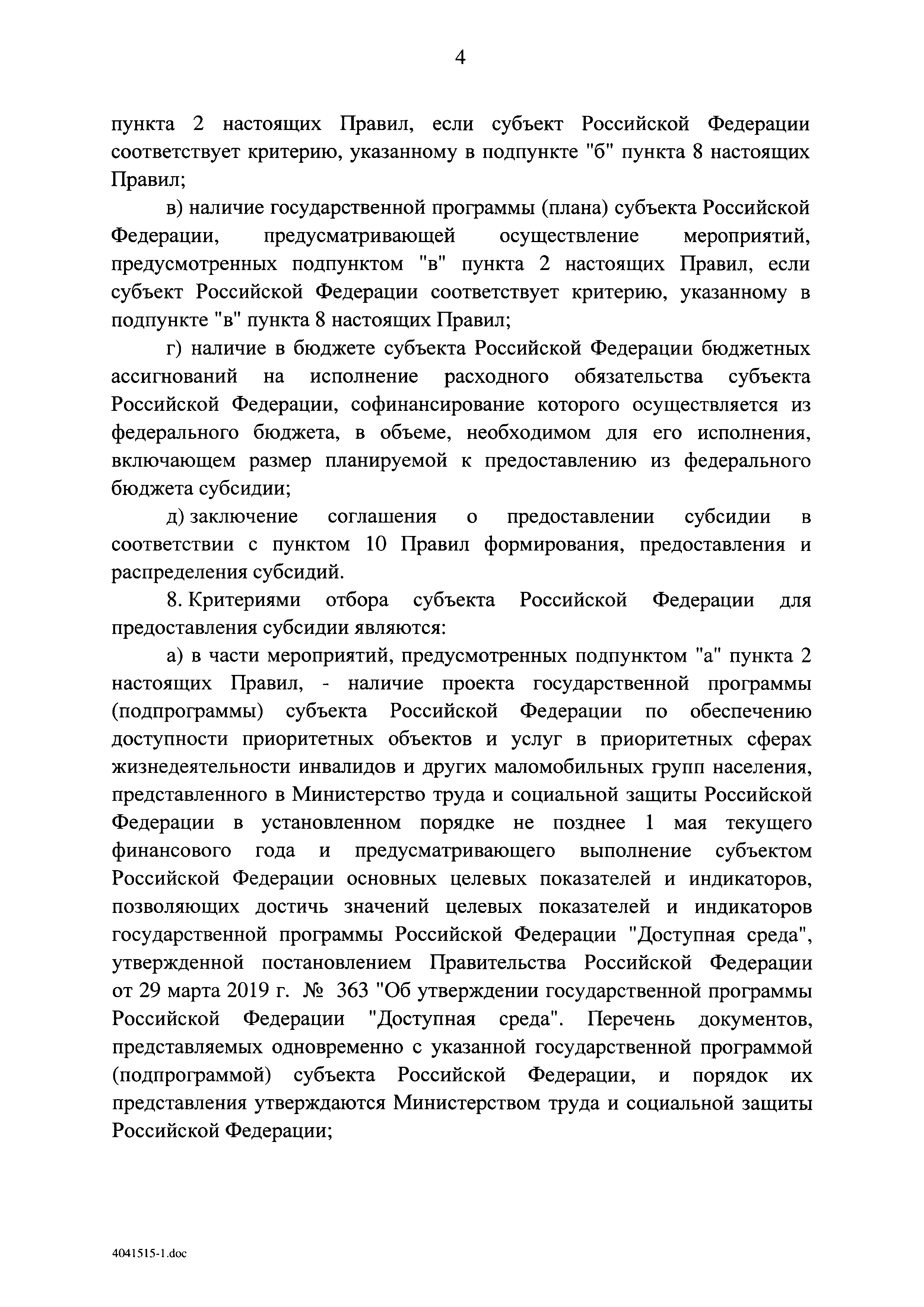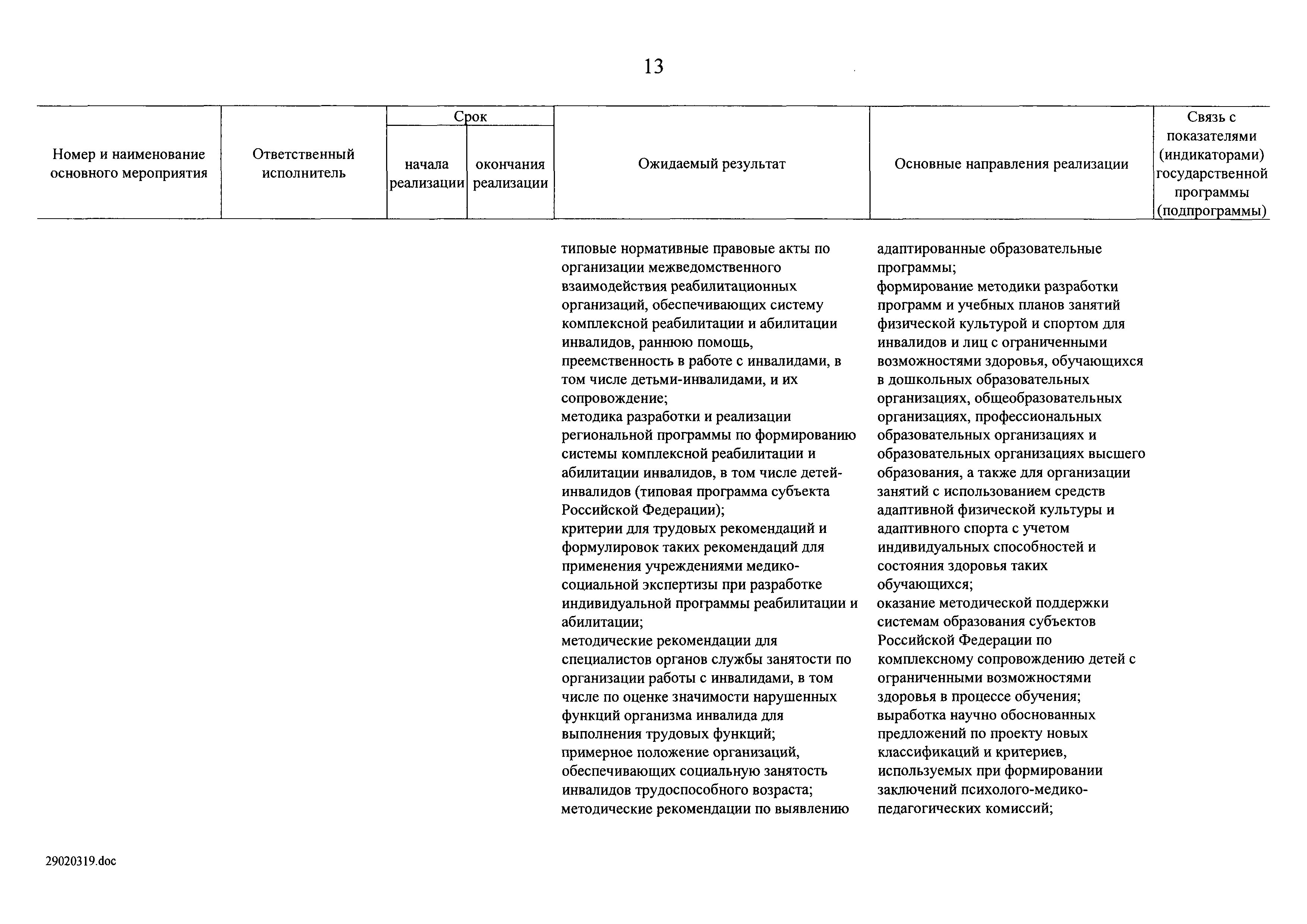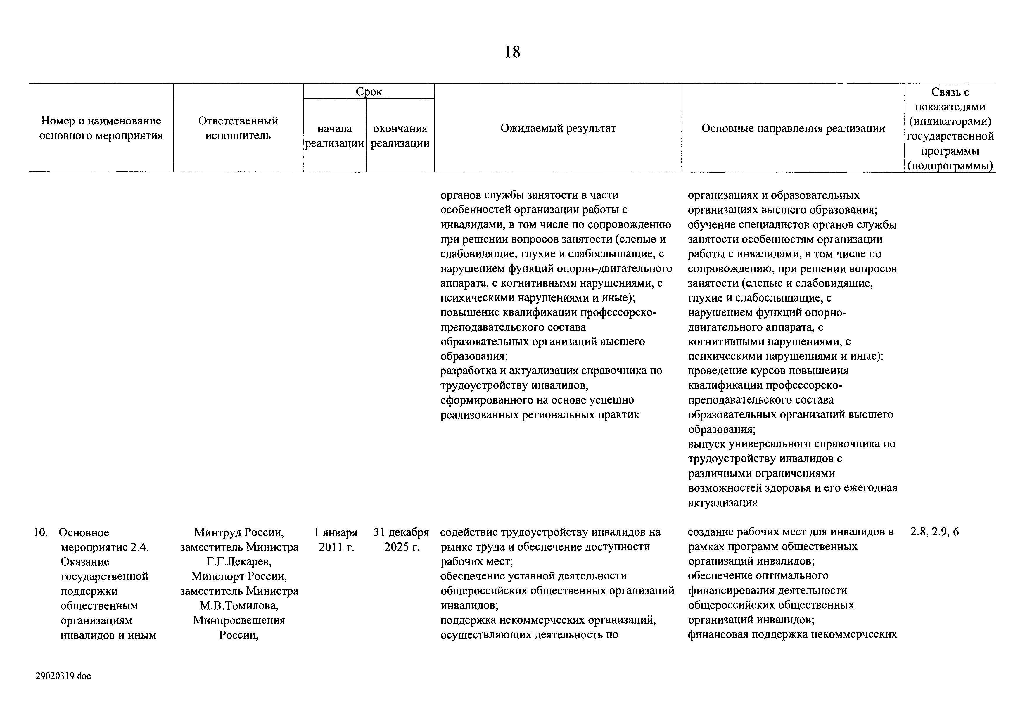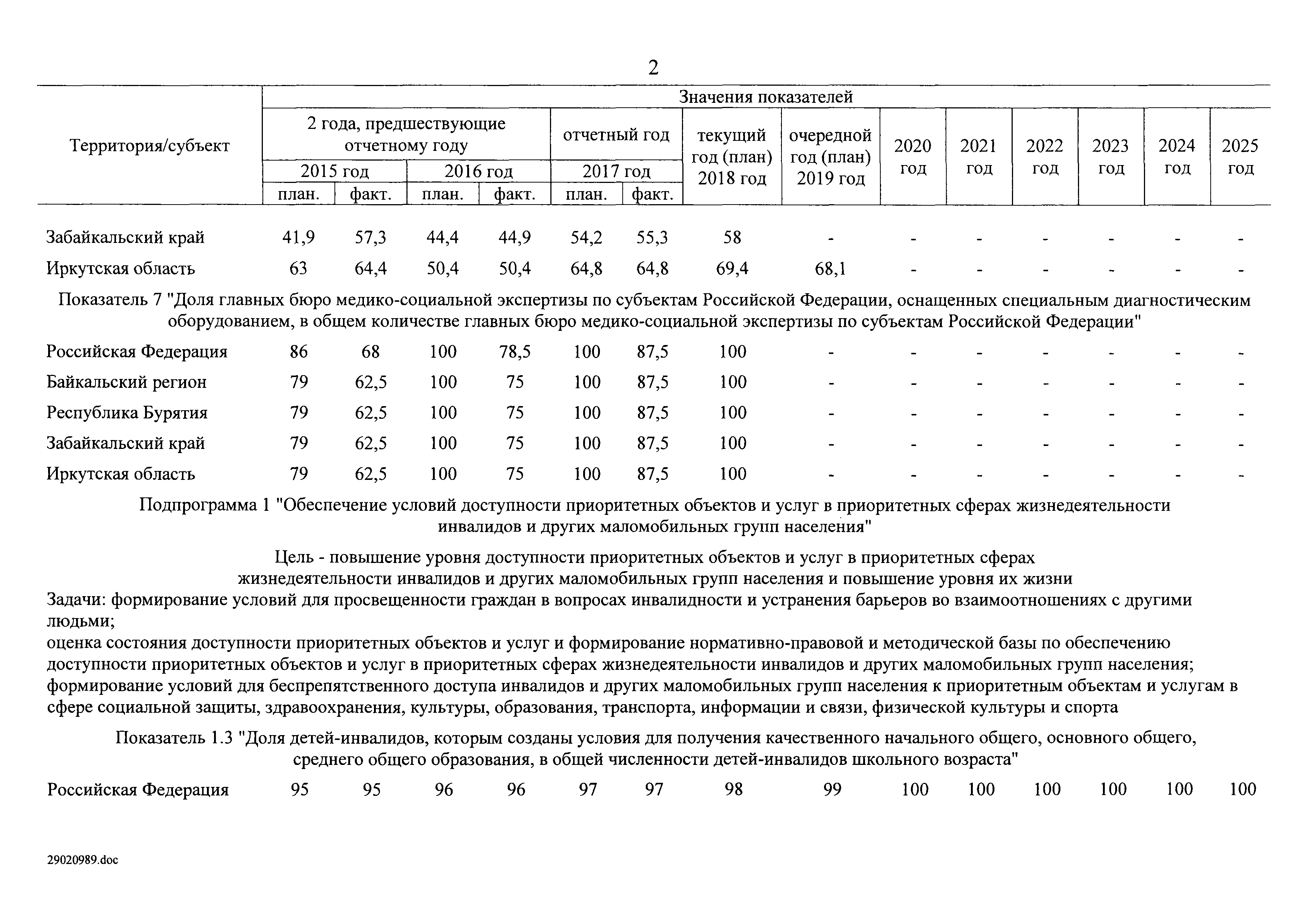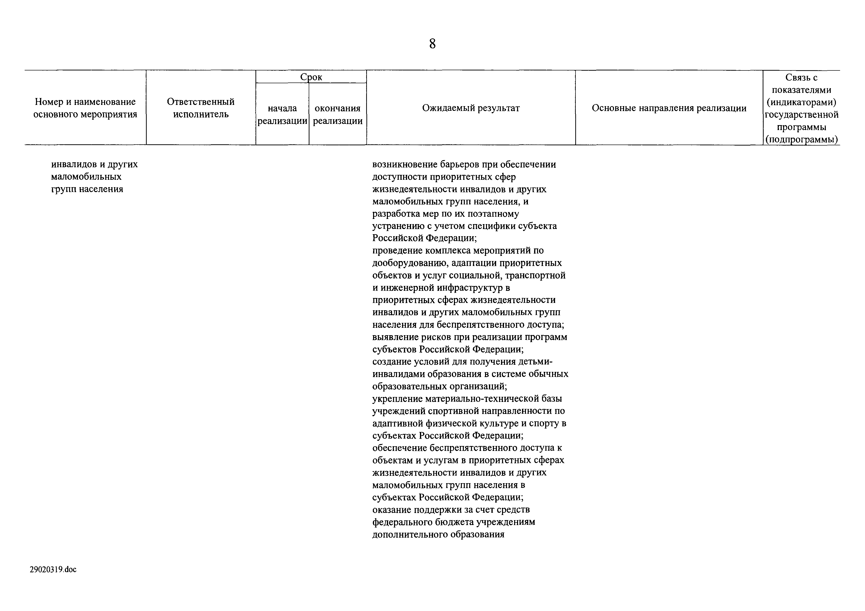 | Оглавление: | I. Приоритеты и цели государственной политики в области социальной защиты инвалидов в Российской Федерации, в том числе общие требования к государственной политике субъектов Российской Федерации II. Общая характеристика участия субъектов Российской Федерации в реализации Программы Приложение № 1. Сведения о целевых показателях и индикаторах государственной программы Российской Федерации "Доступная среда" Приложение № 2. Сведения о целевых показателях и индикаторах государственной программы Российской Федерации "Доступная среда" по субъектам Российской Федерации Приложение № 3. Перечень основных мероприятий государственной программы Российской Федерации "Доступная среда" Приложение № 4. Сведения об основных мерах правового регулирования в сфере реализации государственной программы Российской Федерации "Доступная среда" Приложение № 5. Ресурсное обеспечение реализации государственной программы Российской Федерации "Доступная среда" за счет средств федерального бюджета и бюджетов государственных внебюджетных фондов Российской Федерации Приложение № 6. План реализации на 2019 год и на плановый период 2020 и 2021 годов государственной программы Российской Федерации "Доступная среда" Приложение № 7. Правила предоставления субсидий из федерального бюджета бюджетам субъектов Российской Федерации на реализацию мероприятий в сфере обеспечения доступности приоритетных объектов и услуг в приоритетных сферах жизнедеятельности инвалидов и других маломобильных групп населения и их распределения Приложение № 8. Правила предоставления и распределения субсидий из федерального бюджета бюджетам субъектов Российской Федерации на реализацию мероприятий, включенных в государственные программы субъектов Российской Федерации, разработанные на основе типовой программы субъекта Российской Федерации по формированию системы комплексной реабилитации и абилитации инвалидов, в том числе детей-инвалидов Приложение № 9. Правила предоставления и распределения субсидий из федерального бюджета бюджетам субъектов Российской Федерации на создание в субъектах Российской Федерации базовых профессиональных образовательных организаций, обеспечивающих поддержку региональных систем инклюзивного профессионального образования инвалидов Приложение № 10. Сведения о целях, задачах и целевых показателях (индикаторах) государственной программы Российской Федерации "Доступная среда" на территории Дальневосточного федерального округа Приложение № 11. Сведения о целях, задачах и целевых показателях (индикаторах) государственной программы Российской Федерации "Доступная среда" на территории Байкальского региона Приложение № 12. Сведения о целях, задачах и целевых показателях (индикаторах) государственной программы Российской Федерации "Доступная среда" на территории Северо-Кавказского федерального округа Приложение № 13. Сведения о целях, задачах и целевых показателях (индикаторах) государственной программы Российской Федерации "Доступная среда" на территории Калининградской области Приложение № 14. Сведения о целях, задачах и целевых показателях (индикаторах) государственной программы Российской Федерации "Доступная среда" на территории Арктической зоны Российской Федерации Приложение № 15. Сведения о целях, зад