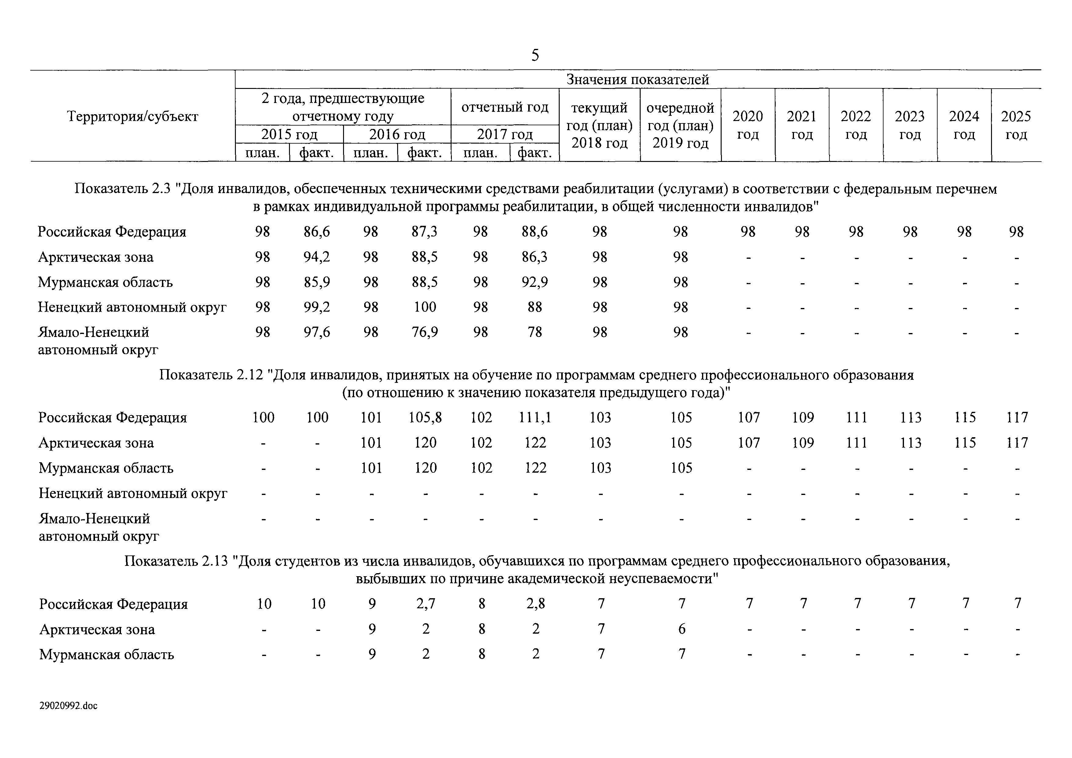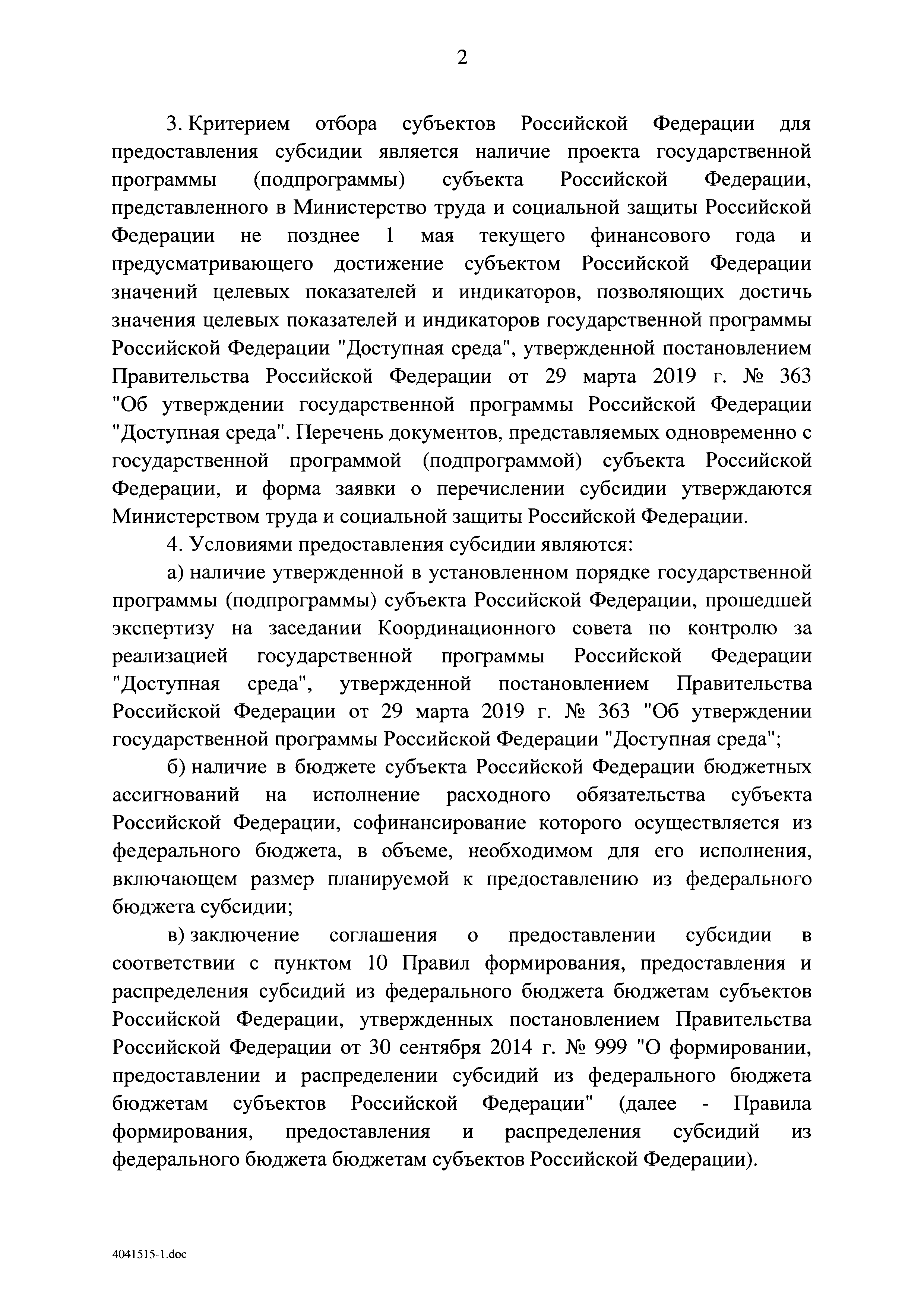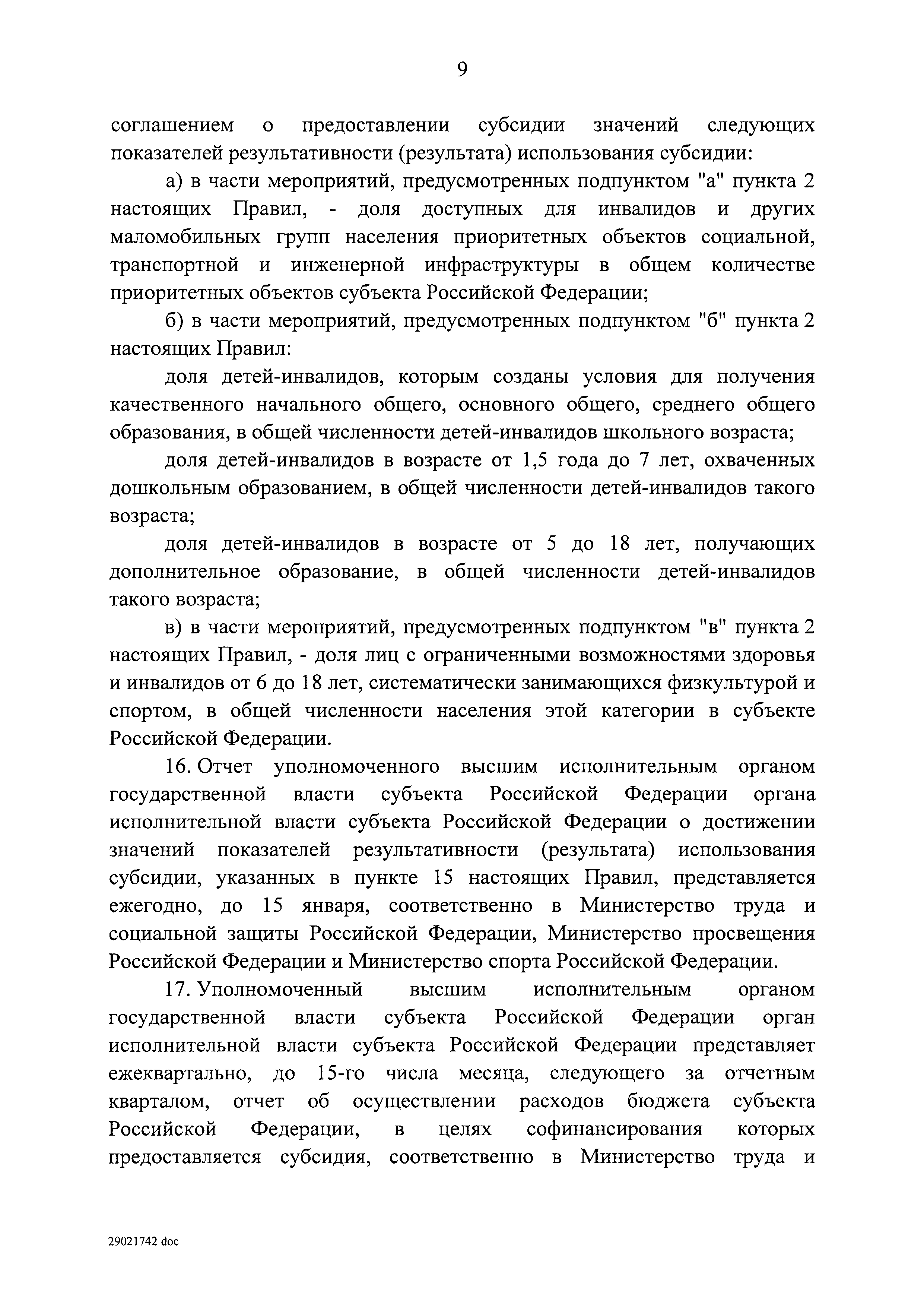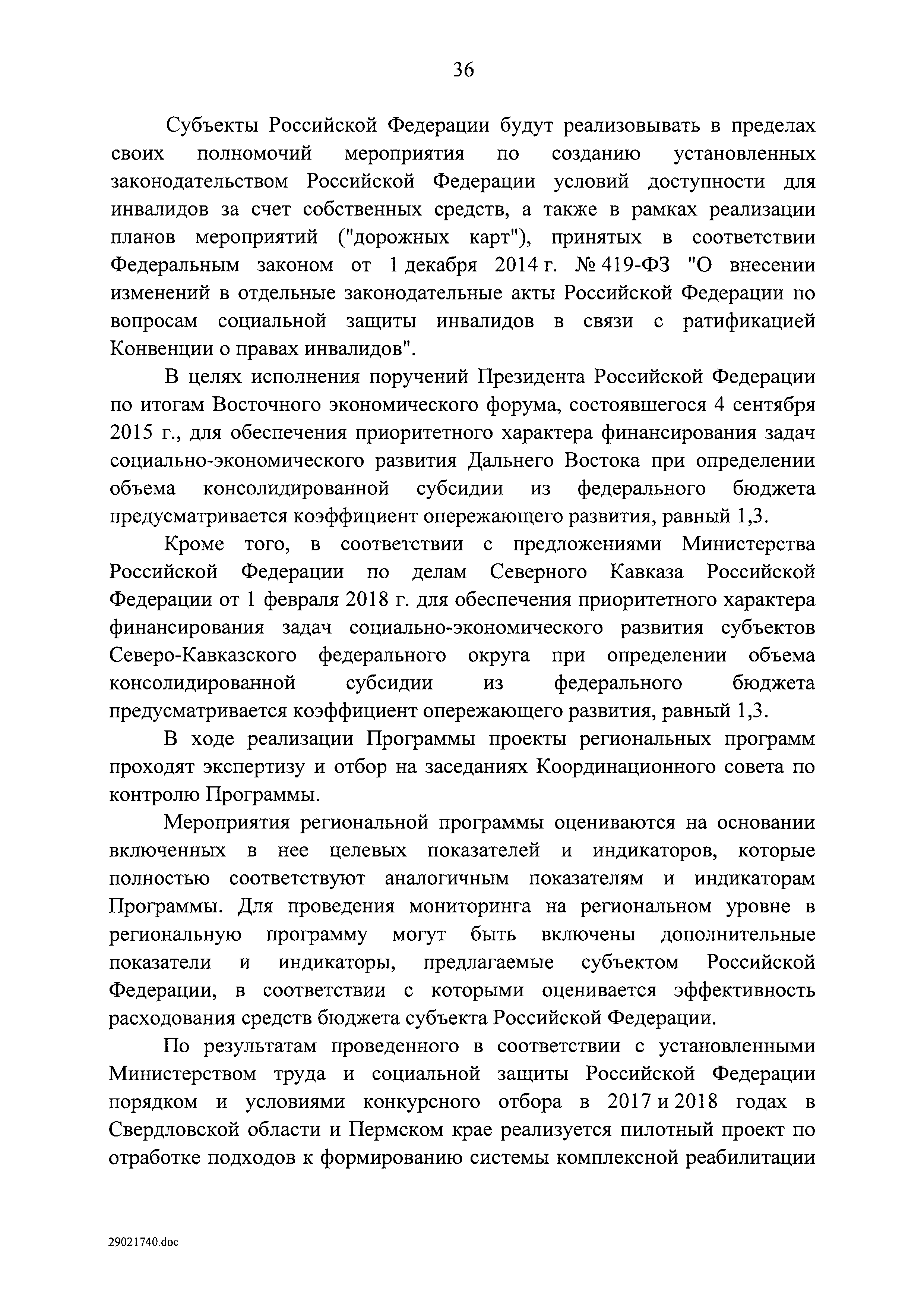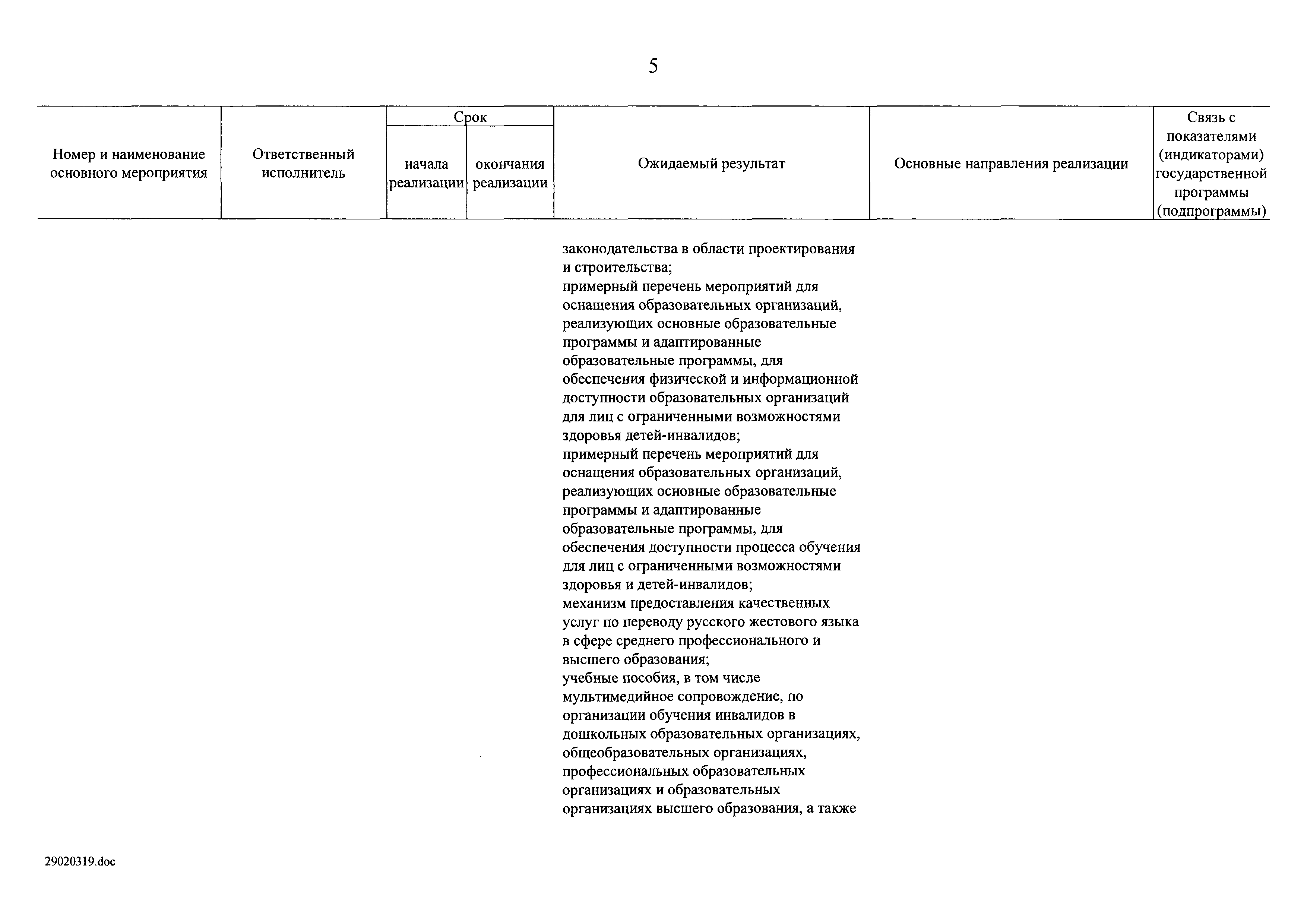 | Оглавление: | I. Приоритеты и цели государственной политики в области социальной защиты инвалидов в Российской Федерации, в том числе общие требования к государственной политике субъектов Российской Федерации II. Общая характеристика участия субъектов Российской Федерации в реализации Программы Приложение № 1. Сведения о целевых показателях и индикаторах государственной программы Российской Федерации "Доступная среда" Приложение № 2. Сведения о целевых показателях и индикаторах государственной программы Российской Федерации "Доступная среда" по субъектам Российской Федерации Приложение № 3. Перечень основных мероприятий государственной программы Российской Федерации "Доступная среда" Приложение № 4. Сведения об основных мерах правового регулирования в сфере реализации государственной программы Российской Федерации "Доступная среда" Приложение № 5. Ресурсное обеспечение реализации государственной программы Российской Федерации "Доступная среда" за счет средств федерального бюджета и бюджетов государственных внебюджетных фондов Российской Федерации Приложение № 6. План реализации на 2019 год и на плановый период 2020 и 2021 годов государственной программы Российской Федерации "Доступная среда" Приложение № 7. Правила предоставления субсидий из федерального бюджета бюджетам субъектов Российской Федерации на реализацию мероприятий в сфере обеспечения доступности приоритетных объектов и услуг в приоритетных сферах жизнедеятельности инвалидов и других маломобильных групп населения и их распределения Приложение № 8. Правила предоставления и распределения субсидий из федерального бюджета бюджетам субъектов Российской Федерации на реализацию мероприятий, включенных в государственные программы субъектов Российской Федерации, разработанные на основе типовой программы субъекта Российской Федерации по формированию системы комплексной реабилитации и абилитации инвалидов, в том числе детей-инвалидов Приложение № 9. Правила предоставления и распределения субсидий из федерального бюджета бюджетам субъектов Российской Федерации на создание в субъектах Российской Федерации базовых профессиональных образовательных организаций, обеспечивающих поддержку региональных систем инклюзивного профессионального образования инвалидов Приложение № 10. Сведения о целях, задачах и целевых показателях (индикаторах) государственной программы Российской Федерации "Доступная среда" на территории Дальневосточного федерального округа Приложение № 11. Сведения о целях, задачах и целевых показателях (индикаторах) государственной программы Российской Федерации "Доступная среда" на территории Байкальского региона Приложение № 12. Сведения о целях, задачах и целевых показателях (индикаторах) государственной программы Российской Федерации "Доступная среда" на территории Северо-Кавказского федерального округа Приложение № 13. Сведения о целях, задачах и целевых показателях (индикаторах) государственной программы Российской Федерации "Доступная среда" на территории Калининградской области Приложение № 14. Сведения о целях, задачах и целевых показателях (индикаторах) государственной программы Российской Федерации "Доступная среда" на территории Арктической зоны Российской Федерации Приложение № 15. Сведения о целях, зад