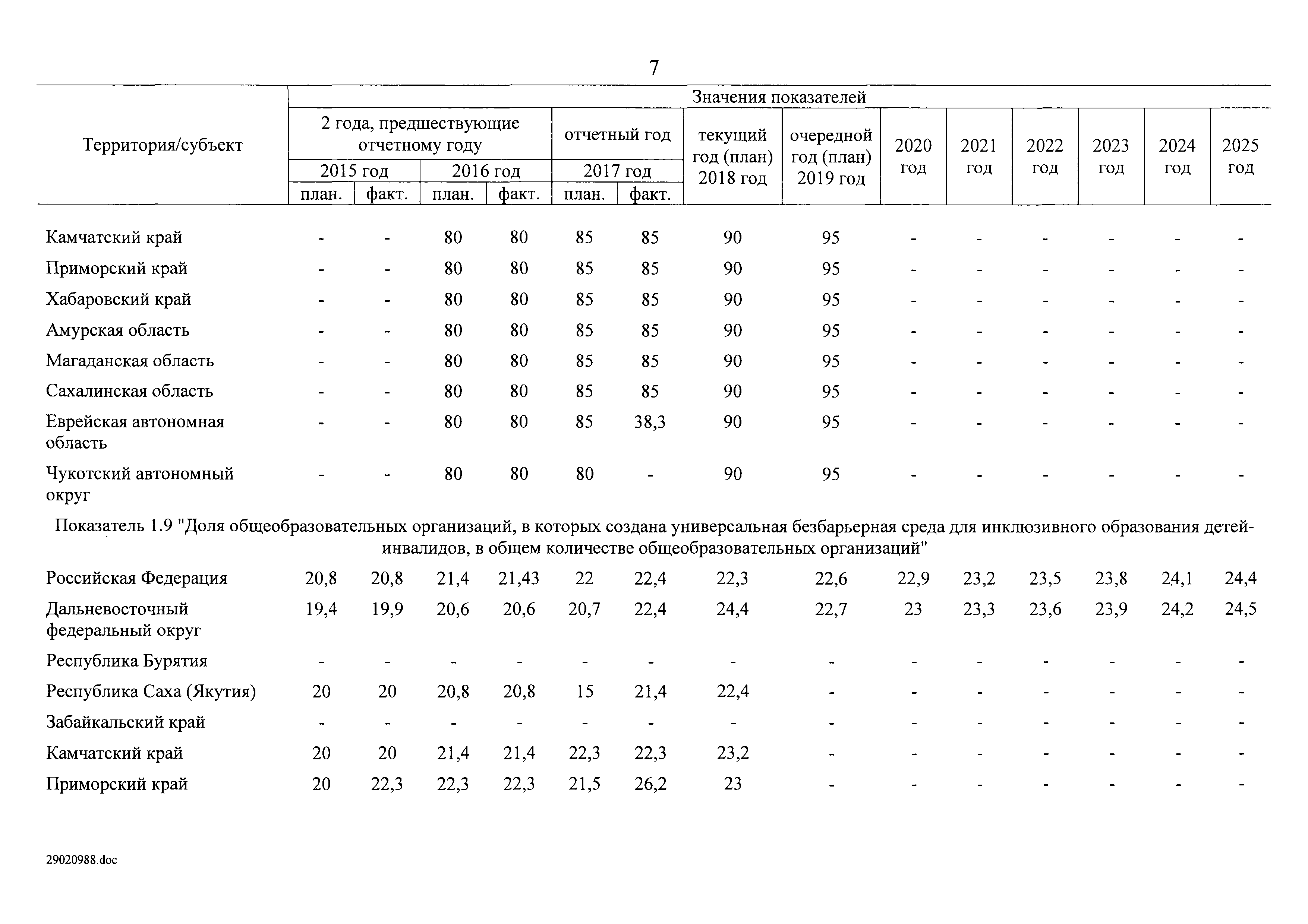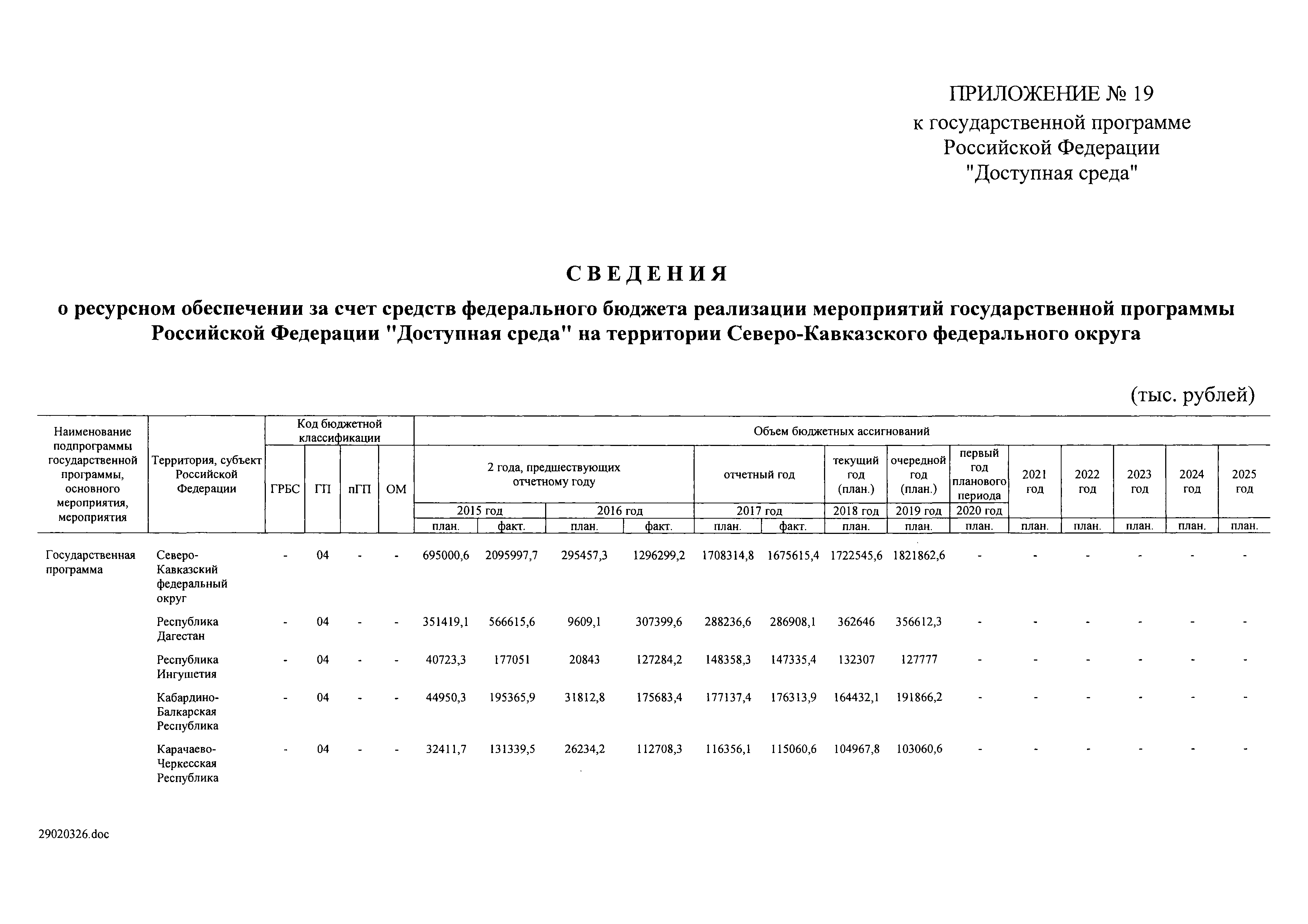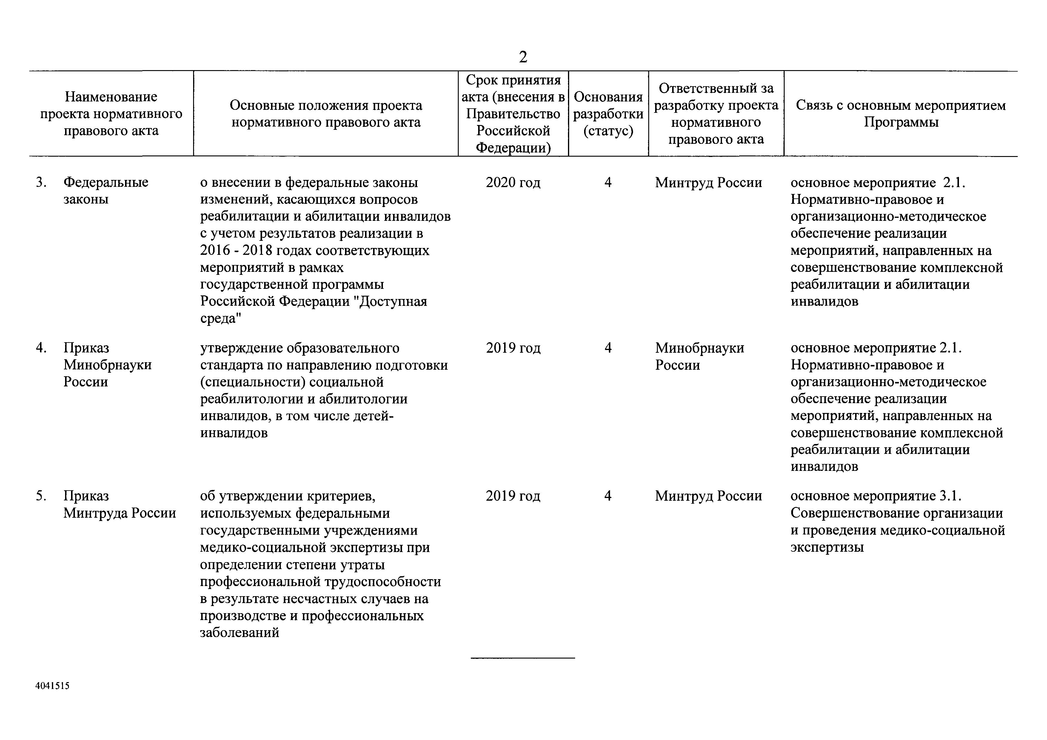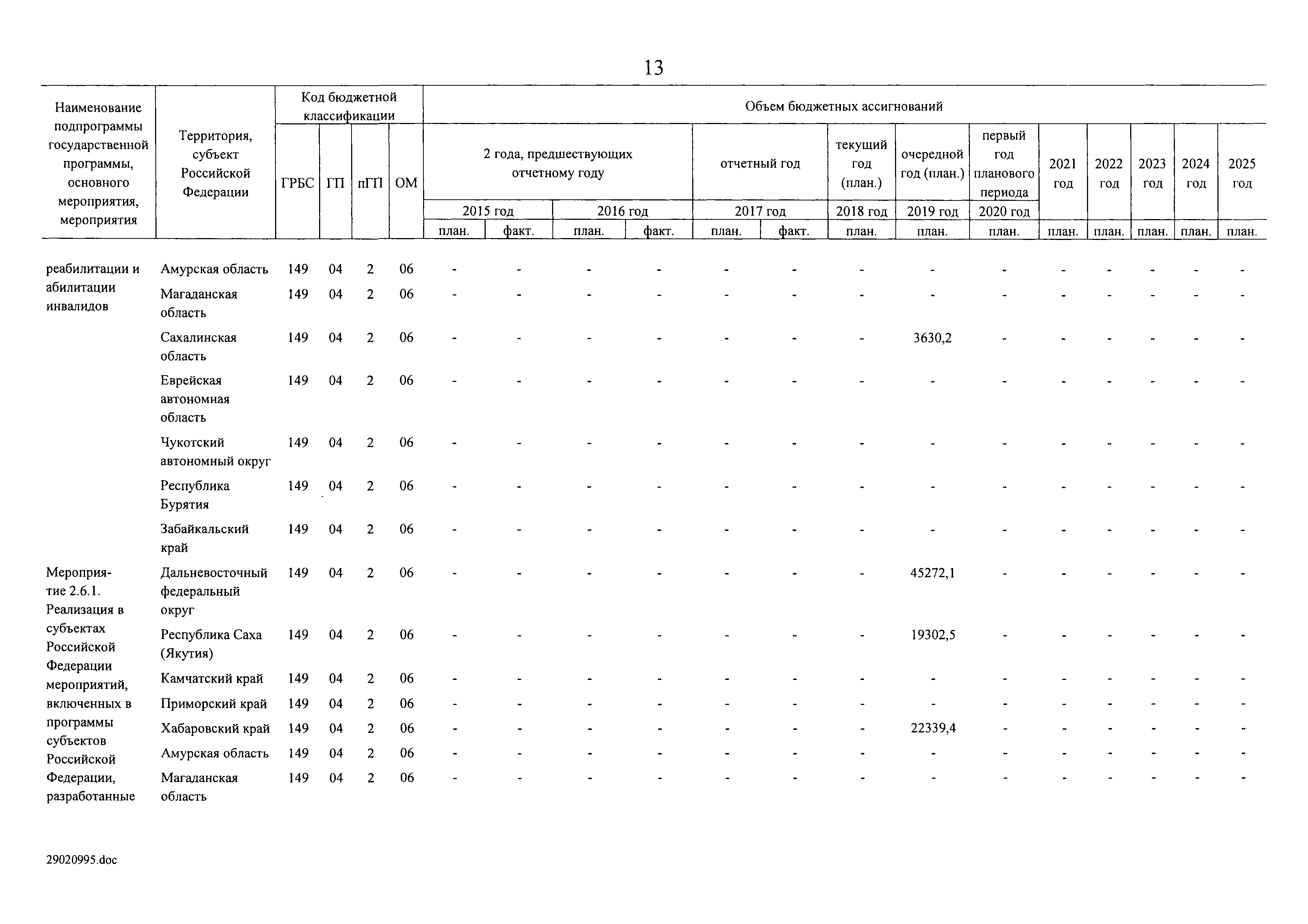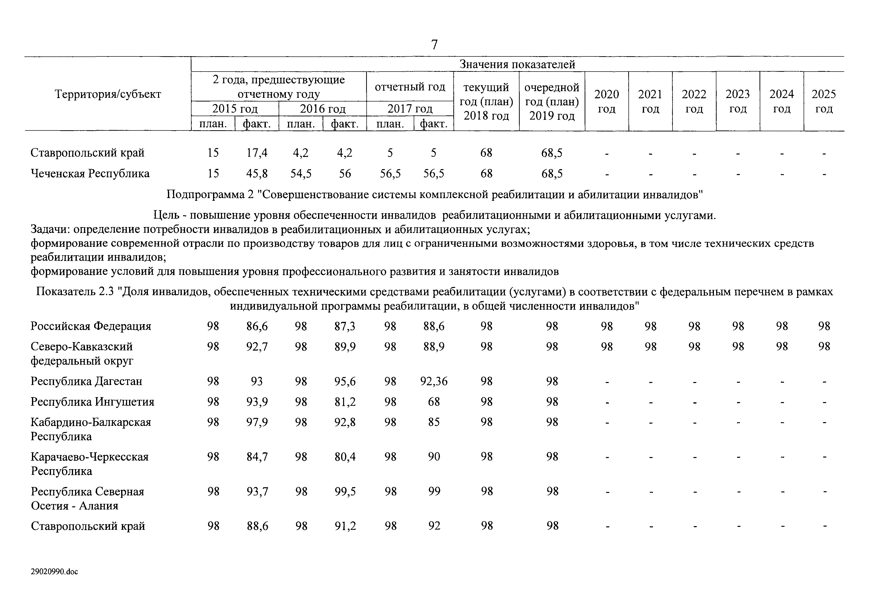 | Оглавление: | I. Приоритеты и цели государственной политики в области социальной защиты инвалидов в Российской Федерации, в том числе общие требования к государственной политике субъектов Российской Федерации II. Общая характеристика участия субъектов Российской Федерации в реализации Программы Приложение № 1. Сведения о целевых показателях и индикаторах государственной программы Российской Федерации "Доступная среда" Приложение № 2. Сведения о целевых показателях и индикаторах государственной программы Российской Федерации "Доступная среда" по субъектам Российской Федерации Приложение № 3. Перечень основных мероприятий государственной программы Российской Федерации "Доступная среда" Приложение № 4. Сведения об основных мерах правового регулирования в сфере реализации государственной программы Российской Федерации "Доступная среда" Приложение № 5. Ресурсное обеспечение реализации государственной программы Российской Федерации "Доступная среда" за счет средств федерального бюджета и бюджетов государственных внебюджетных фондов Российской Федерации Приложение № 6. План реализации на 2019 год и на плановый период 2020 и 2021 годов государственной программы Российской Федерации "Доступная среда" Приложение № 7. Правила предоставления субсидий из федерального бюджета бюджетам субъектов Российской Федерации на реализацию мероприятий в сфере обеспечения доступности приоритетных объектов и услуг в приоритетных сферах жизнедеятельности инвалидов и других маломобильных групп населения и их распределения Приложение № 8. Правила предоставления и распределения субсидий из федерального бюджета бюджетам субъектов Российской Федерации на реализацию мероприятий, включенных в государственные программы субъектов Российской Федерации, разработанные на основе типовой программы субъекта Российской Федерации по формированию системы комплексной реабилитации и абилитации инвалидов, в том числе детей-инвалидов Приложение № 9. Правила предоставления и распределения субсидий из федерального бюджета бюджетам субъектов Российской Федерации на создание в субъектах Российской Федерации базовых профессиональных образовательных организаций, обеспечивающих поддержку региональных систем инклюзивного профессионального образования инвалидов Приложение № 10. Сведения о целях, задачах и целевых показателях (индикаторах) государственной программы Российской Федерации "Доступная среда" на территории Дальневосточного федерального округа Приложение № 11. Сведения о целях, задачах и целевых показателях (индикаторах) государственной программы Российской Федерации "Доступная среда" на территории Байкальского региона Приложение № 12. Сведения о целях, задачах и целевых показателях (индикаторах) государственной программы Российской Федерации "Доступная среда" на территории Северо-Кавказского федерального округа Приложение № 13. Сведения о целях, задачах и целевых показателях (индикаторах) государственной программы Российской Федерации "Доступная среда" на территории Калининградской области Приложение № 14. Сведения о целях, задачах и целевых показателях (индикаторах) государственной программы Российской Федерации "Доступная среда" на территории Арктической зоны Российской Федерации Приложение № 15. Сведения о целях, зад