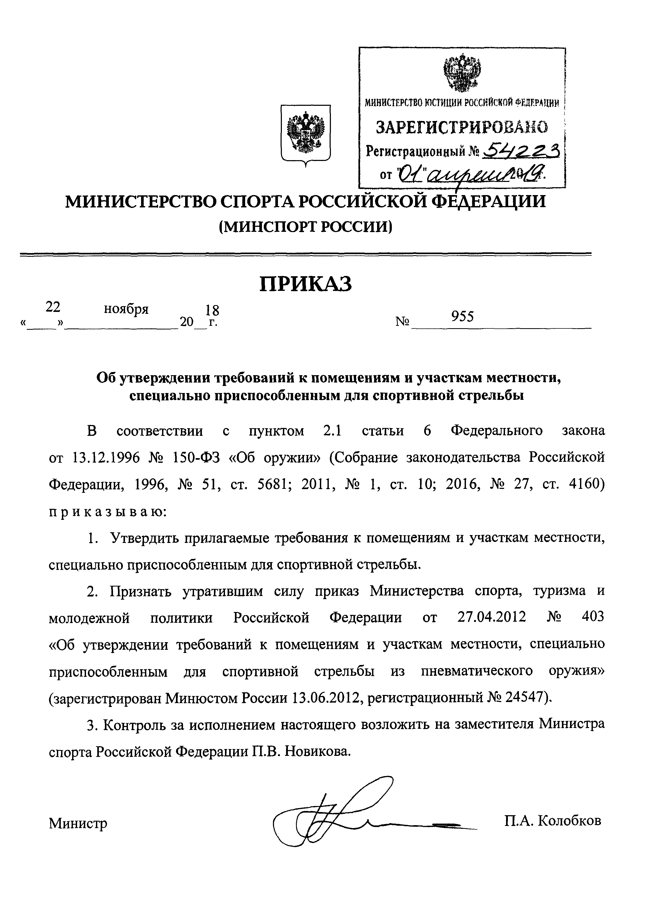 | | Заменяет собой: | - Приказ 403 от 27.04.2012 «Об утверждении требований к помещениям и участкам местности, специально приспособленным для спортивной стрельбы»