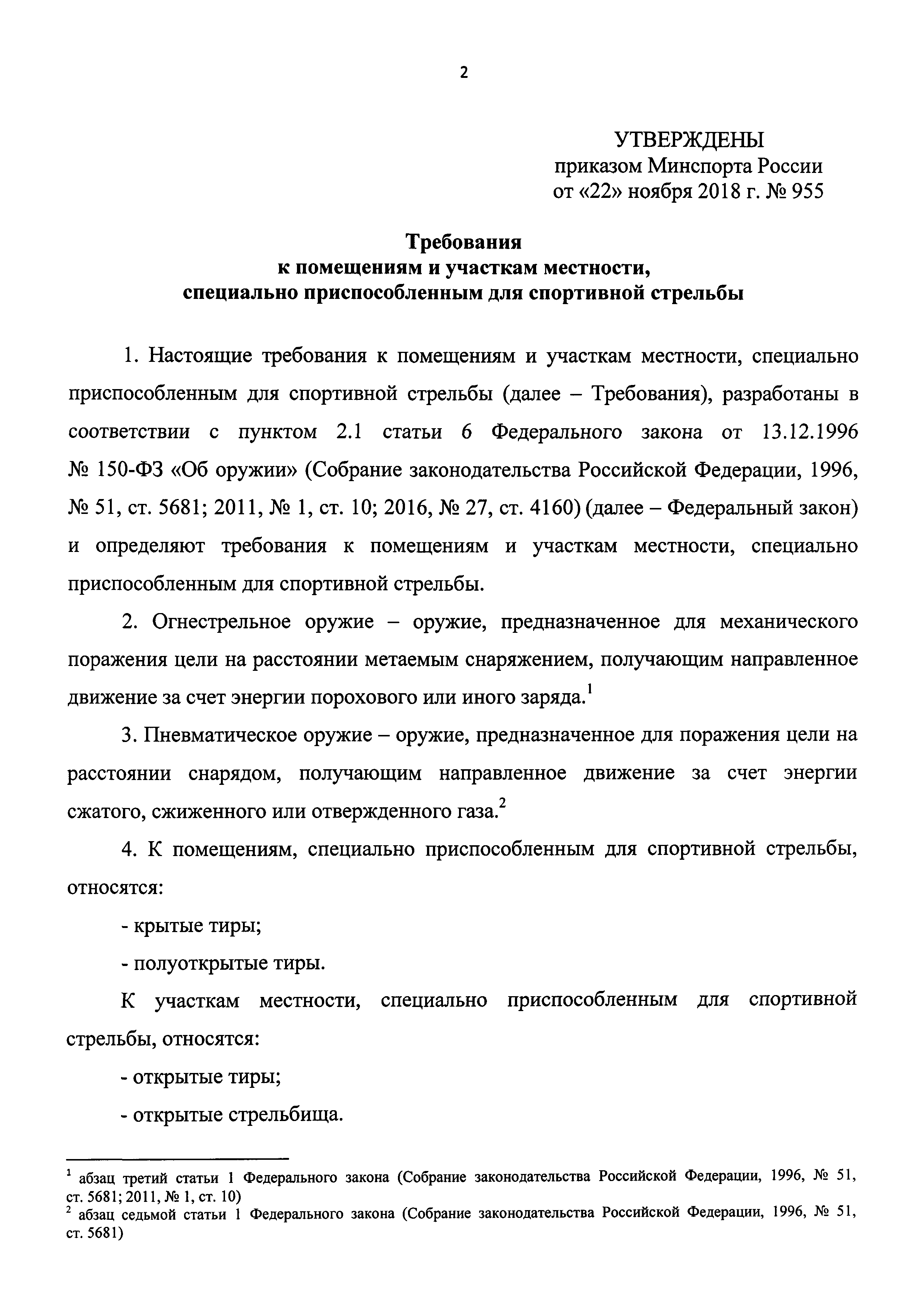 Требования к помещениям и участкам местности, специально приспособленным для спортивной стрельбы| Статус: | действует | | Название рус.: | Требования к помещениям и участкам местности, специально приспособленным для спортивной стрельбы | | Дата добавления в базу: | 01.02.2020 | | Дата актуализации: | 01.01.2021 | | Дата введения: | 13.04.2019 | | Область применения: | Требования к помещениям и участкам местности, специально приспособленным для спортивной стрельбы, разработаны в соответствии с пунктом 2.1 статьи 6 Федерального закона от 13.12.1996 № 150-ФЗ "Об оружии" и определяют требования к помещениям и участкам местности, специально приспособленным для спортивной стрельбы | | Утверждён: | 22.11.2018 Министерство спорта РФ (955)