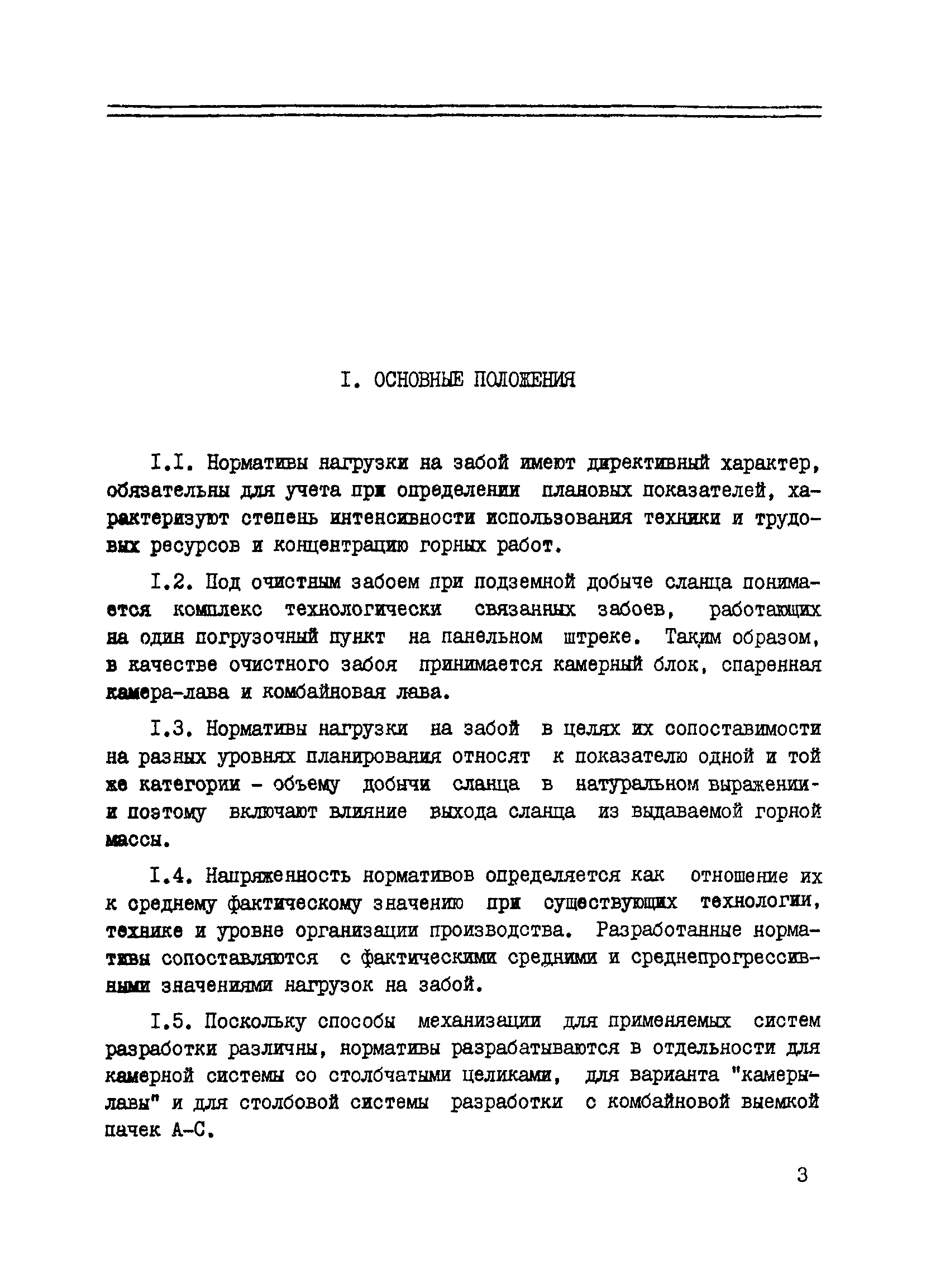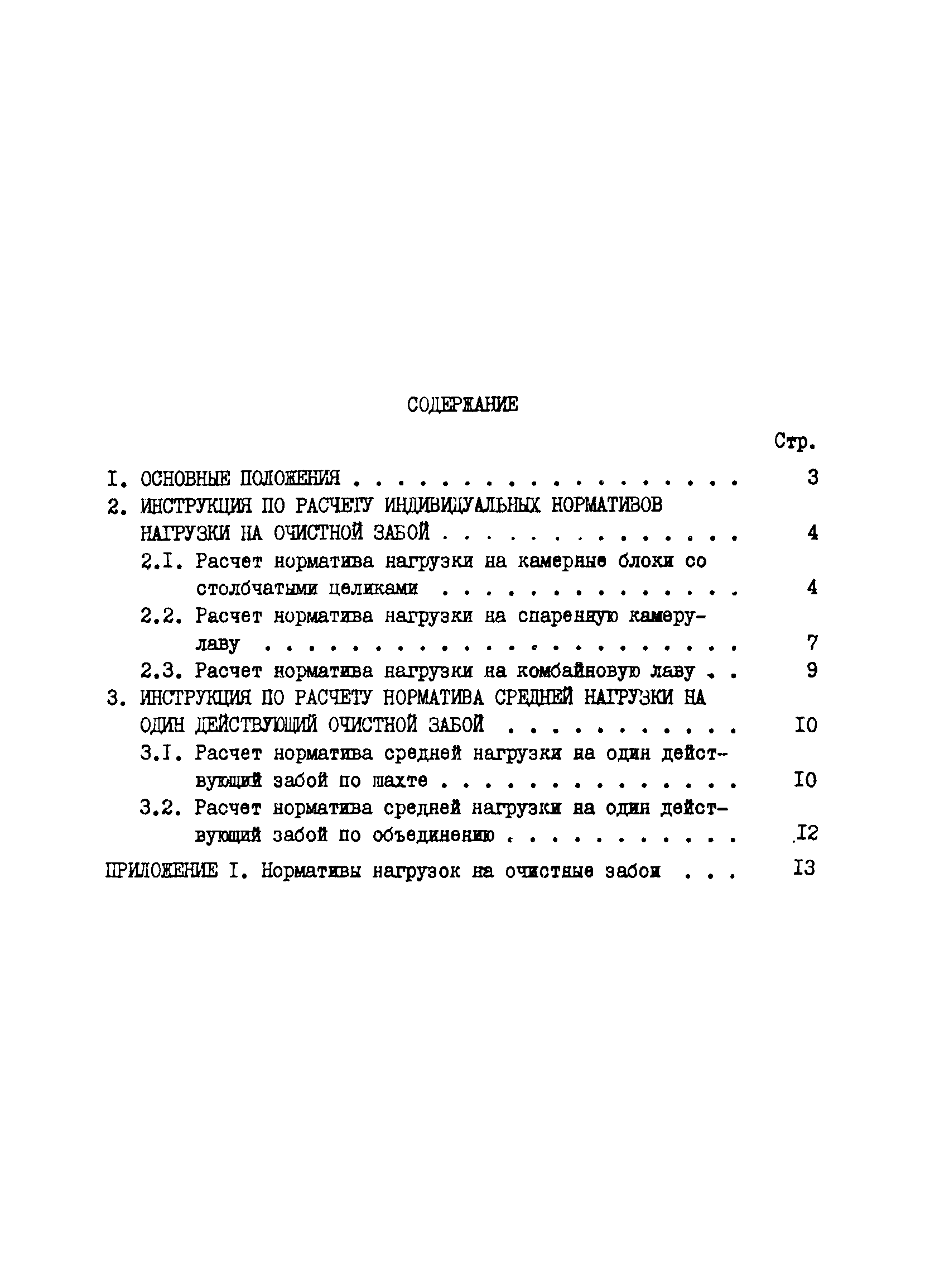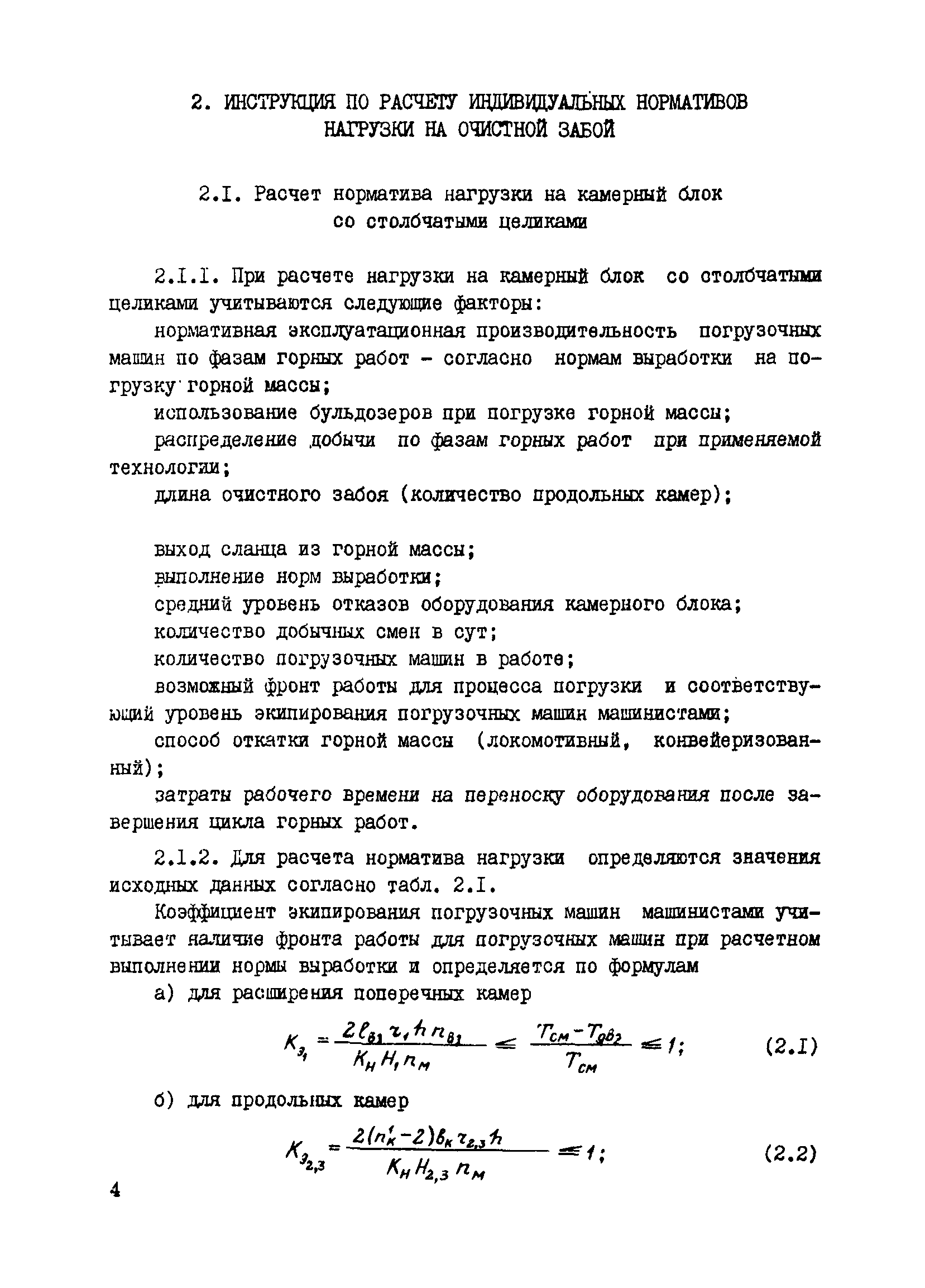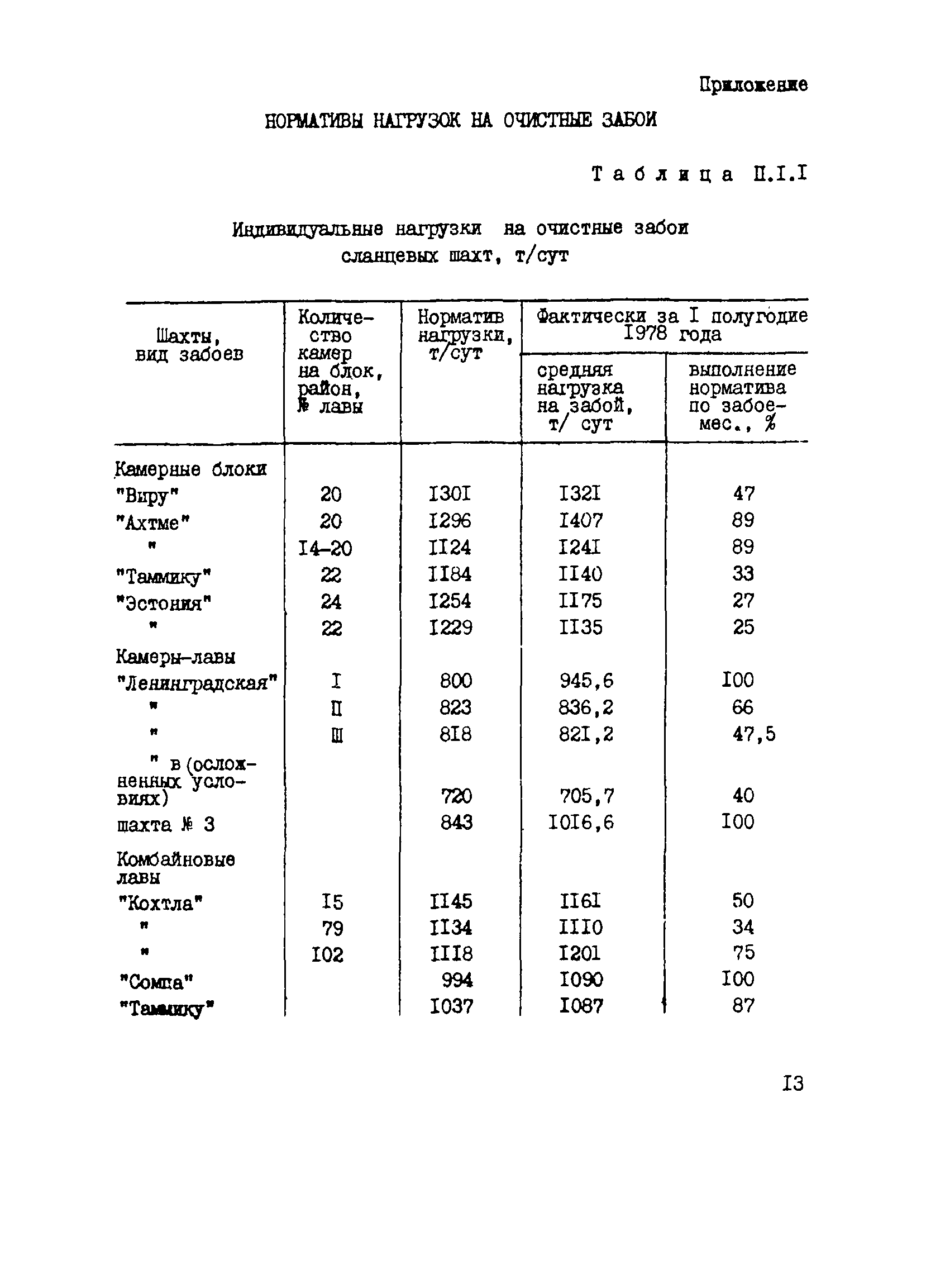 | Оглавление: | 1. Основные положения 2. Инструкция по расчету индивидуальных нормативов нагрузки на очистной забой 2.1. Расчет норматива нагрузки на камерные блоки со столбчатыми целиками 2.2. Расчет норматива нагрузки на спаренную камеру-лаву 2.3. Расчет норматива нагрузки на комбайновую лаву 3. Инструкция по расчету норматива средней нагрузки на один действующий очистной забой 3.1. Расчет норматива средней нагрузки на один действующий забой по шахте 3.2. Расчет норматива средней нагрузки на один действующий забой по объединению Приложение 1. Нормативы нагрузок на очистные забои |