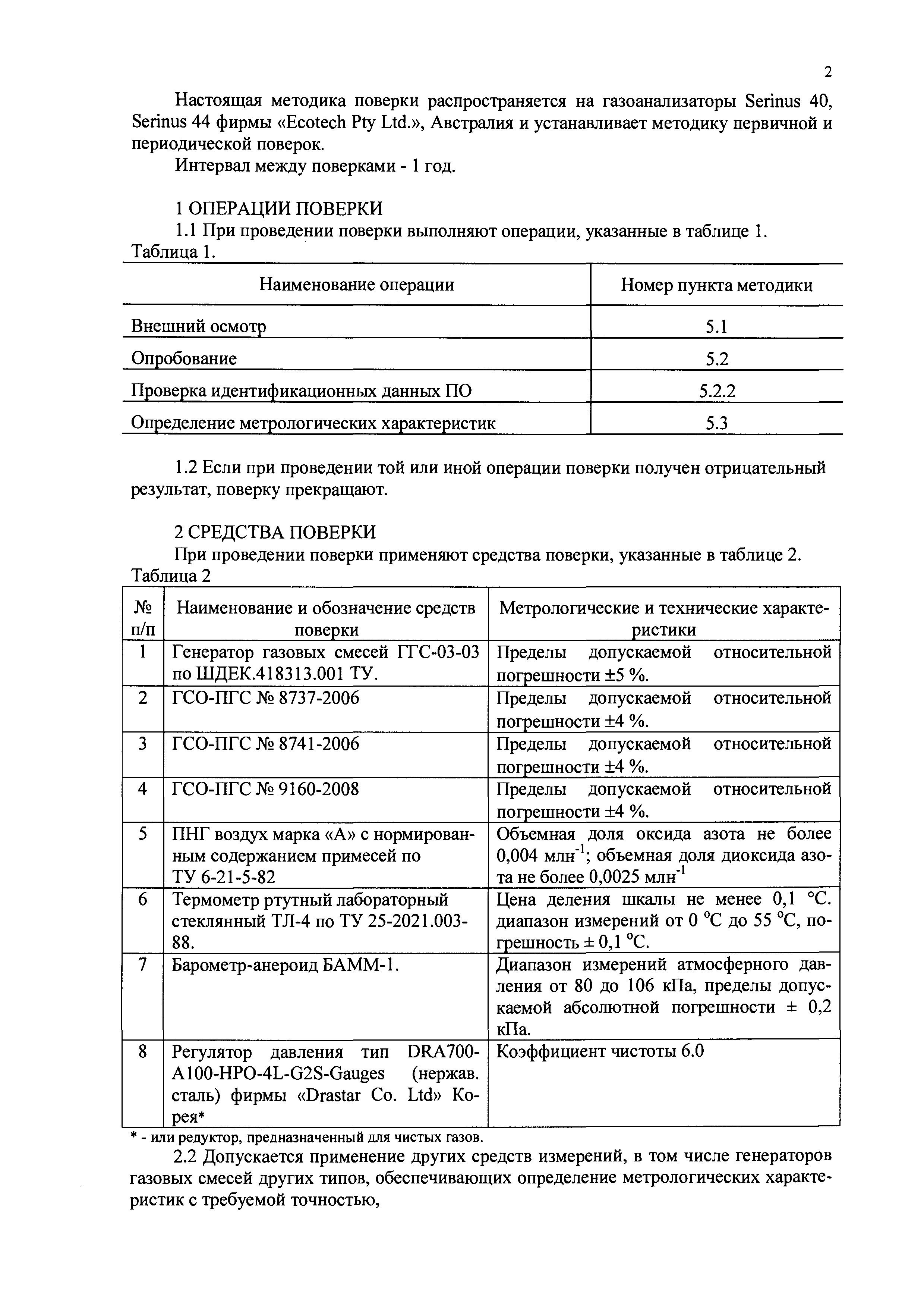 Инструкция. Газоанализаторы Serinus 40, Serinus 44. Методика поверки| Статус: | действует | | Название рус.: | Инструкция. Газоанализаторы Serinus 40, Serinus 44. Методика поверки | | Дата добавления в базу: | 01.02.2020 | | Дата актуализации: | 01.01.2021 | | Область применения: | Методика поверки распространяется на газоанализаторы Serinus 40, Serinus 44 фирмы "Ecotech Pty Ltd.", Австралия и устанавливает методику первичной и периодической поверок. | | Оглавление: | 1 Операции поверки 2 Средства поверки 3 Требования безопасности 4 Условия поверки и подготовка к ней 5 Проведение поверки 6 Оформление результатов поверки | | Разработан: | ФГУП ВНИИМС