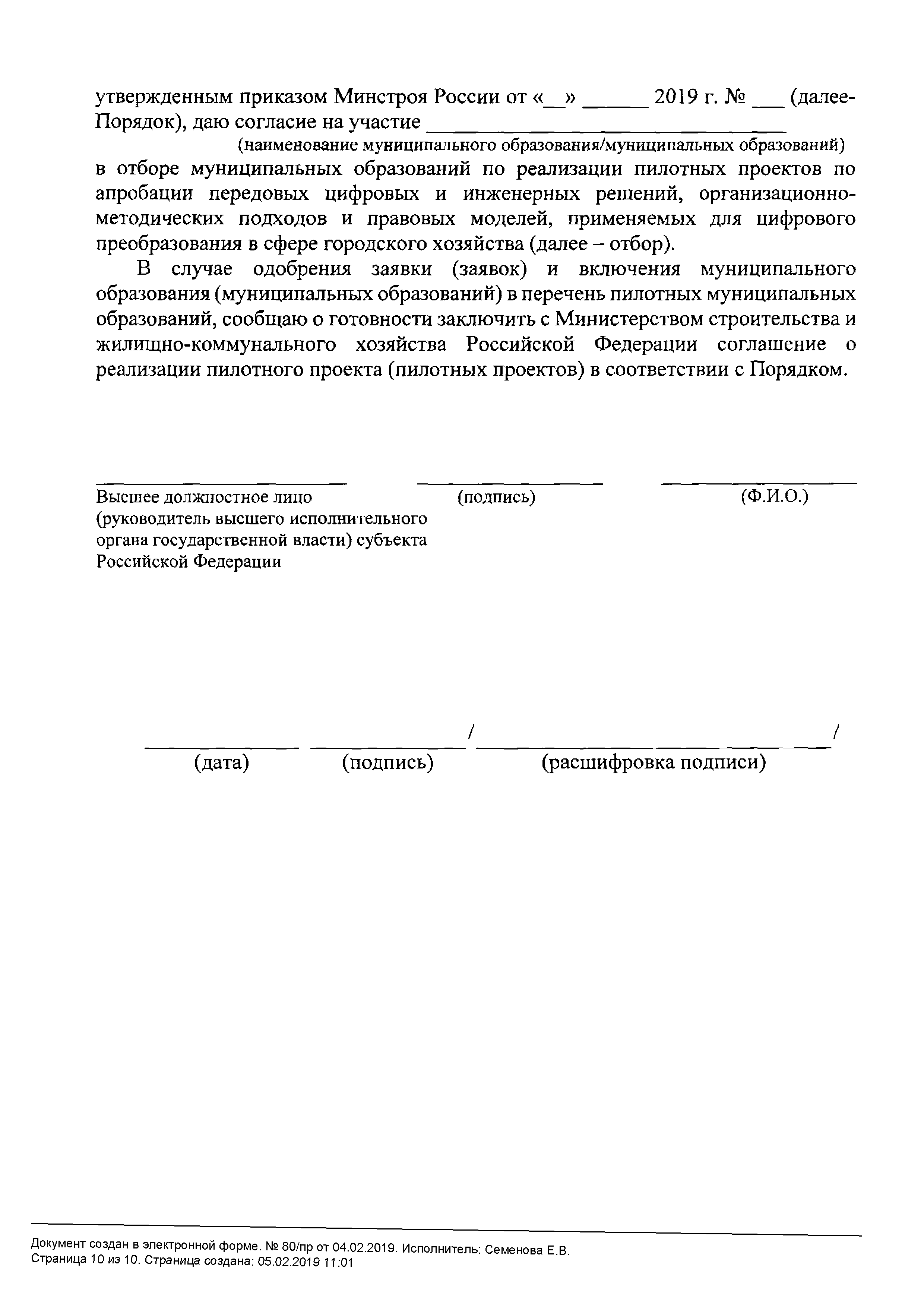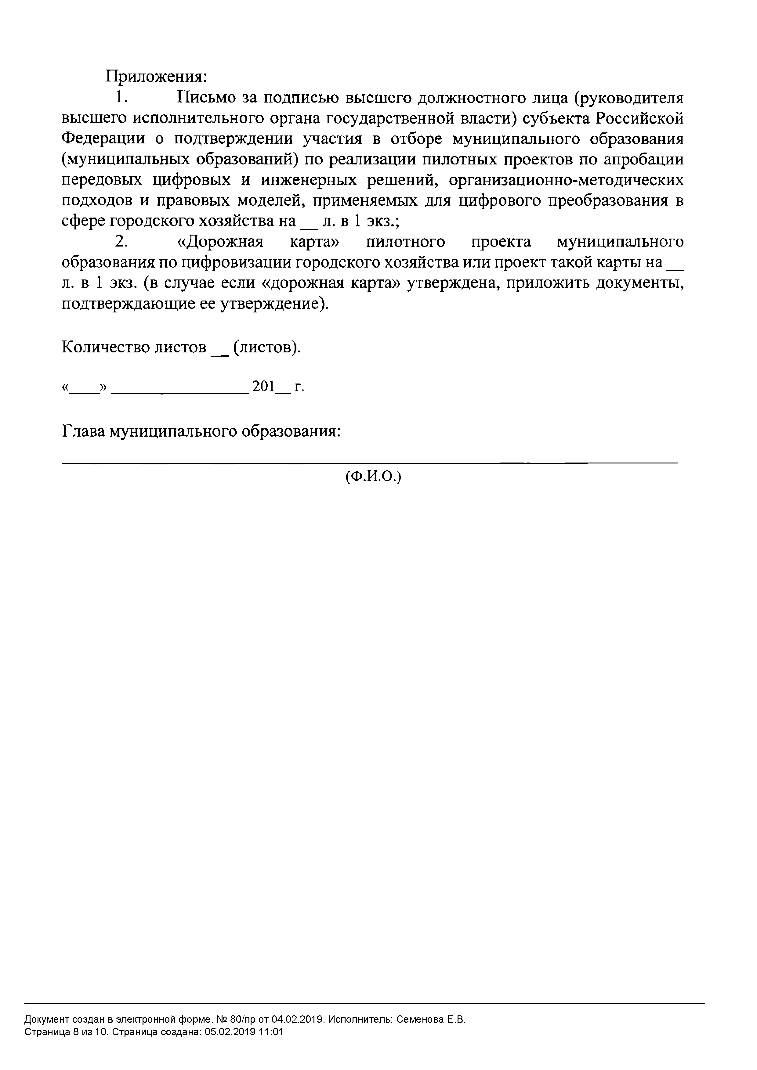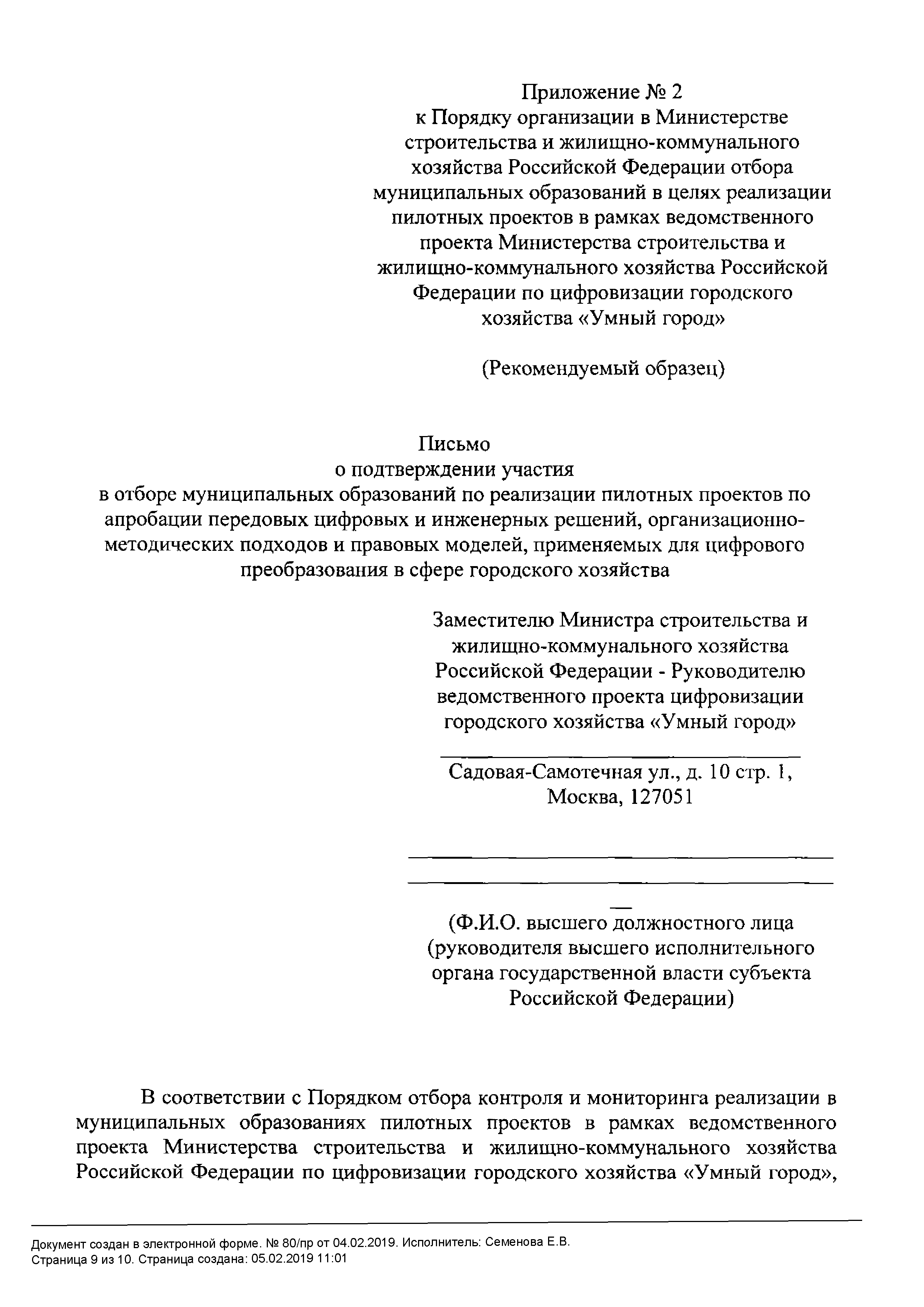 | Оглавление: | I. Общие положения II. Порядок отбора пилотных муниципальных образований Приложение № 1. Рекомендуемый образец заявки для участия в отборе муниципальных образований по реализации пилотных проектов по апробации передовых цифровых и инженерных решений, организационно-методических подходов и правовых моделей, применяемых для цифрового преобразования в сфере городского хозяйства Приложение № 2. Рекомендуемый образец письма о подтверждении участия в отборе муниципальных образований по реализации пилотных проектов по апробации передовых цифровых и инженерных решений, организационно-методических подходов и правовых моделей, применяемых для цифрового преобразования в сфере городского хозяйства |