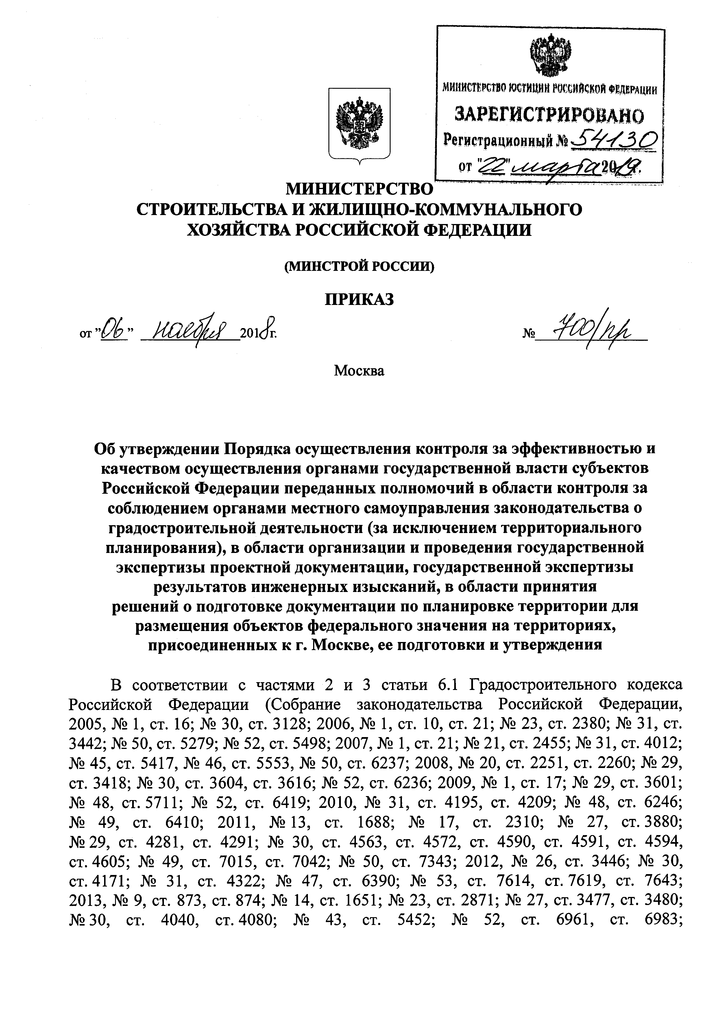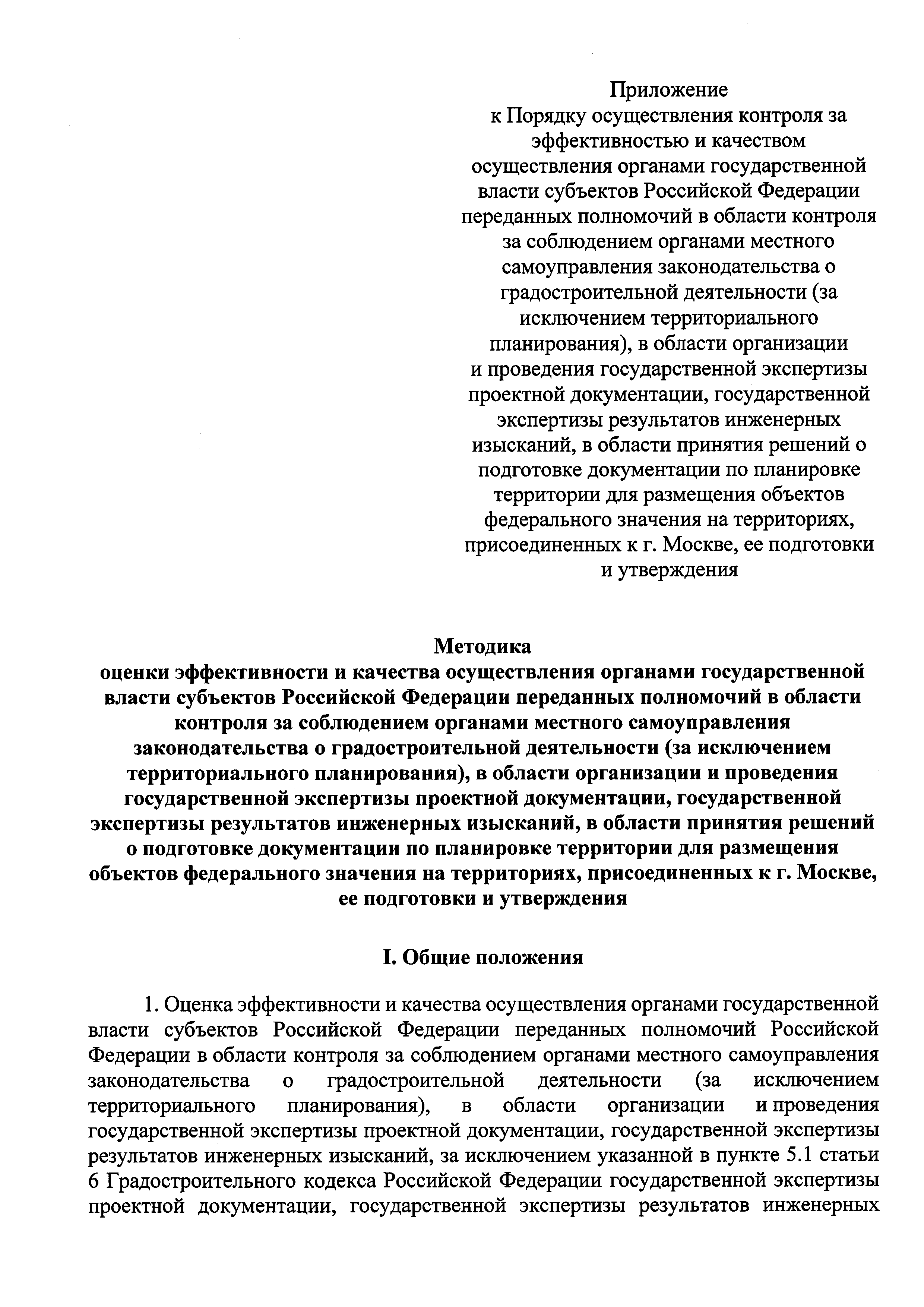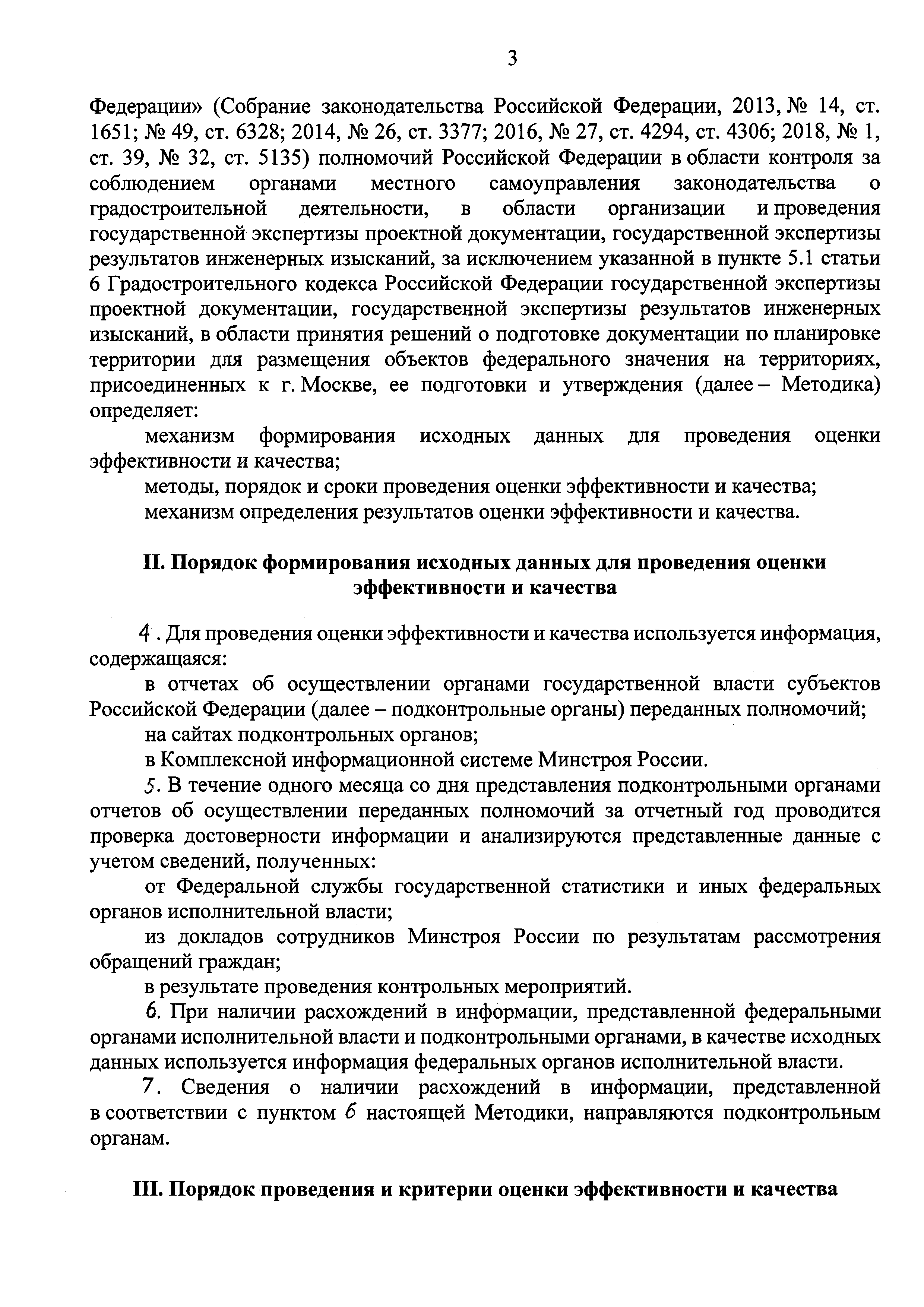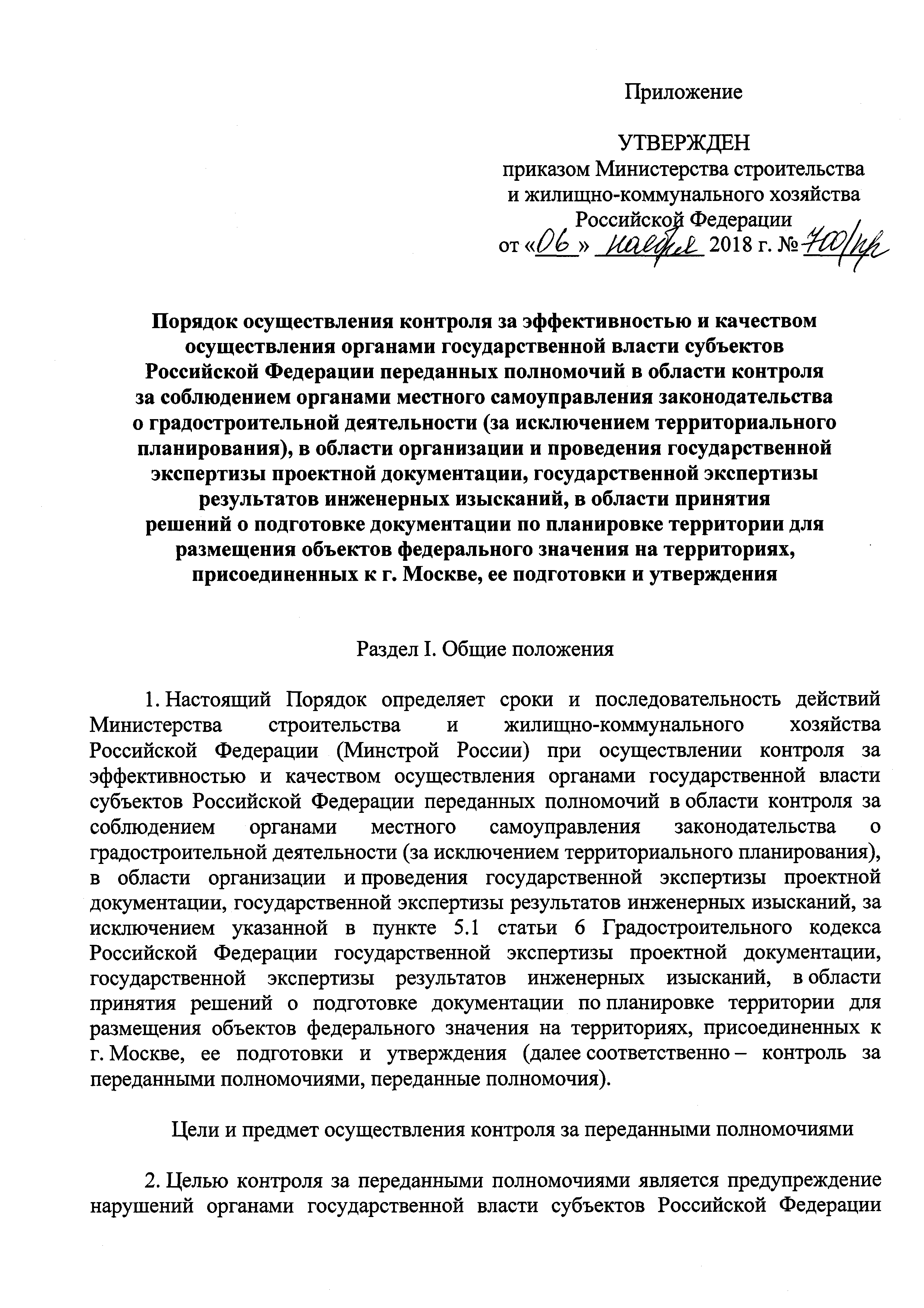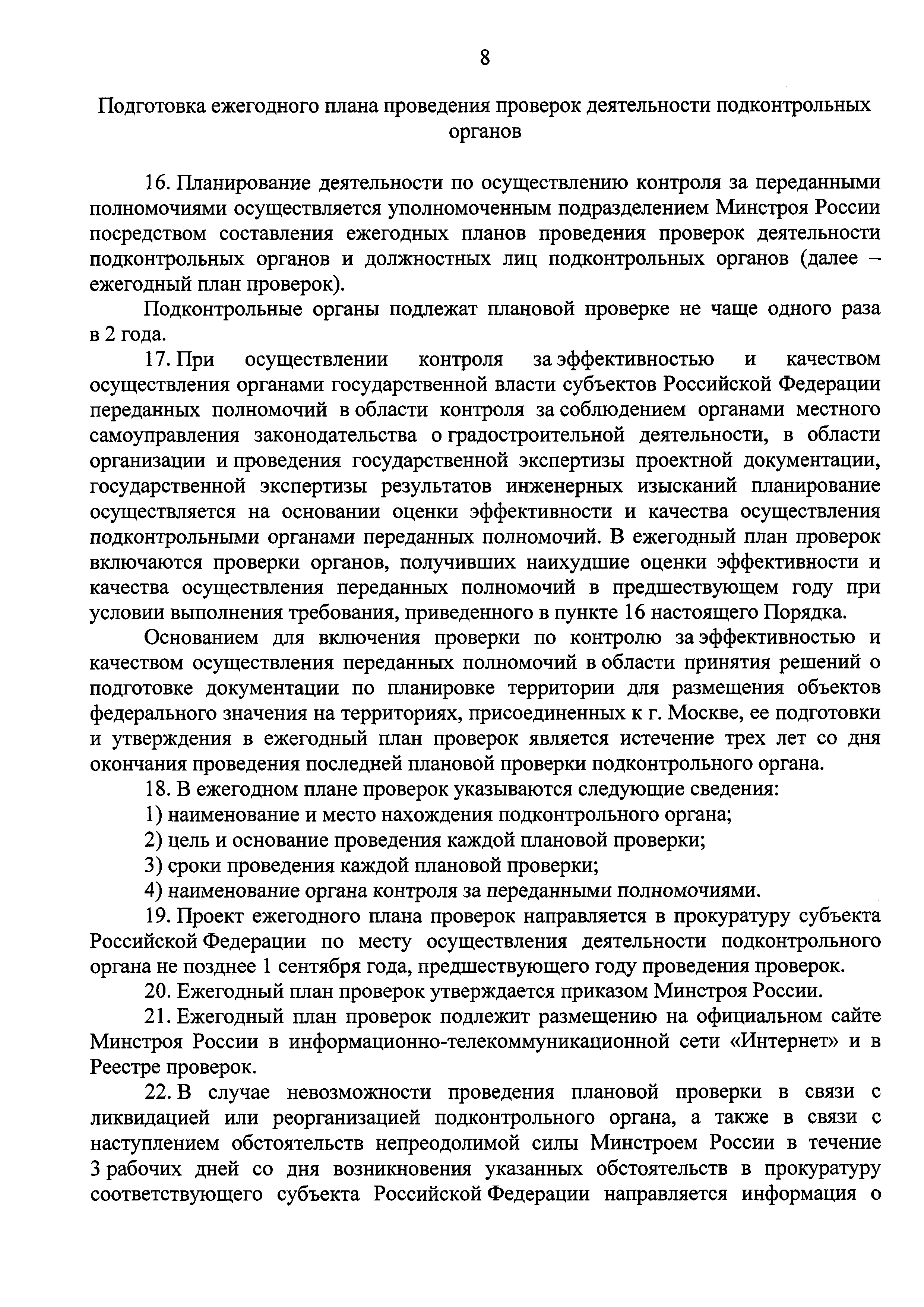 Порядок осуществления контроля за эффективностью и качеством осуществления органами государственной власти субъектов Российской Федерации переданных полномочий в области контроля за соблюдением органами местного самоуправления законодательства о градостроительной деятельности (за исключением территориального планирования), в области организации и проведения государственной экспертизы проектной документации, государственной экспертизы результатов инженерных изысканий, в области принятия решений о подготовке документации по планировке территории для размещения объектов федерального значения на территориях, присоединенных к г. Москве, ее подготовки и утверждения| Статус: | действует | | Название рус.: | Порядок осуществления контроля за эффективностью и качеством осуществления органами государственной власти субъектов Российской Федерации переданных полномочий в области контроля за соблюдением органами местного самоуправления законодательства о градостроительной деятельности (за исключением территориального планирования), в области организации и проведения государственной экспертизы проектной документации, государственной экспертизы результатов инженерных изысканий, в области принятия решений о подготовке документации по планировке территории для размещения объектов федерального значения на территориях, присоединенных к г. Москве, ее подготовки и утверждения | | Дата добавления в базу: | 01.02.2020 | | Дата актуализации: | 01.01.2021 | | Дата введения: | 05.04.2019 | | Оглавление: | Раздел I. Общие положения Раздел II. Права и обязанности должностных лиц Минстроя России и органов государственной власти субъектов Российской Федерации при осуществлении контроля за переданными полномочиями Раздел III. Состав, последовательность и сроки выполнения административных процедур, требования к порядку их выполнения Раздел IV. Порядок внутреннего контроля за осуществлением контроля за переданными полномочиями и административного обжалования результатов контроля Приложение. Методика оценки эффективности и качества осуществления органами государственной власти субъектов Российской Федерации переданных полномочий в области контроля за соблюдениями органами местного самоуправления законодательства о градостроительной деятельности (за исключением территориального планирования), в области организации и проведения государственной экспертизы проектной документации, государственной экспертизы результатов инженерных изысканий, в области принятия решений о подготовке документации по планировке территории для размещения объектов федерального значения на территориях, присоединенных к г. Москве, ее подготовки и утверждения I. Общие положения II. Порядок формирования исходных данных для проведения оценки эффективности и качества III. Порядок проведения и критерии оценки эффективности качества IV. Оформление результатов оценки эффективности и качества | | Утверждён: | 06.11.2018 Министерство строительства и жилищно-коммунального хозяйства Российской Федерации (700/пр) Министерство строительства и жилищно-коммунального хозяйства Российской Федерации (Минстрой России)