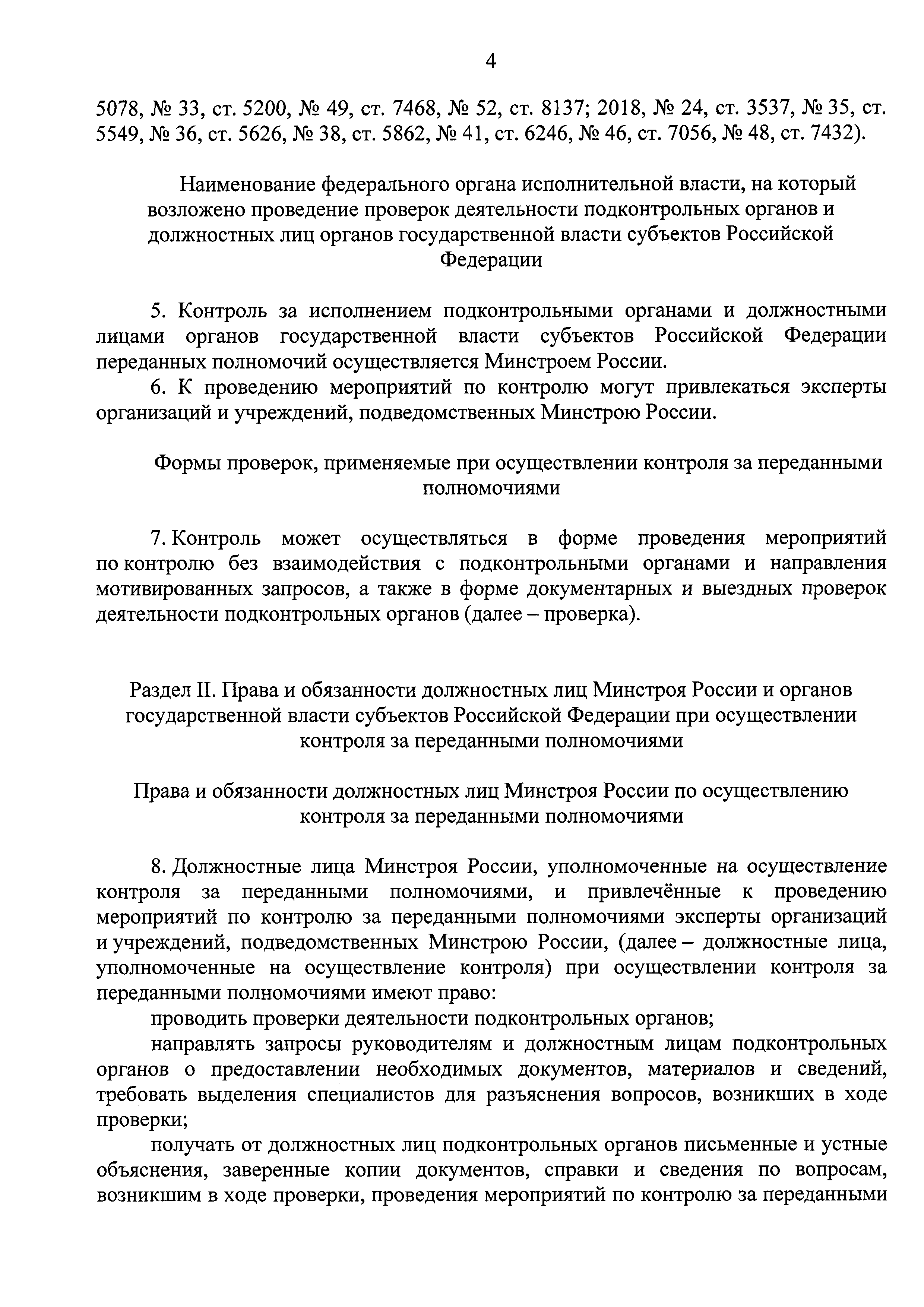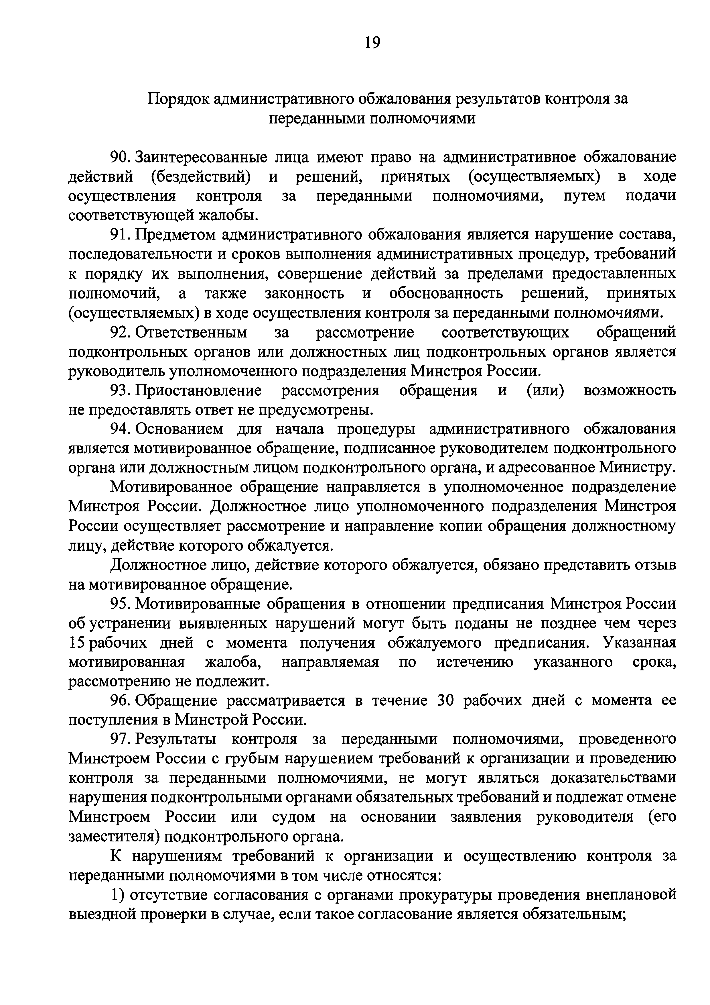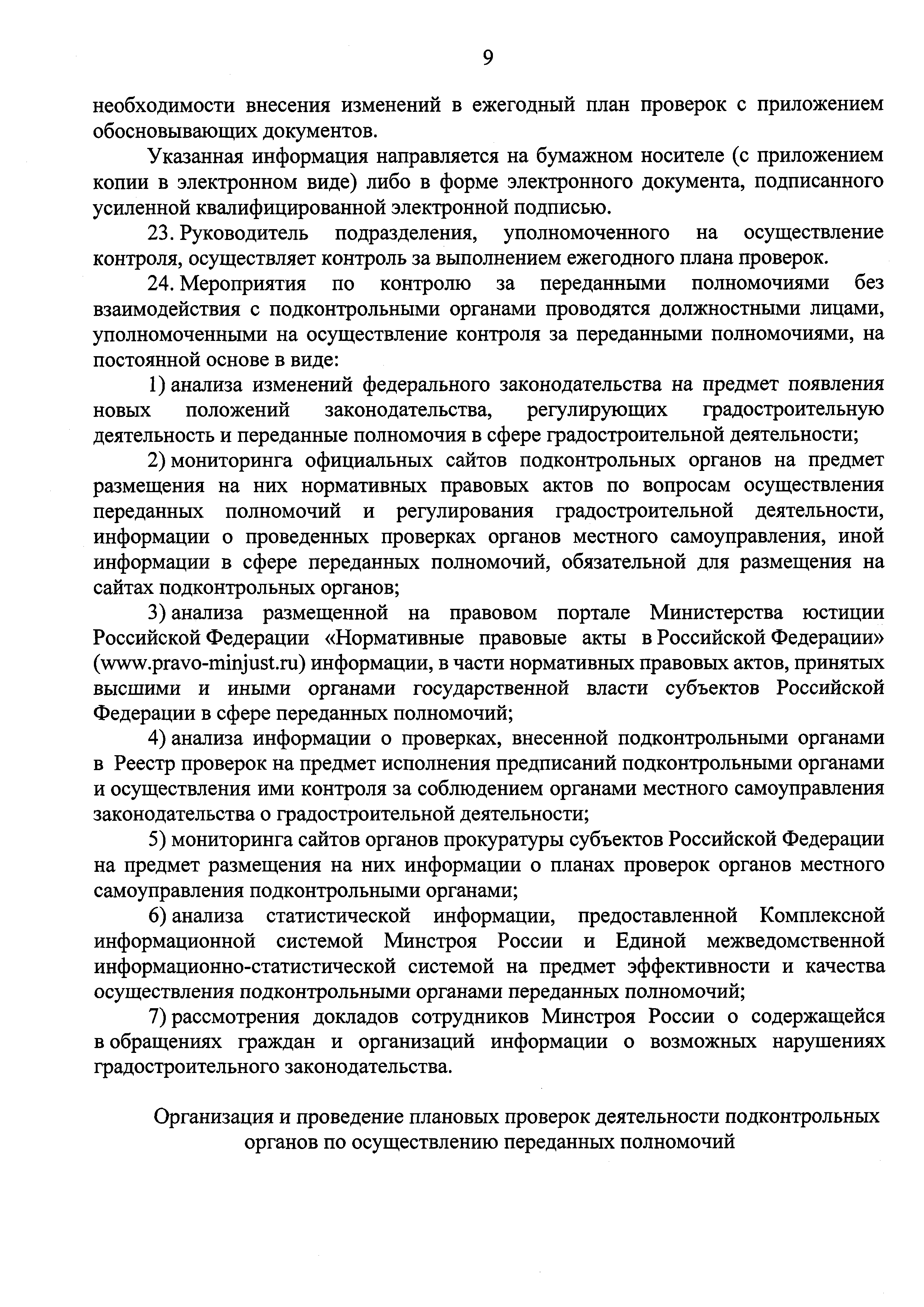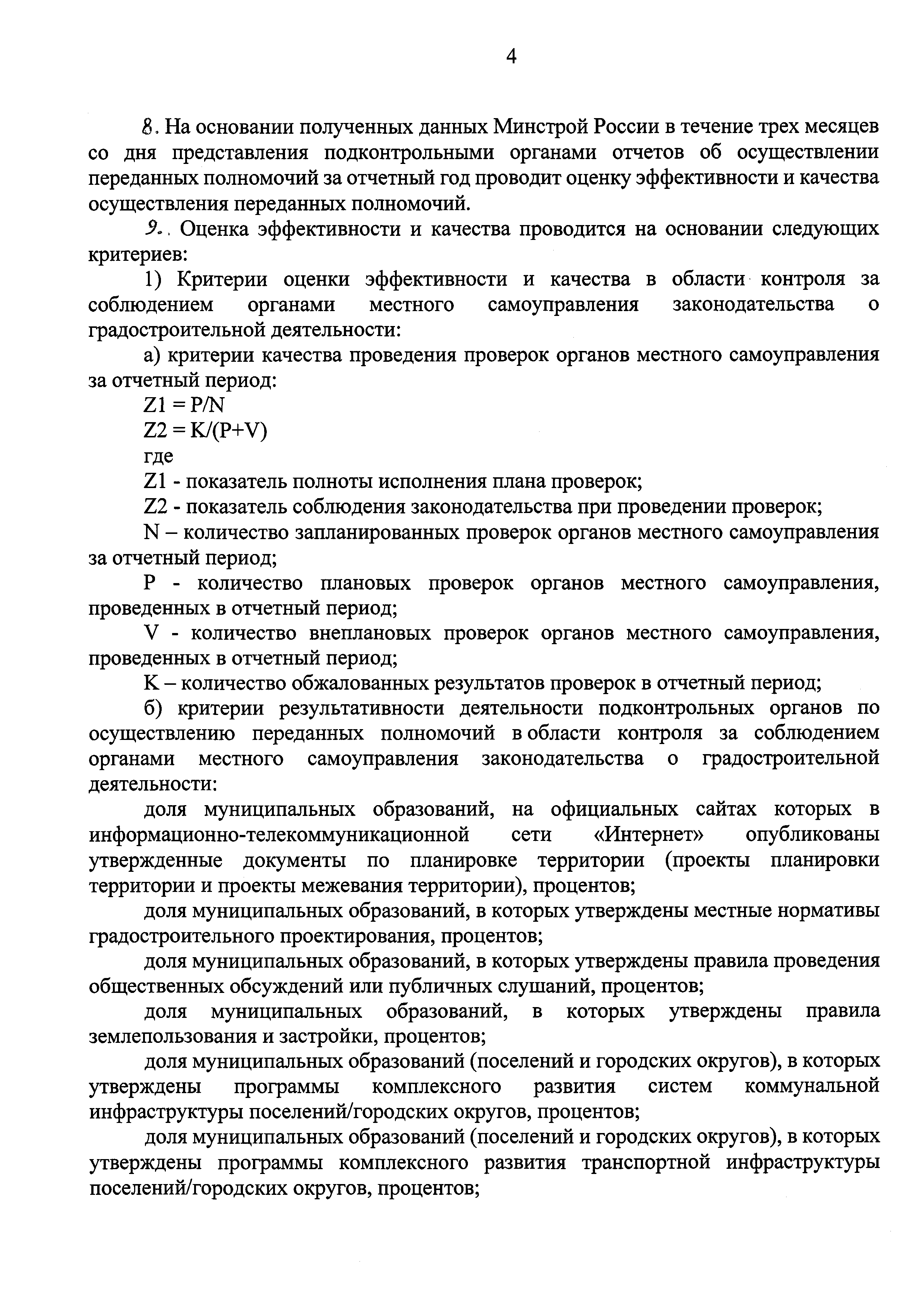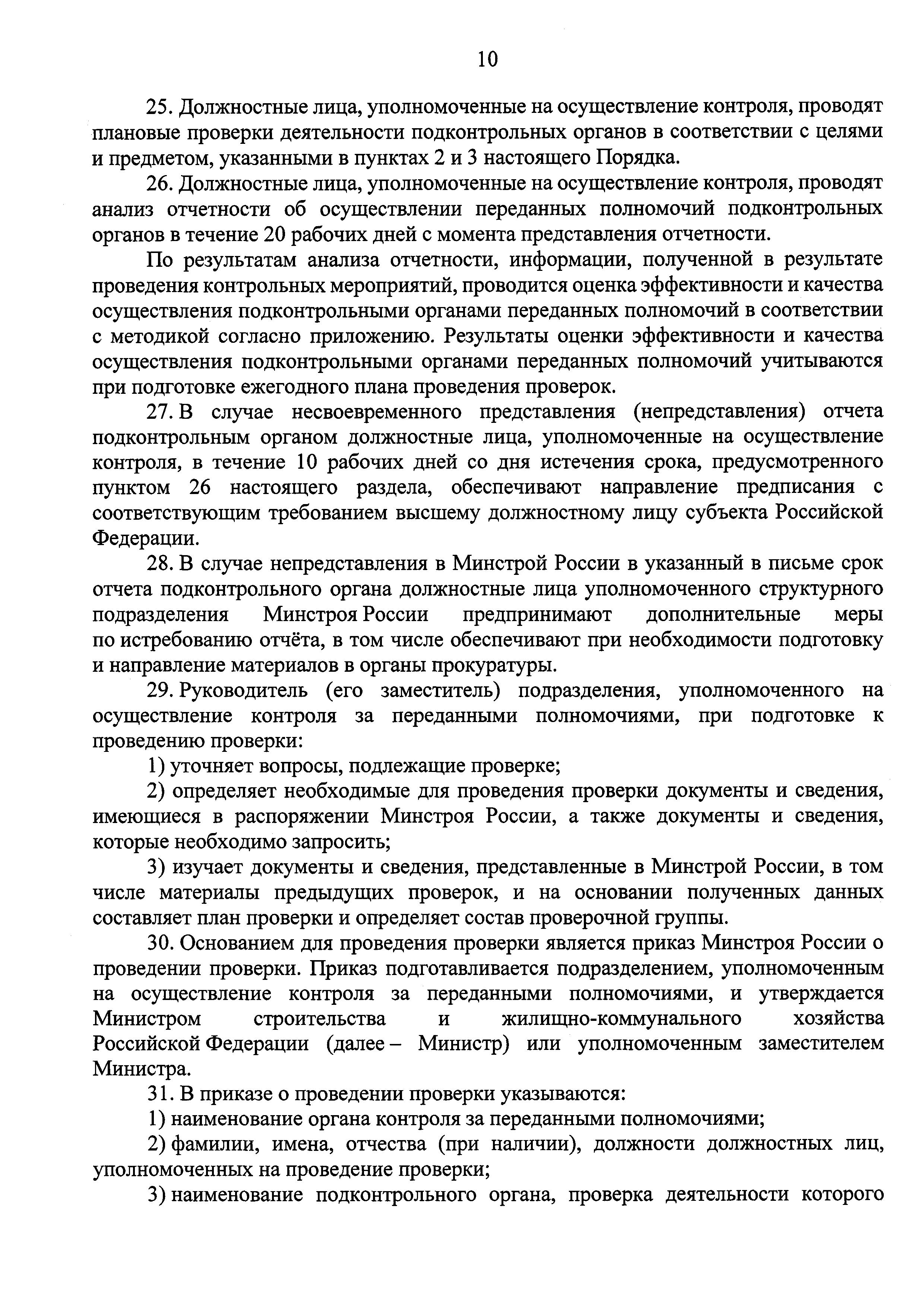 Порядок осуществления контроля за эффективностью и качеством осуществления органами государственной власти субъектов Российской Федерации переданных полномочий в области контроля за соблюдением органами местного самоуправления законодательства о градостроительной деятельности (за исключением территориального планирования), в области организации и проведения государственной экспертизы проектной документации, государственной экспертизы результатов инженерных изысканий, в области принятия решений о подготовке документации по планировке территории для размещения объектов федерального значения на территориях, присоединенных к г. Москве, ее подготовки и утверждения| Статус: | действует | | Название рус.: | Порядок осуществления контроля за эффективностью и качеством осуществления органами государственной власти субъектов Российской Федерации переданных полномочий в области контроля за соблюдением органами местного самоуправления законодательства о градостроительной деятельности (за исключением территориального планирования), в области организации и проведения государственной экспертизы проектной документации, государственной экспертизы результатов инженерных изысканий, в области принятия решений о подготовке документации по планировке территории для размещения объектов федерального значения на территориях, присоединенных к г. Москве, ее подготовки и утверждения | | Дата добавления в базу: | 01.02.2020 | | Дата актуализации: | 01.01.2021 | | Дата введения: | 05.04.2019 | | Оглавление: | Раздел I. Общие положения Раздел II. Права и обязанности должностных лиц Минстроя России и органов государственной власти субъектов Российской Федерации при осуществлении контроля за переданными полномочиями Раздел III. Состав, последовательность и сроки выполнения административных процедур, требования к порядку их выполнения Раздел IV. Порядок внутреннего контроля за осуществлением контроля за переданными полномочиями и административного обжалования результатов контроля Приложение. Методика оценки эффективности и качества осуществления органами государственной власти субъектов Российской Федерации переданных полномочий в области контроля за соблюдениями органами местного самоуправления законодательства о градостроительной деятельности (за исключением территориального планирования), в области организации и проведения государственной экспертизы проектной документации, государственной экспертизы результатов инженерных изысканий, в области принятия решений о подготовке документации по планировке территории для размещения объектов федерального значения на территориях, присоединенных к г. Москве, ее подготовки и утверждения I. Общие положения II. Порядок формирования исходных данных для проведения оценки эффективности и качества III. Порядок проведения и критерии оценки эффективности качества IV. Оформление результатов оценки эффективности и качества | | Утверждён: | 06.11.2018 Министерство строительства и жилищно-коммунального хозяйства Российской Федерации (700/пр) Министерство строительства и жилищно-коммунального хозяйства Российской Федерации (Минстрой России)