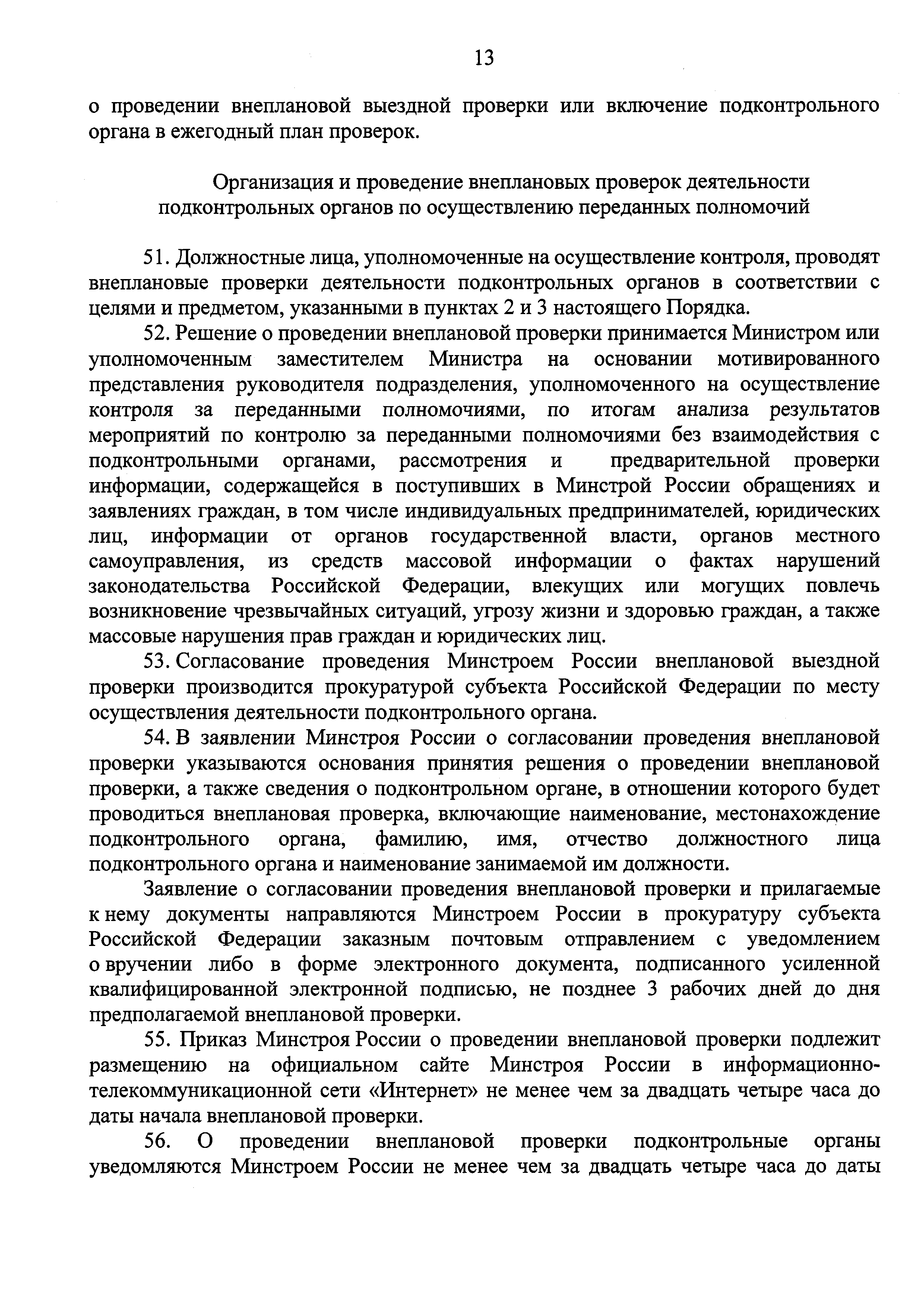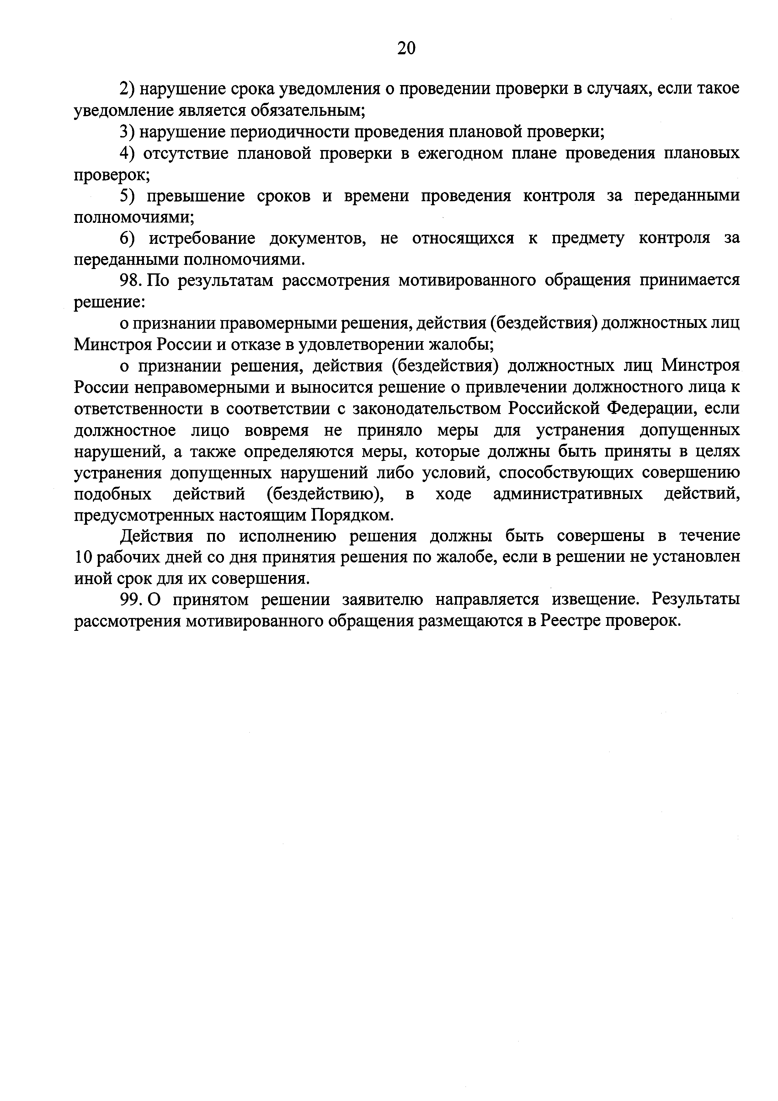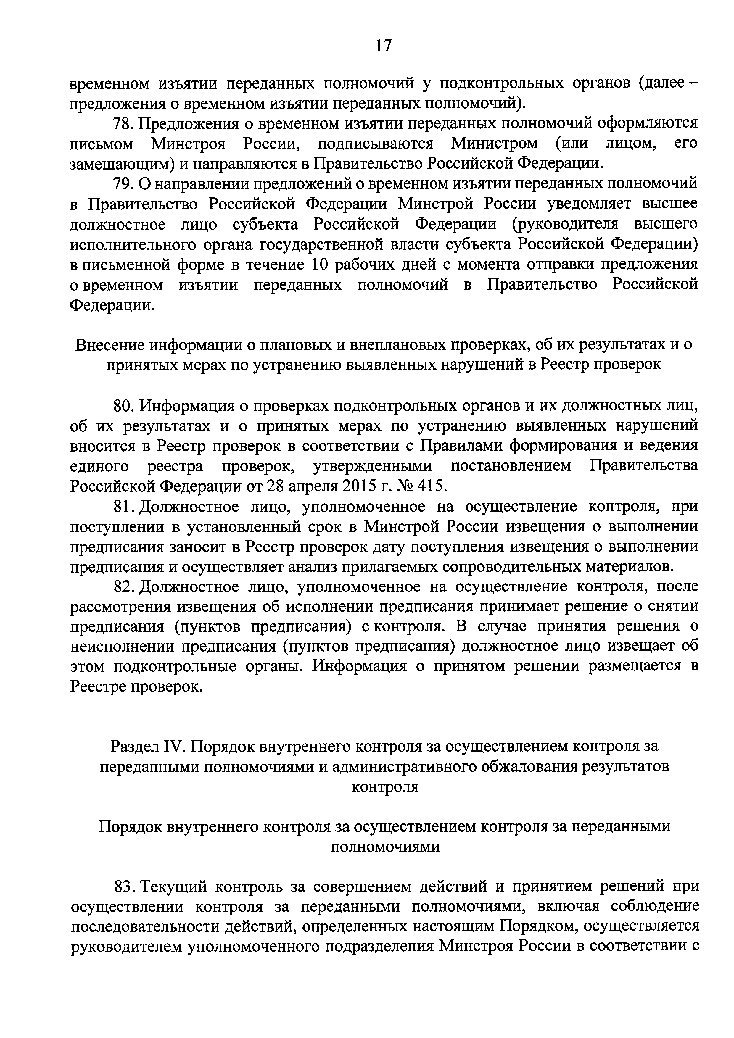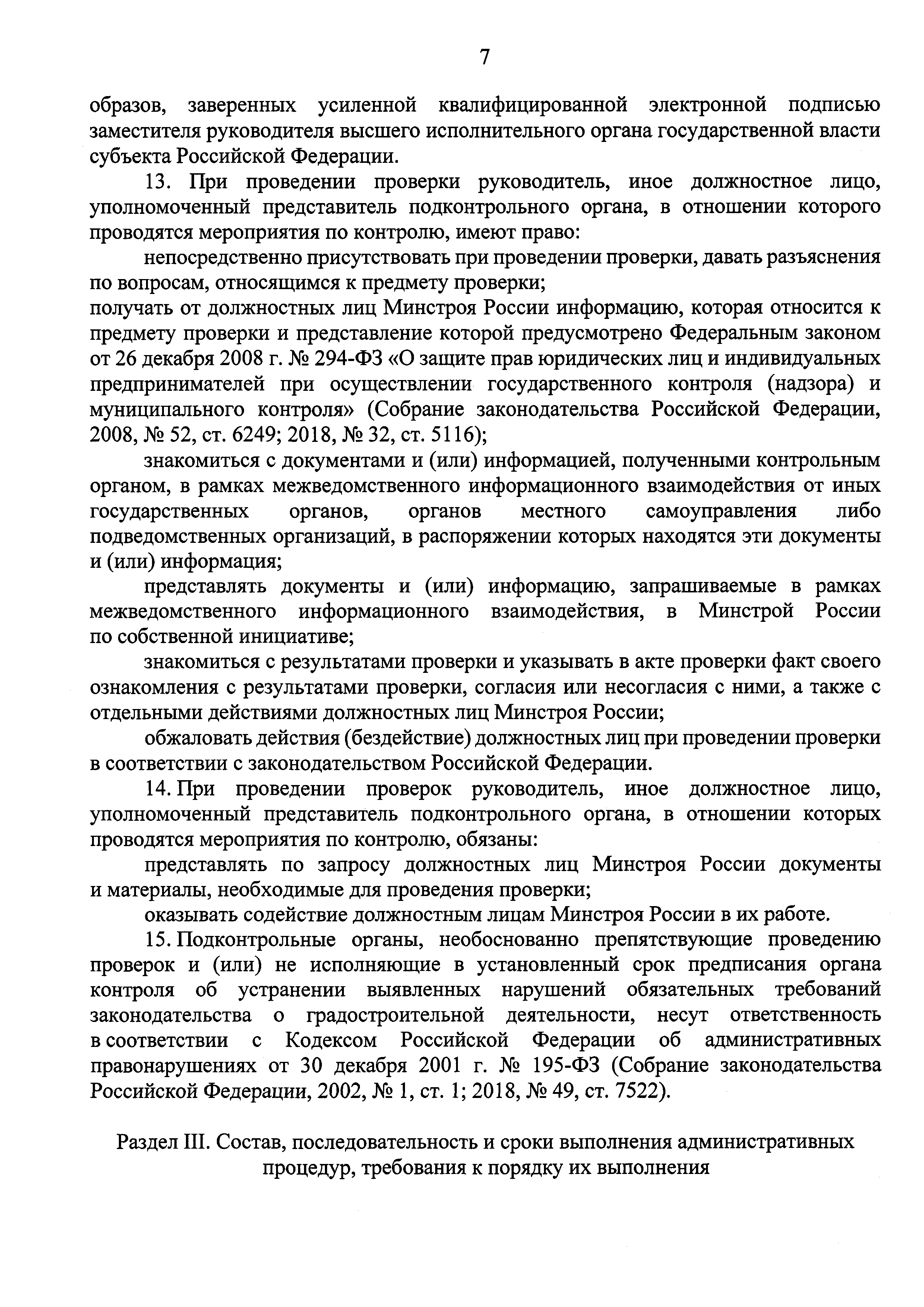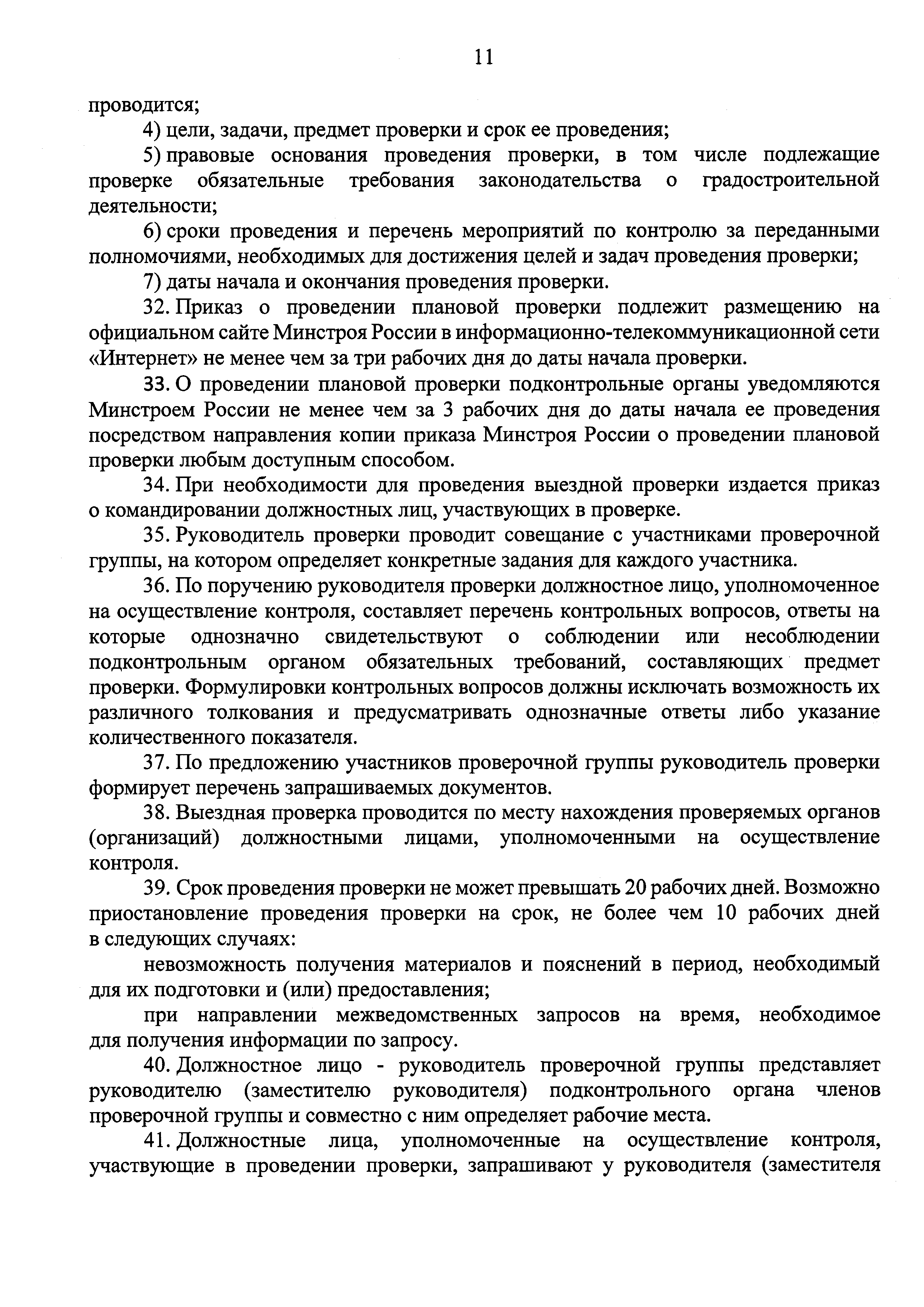 Порядок осуществления контроля за эффективностью и качеством осуществления органами государственной власти субъектов Российской Федерации переданных полномочий в области контроля за соблюдением органами местного самоуправления законодательства о градостроительной деятельности (за исключением территориального планирования), в области организации и проведения государственной экспертизы проектной документации, государственной экспертизы результатов инженерных изысканий, в области принятия решений о подготовке документации по планировке территории для размещения объектов федерального значения на территориях, присоединенных к г. Москве, ее подготовки и утверждения| Статус: | действует | | Название рус.: | Порядок осуществления контроля за эффективностью и качеством осуществления органами государственной власти субъектов Российской Федерации переданных полномочий в области контроля за соблюдением органами местного самоуправления законодательства о градостроительной деятельности (за исключением территориального планирования), в области организации и проведения государственной экспертизы проектной документации, государственной экспертизы результатов инженерных изысканий, в области принятия решений о подготовке документации по планировке территории для размещения объектов федерального значения на территориях, присоединенных к г. Москве, ее подготовки и утверждения | | Дата добавления в базу: | 01.02.2020 | | Дата актуализации: | 01.01.2021 | | Дата введения: | 05.04.2019 | | Оглавление: | Раздел I. Общие положения Раздел II. Права и обязанности должностных лиц Минстроя России и органов государственной власти субъектов Российской Федерации при осуществлении контроля за переданными полномочиями Раздел III. Состав, последовательность и сроки выполнения административных процедур, требования к порядку их выполнения Раздел IV. Порядок внутреннего контроля за осуществлением контроля за переданными полномочиями и административного обжалования результатов контроля Приложение. Методика оценки эффективности и качества осуществления органами государственной власти субъектов Российской Федерации переданных полномочий в области контроля за соблюдениями органами местного самоуправления законодательства о градостроительной деятельности (за исключением территориального планирования), в области организации и проведения государственной экспертизы проектной документации, государственной экспертизы результатов инженерных изысканий, в области принятия решений о подготовке документации по планировке территории для размещения объектов федерального значения на территориях, присоединенных к г. Москве, ее подготовки и утверждения I. Общие положения II. Порядок формирования исходных данных для проведения оценки эффективности и качества III. Порядок проведения и критерии оценки эффективности качества IV. Оформление результатов оценки эффективности и качества | | Утверждён: | 06.11.2018 Министерство строительства и жилищно-коммунального хозяйства Российской Федерации (700/пр) Министерство строительства и жилищно-коммунального хозяйства Российской Федерации (Минстрой России)