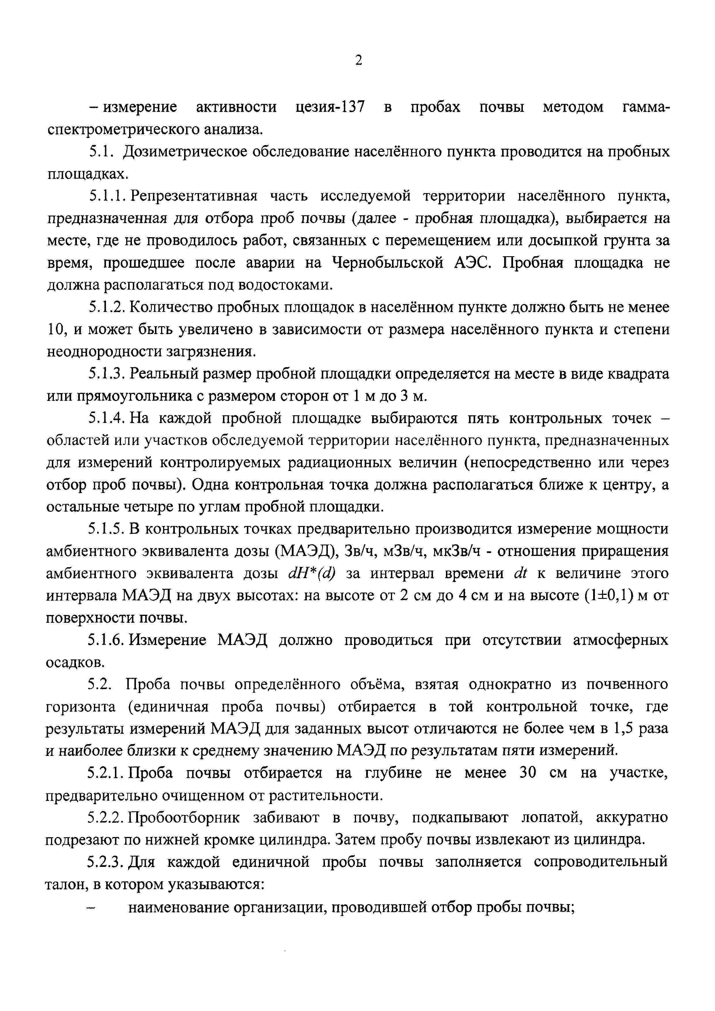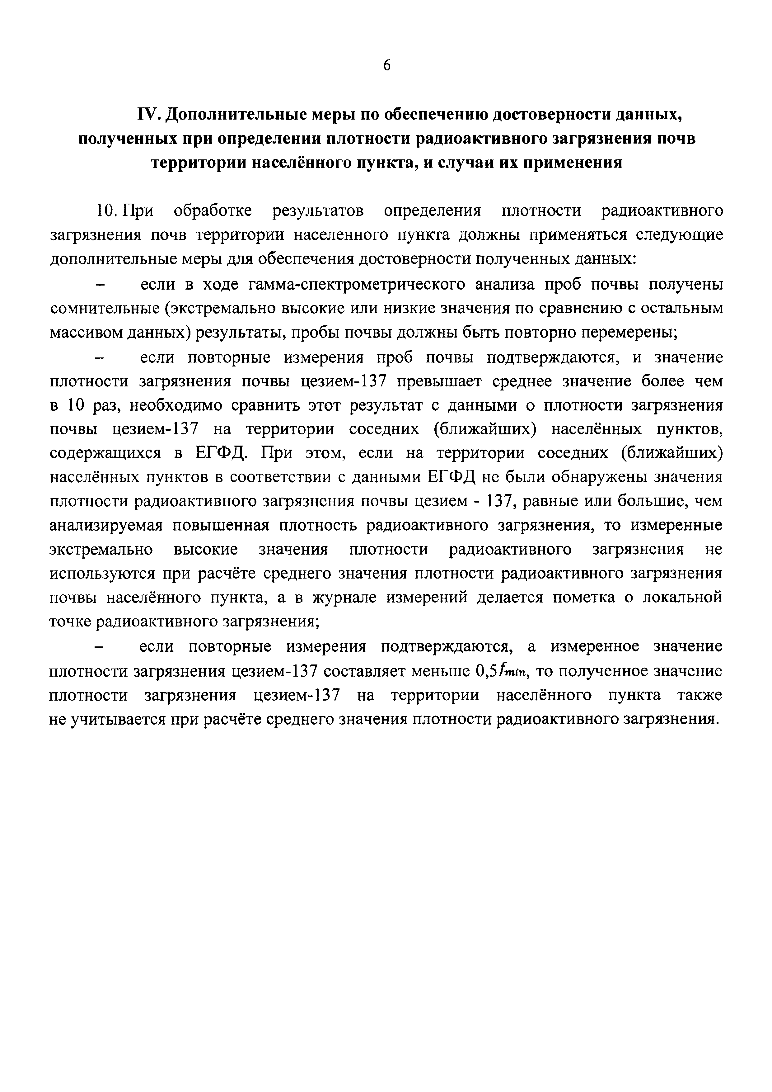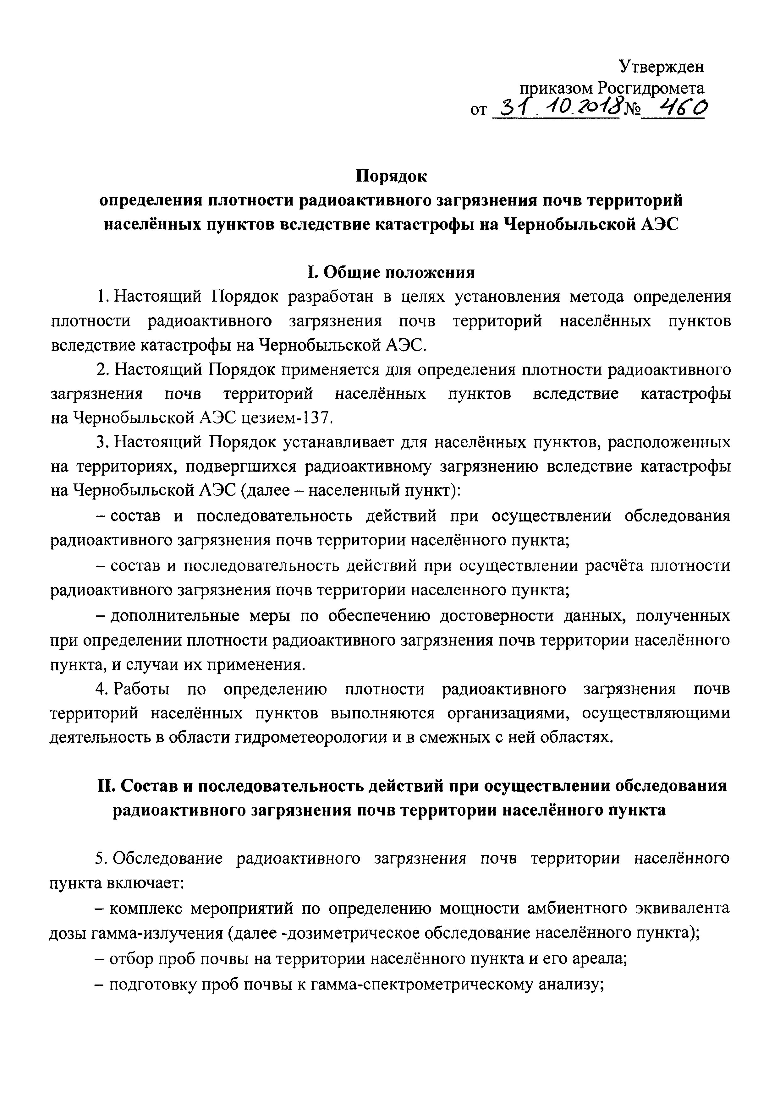 | Оглавление: | I Общие положения II Состав и последовательность действий при осуществлении обследования радиоактивного загрязнения почв территории населённого пункта III Состав и последовательность действий при осуществлении расчёта плотности радиоактивного загрязнения почв территории населённого пункта IV Дополнительные меры по обеспечению достоверности данных, полученных при определении плотности радиоактивного загрязнения почв территории населённого пункта, и случаи их применения |