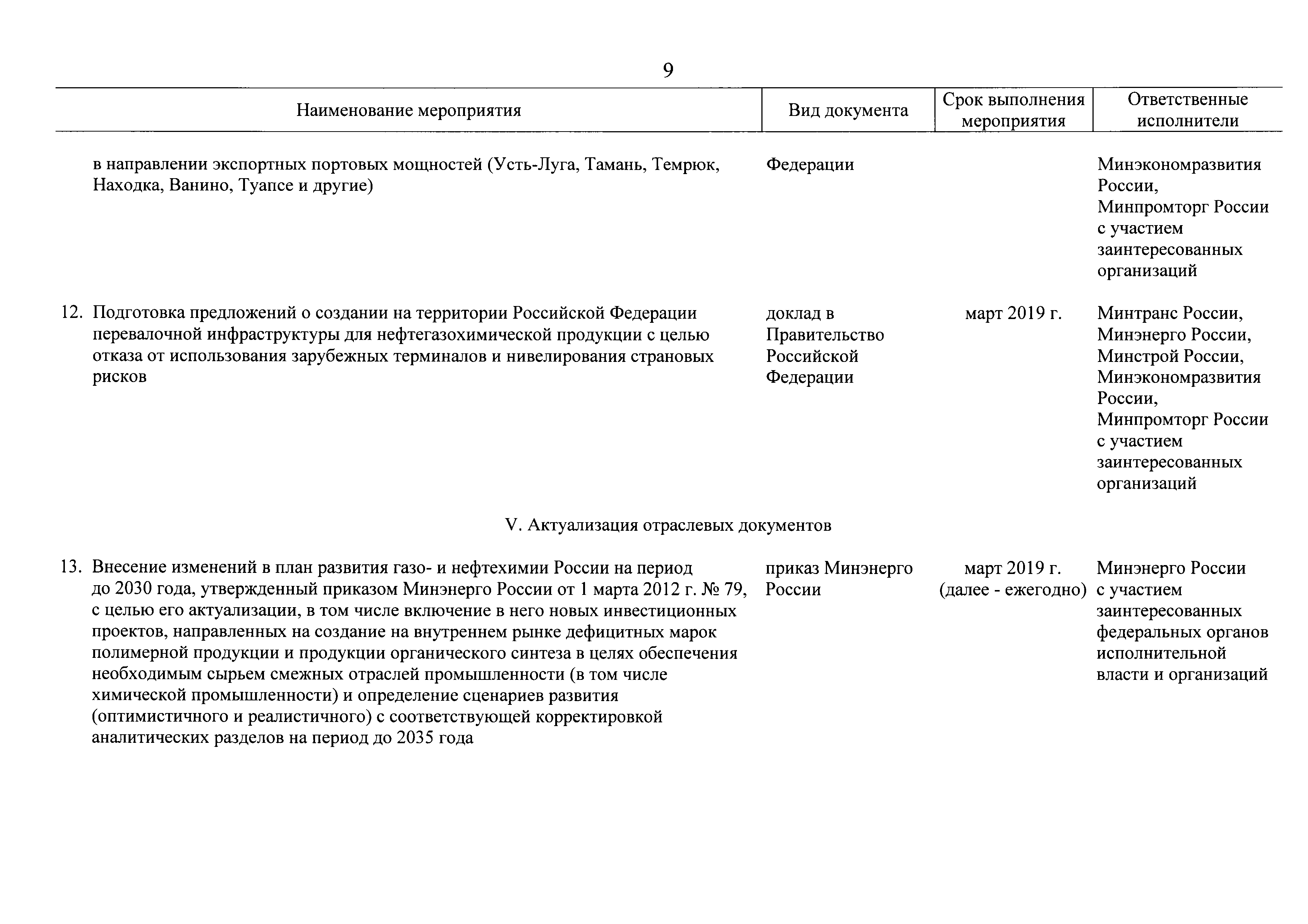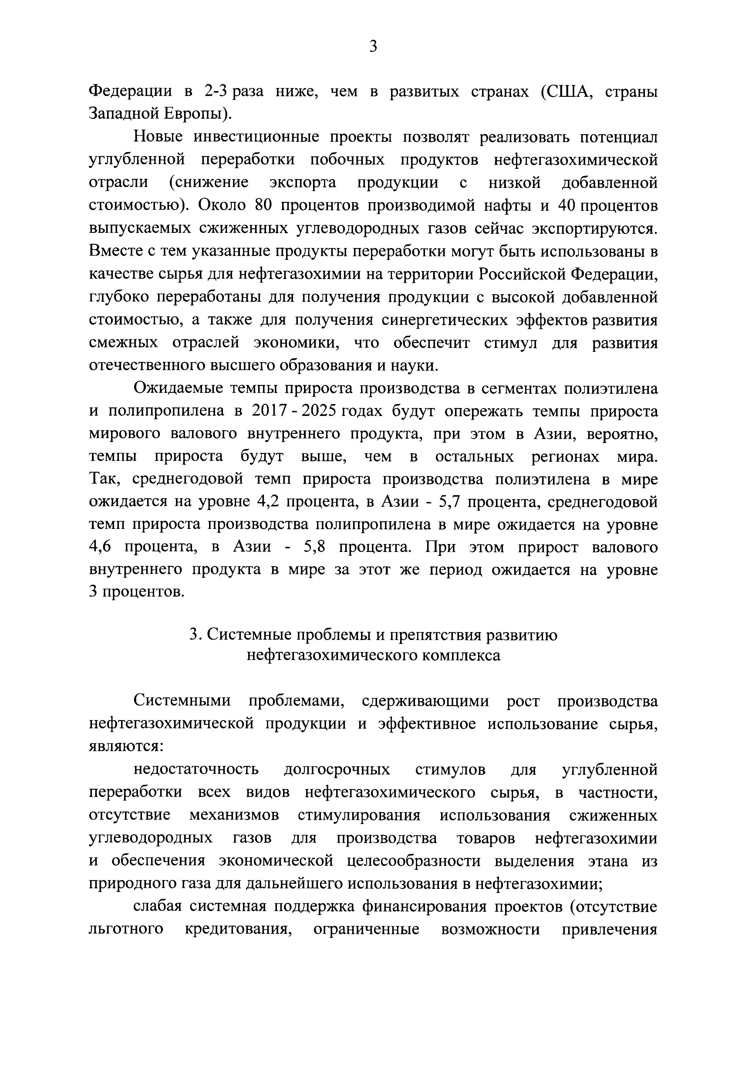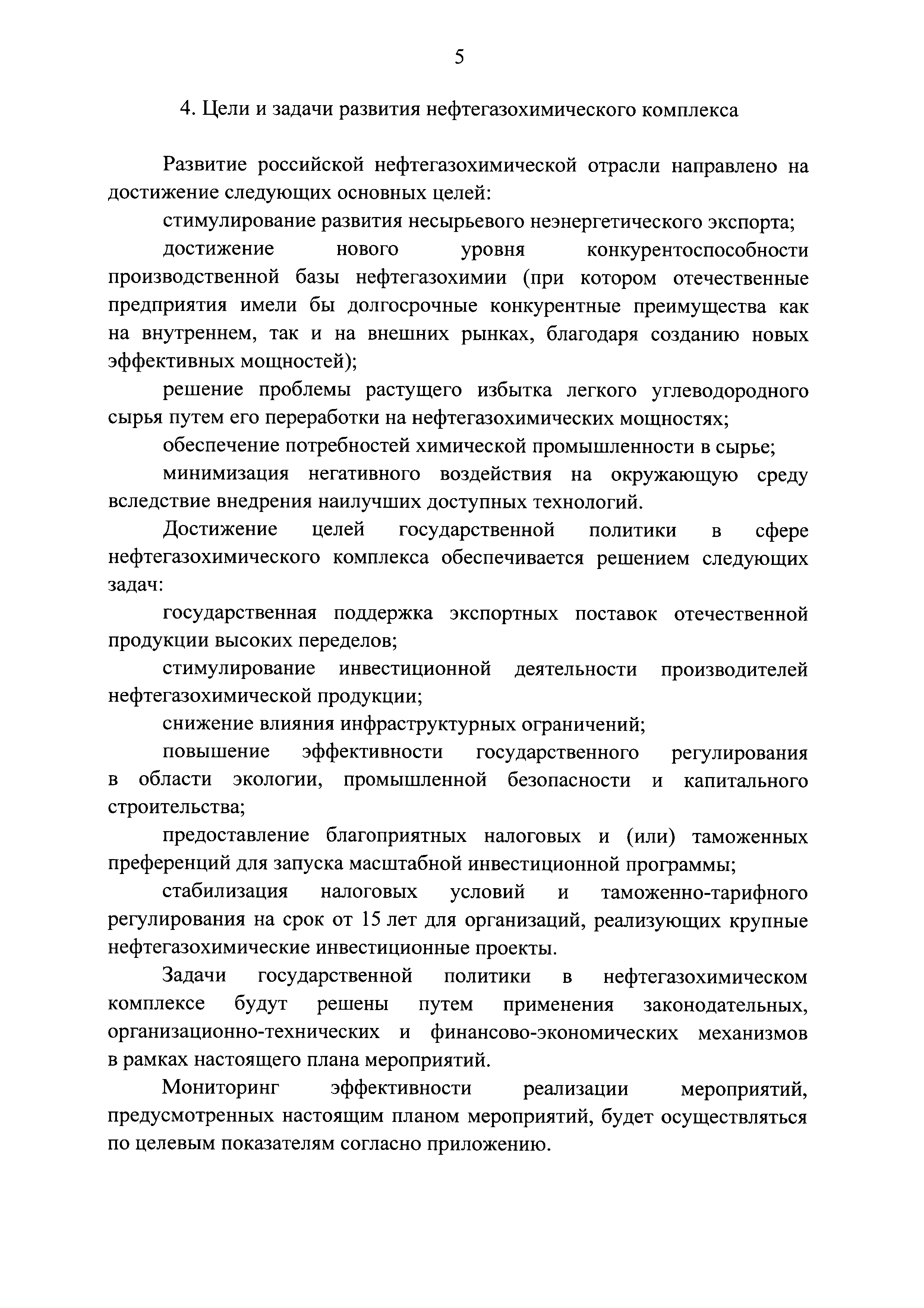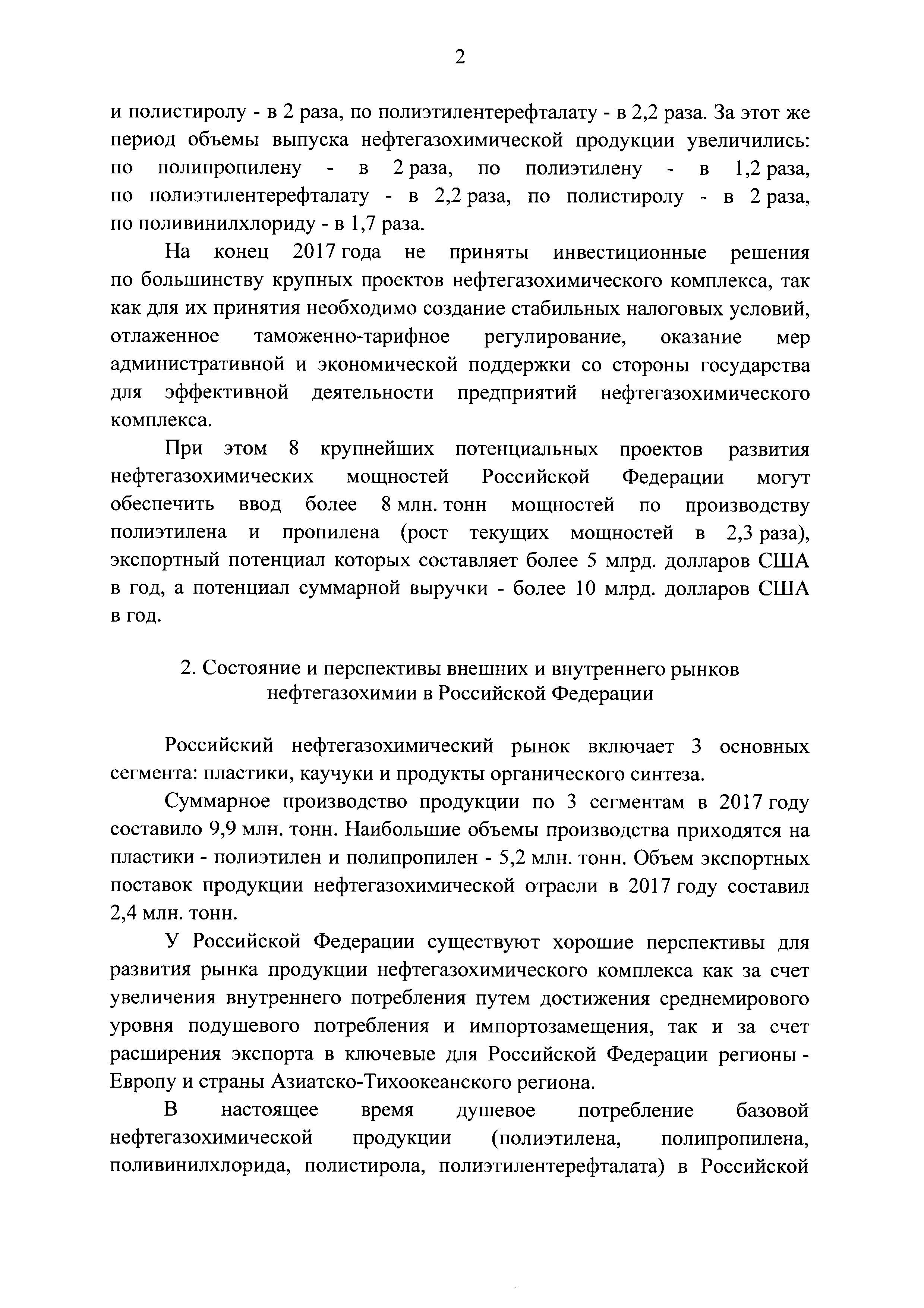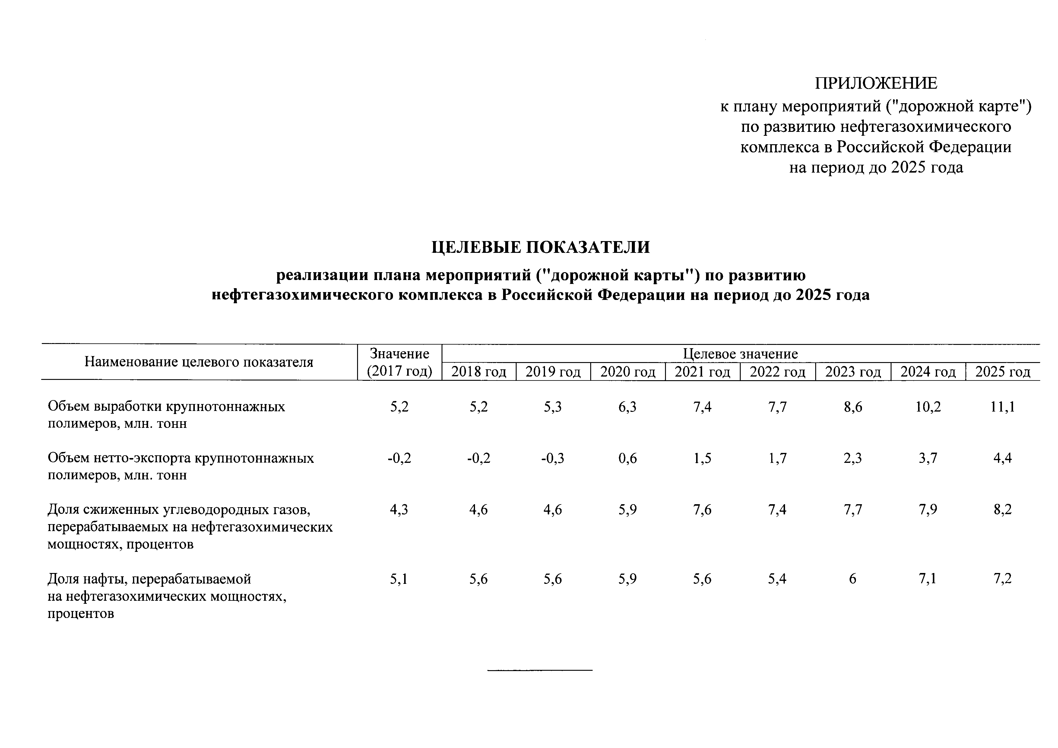 | Оглавление: | I. Общее описание плана мероприятий ("дорожной карты") 1. Место и роль нефтегазохимического комплекса в экономике Российской Федерации 2. Состояние и перспективы внешних и внутреннего рынков нефтегазохимии в Российской Федерации 3. Системные проблемы и препятствия развитию нефтегазохимического комплекса 4. Цели и задачи развития нефтегазохимического комплекса II. План мероприятий ("дорожная карта") по развитию нефтегазохимического комплекса в Российской Федерации на период до 2025 года Приложение. Целевые показатели реализации плана мероприятий ("дорожной карты") по развитию нефтегазохимического комплекса в Российской Федерации на период до 2025 года |