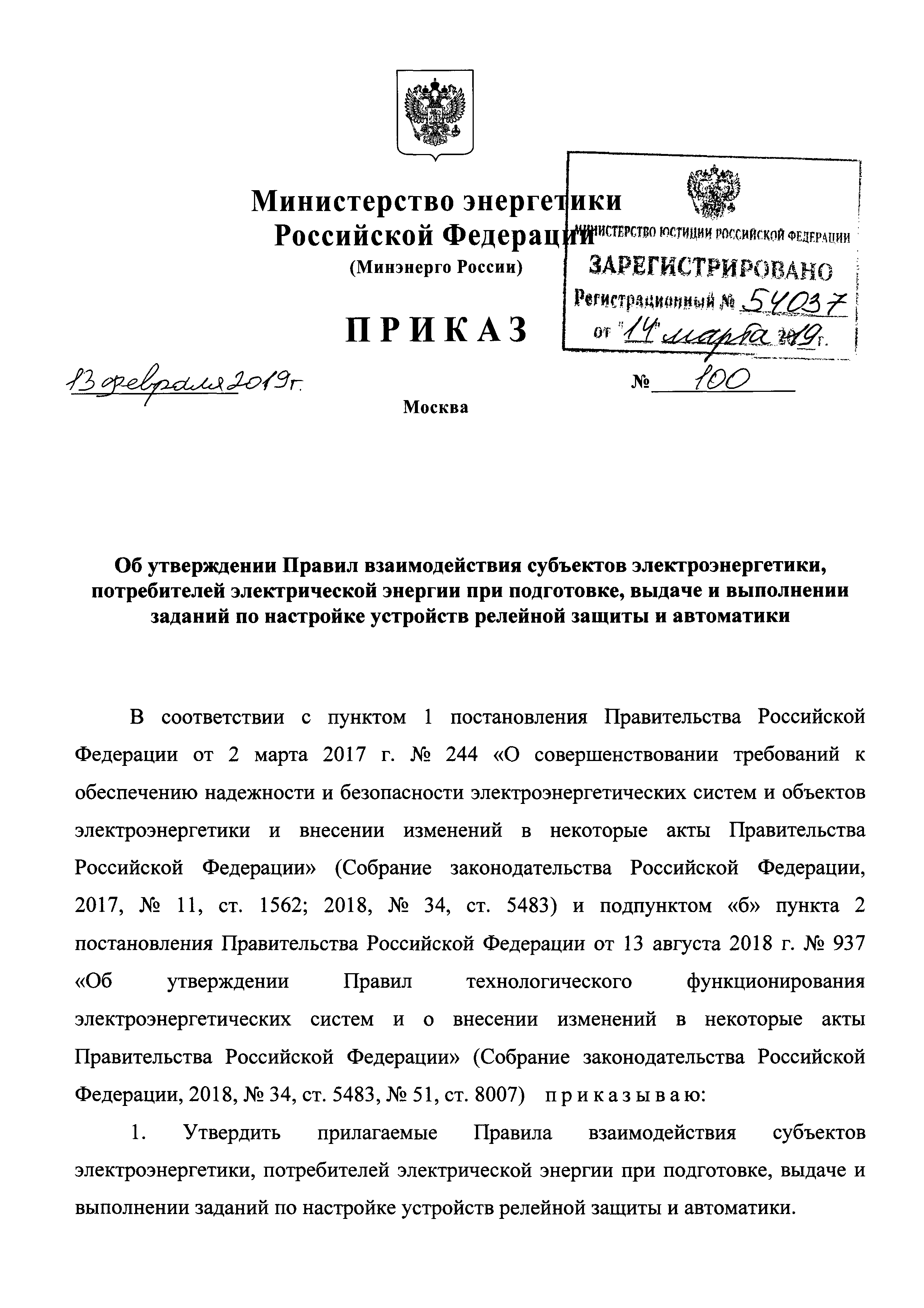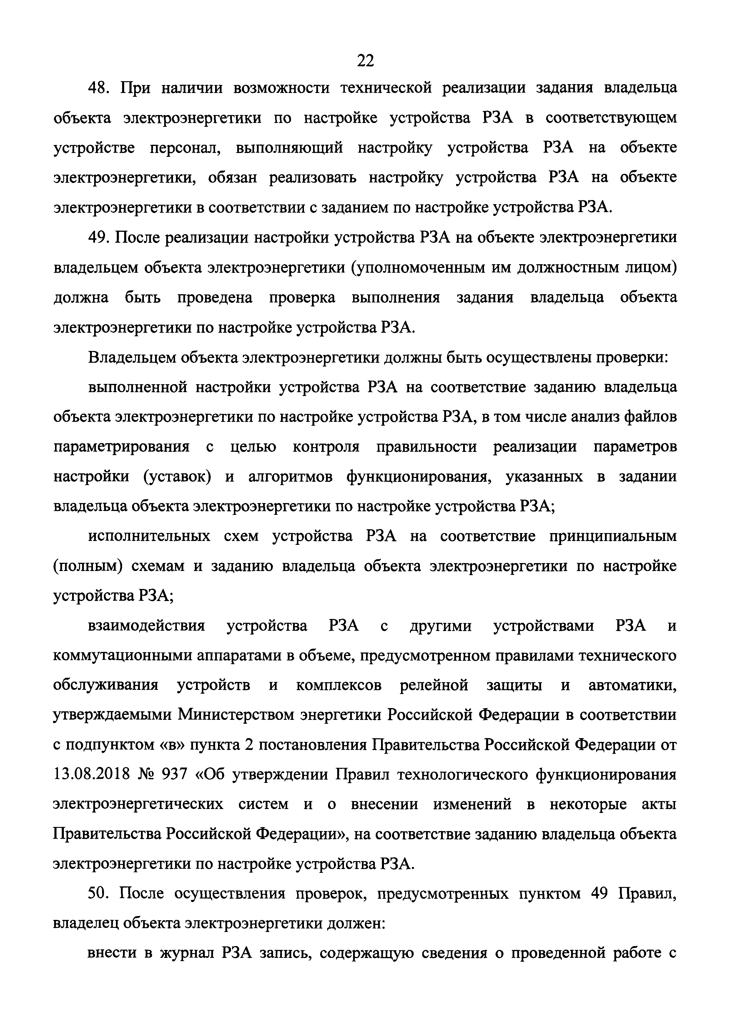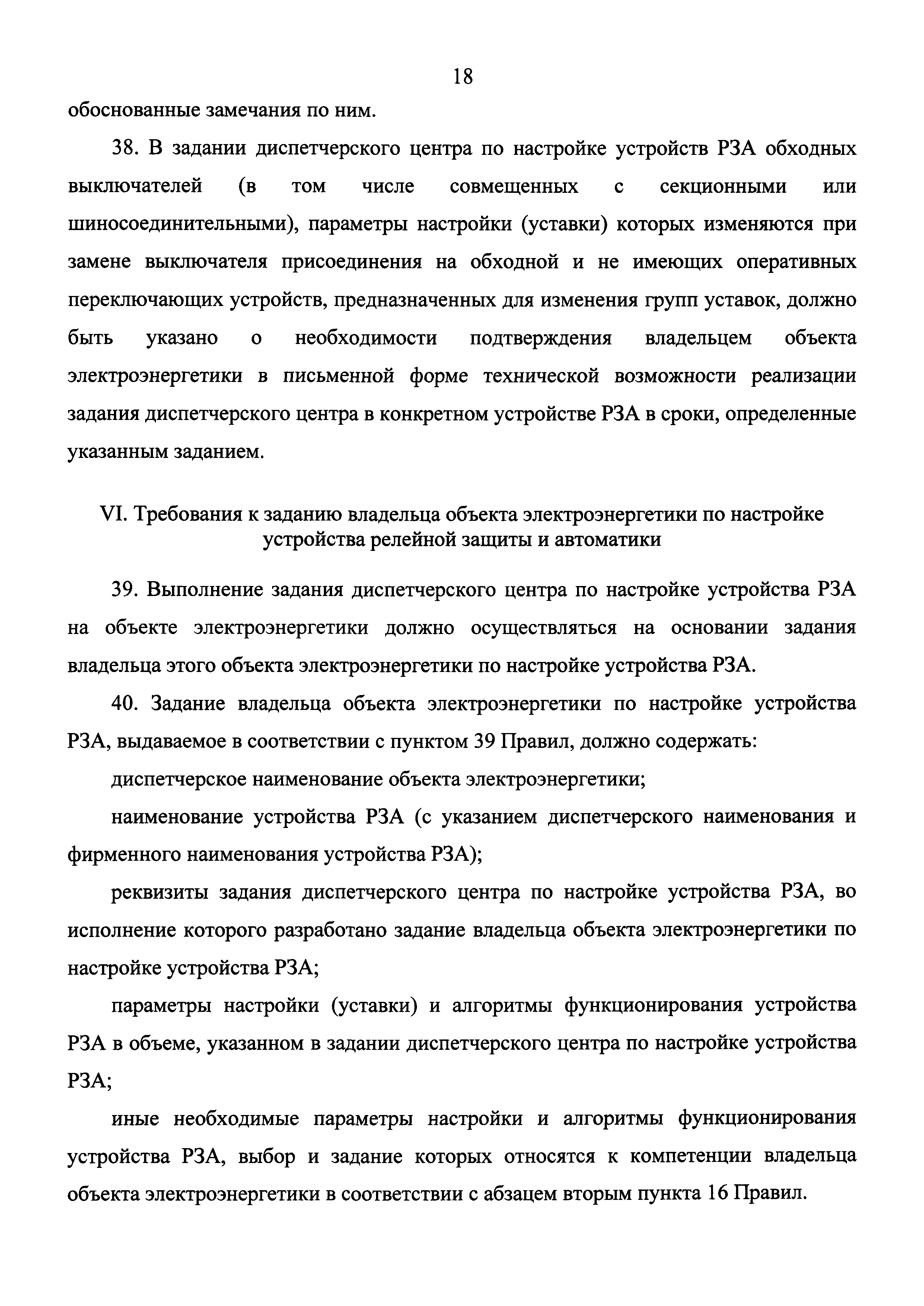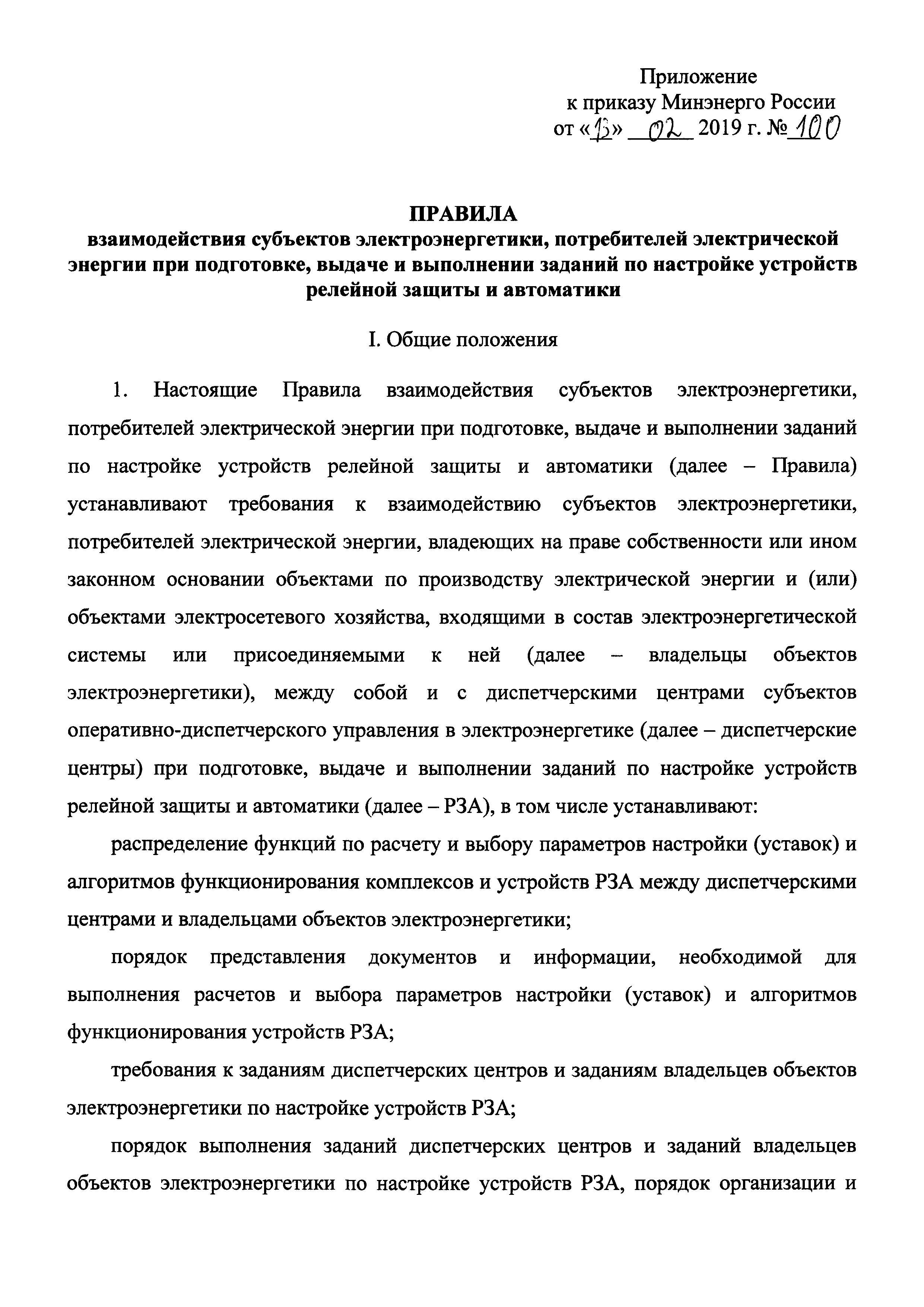 Правила взаимодействия субъектов электроэнергетики, потребителей электрической энергии при подготовке, выдаче и выполнении заданий по настройке устройств релейной защиты и автоматики| Статус: | действует | | Название рус.: | Правила взаимодействия субъектов электроэнергетики, потребителей электрической энергии при подготовке, выдаче и выполнении заданий по настройке устройств релейной защиты и автоматики | | Дата добавления в базу: | 01.02.2020 | | Дата актуализации: | 01.01.2021 | | Дата введения: | 15.06.2019 | | Оглавление: | I. Общие положения II. Распределение функций по расчету и выбору параметров настройки и алгоритмов функционирования комплексов и устройств релейной защиты и автоматики III. Общие требования к порядку выдачи и выполнения заданий по настройке устройств релейной защиты и автоматики IV. Порядок представления документов и информации, необходимых для выполнения расчетов и выбора параметров настройки (уставок) и алгоритмов функционирования устройств релейной защиты и автоматики V. Требования к заданию диспетчерского центра по настройке устройства релейной защиты и автоматики VI. Требования к заданию владельца объекта электроэнергетики по настройке устройства релейной защиты и автоматики VII. Порядок выполнения заданий по настройке устройств релейной защиты и автоматики VIII. Порядок согласования диспетчерским центром параметров настройки (уставок) и алгоритмов функционирования устройства релейной защиты и автоматики, расчет и выбор которых осуществляется владельцами объекта электроэнергетики Приложение. Термины и определения, используемые в Правилах взаимодействия субъектов электроэнергетики, потребителей электрической энергии при подготовке, выдаче и выполнении заданий по настройке устройств релейной защиты и автоматики | | Утверждён: | 13.02.2019 Минэнерго России (Russian Federation Minenergo 100)