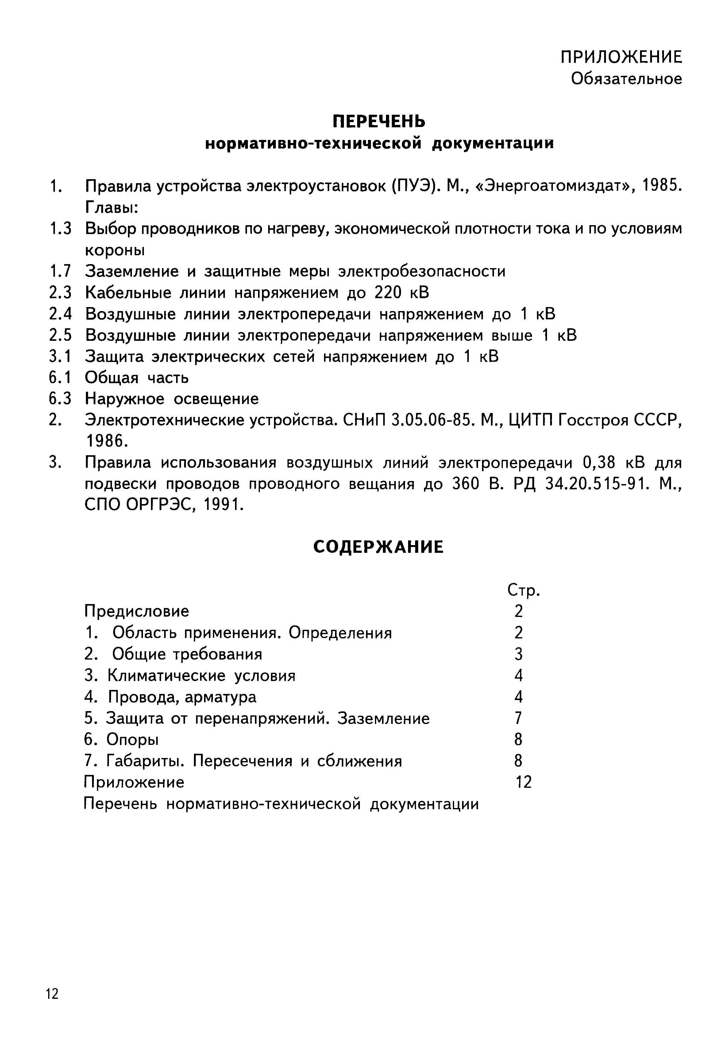 | Оглавление: | Предисловие 1. Область применения. Определения 2. Общие требования 3. Климатические условия 4. Провода, арматура 5. Защита от перенапряжений. Заземление 6. Опоры 7. Габариты. Пересечения и сближения Приложение (обязательное). Перечень нормативно-технической документации |