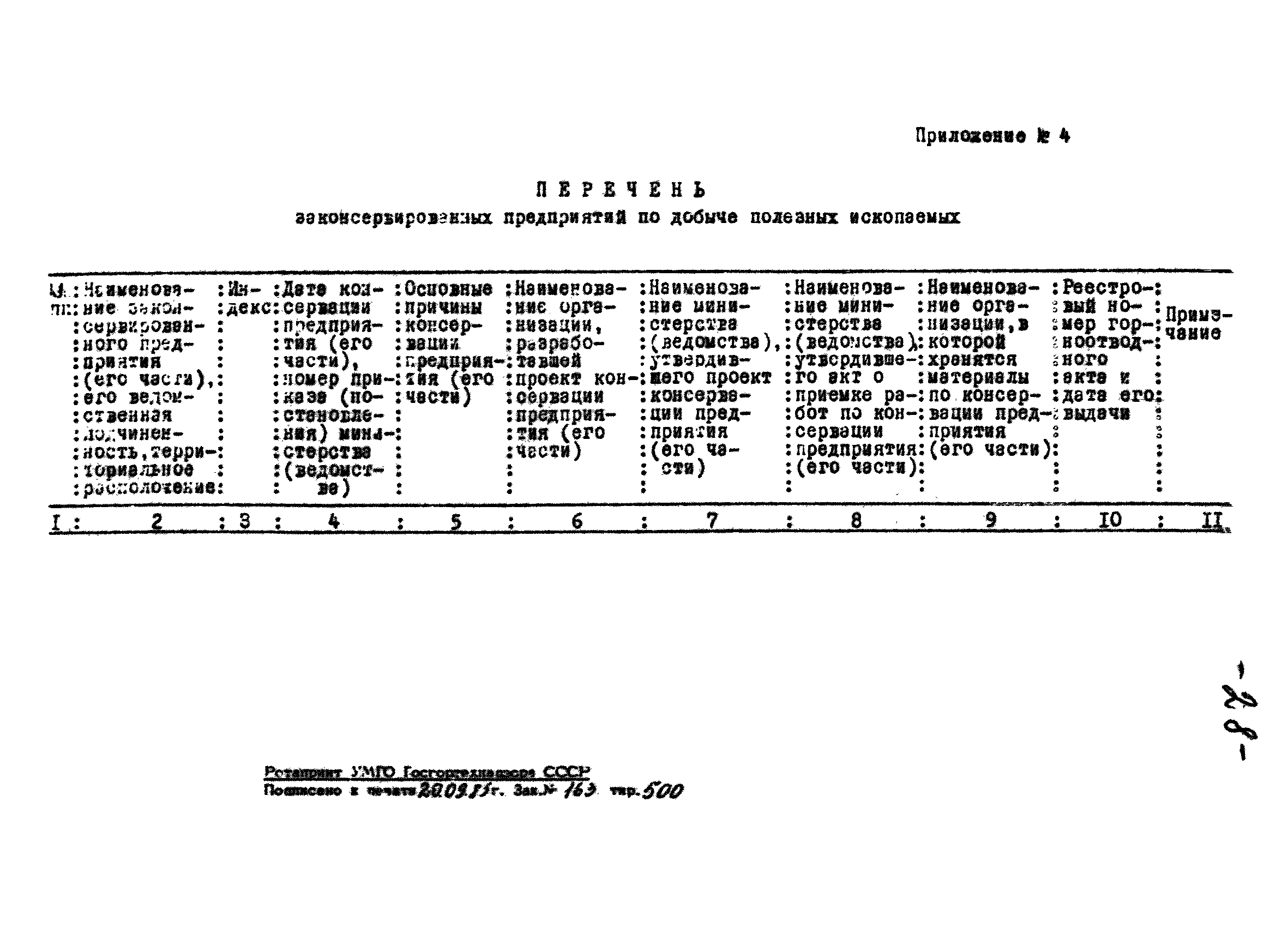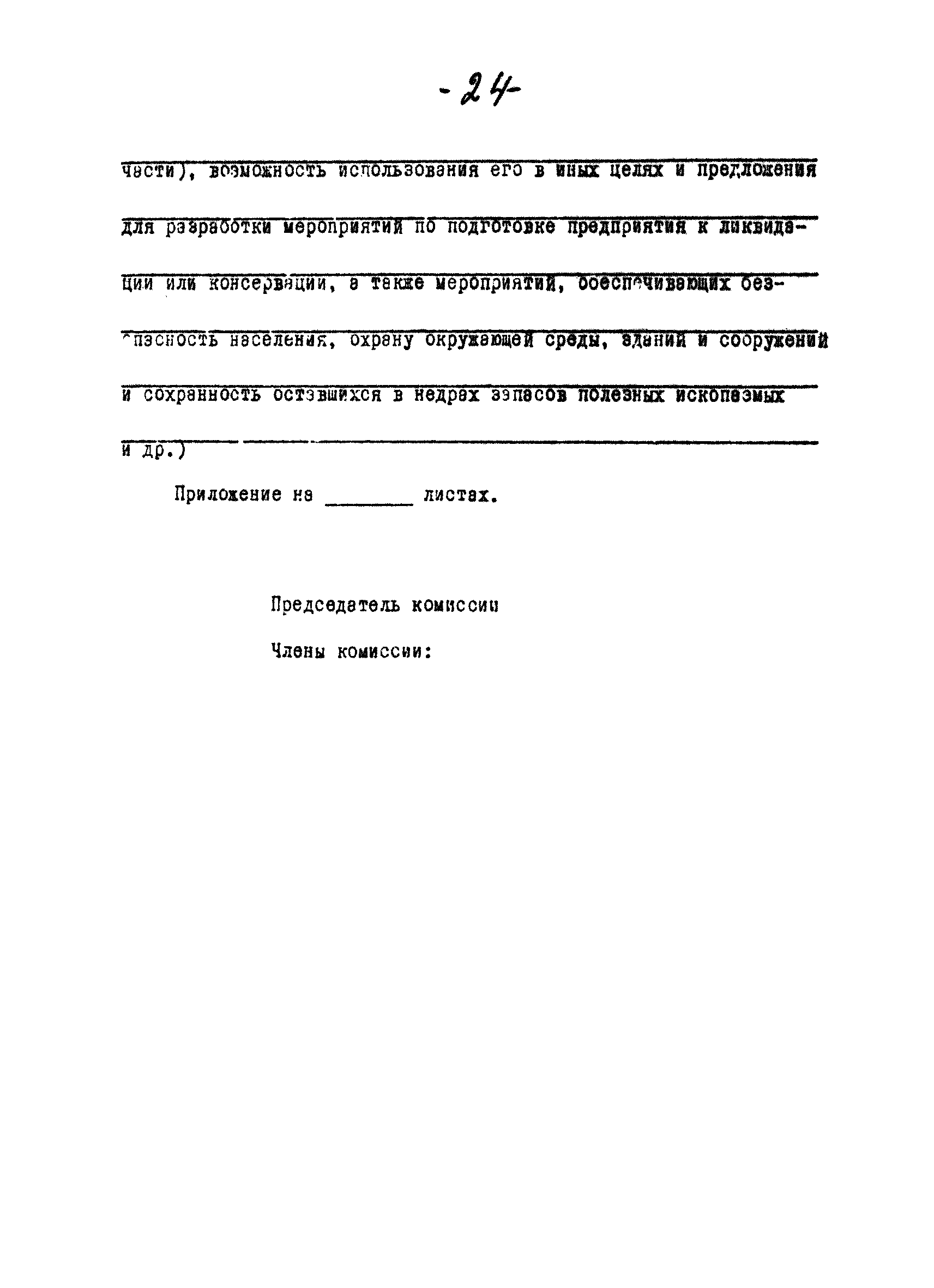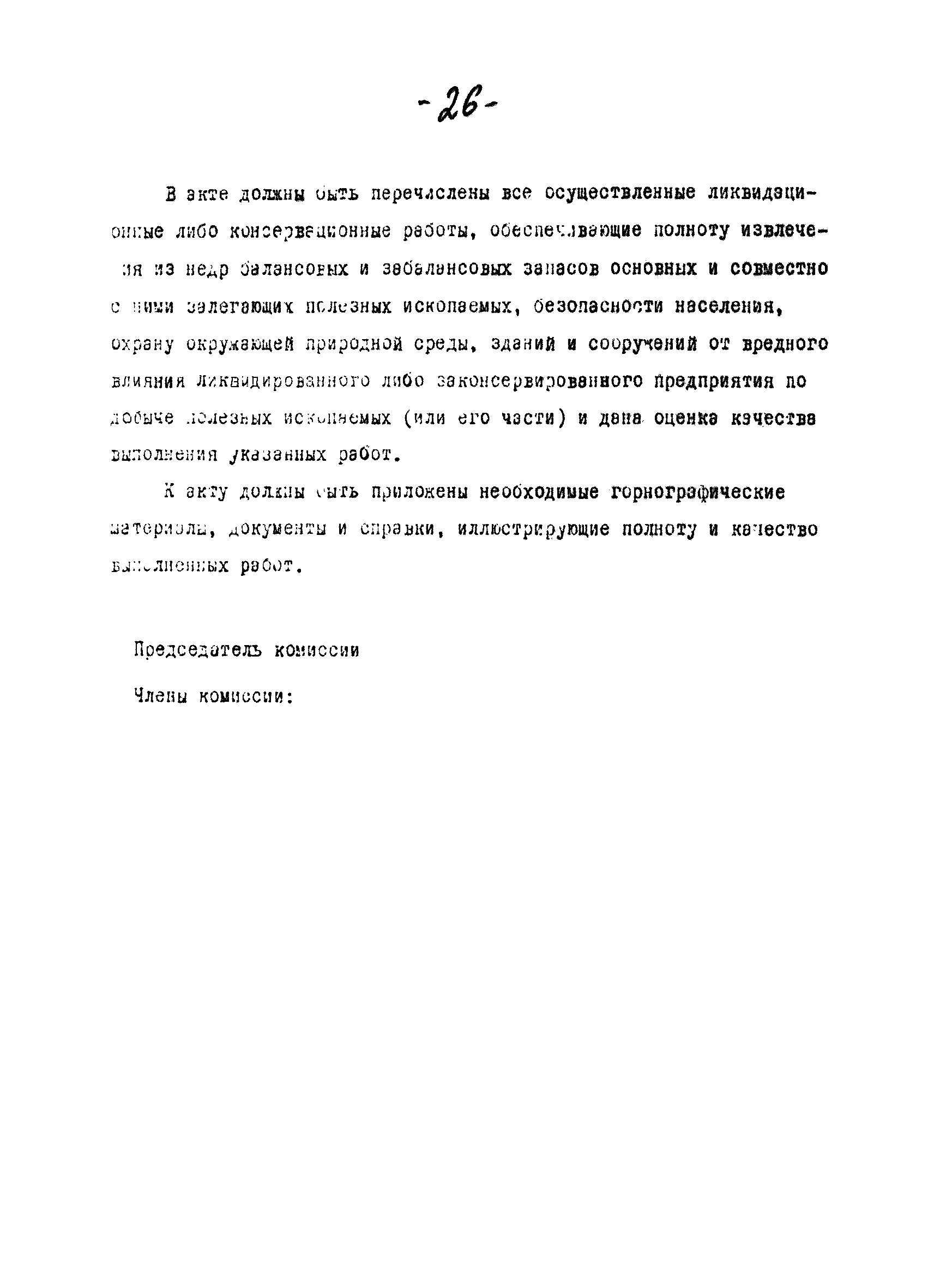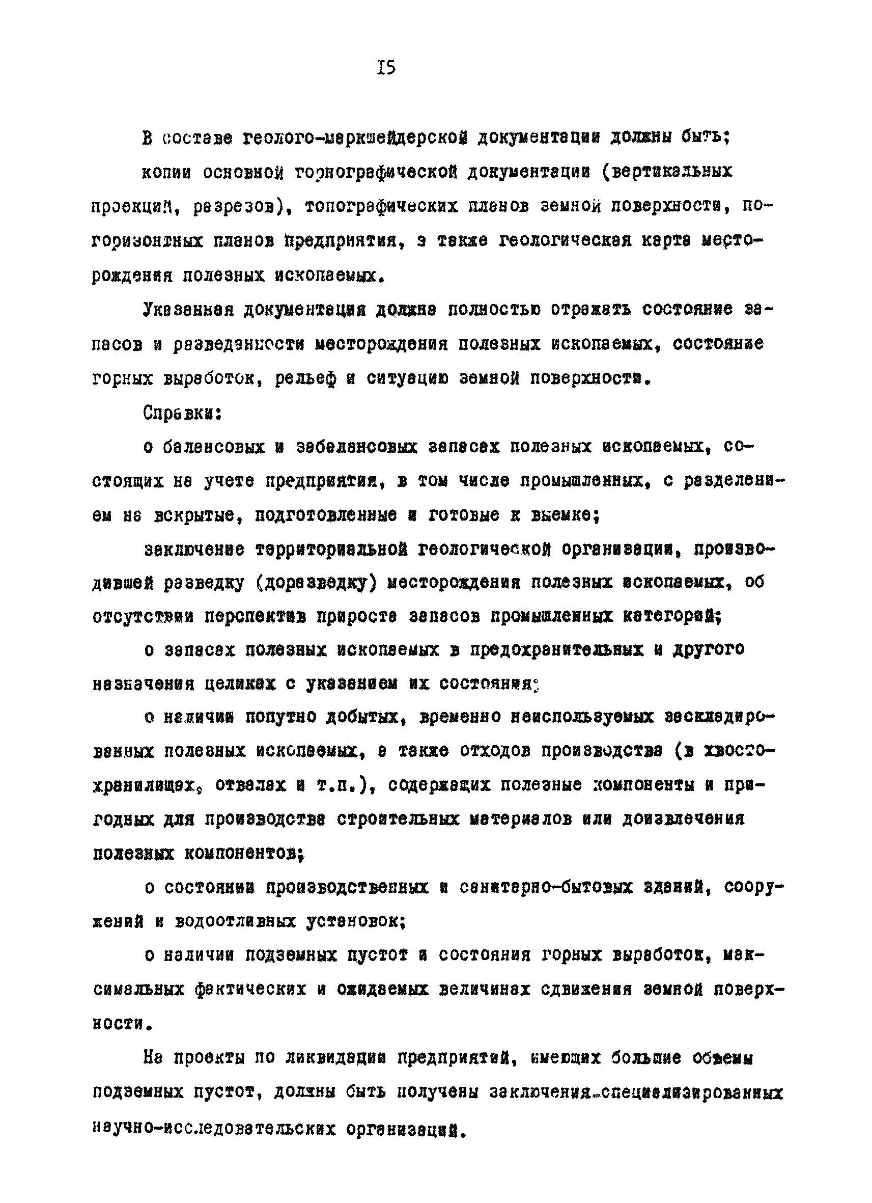 Инструкция о порядке ликвидации и консервации предприятий по добыче полезных ископаемых (в части обеспечения безопасности, рационального использования и охраны недр)| Статус: | отменен | | Название рус.: | Инструкция о порядке ликвидации и консервации предприятий по добыче полезных ископаемых (в части обеспечения безопасности, рационального использования и охраны недр) | | Название англ.: | Procedural Guidelines for Abandonment and Securing of Hazardous Production Facilities Involving the Use of Mineral Resources | | Дата добавления в базу: | 01.02.2020 | | Дата актуализации: | 01.01.2021 | | Область применения: | Инструкция устанавливает единый порядок ликвидации и консервации предприятий по добыче полезных ископаемых, в том числе консервации предприятий, их участков или выработок, намечаемых к дальнейшему использованию в народном хозяйстве в целях, не связанных с добычей полезных ископаемых. Инструкция является обязательной для всех предприятий, организаций, учреждений, министерств и ведомств, осуществляющих добычу и разведку полезных ископаемых на территории Союза ССР и в пределах континентального шельфа СССР | | Оглавление: | 1. Общие положения 2. Порядок получения и оформления разрешения на ликвидацию или консервацию предприятия по добыче полезных ископаемых 3. Содержание проекта ликвидации и консервации предприятия по добыче полезных ископаемых 4. Мероприятия, проводимые при ликвидации или консервации предприятия по добыче полезных ископаемых 5. Учет ликвидированных и находящихся на консервации предприятий по добыче полезных ископаемых 6. Контроль за соблюдением требований настоящей инструкции Приложение 1. Заключение о необходимости ликвидации или консервации предприятия по добыче полезных ископаемых (или его части) Приложение 2. Акт приемки и оценки работ, выполненных в целях ликвидации, консервации предприятия по добыче полезных ископаемых (или его части) Приложение 3. Перечень ликвидированных предприятий по добыче полезных ископаемых Приложение 4. Перечень законсервированных предприятий по добыче полезных ископаемых | | Разработан: | Госгортехнадзор России