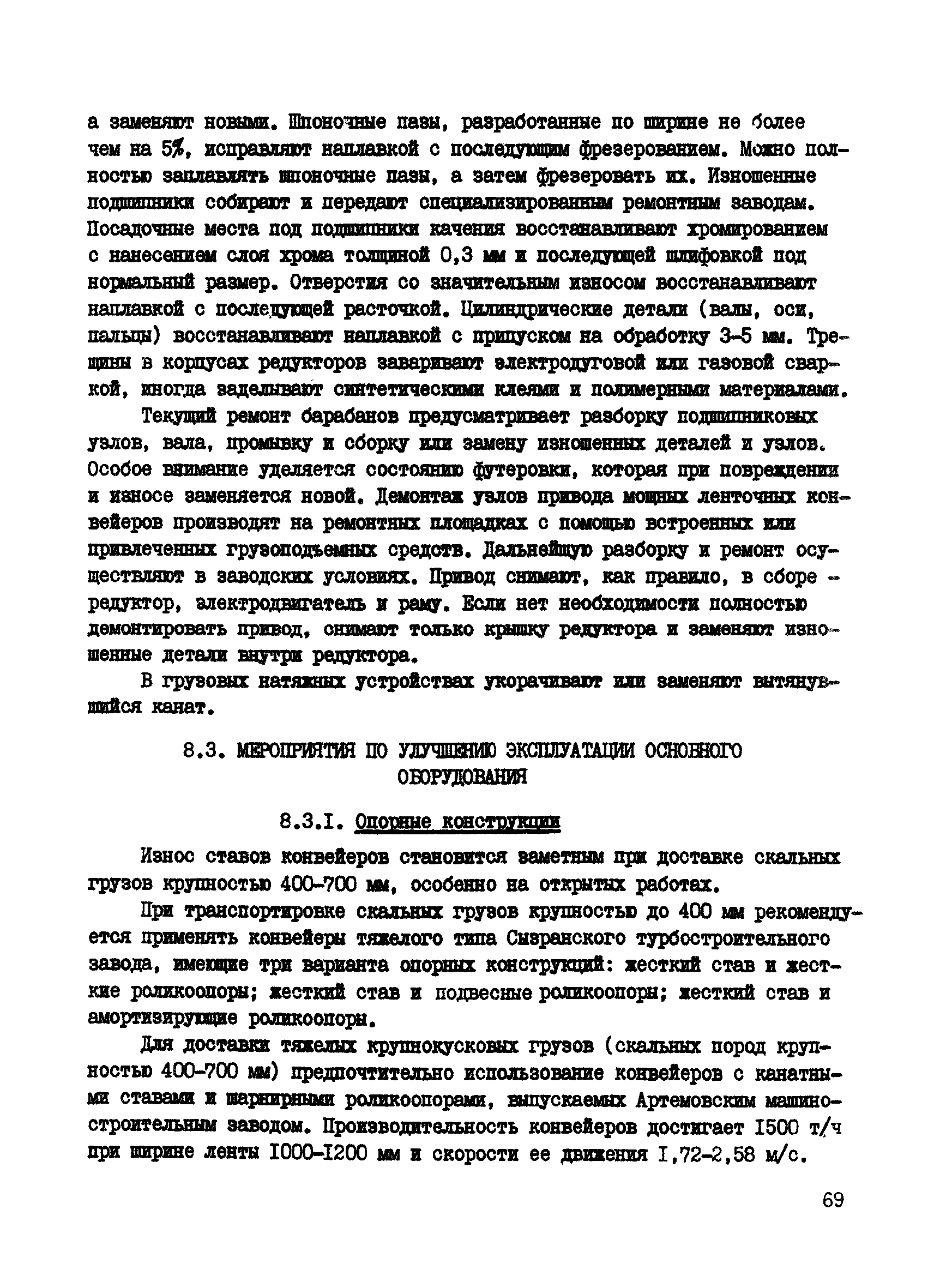 | Оглавление: | 1. Общие положения и сведения 1.1. Общие положения 1.2. Общие сведения 2. Конвейерное оборудование и основные требования 2.1. Конвейерное оборудование 2.2. Основные требования 3. Выбор конвейерных лент 3.1. Основные положения 3.2. Типы резинотканевых лент 3.3. Ширина ленты 3.4. Количество и прочность прокладок 3.5. Класс и толщина обкладок 3.6. Резинотросовые ленты 4. Нормирование расхода конвейерных лент 4.1. Общие положения 4.2. Расчет норм расхода ленты 4.3. Определение потребности в ленте 5. Монтаж и применение конвейерного оборудования 5.1. Общие положения 5.2. Опорные конструкции 5.3. Роликоопоры 5.4. Привод, натяжные устройства и средства автоматизации 5.5. Центрифужные устройства 5.6. Средства контроля разрушения, обрыва и пробуксовки лент 5.7. Загрузочные устройства 5.8. Устройства для очистки и переворачивания лент, уборки просыпи и пылеподавления 6. Монтаж и стыковка конвейерных лент 6.1. Монтаж лент 6.2. Стыковка лент 7. Ввод конвейера в эксплуатацию 7.1. Общие положения 7.2. Основное содержание работ 8. Техническое обслуживание и ремонт основного конвейерного оборудования 8.1. Общие положения 8.2. Содержание работ по техническому обслуживанию и текущему ремонту основных узлов 8.3. Мероприятия по улучшению эксплуатации основного оборудования 9. Техническое обслуживание и ремонт конвейерных лент 9.1. Техническое обслуживание конвейерных лент 9.2. Ремонт конвейерных лент 9.3. Мероприятия по улучшению эксплуатации конвейерных лент 10. Техника безопасности 11. Технический учет Список литературы |
