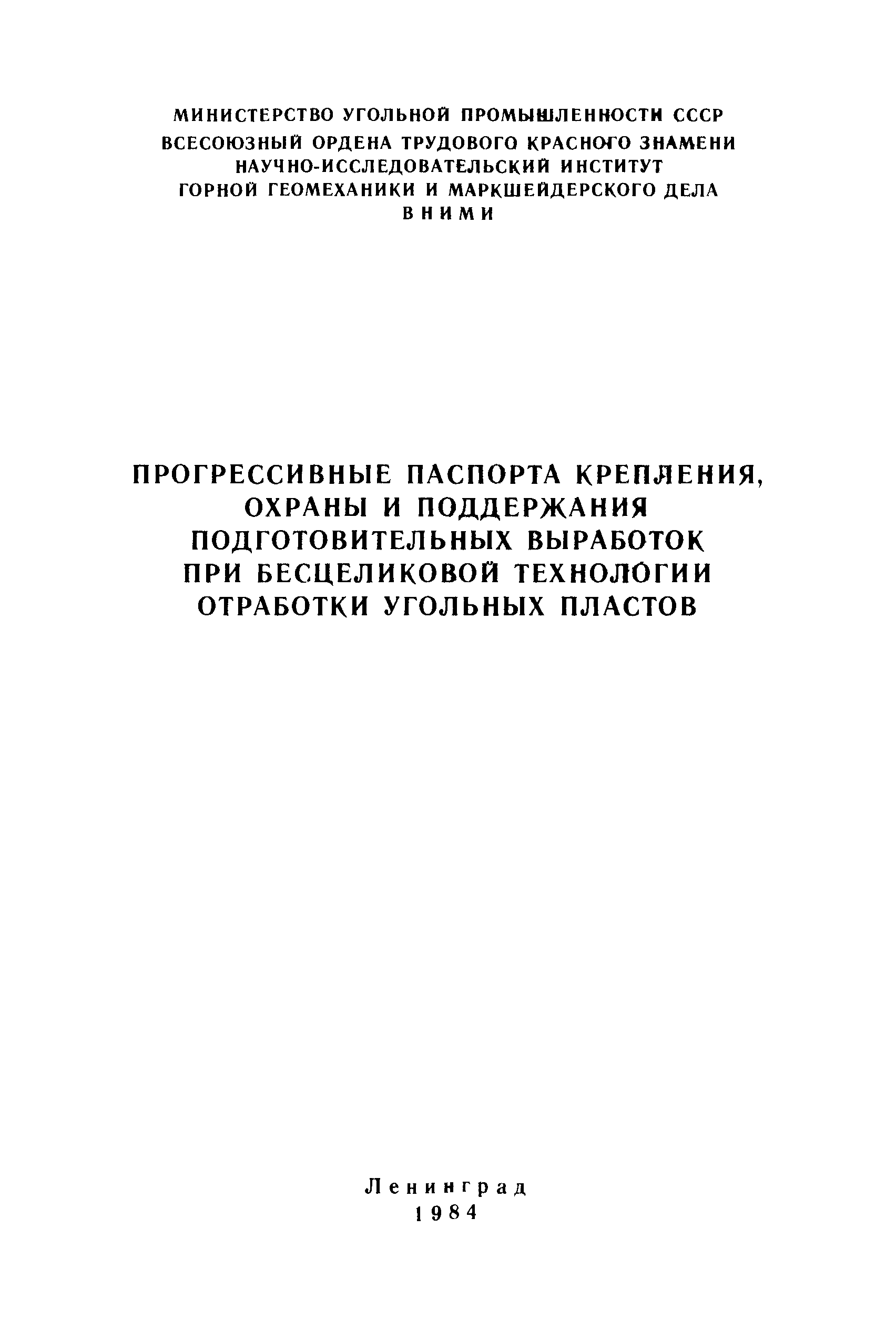 | Название рус.: | Прогрессивные паспорта крепления, охраны и поддержания подготовительных выработок при бесцеликовой технологии отработки угольных пластов. Издание 1 |