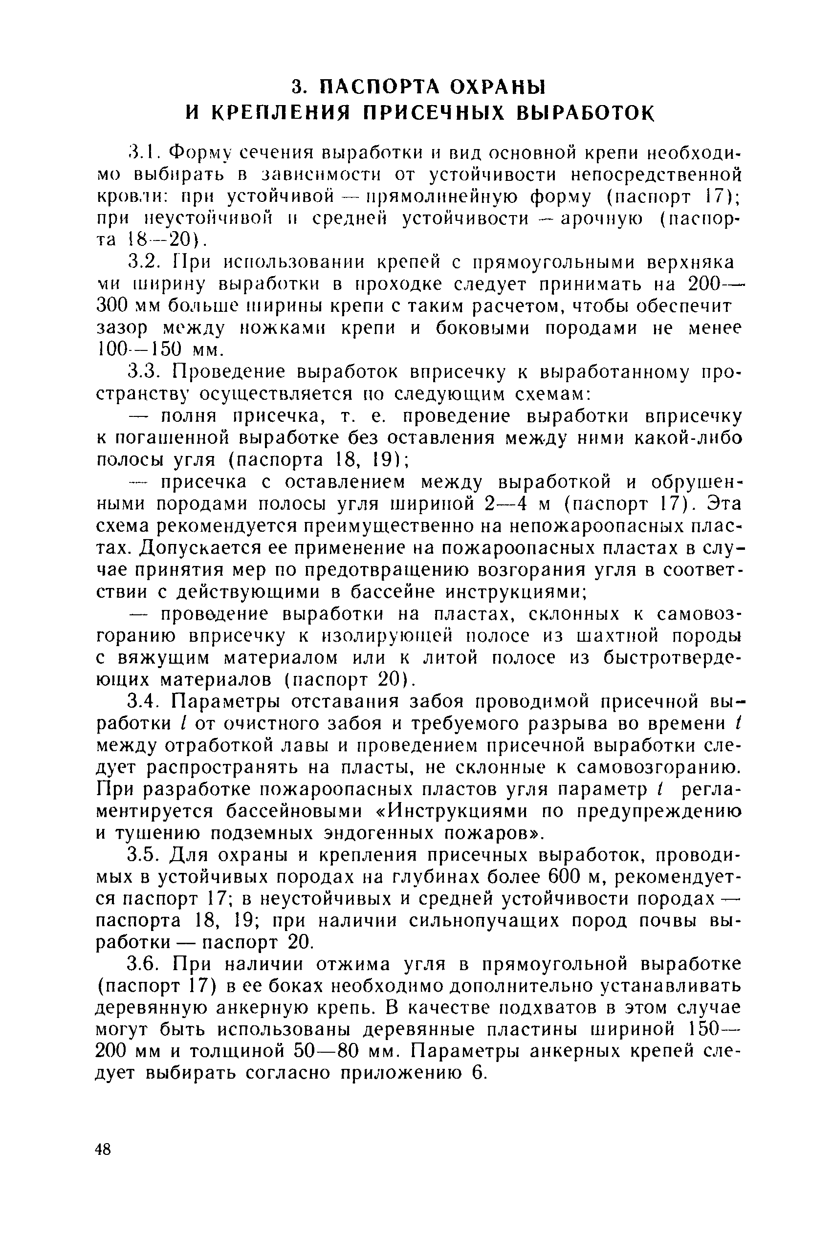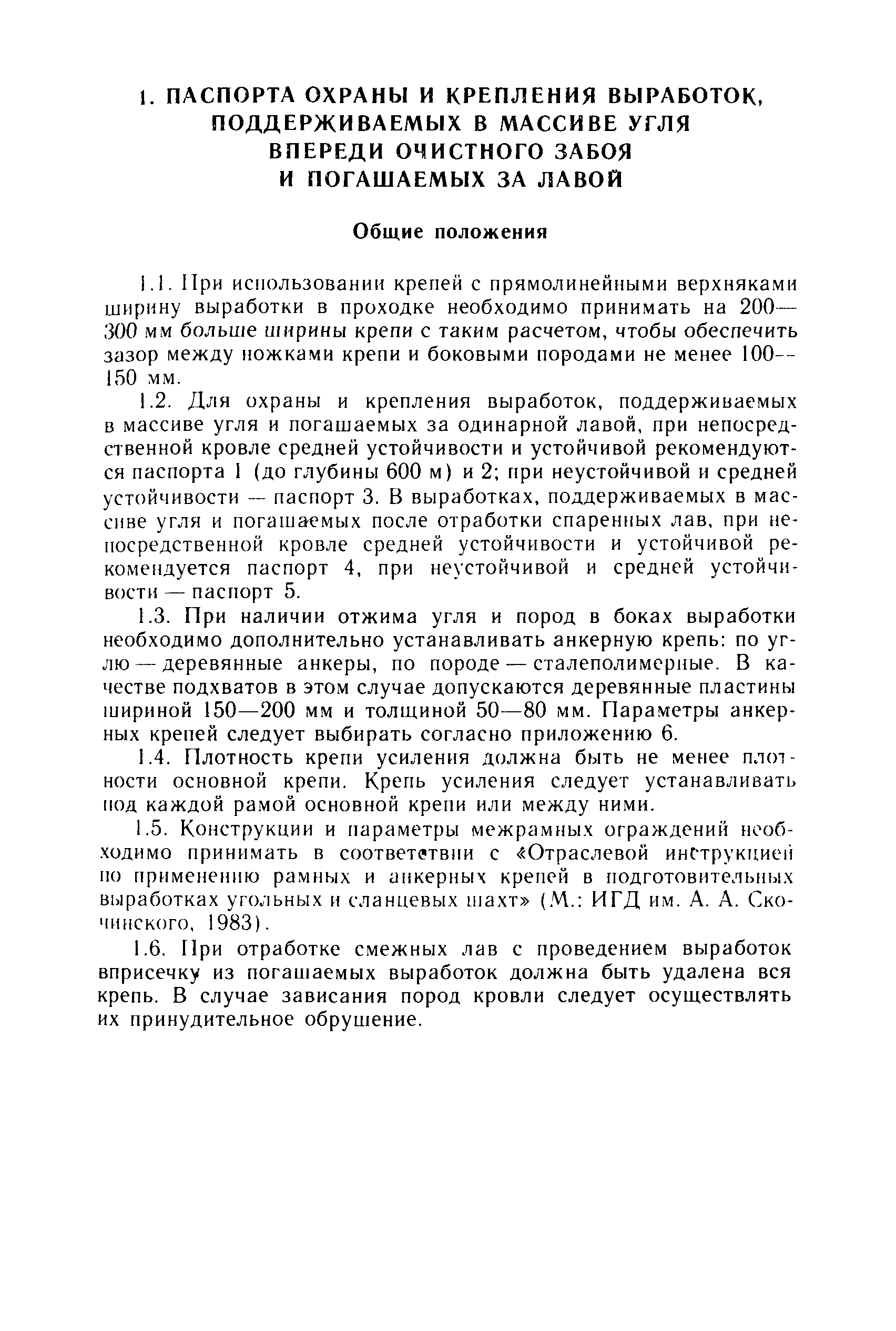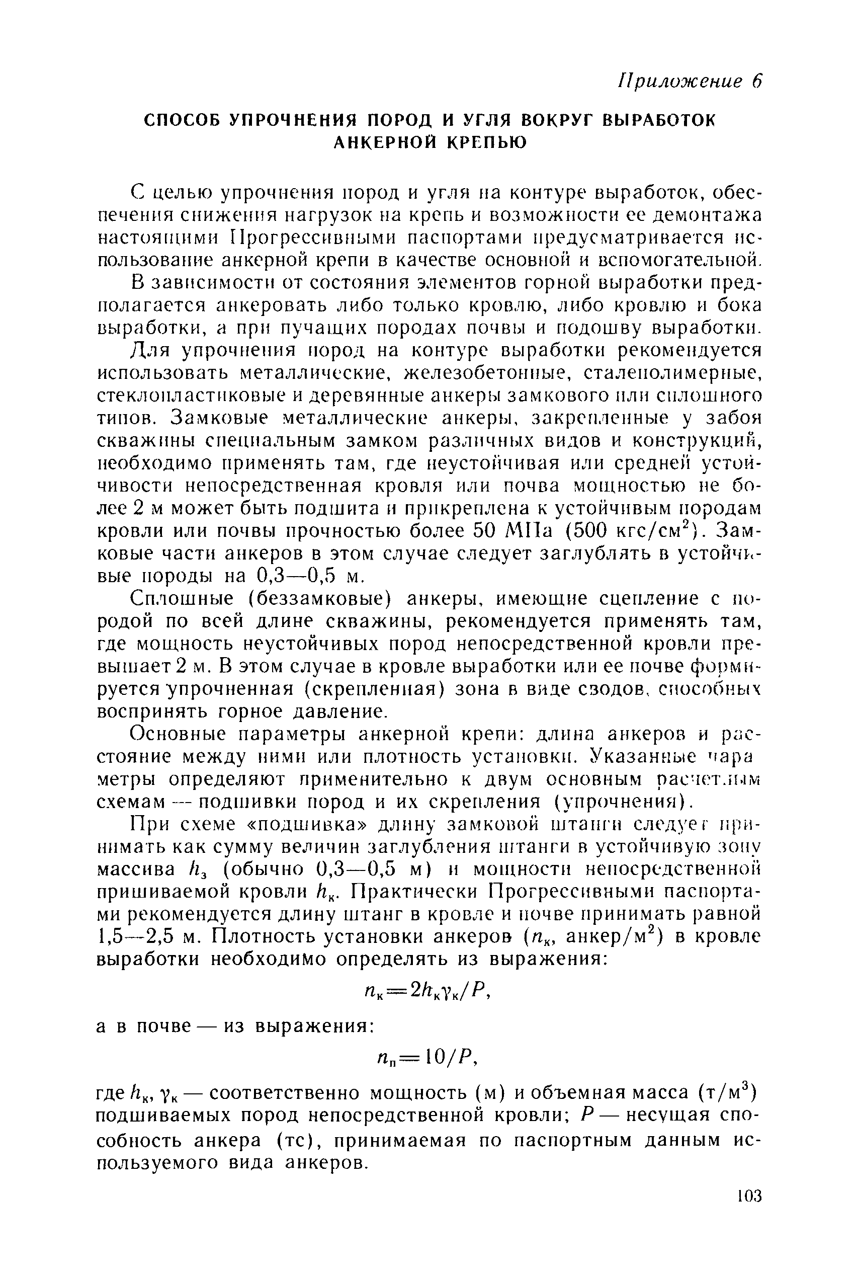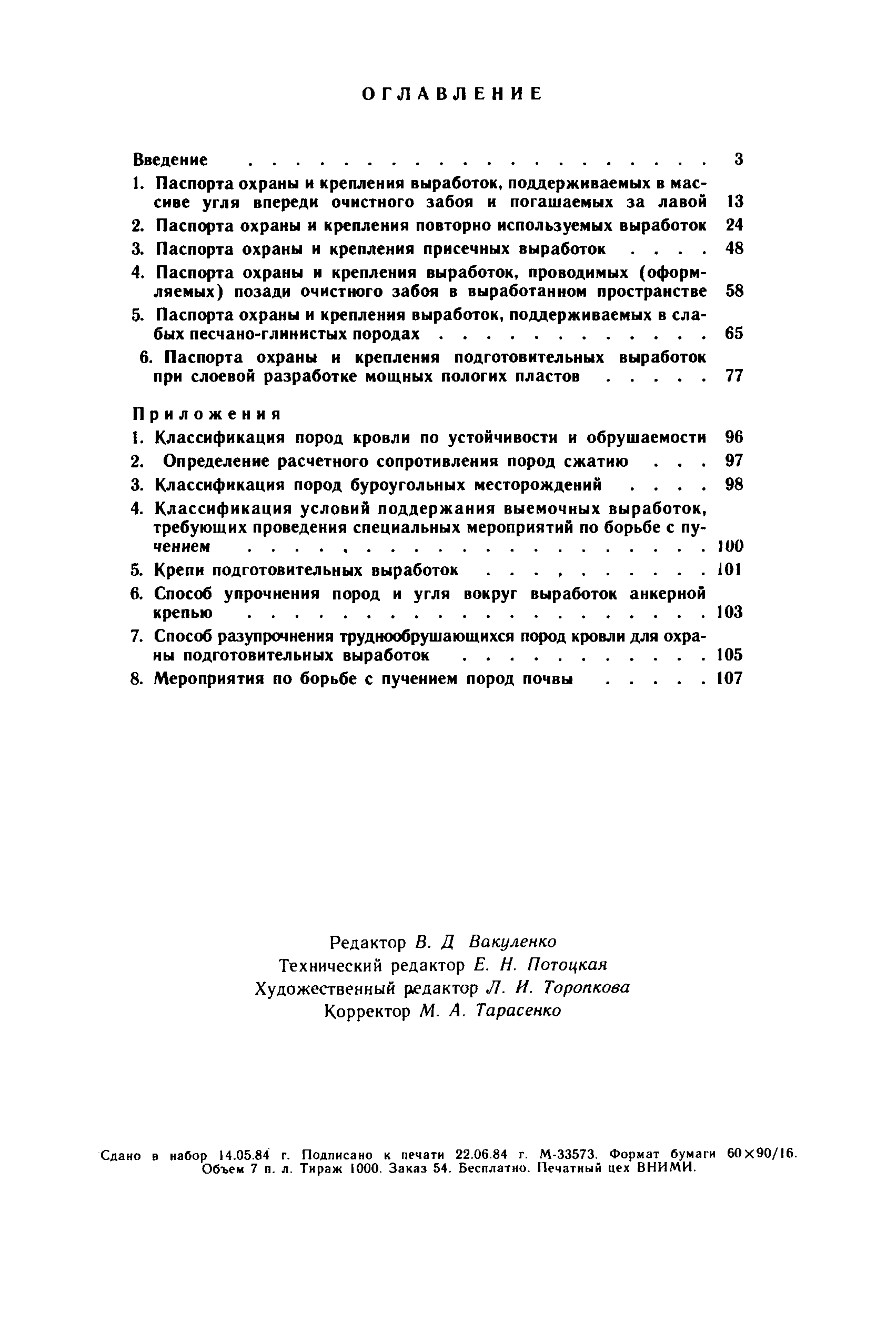 | Оглавление: | Введение 1. Паспорта охраны и крепления выработок, поддерживаемых в массиве угля впереди очистного забоя и погашаемых за лавой 2. Паспорта охраны и крепления повторно используемых выработок 3. Паспорта охраны и крепления присечных выработок 4. Паспорта охраны и крепления выработок, проводимых (оформляемых) позади очистного забоя в выработанном пространстве 5. Паспорта охраны и крепления выработок, поддерживаемых в слабых песчано-глинистых породах 6. Паспорта охраны и крепления подготовительных выработок при слоевой разработке мощных пологих пластов Приложение 1. Классификация пород кровли по устойчивости и обрушаемости Приложение 2. Определение расчетного сопротивления пород сжатию Приложение 3. Классификация пород буроугольных месторождений Приложение 4. Классификация условий поддержания выемочных выработок, требующих проведения специальных мероприятий по борьбе с пучением Приложение 5. Крепи подготовительных выработок Приложение 6. Способ упрочнения пород и угля вокруг выработок анкерной крепью Приложение 7. Способ разупрочнения труднообрушающихся пород кровли для охраны подготовительных выработок Приложение 8. Мероприятия по борьбе с пучением пород почвы |
