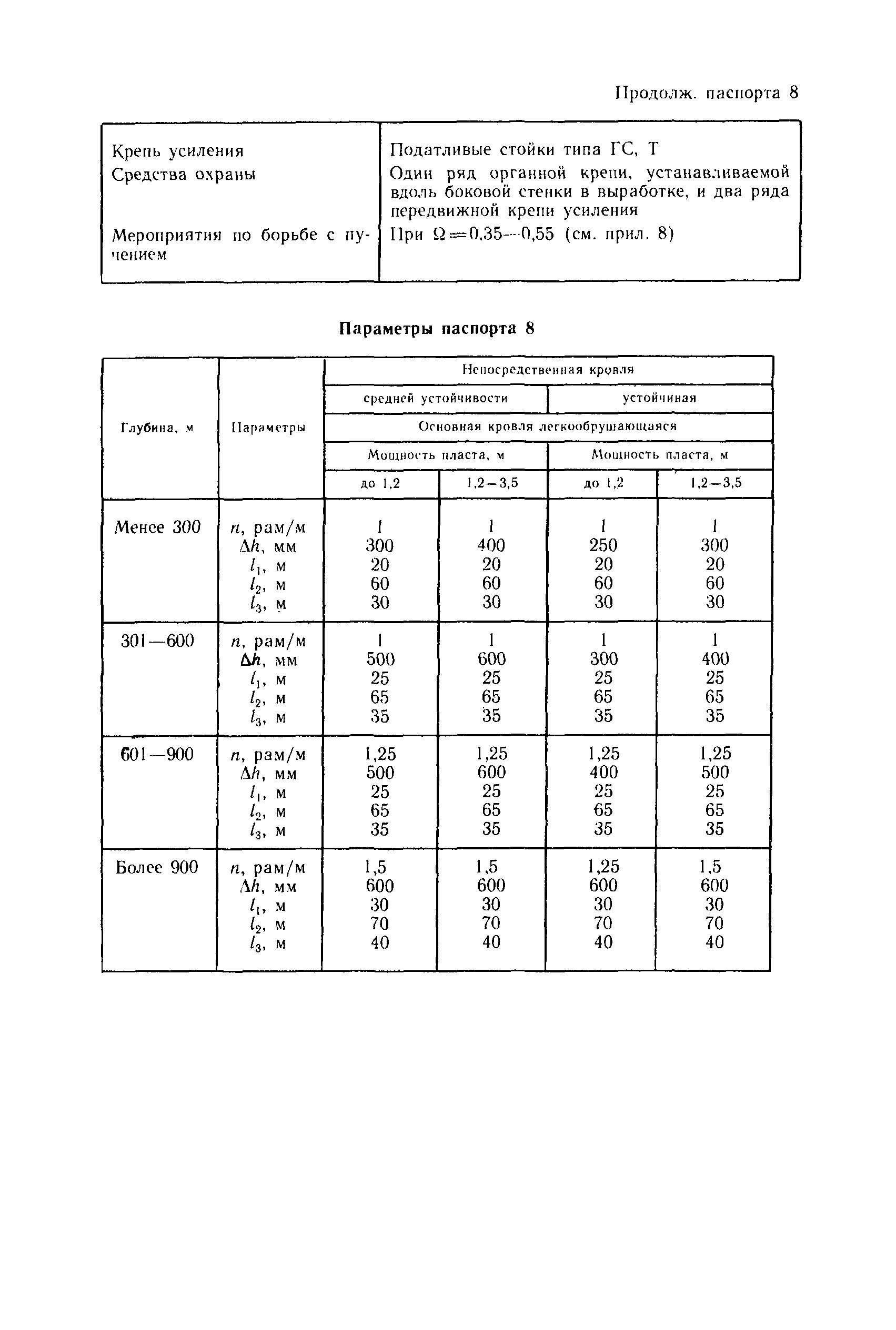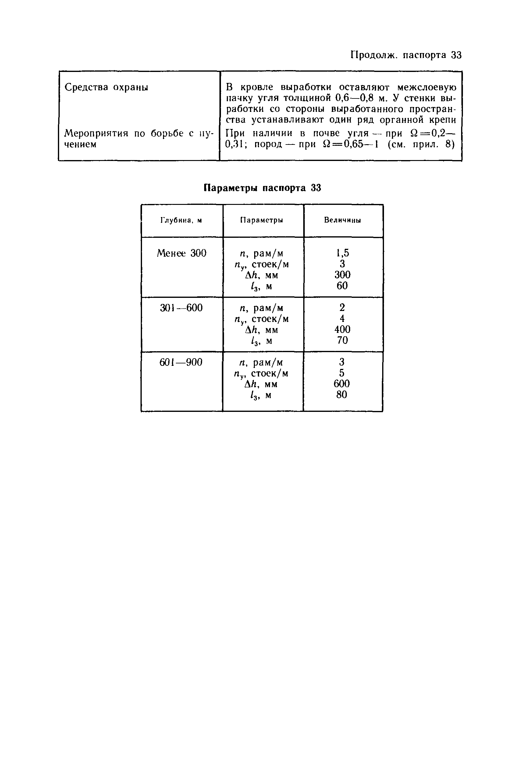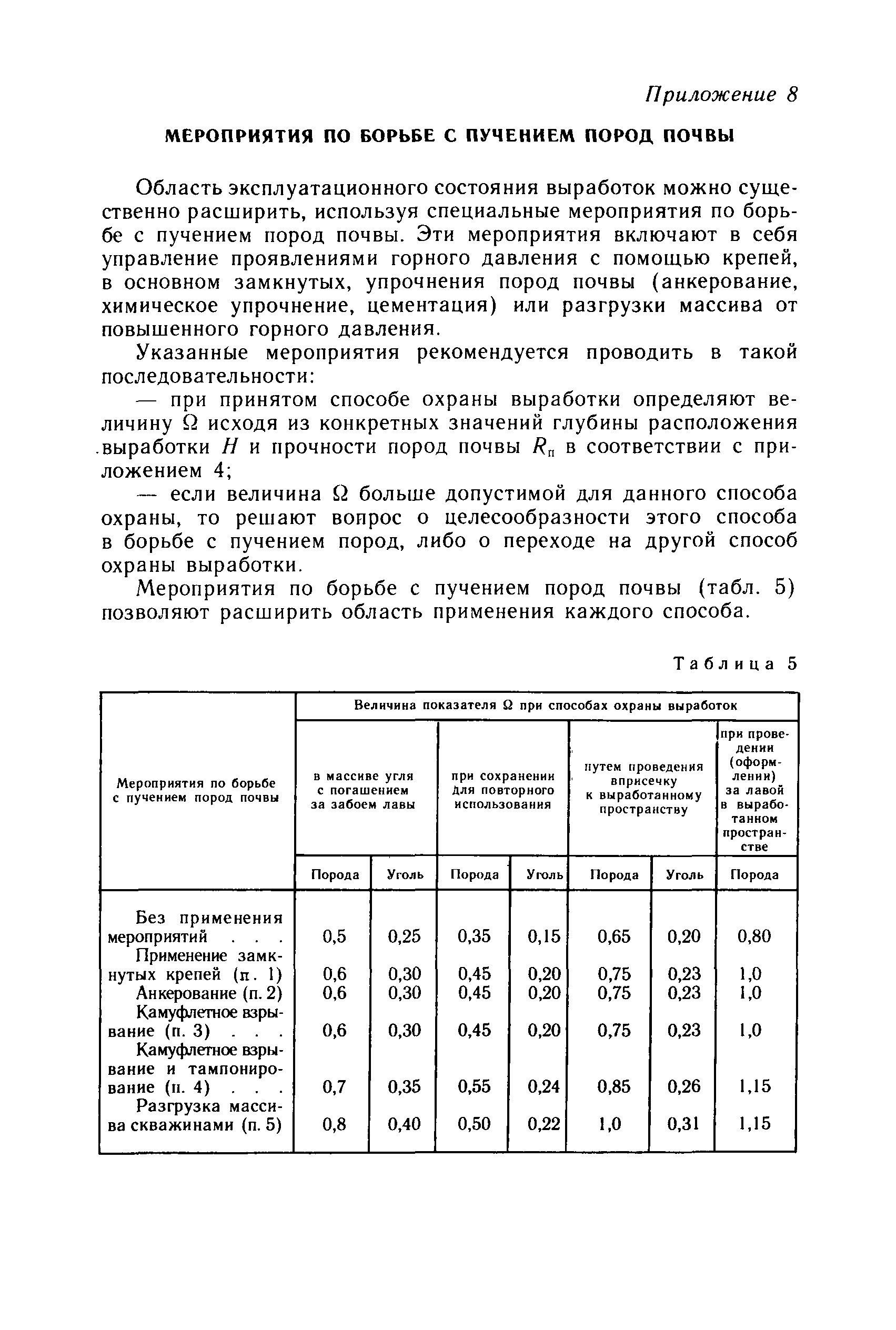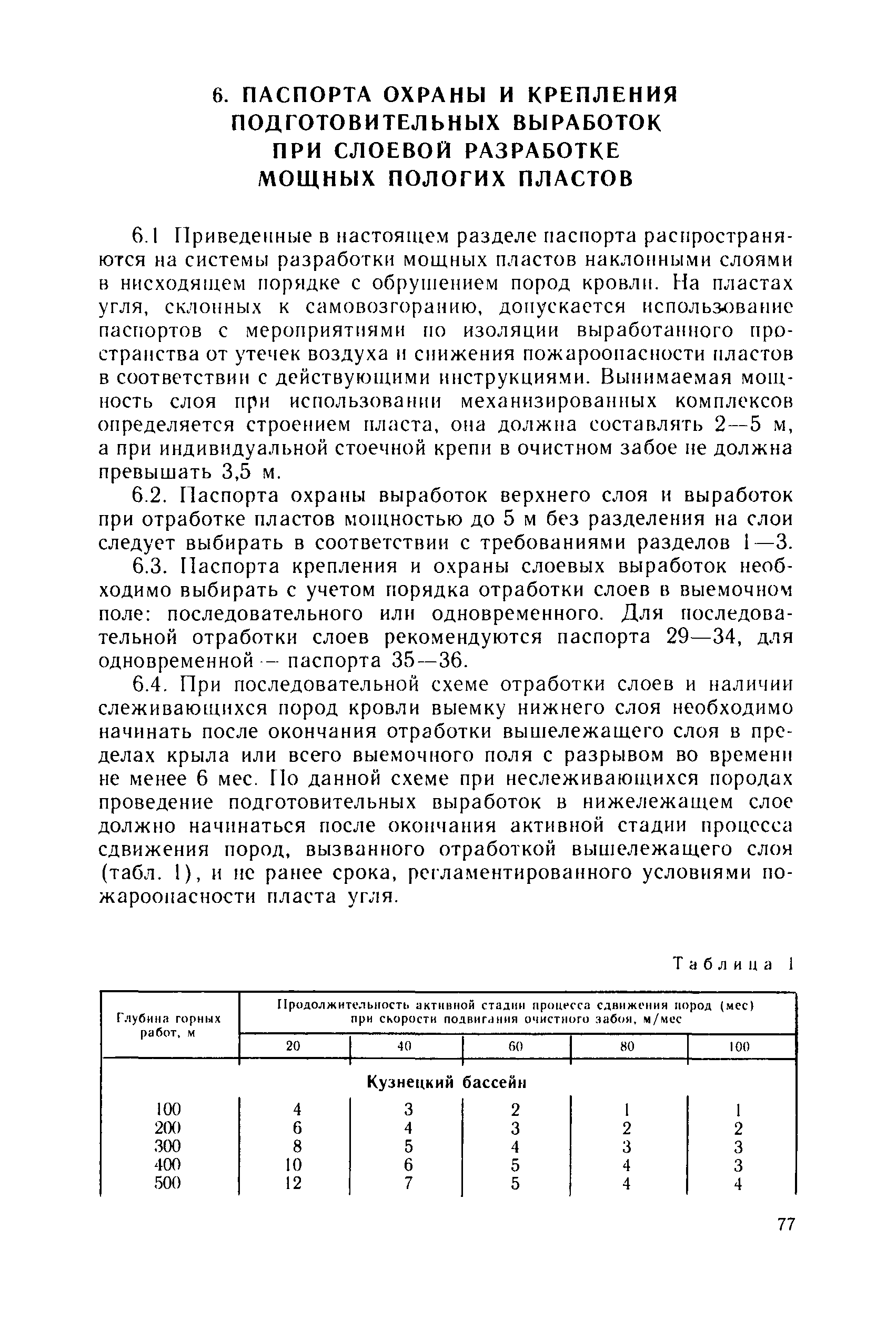 | Оглавление: | Введение 1. Паспорта охраны и крепления выработок, поддерживаемых в массиве угля впереди очистного забоя и погашаемых за лавой 2. Паспорта охраны и крепления повторно используемых выработок 3. Паспорта охраны и крепления присечных выработок 4. Паспорта охраны и крепления выработок, проводимых (оформляемых) позади очистного забоя в выработанном пространстве 5. Паспорта охраны и крепления выработок, поддерживаемых в слабых песчано-глинистых породах 6. Паспорта охраны и крепления подготовительных выработок при слоевой разработке мощных пологих пластов Приложение 1. Классификация пород кровли по устойчивости и обрушаемости Приложение 2. Определение расчетного сопротивления пород сжатию Приложение 3. Классификация пород буроугольных месторождений Приложение 4. Классификация условий поддержания выемочных выработок, требующих проведения специальных мероприятий по борьбе с пучением Приложение 5. Крепи подготовительных выработок Приложение 6. Способ упрочнения пород и угля вокруг выработок анкерной крепью Приложение 7. Способ разупрочнения труднообрушающихся пород кровли для охраны подготовительных выработок Приложение 8. Мероприятия по борьбе с пучением пород почвы |