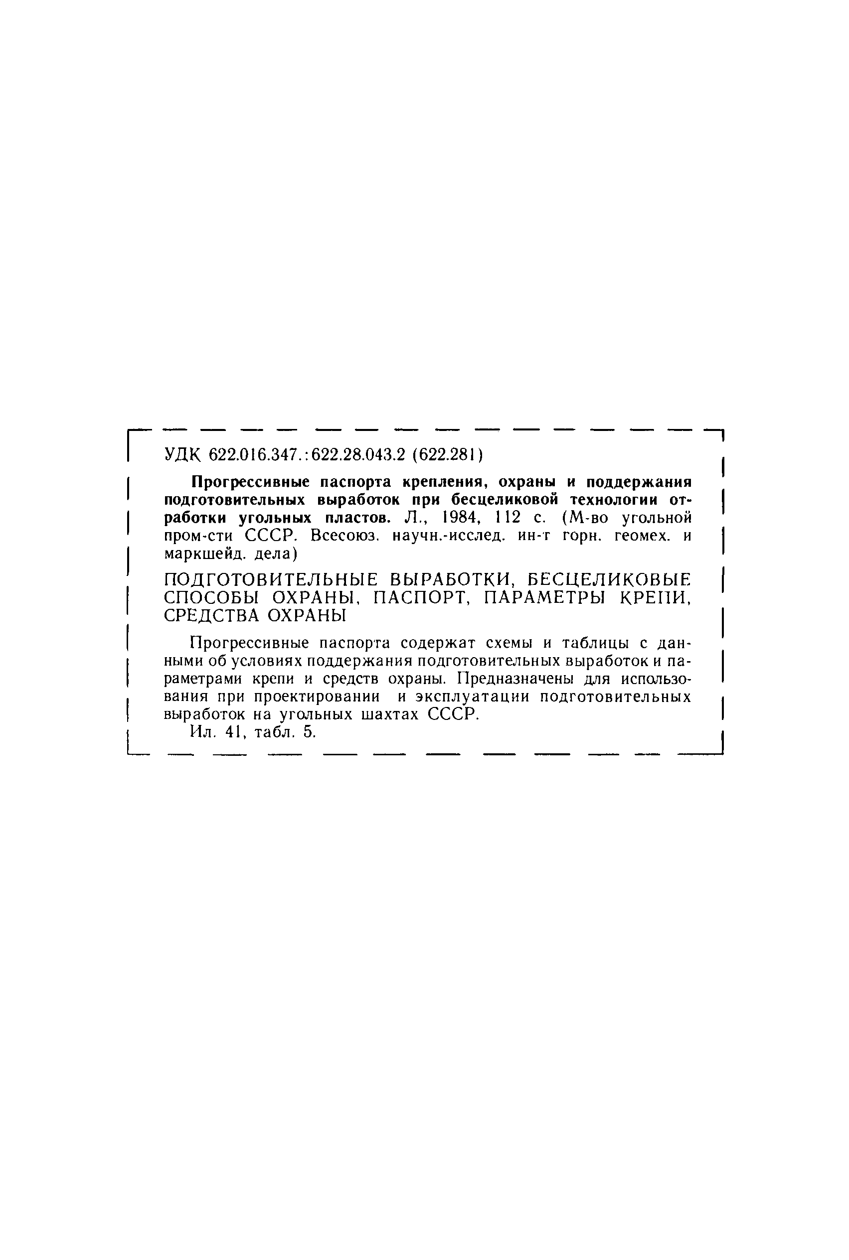 | Область применения: | Прогрессивные паспорта отражают современное состояние вопроса крепления, охраны и поддержания подготовительных выработок. Применение этих паспортов является базой для обеспечения эксплуатационного состояния выработок при бесцеликовых способах охраны на весь срок службы от проходки до погашения. Область применения прогрессивных паспортов распространяется на примыкающие к очистным забоям подготовительные выработки выемочных участков. Настоящий документ является основой для составления паспортов проведения и крепления выемочных выработок и проектов отработки лав в конкретных горно-геологических условиях |