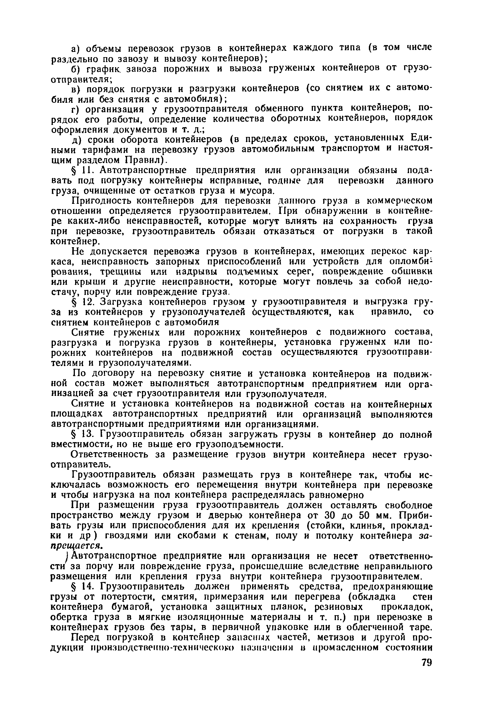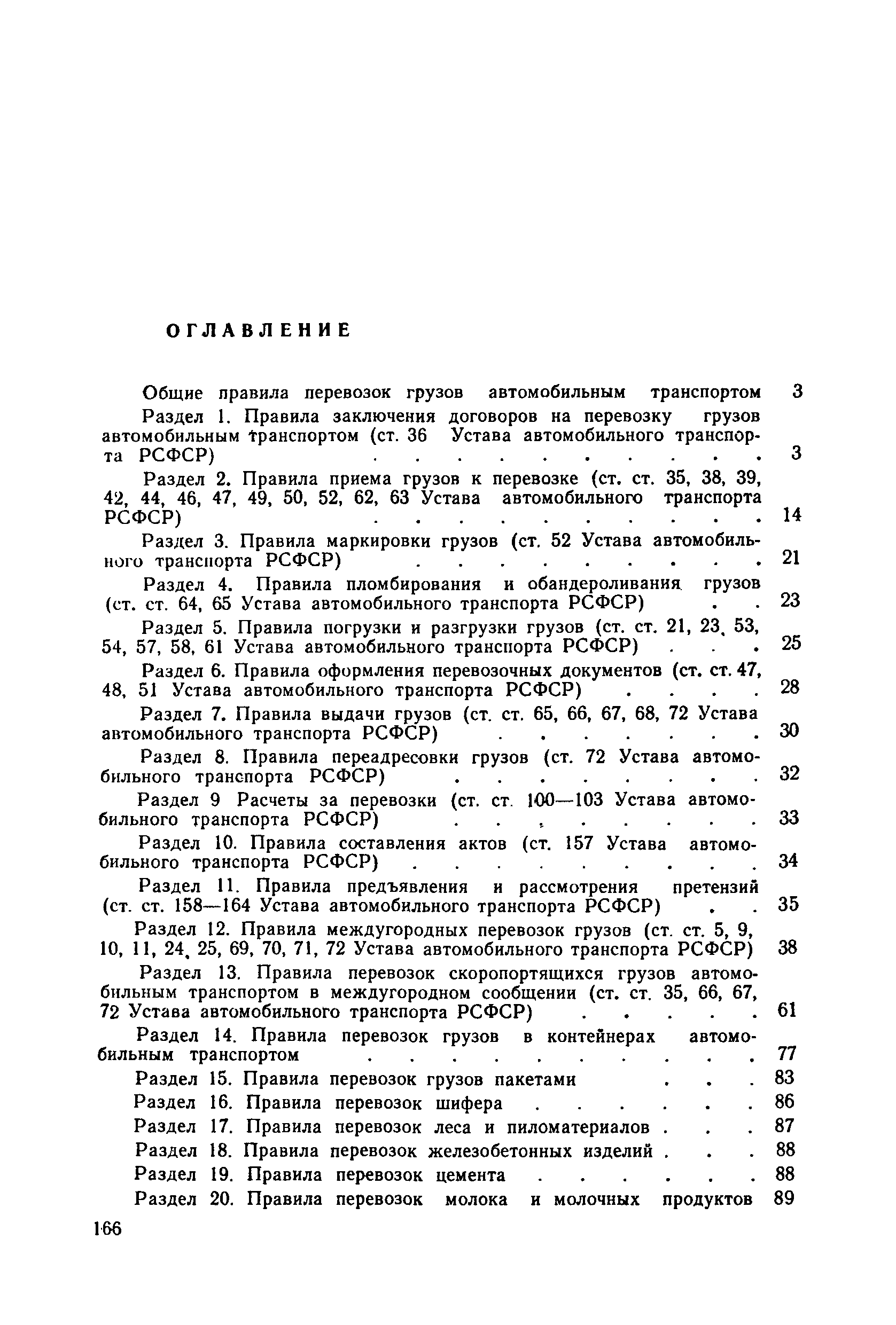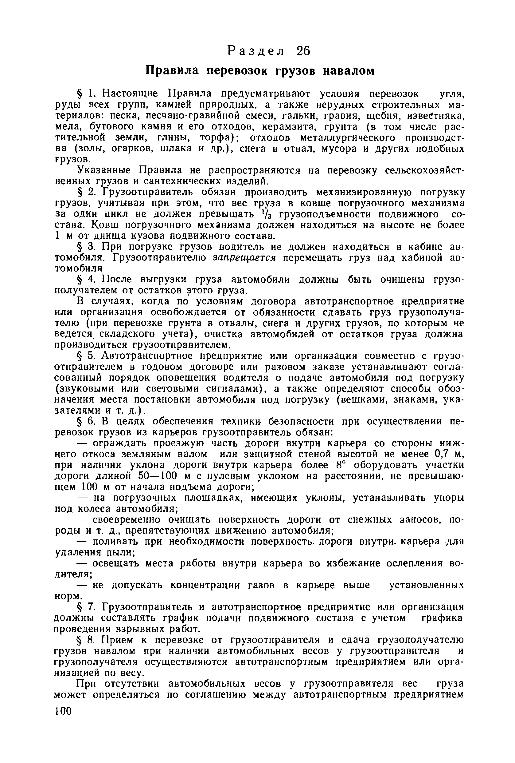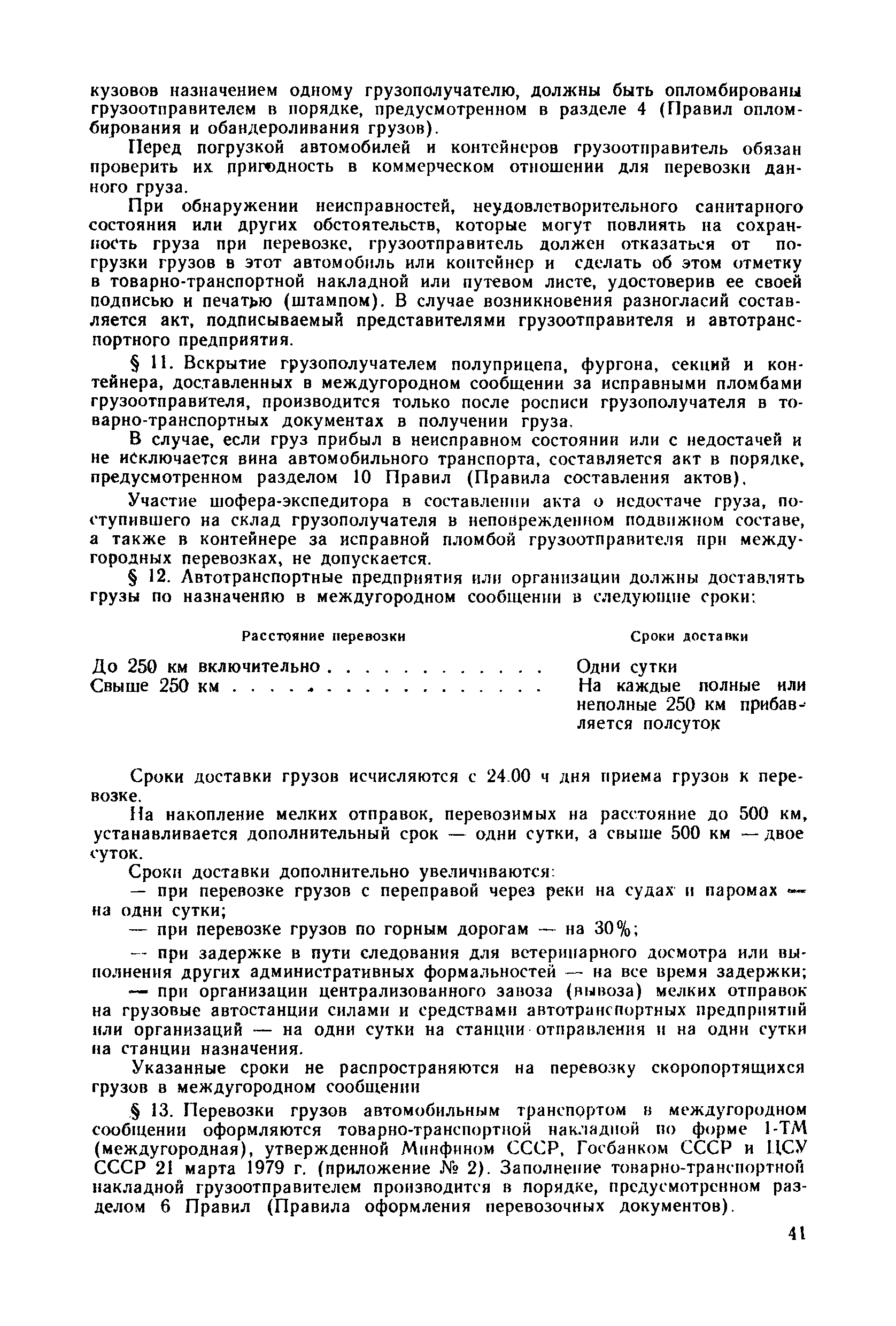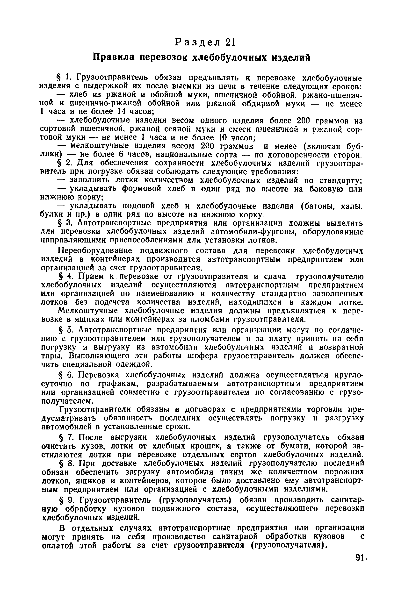 Правила перевозок грузов автомобильным транспортом| Статус: | справочные материалы, мп, тпр | | Название рус.: | Правила перевозок грузов автомобильным транспортом | | Дата добавления в базу: | 01.02.2020 | | Дата актуализации: | 01.01.2021 | | Оглавление: | Раздел 1 Правила заключения договоров на перевозку грузов автомобильным транспортом Раздел 2 Правила приема грузов к перевозке Раздел 3 Правила маркировки грузов Раздел 4 Плавира пломбирования и обандероливания грузов Раздел 5 Правила погрузки и разгрузки груза Раздел 6 Правила оформления перевозочных документов Раздел 7 Правила выдачи грузов Раздел 8 Правила переадресовки грузов Раздел 9 Расчеты за перевозки Раздел 10 Правила составления актов Раздел 11 Правила предъявления и рассмотрения претензий Раздел 12 Правила междугородных перевозок Раздел 13 Правила перевозок скоропортящихся грузов автомобильным транспортом в междугородном сообщении Раздел 14 Правила перевозок грузов в контейнерах автомобильным транспортом Раздел 15 Правила перевозок грузов пакетами Раздел 16 Правила перевозок шифера Раздел 17 Правила перевозок леса и пиломатериалов Раздел 18 Правила перевозок железобетонных изделий Раздел 19 Правила перевозок цемента Раздел 20 Правила перевозок молока и молочных продуктов Раздел 21 Правила перевозок хлебобулочных изделий Раздел 22 Правила перевозок тортов, пирожных и других мучнисто-кремовых изделий Раздел 23 Правила перевозок силосной массы Раздел 24 Правила перевозок зерна и сахарной свеклы Раздел 25 Правила перевозок животных и птиц Раздел 26 Правила перевозок грузов навалом Раздел 27 Правила транспортно-экспедиционного обслуживания предприятий, организаций и учреждений в РСФСР | | Утверждён: | Министерство автомобильного транспорта РСФСР