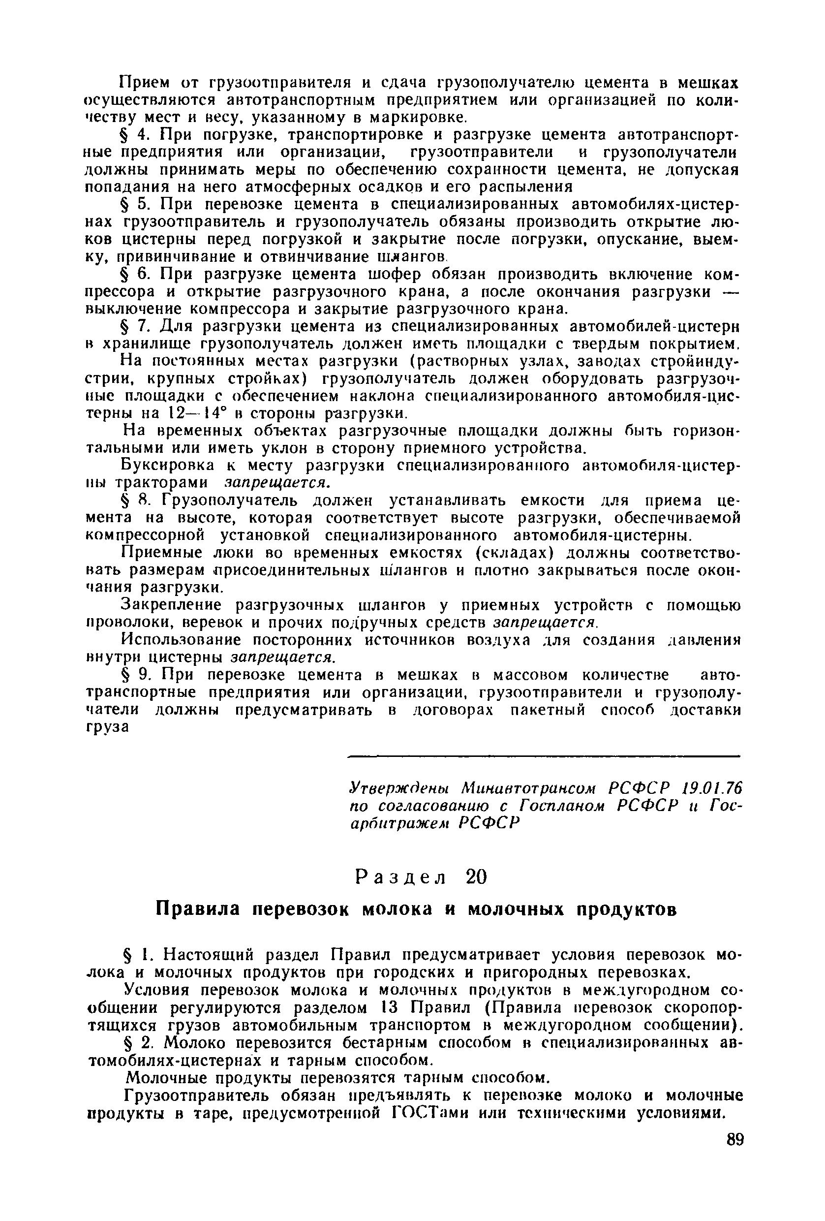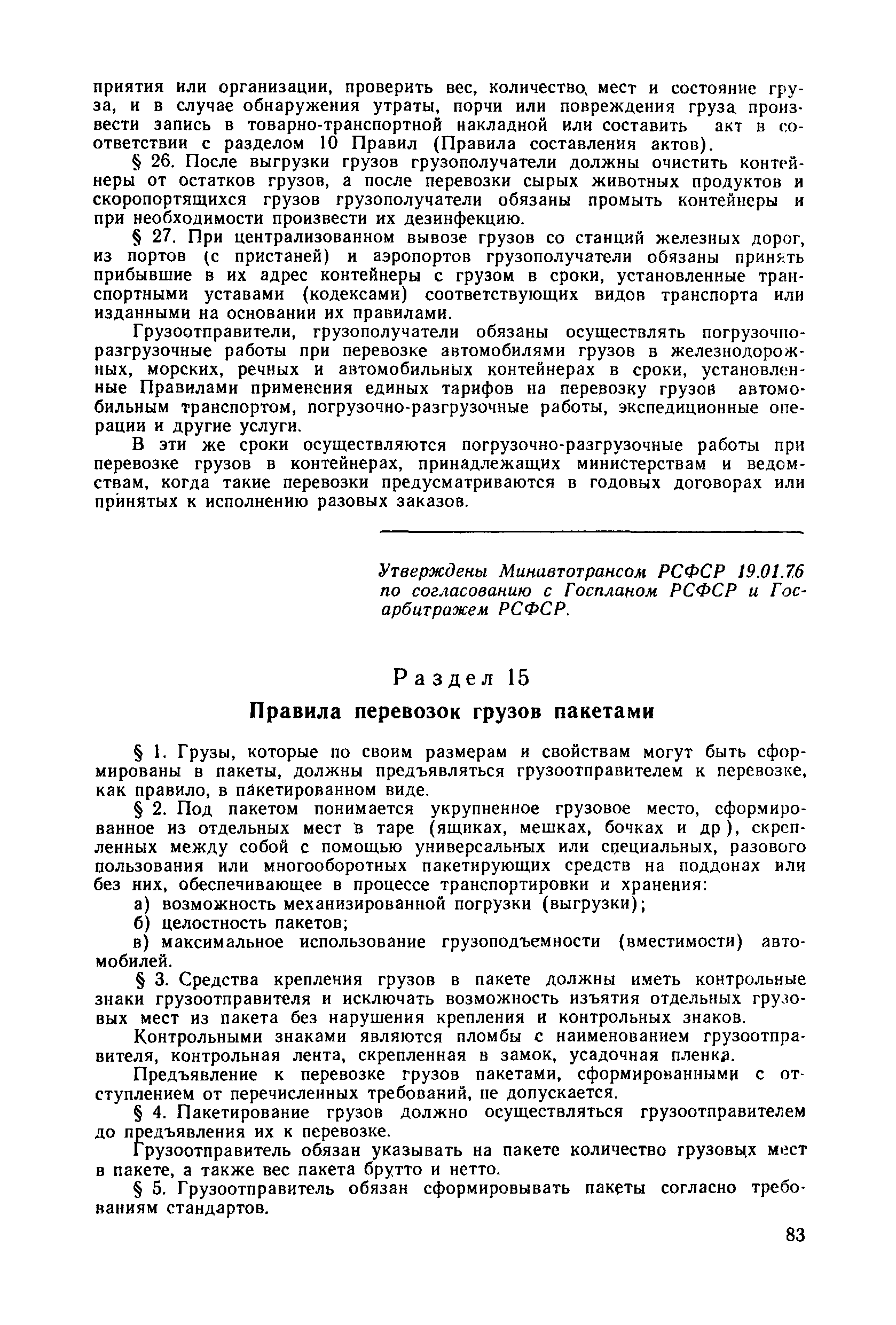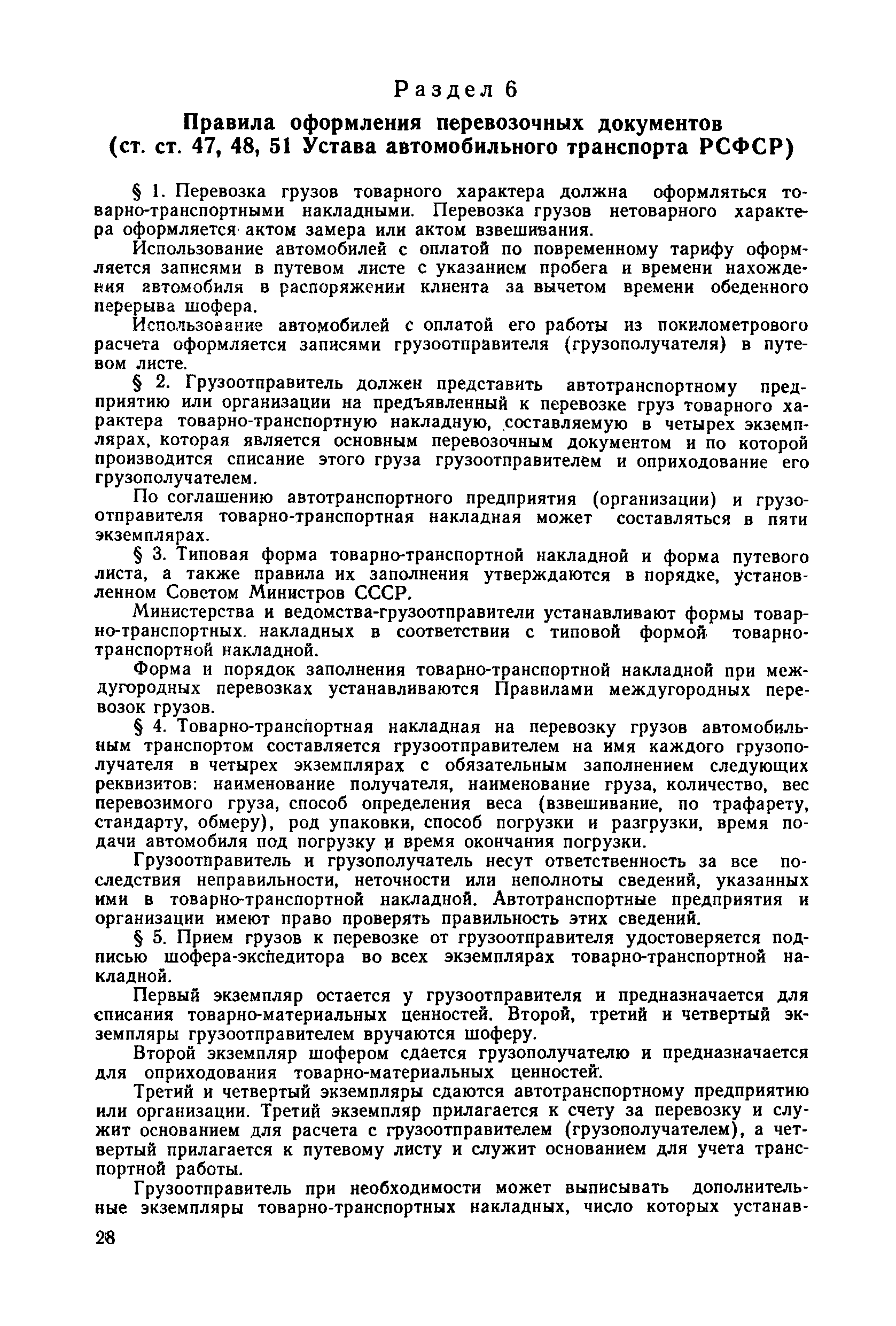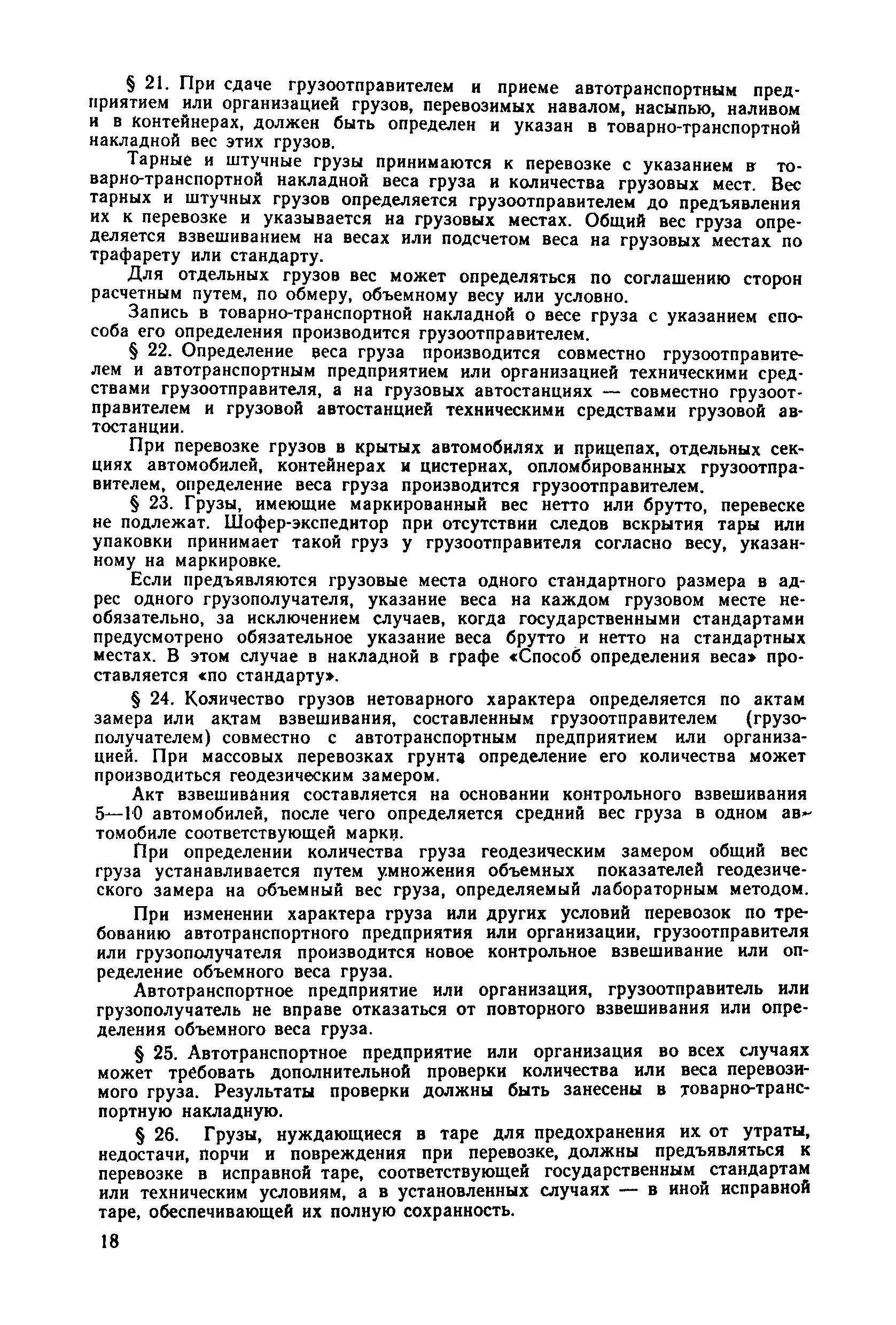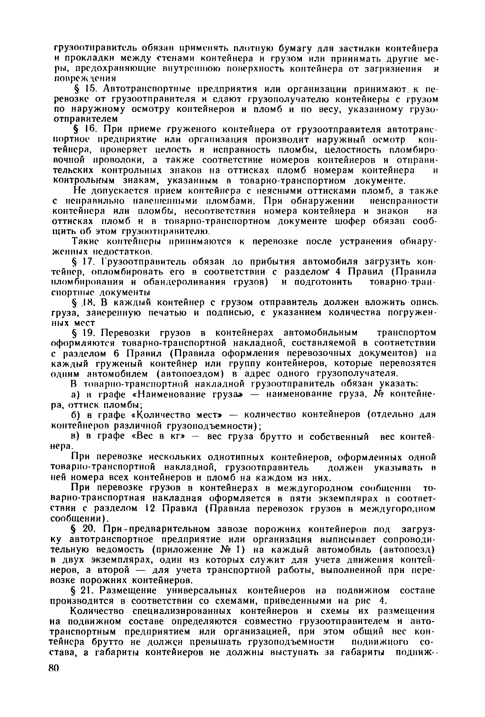 Правила перевозок грузов автомобильным транспортом| Статус: | справочные материалы, мп, тпр | | Название рус.: | Правила перевозок грузов автомобильным транспортом | | Дата добавления в базу: | 01.02.2020 | | Дата актуализации: | 01.01.2021 | | Оглавление: | Раздел 1 Правила заключения договоров на перевозку грузов автомобильным транспортом Раздел 2 Правила приема грузов к перевозке Раздел 3 Правила маркировки грузов Раздел 4 Плавира пломбирования и обандероливания грузов Раздел 5 Правила погрузки и разгрузки груза Раздел 6 Правила оформления перевозочных документов Раздел 7 Правила выдачи грузов Раздел 8 Правила переадресовки грузов Раздел 9 Расчеты за перевозки Раздел 10 Правила составления актов Раздел 11 Правила предъявления и рассмотрения претензий Раздел 12 Правила междугородных перевозок Раздел 13 Правила перевозок скоропортящихся грузов автомобильным транспортом в междугородном сообщении Раздел 14 Правила перевозок грузов в контейнерах автомобильным транспортом Раздел 15 Правила перевозок грузов пакетами Раздел 16 Правила перевозок шифера Раздел 17 Правила перевозок леса и пиломатериалов Раздел 18 Правила перевозок железобетонных изделий Раздел 19 Правила перевозок цемента Раздел 20 Правила перевозок молока и молочных продуктов Раздел 21 Правила перевозок хлебобулочных изделий Раздел 22 Правила перевозок тортов, пирожных и других мучнисто-кремовых изделий Раздел 23 Правила перевозок силосной массы Раздел 24 Правила перевозок зерна и сахарной свеклы Раздел 25 Правила перевозок животных и птиц Раздел 26 Правила перевозок грузов навалом Раздел 27 Правила транспортно-экспедиционного обслуживания предприятий, организаций и учреждений в РСФСР | | Утверждён: | Министерство автомобильного транспорта РСФСР