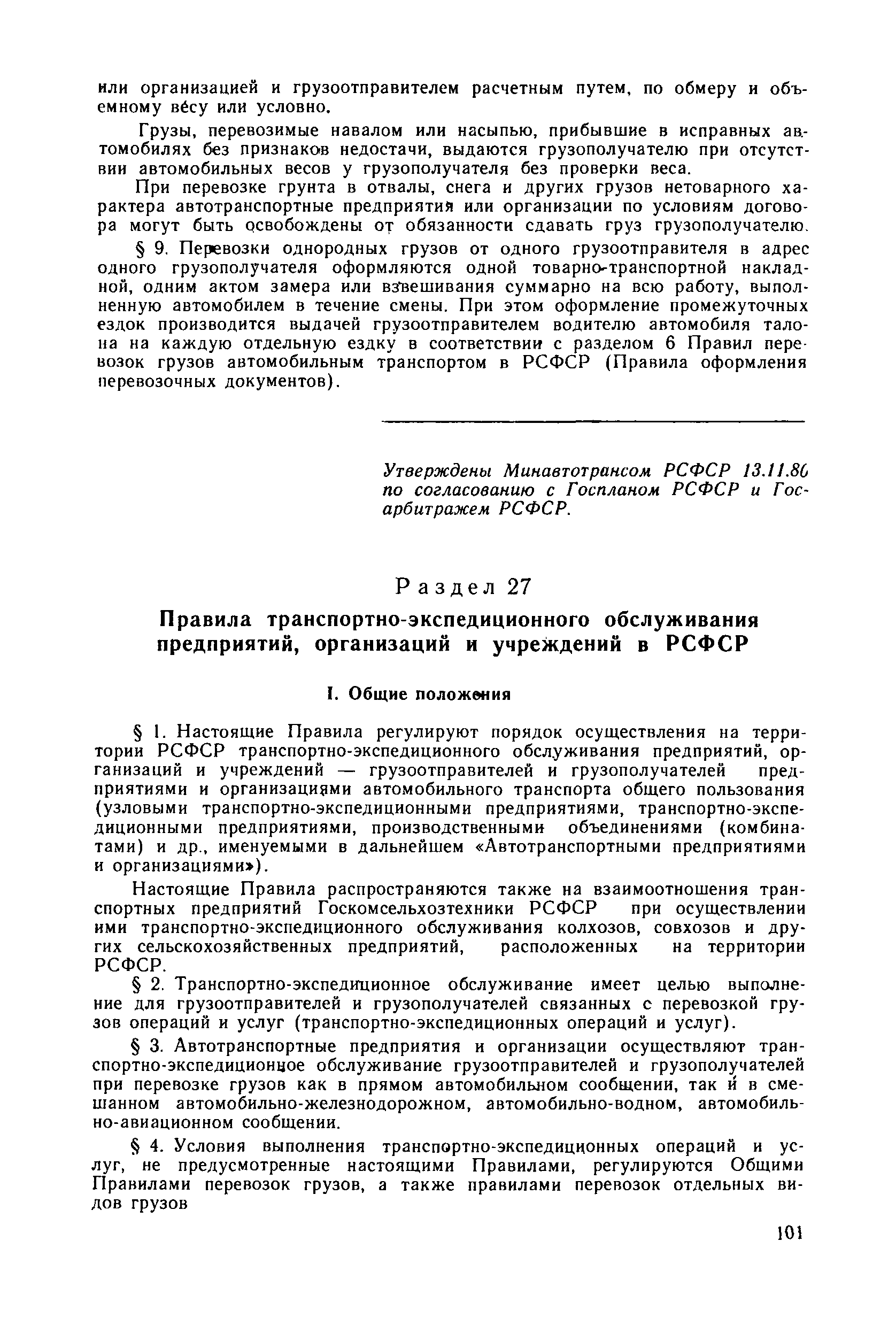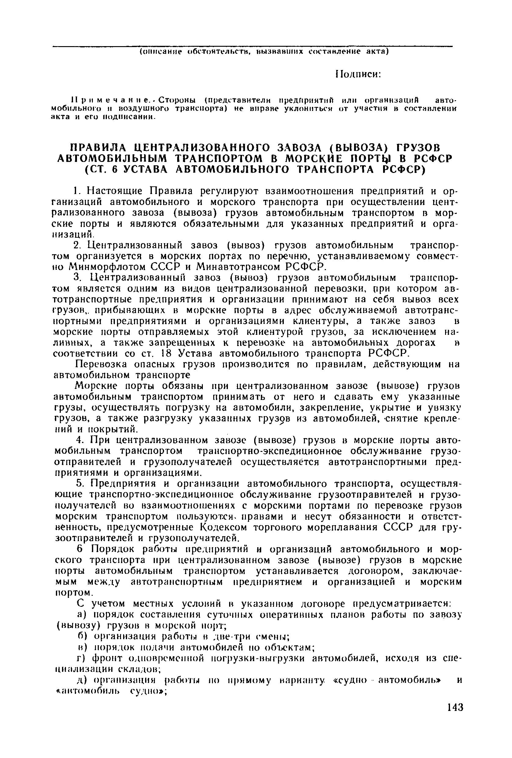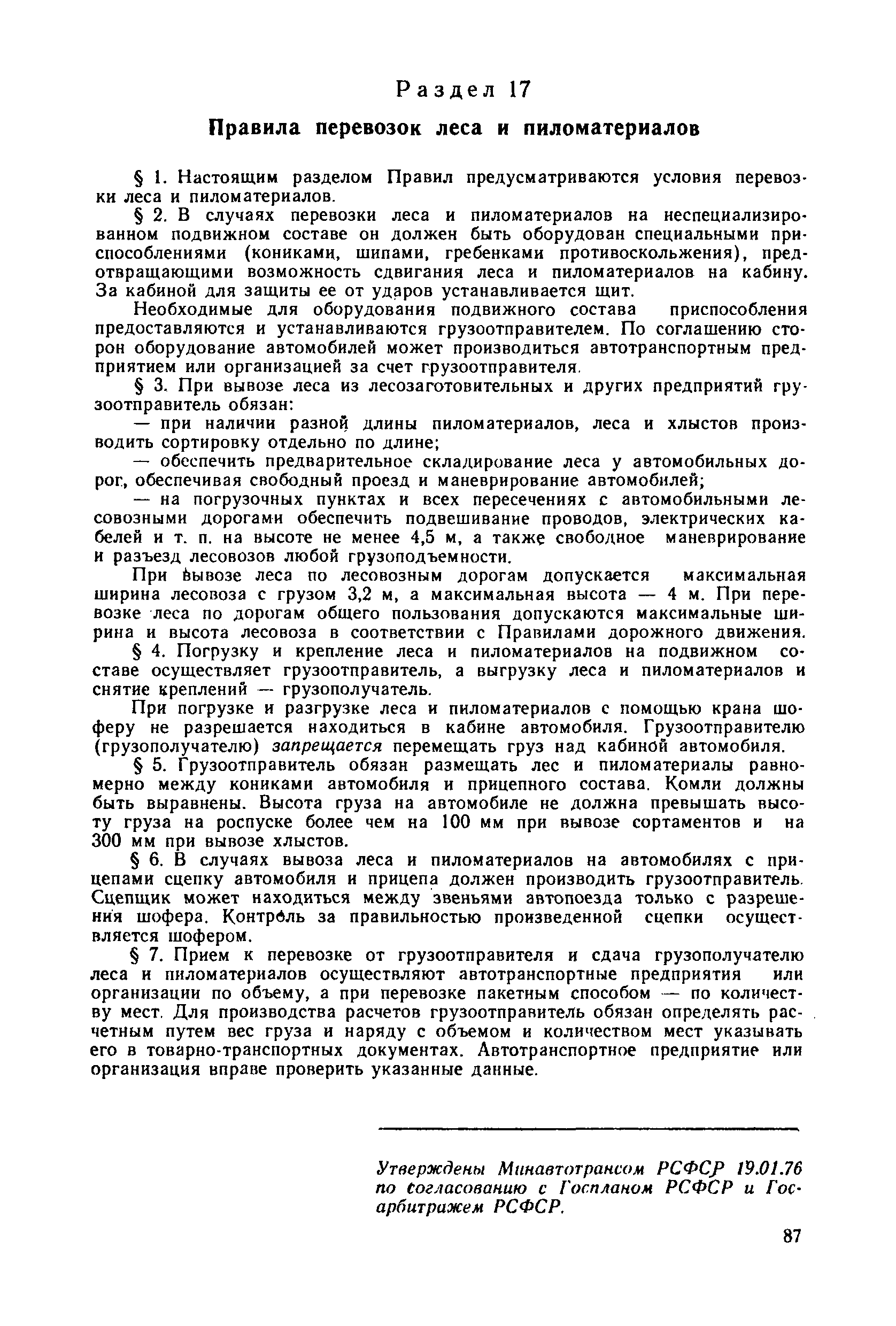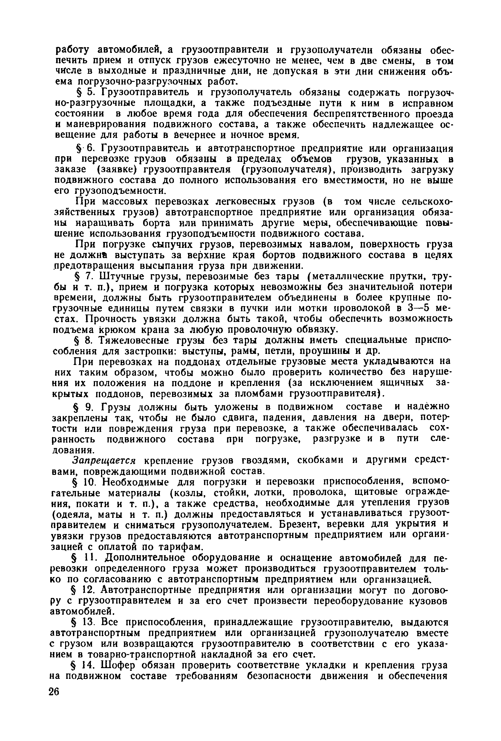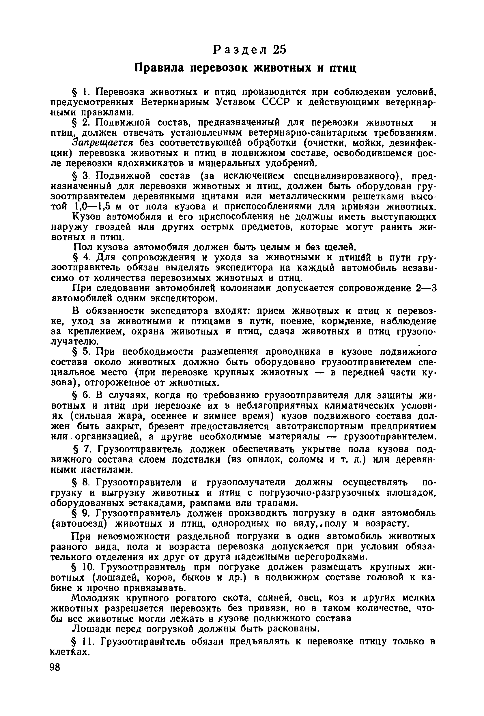 Правила перевозок грузов автомобильным транспортом| Статус: | справочные материалы, мп, тпр | | Название рус.: | Правила перевозок грузов автомобильным транспортом | | Дата добавления в базу: | 01.02.2020 | | Дата актуализации: | 01.01.2021 | | Оглавление: | Раздел 1 Правила заключения договоров на перевозку грузов автомобильным транспортом Раздел 2 Правила приема грузов к перевозке Раздел 3 Правила маркировки грузов Раздел 4 Плавира пломбирования и обандероливания грузов Раздел 5 Правила погрузки и разгрузки груза Раздел 6 Правила оформления перевозочных документов Раздел 7 Правила выдачи грузов Раздел 8 Правила переадресовки грузов Раздел 9 Расчеты за перевозки Раздел 10 Правила составления актов Раздел 11 Правила предъявления и рассмотрения претензий Раздел 12 Правила междугородных перевозок Раздел 13 Правила перевозок скоропортящихся грузов автомобильным транспортом в междугородном сообщении Раздел 14 Правила перевозок грузов в контейнерах автомобильным транспортом Раздел 15 Правила перевозок грузов пакетами Раздел 16 Правила перевозок шифера Раздел 17 Правила перевозок леса и пиломатериалов Раздел 18 Правила перевозок железобетонных изделий Раздел 19 Правила перевозок цемента Раздел 20 Правила перевозок молока и молочных продуктов Раздел 21 Правила перевозок хлебобулочных изделий Раздел 22 Правила перевозок тортов, пирожных и других мучнисто-кремовых изделий Раздел 23 Правила перевозок силосной массы Раздел 24 Правила перевозок зерна и сахарной свеклы Раздел 25 Правила перевозок животных и птиц Раздел 26 Правила перевозок грузов навалом Раздел 27 Правила транспортно-экспедиционного обслуживания предприятий, организаций и учреждений в РСФСР | | Утверждён: | Министерство автомобильного транспорта РСФСР