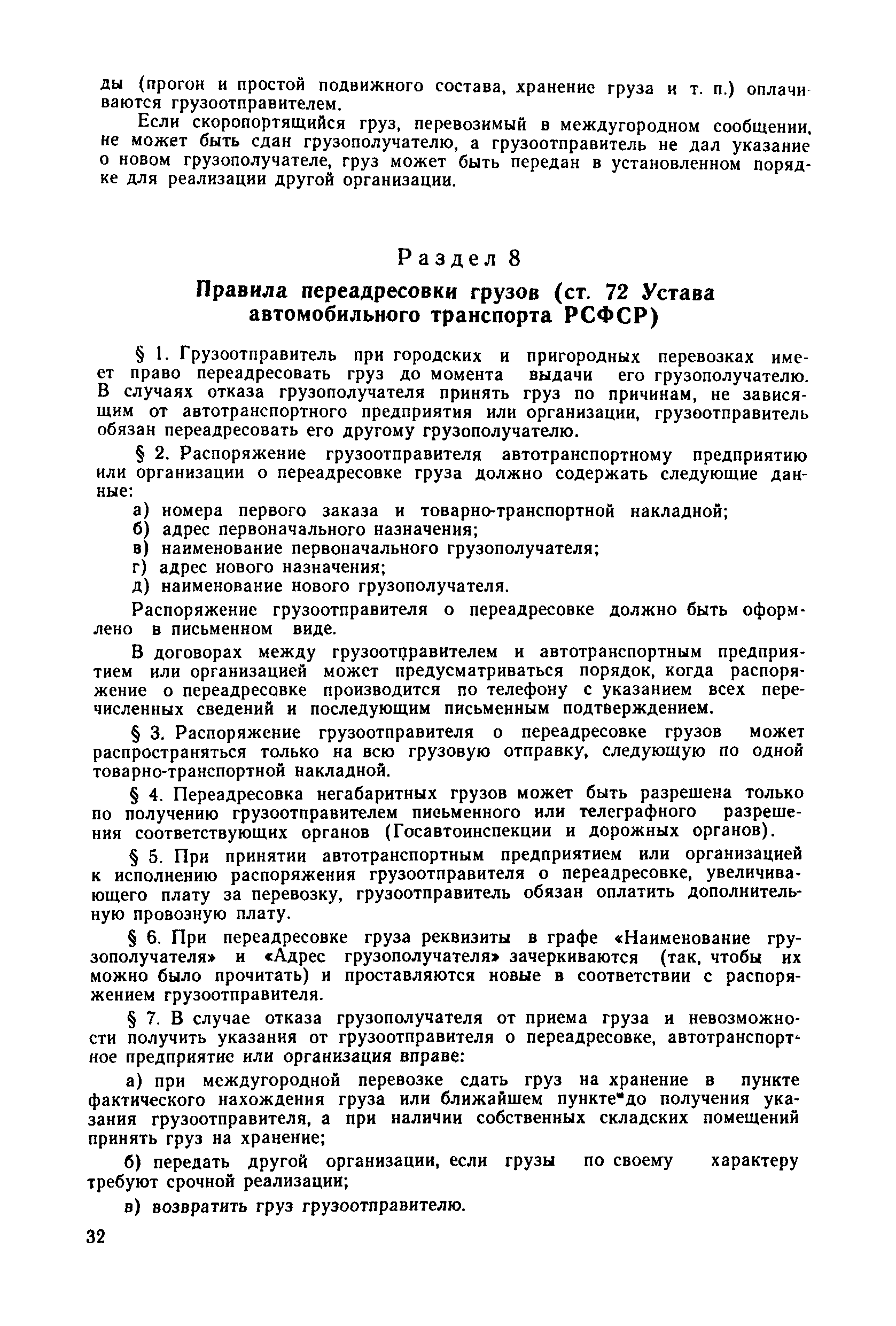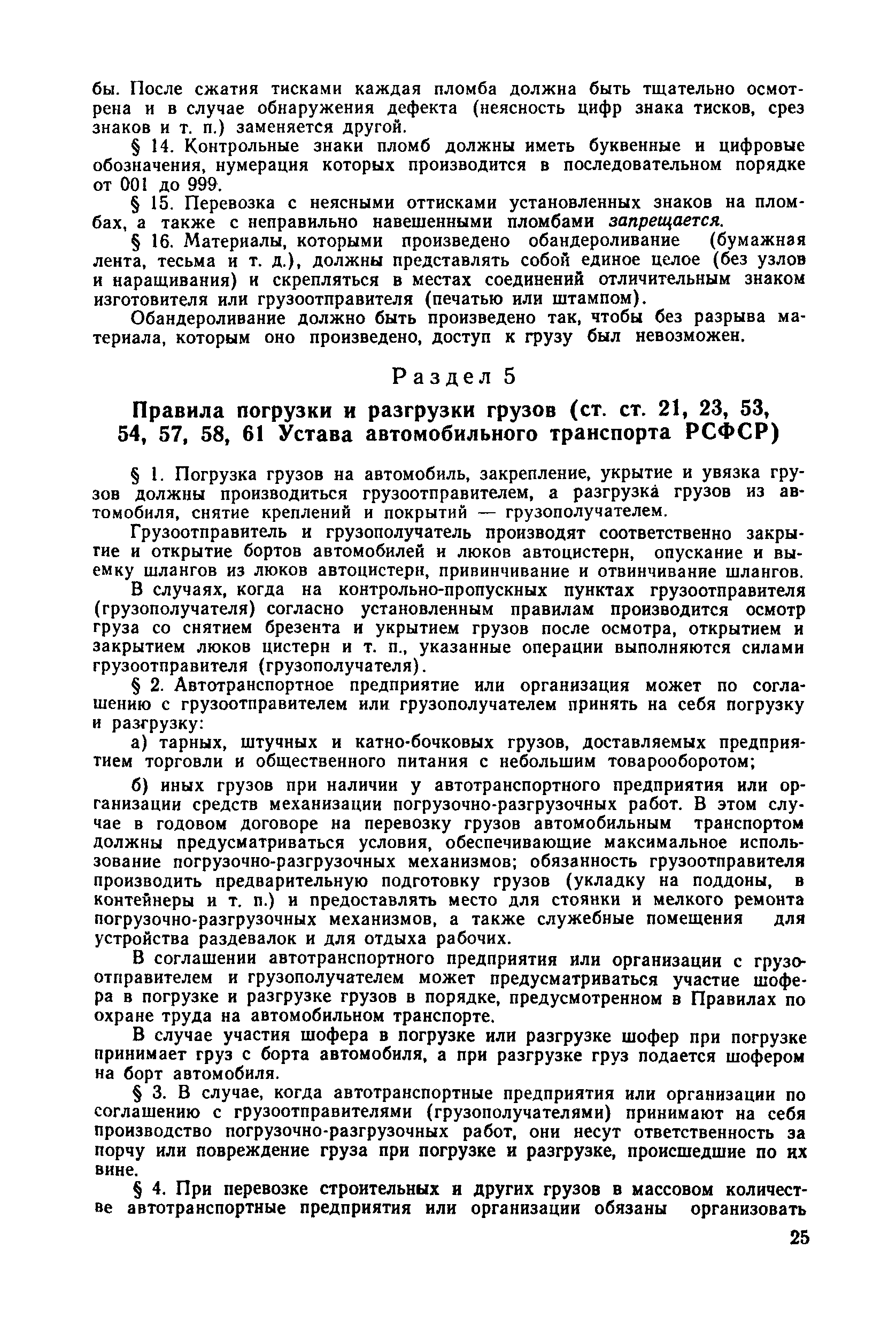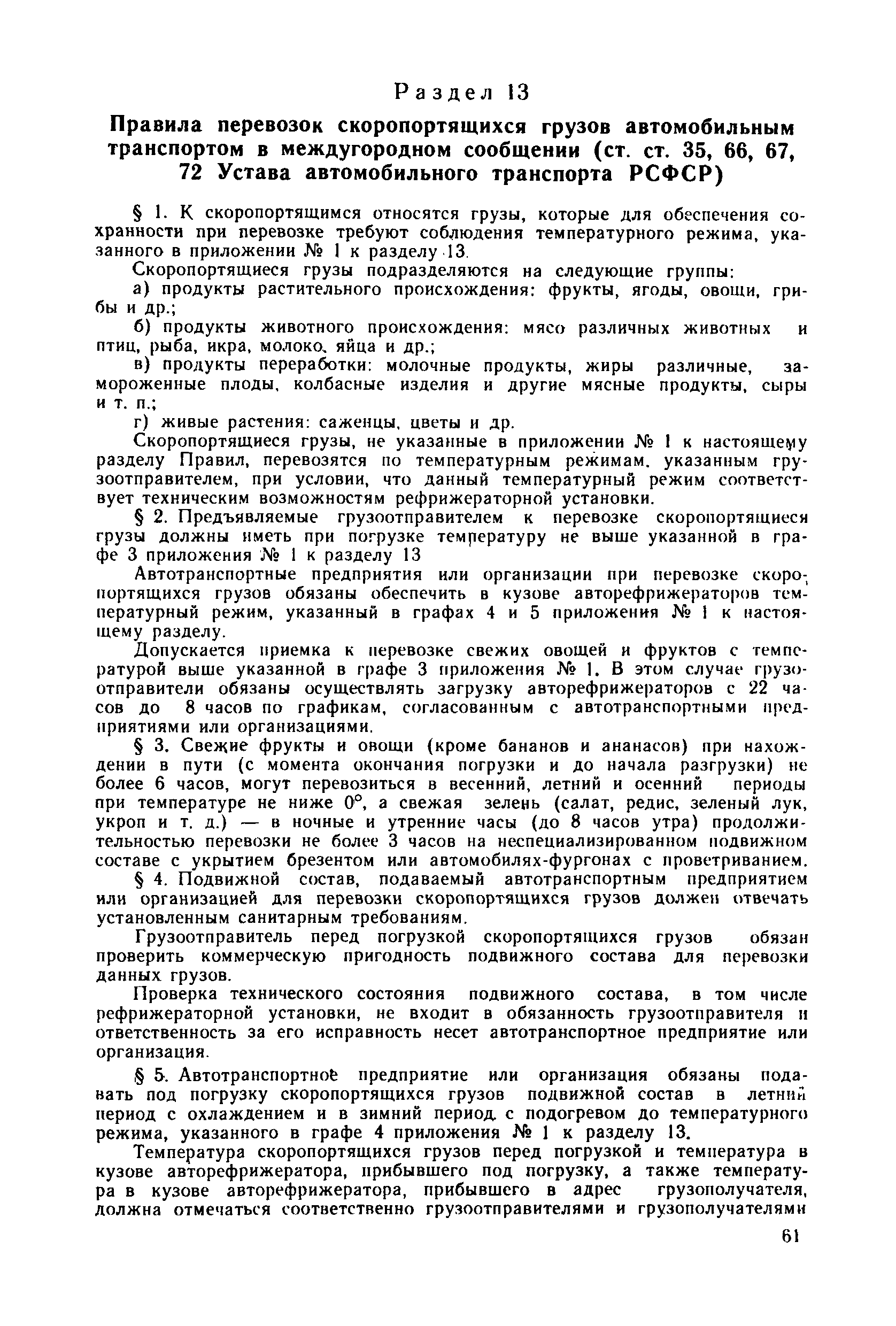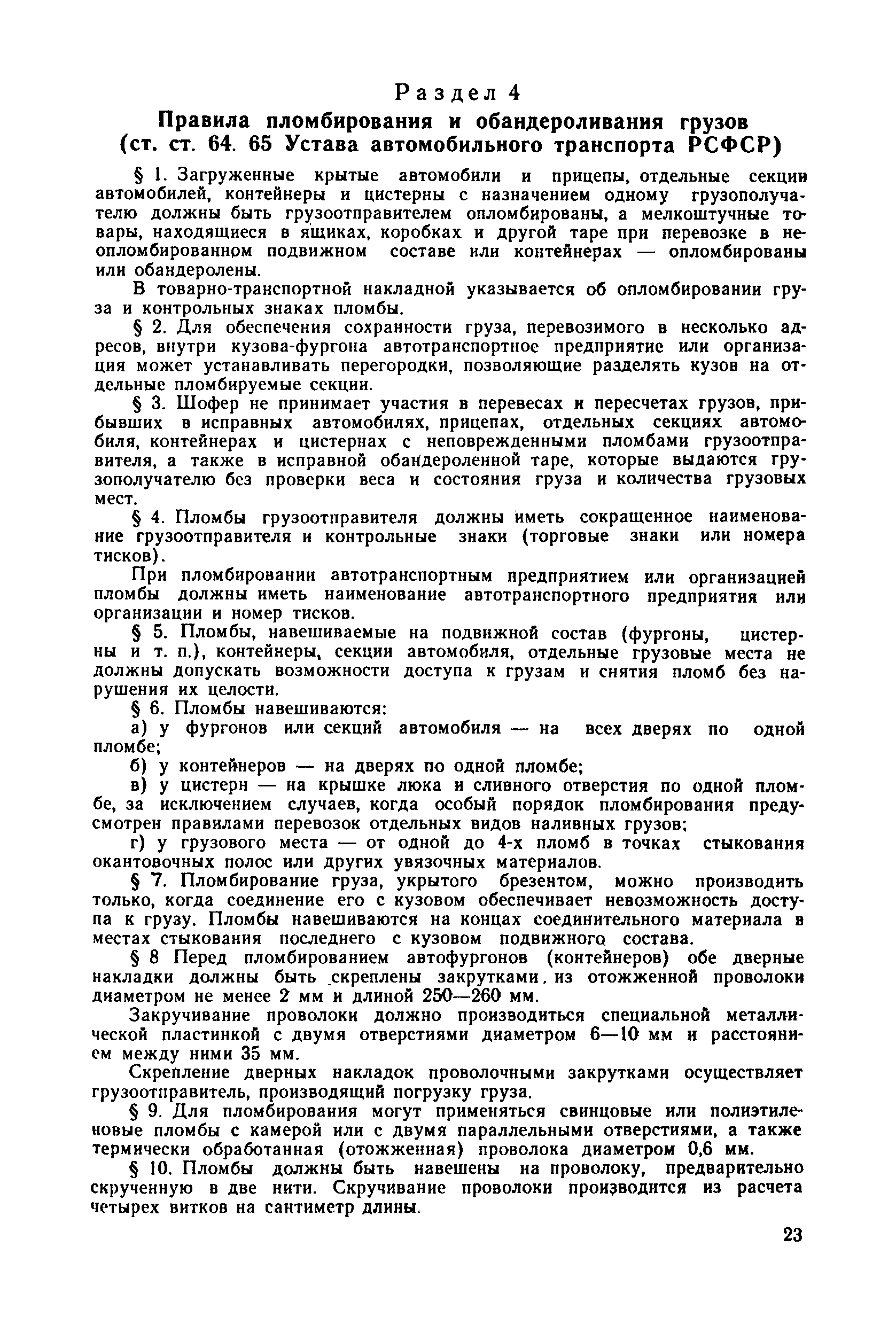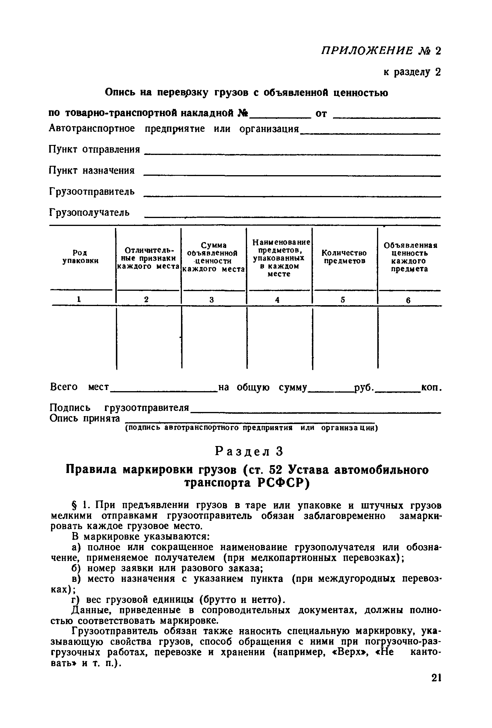 Правила перевозок грузов автомобильным транспортом| Статус: | справочные материалы, мп, тпр | | Название рус.: | Правила перевозок грузов автомобильным транспортом | | Дата добавления в базу: | 01.02.2020 | | Дата актуализации: | 01.01.2021 | | Оглавление: | Раздел 1 Правила заключения договоров на перевозку грузов автомобильным транспортом Раздел 2 Правила приема грузов к перевозке Раздел 3 Правила маркировки грузов Раздел 4 Плавира пломбирования и обандероливания грузов Раздел 5 Правила погрузки и разгрузки груза Раздел 6 Правила оформления перевозочных документов Раздел 7 Правила выдачи грузов Раздел 8 Правила переадресовки грузов Раздел 9 Расчеты за перевозки Раздел 10 Правила составления актов Раздел 11 Правила предъявления и рассмотрения претензий Раздел 12 Правила междугородных перевозок Раздел 13 Правила перевозок скоропортящихся грузов автомобильным транспортом в междугородном сообщении Раздел 14 Правила перевозок грузов в контейнерах автомобильным транспортом Раздел 15 Правила перевозок грузов пакетами Раздел 16 Правила перевозок шифера Раздел 17 Правила перевозок леса и пиломатериалов Раздел 18 Правила перевозок железобетонных изделий Раздел 19 Правила перевозок цемента Раздел 20 Правила перевозок молока и молочных продуктов Раздел 21 Правила перевозок хлебобулочных изделий Раздел 22 Правила перевозок тортов, пирожных и других мучнисто-кремовых изделий Раздел 23 Правила перевозок силосной массы Раздел 24 Правила перевозок зерна и сахарной свеклы Раздел 25 Правила перевозок животных и птиц Раздел 26 Правила перевозок грузов навалом Раздел 27 Правила транспортно-экспедиционного обслуживания предприятий, организаций и учреждений в РСФСР | | Утверждён: | Министерство автомобильного транспорта РСФСР