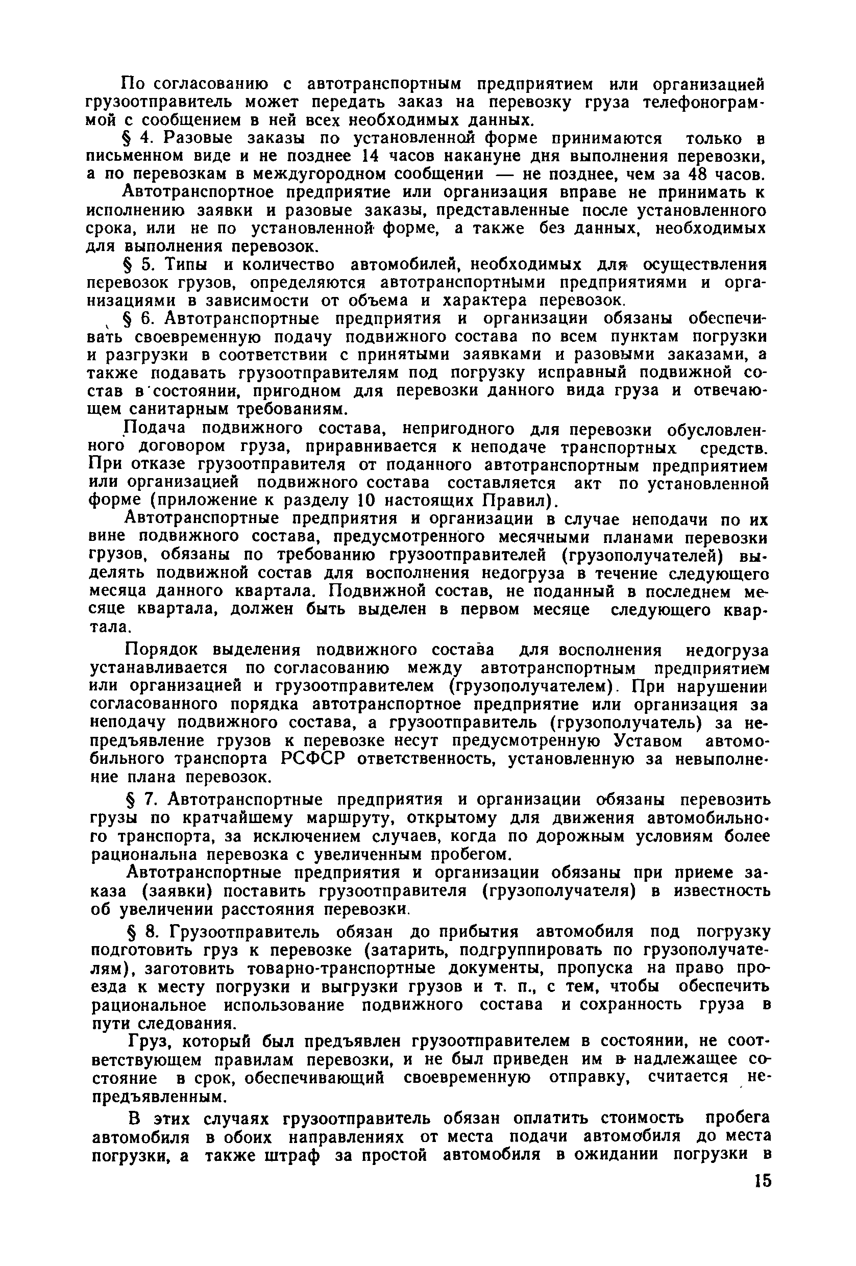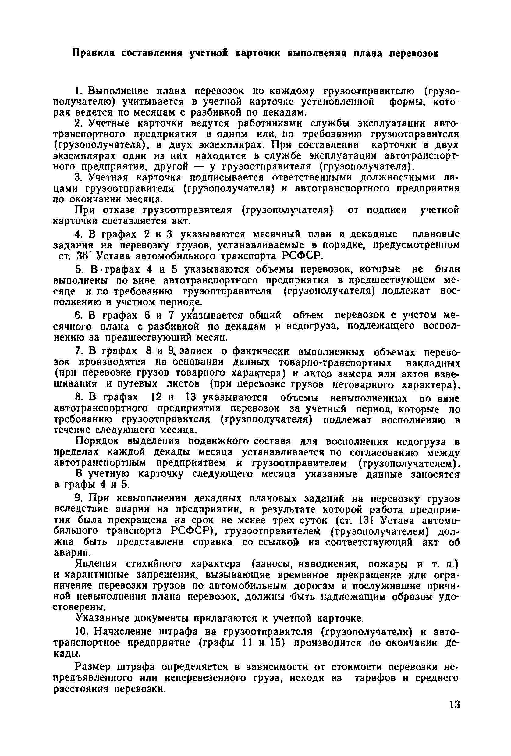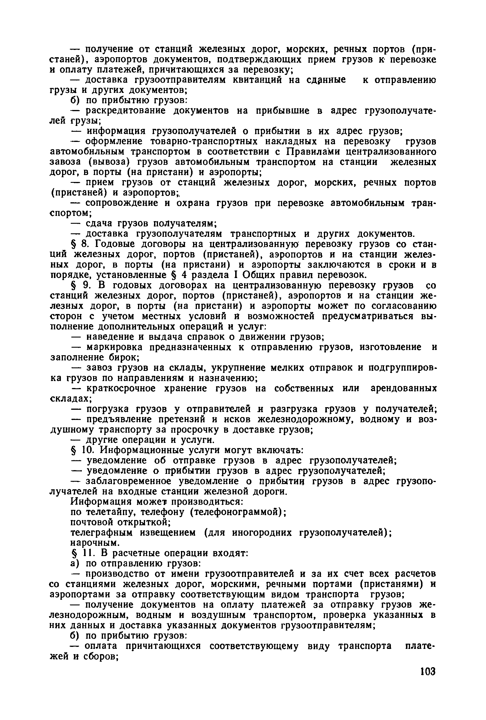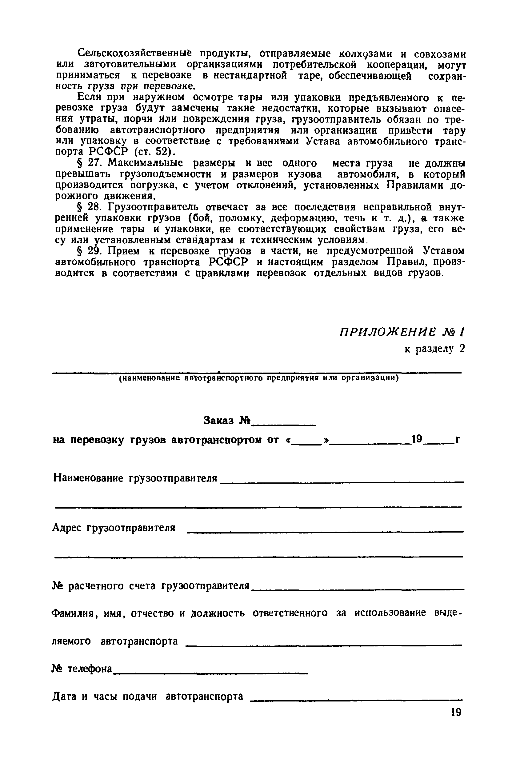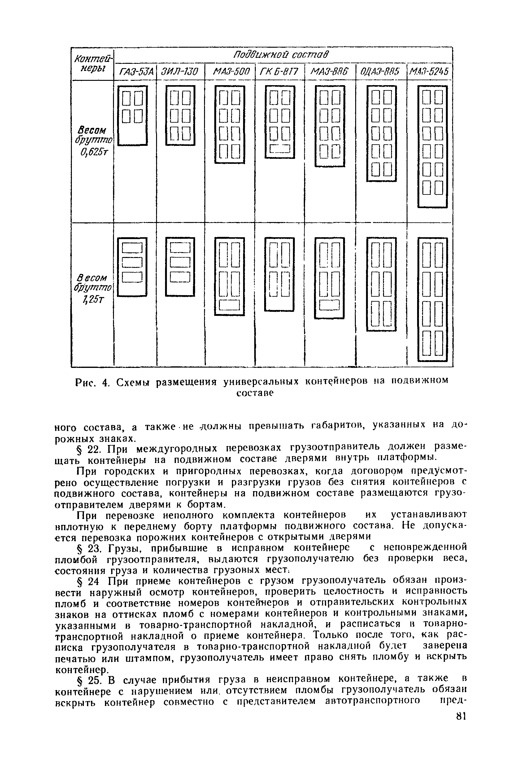 Правила перевозок грузов автомобильным транспортом| Статус: | справочные материалы, мп, тпр | | Название рус.: | Правила перевозок грузов автомобильным транспортом | | Дата добавления в базу: | 01.02.2020 | | Дата актуализации: | 01.01.2021 | | Оглавление: | Раздел 1 Правила заключения договоров на перевозку грузов автомобильным транспортом Раздел 2 Правила приема грузов к перевозке Раздел 3 Правила маркировки грузов Раздел 4 Плавира пломбирования и обандероливания грузов Раздел 5 Правила погрузки и разгрузки груза Раздел 6 Правила оформления перевозочных документов Раздел 7 Правила выдачи грузов Раздел 8 Правила переадресовки грузов Раздел 9 Расчеты за перевозки Раздел 10 Правила составления актов Раздел 11 Правила предъявления и рассмотрения претензий Раздел 12 Правила междугородных перевозок Раздел 13 Правила перевозок скоропортящихся грузов автомобильным транспортом в междугородном сообщении Раздел 14 Правила перевозок грузов в контейнерах автомобильным транспортом Раздел 15 Правила перевозок грузов пакетами Раздел 16 Правила перевозок шифера Раздел 17 Правила перевозок леса и пиломатериалов Раздел 18 Правила перевозок железобетонных изделий Раздел 19 Правила перевозок цемента Раздел 20 Правила перевозок молока и молочных продуктов Раздел 21 Правила перевозок хлебобулочных изделий Раздел 22 Правила перевозок тортов, пирожных и других мучнисто-кремовых изделий Раздел 23 Правила перевозок силосной массы Раздел 24 Правила перевозок зерна и сахарной свеклы Раздел 25 Правила перевозок животных и птиц Раздел 26 Правила перевозок грузов навалом Раздел 27 Правила транспортно-экспедиционного обслуживания предприятий, организаций и учреждений в РСФСР | | Утверждён: | Министерство автомобильного транспорта РСФСР